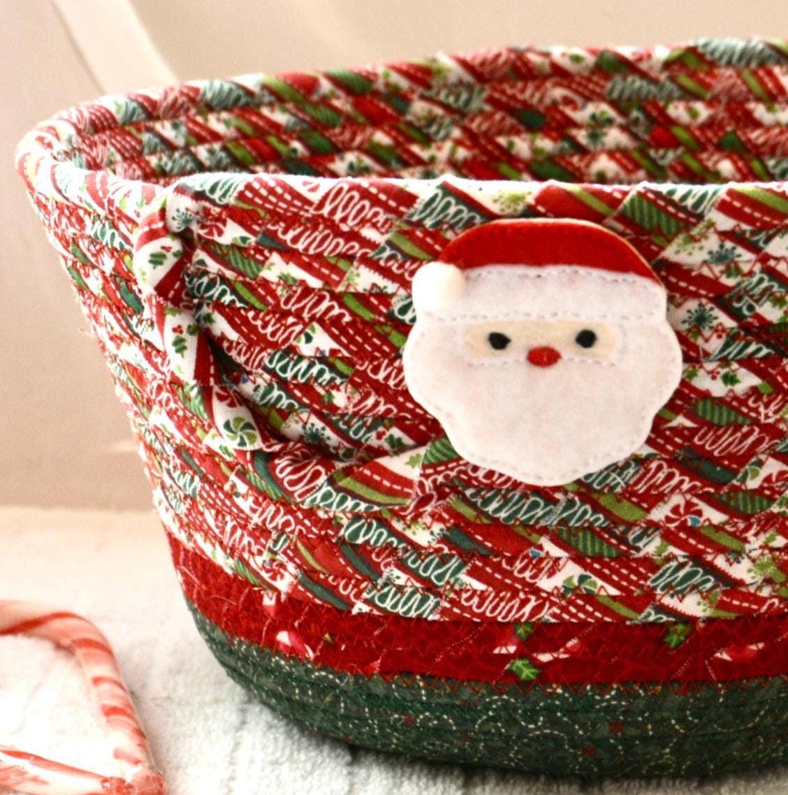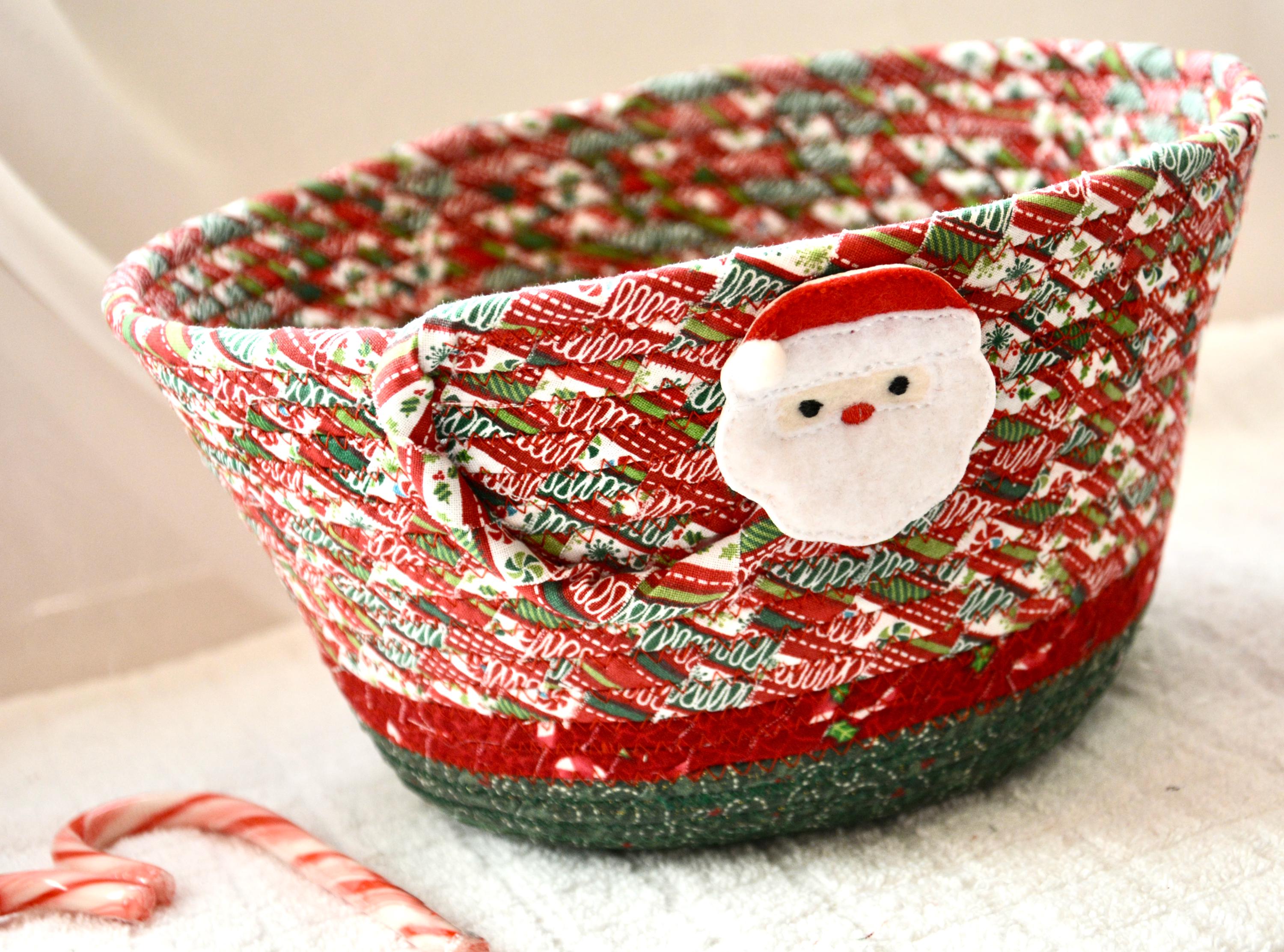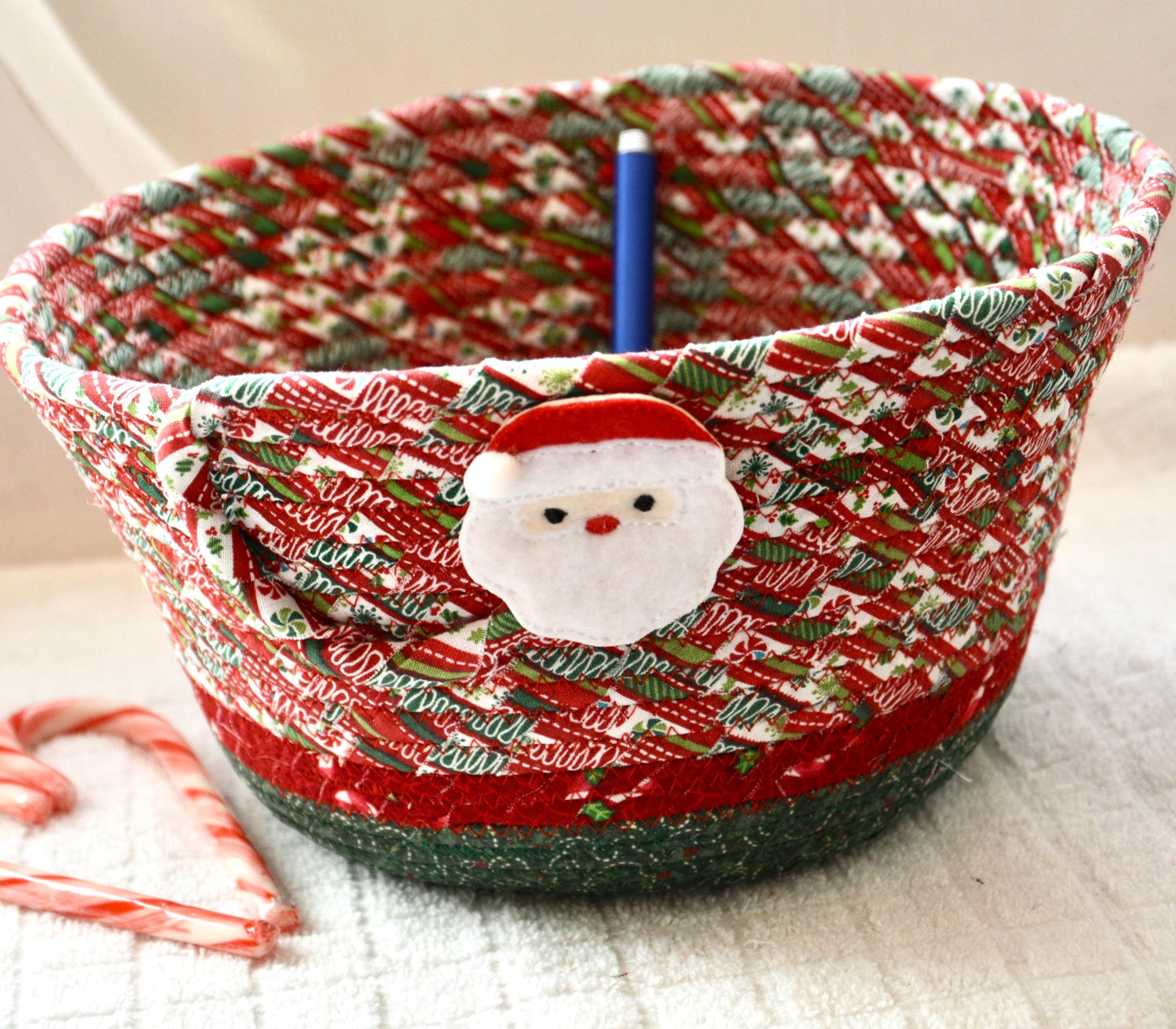 I hand wrapped these high quality fabrics around cotton line, which I then hand coiled and machine quilted to make it sturdy. I used the raw edge technique with some fray to add a wonderful shabby chic texture. I just love the cute highlights in this bright cheery fabric! So festive! Cute Santa, he is so cheery too!