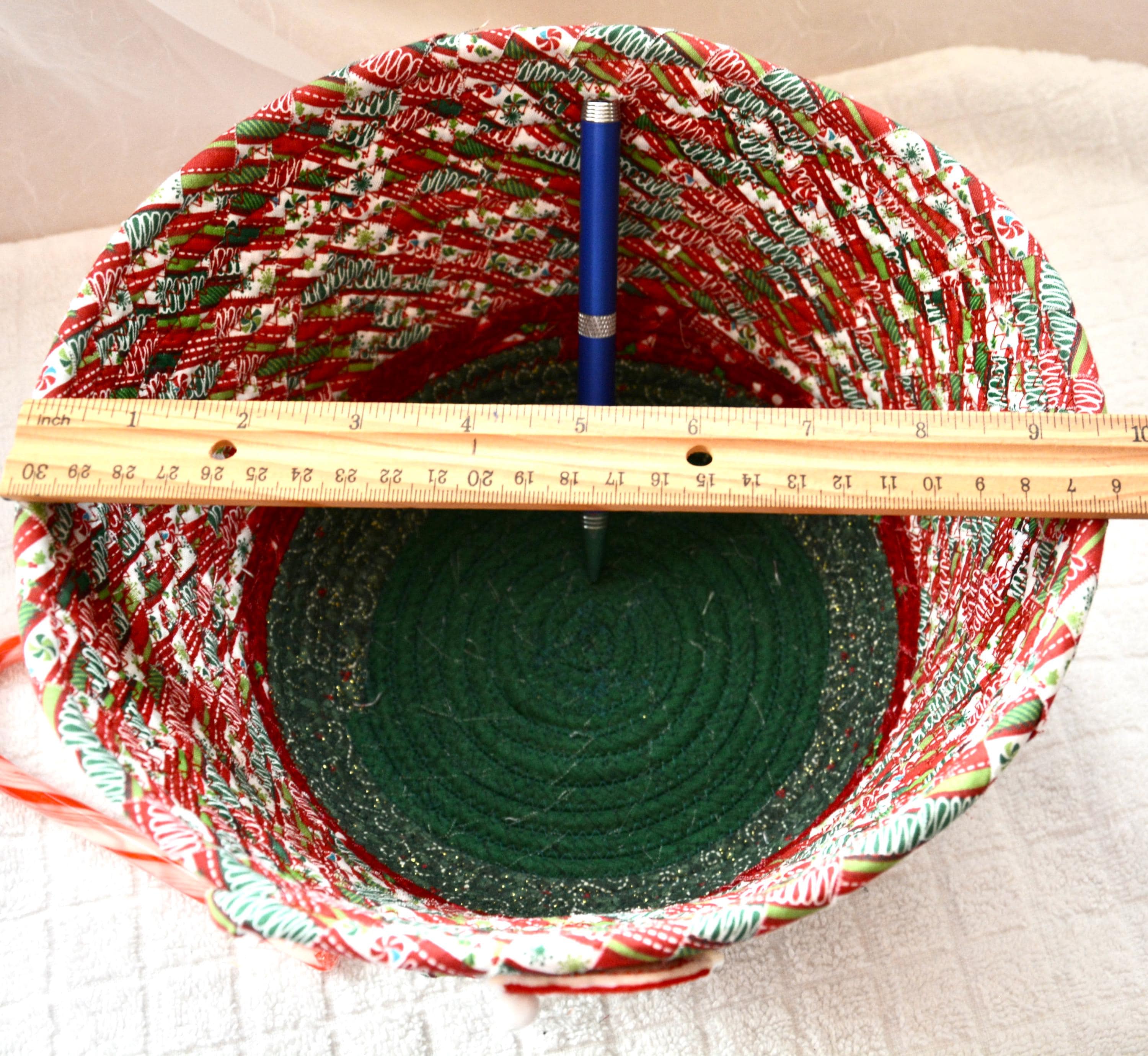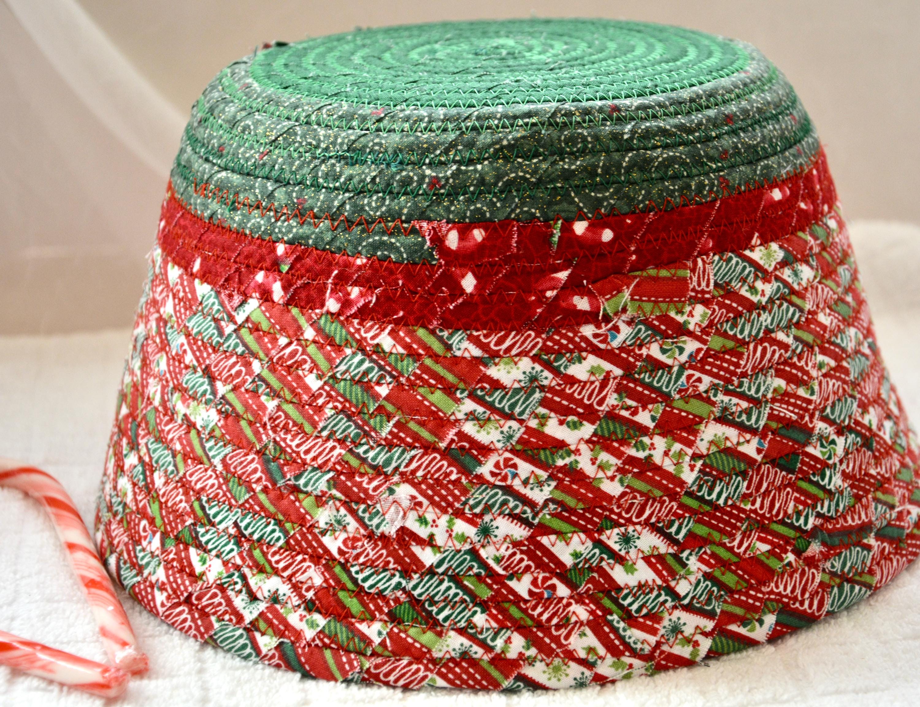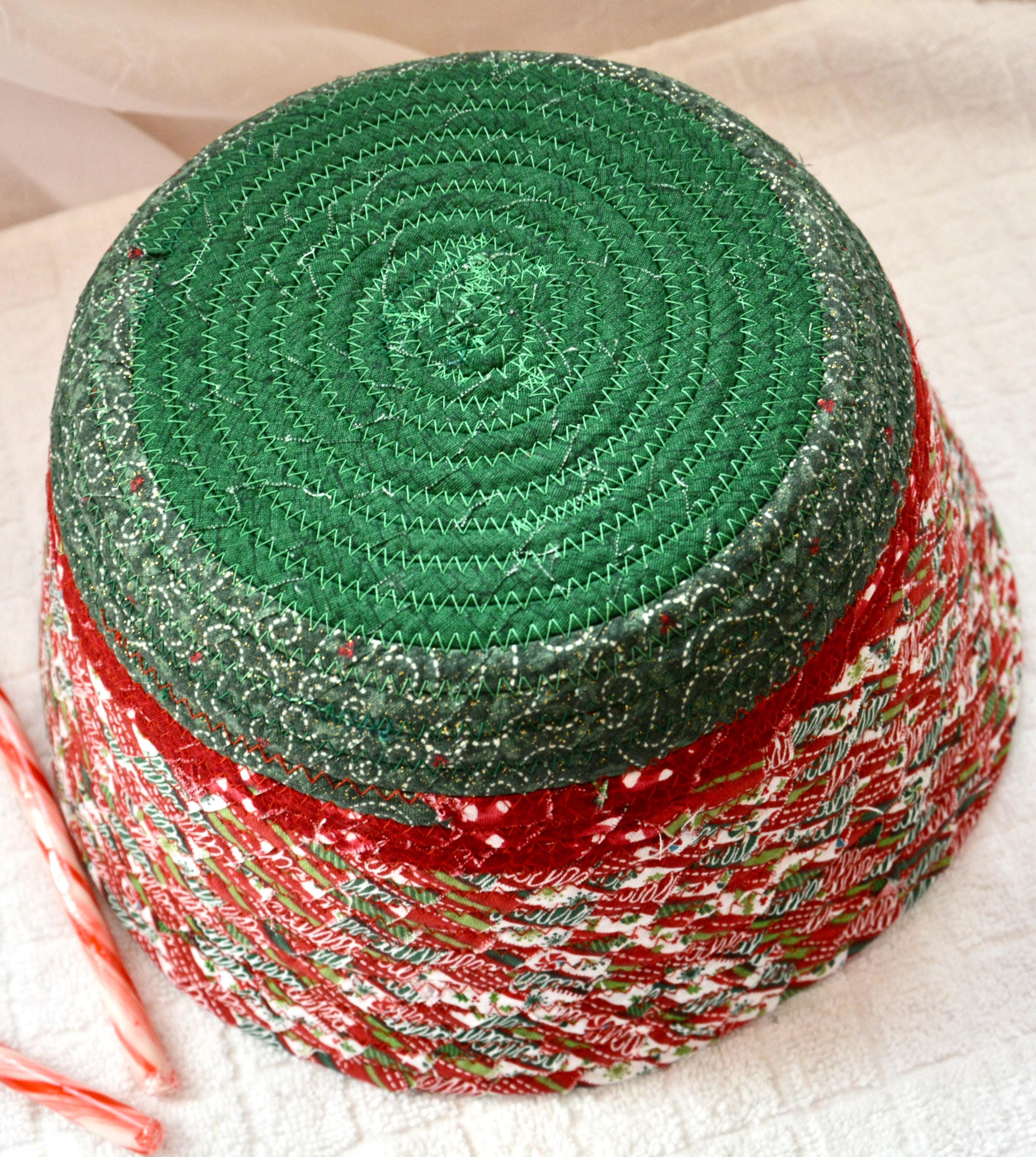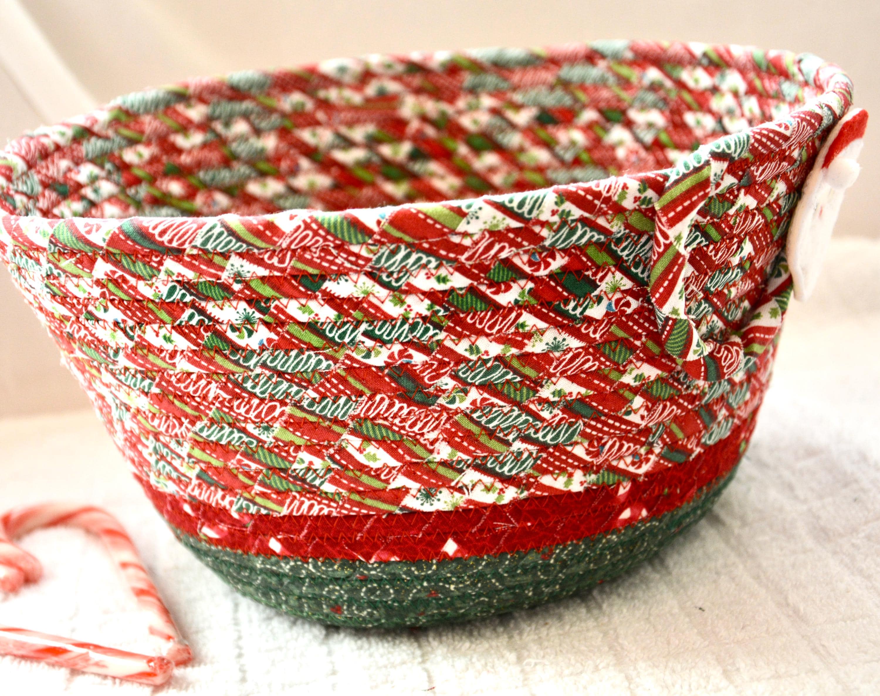I hand wrapped these high quality fabrics around cotton line, which I then hand coiled and machine quilted to make it sturdy. I used the raw edge technique with some fray to add a wonderful shabby chic texture. I just love the cute highlights in this bright cheery fabric! So festive! Cute Santa, he is so cheery too!