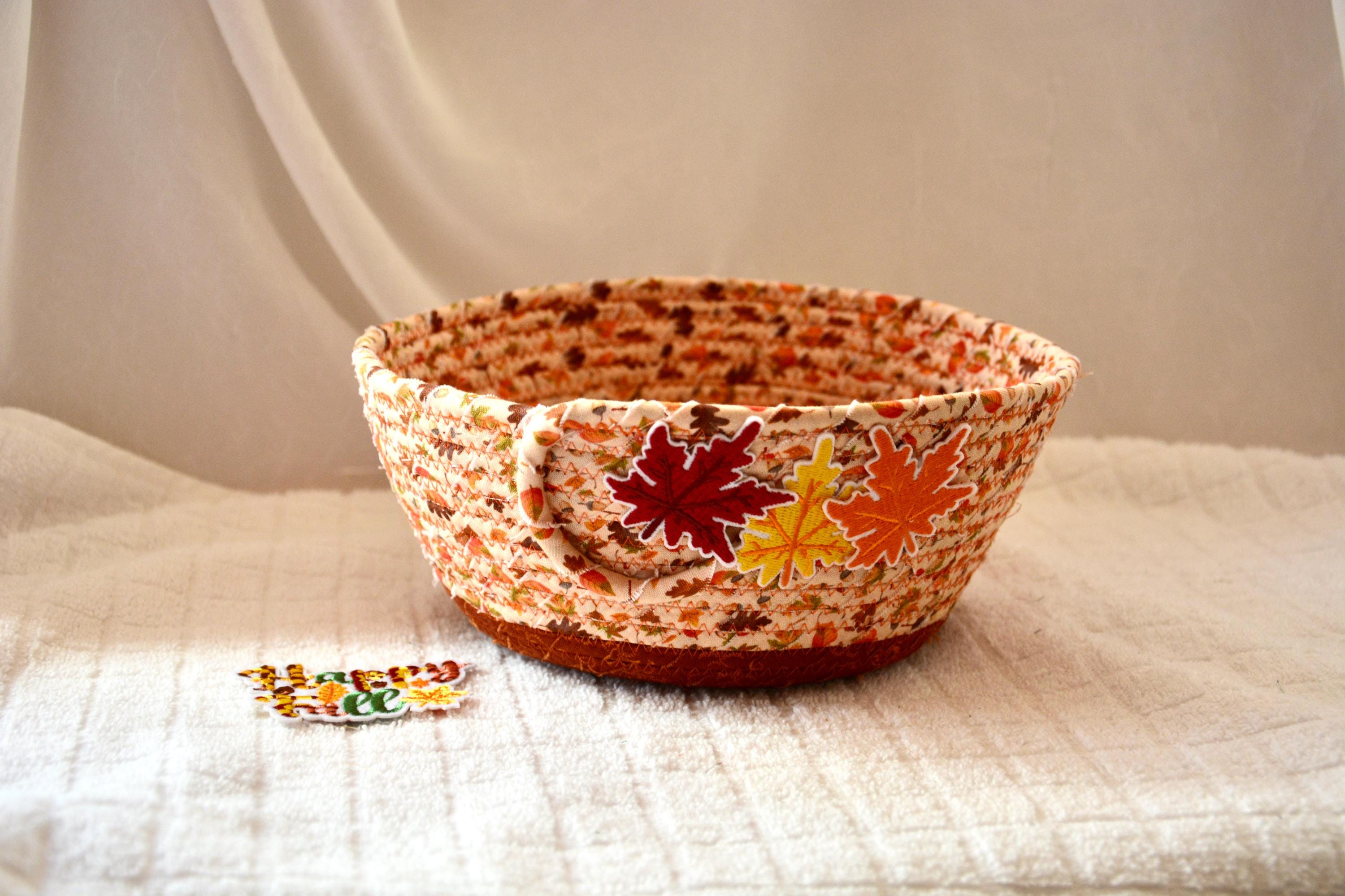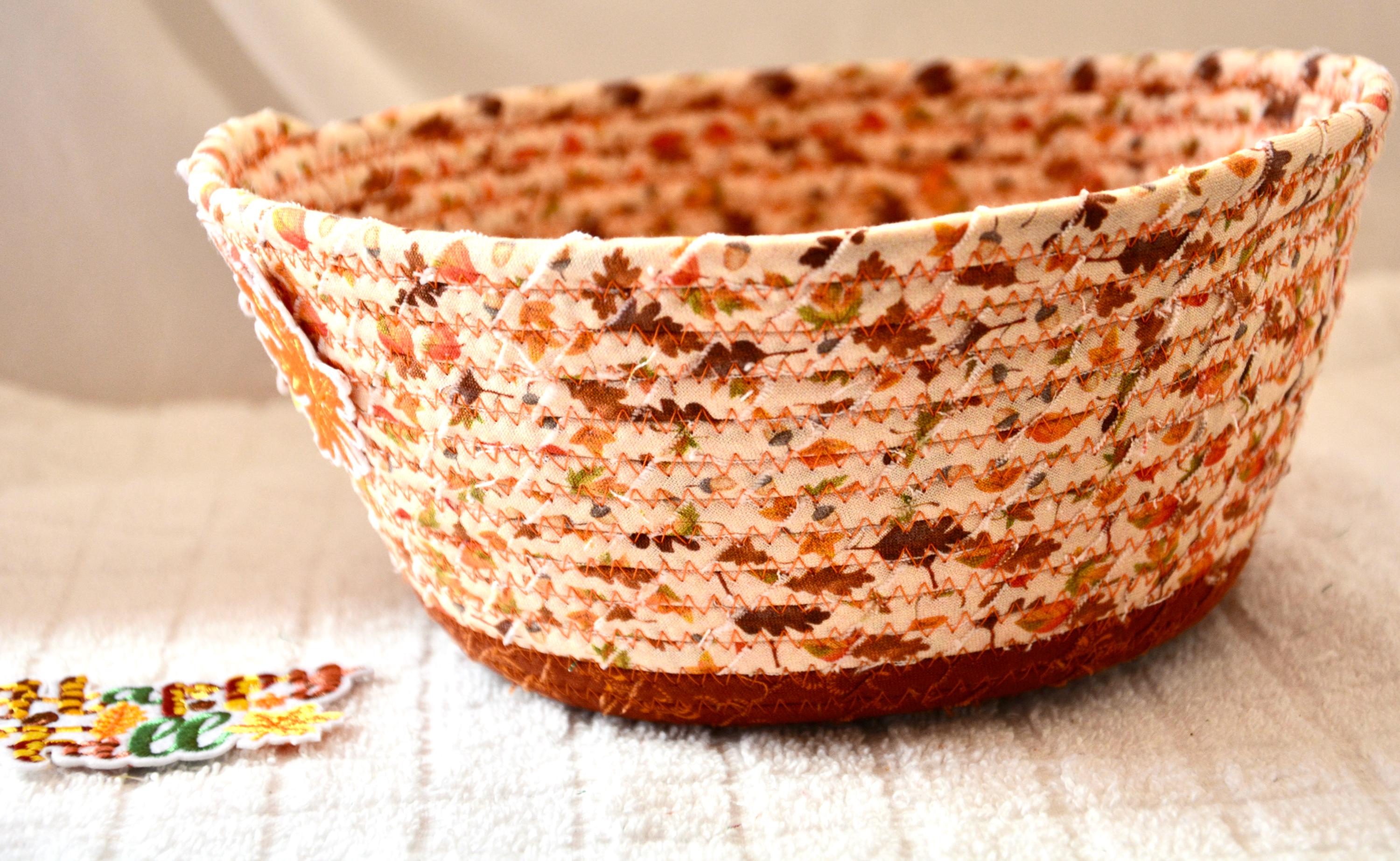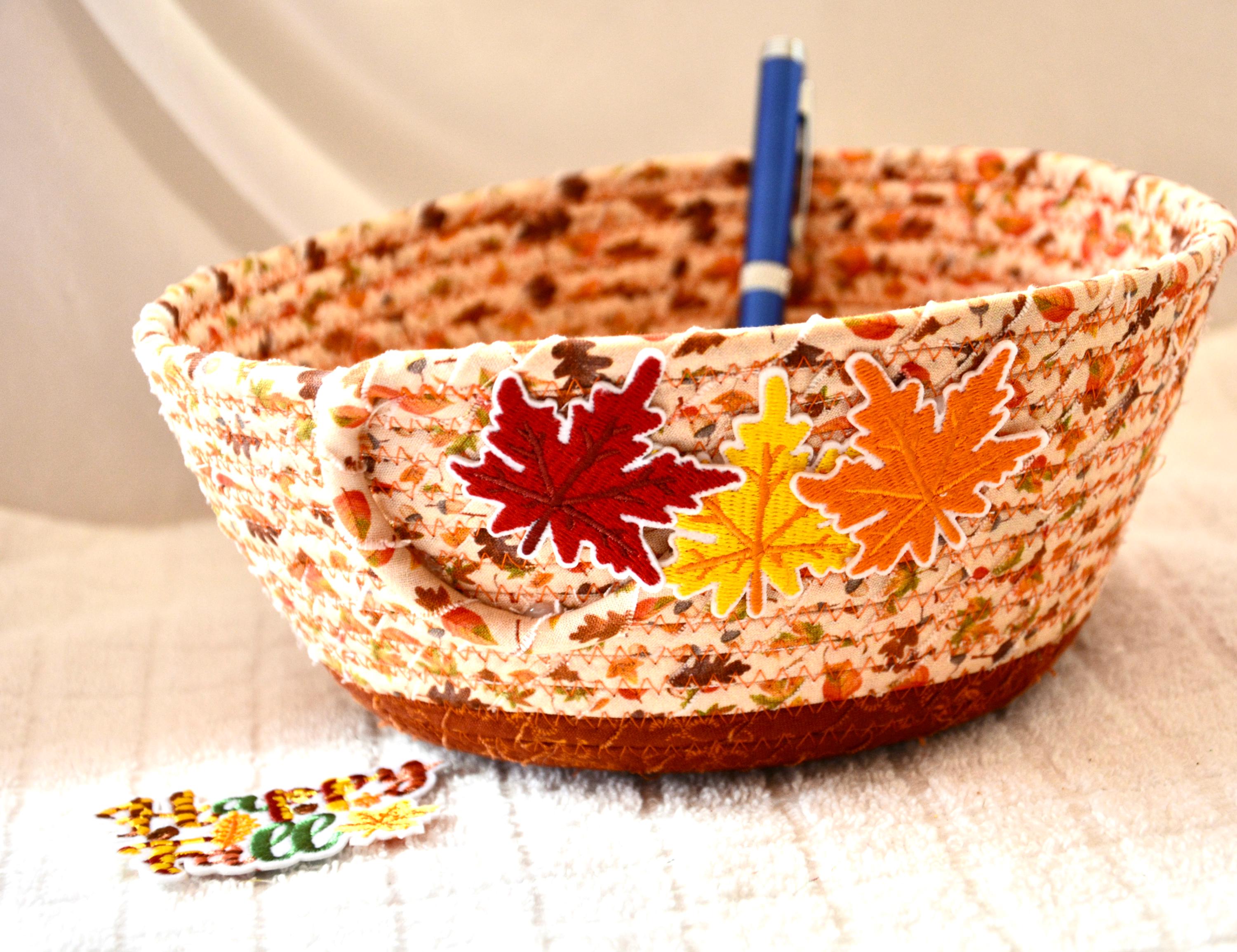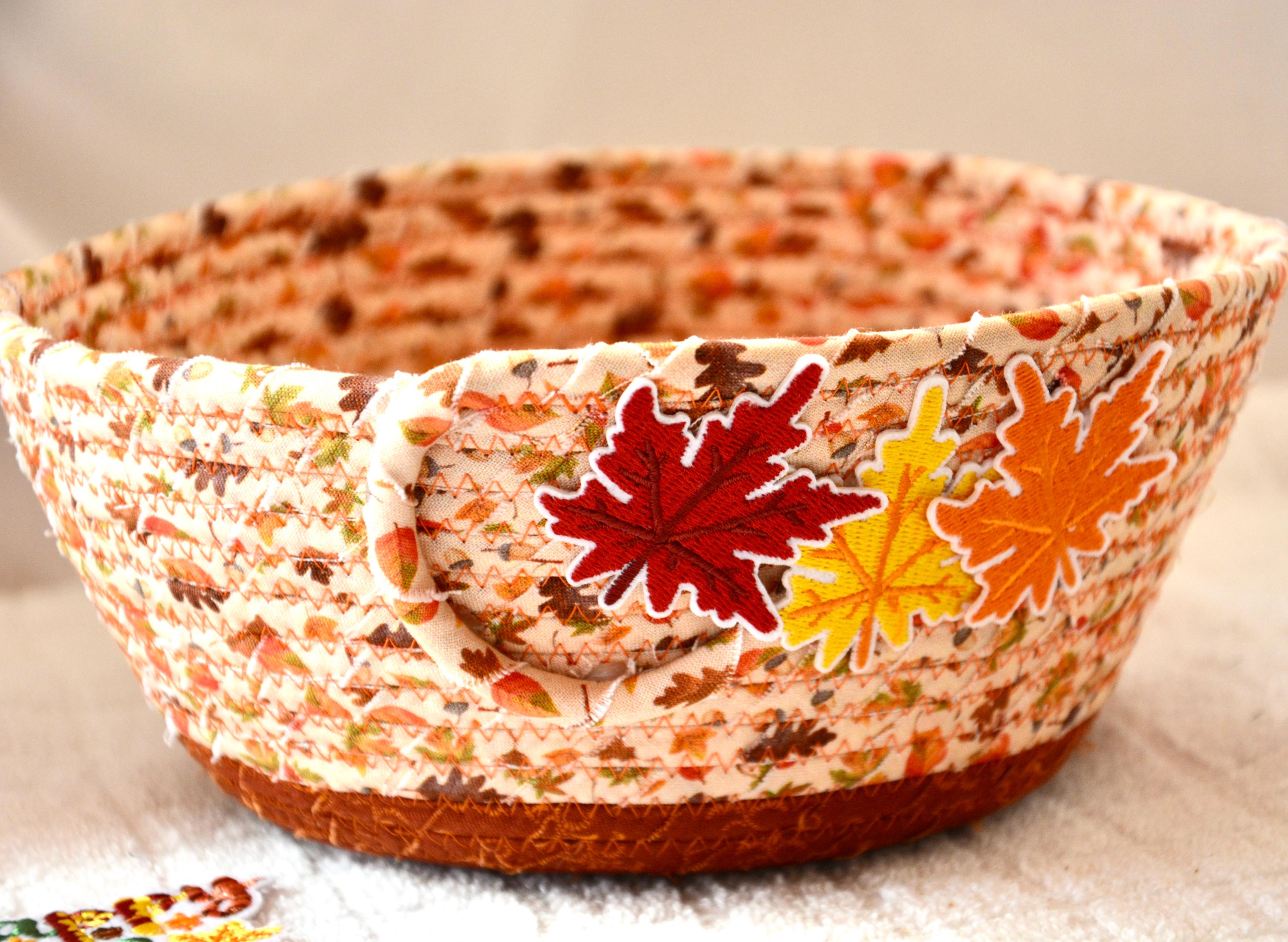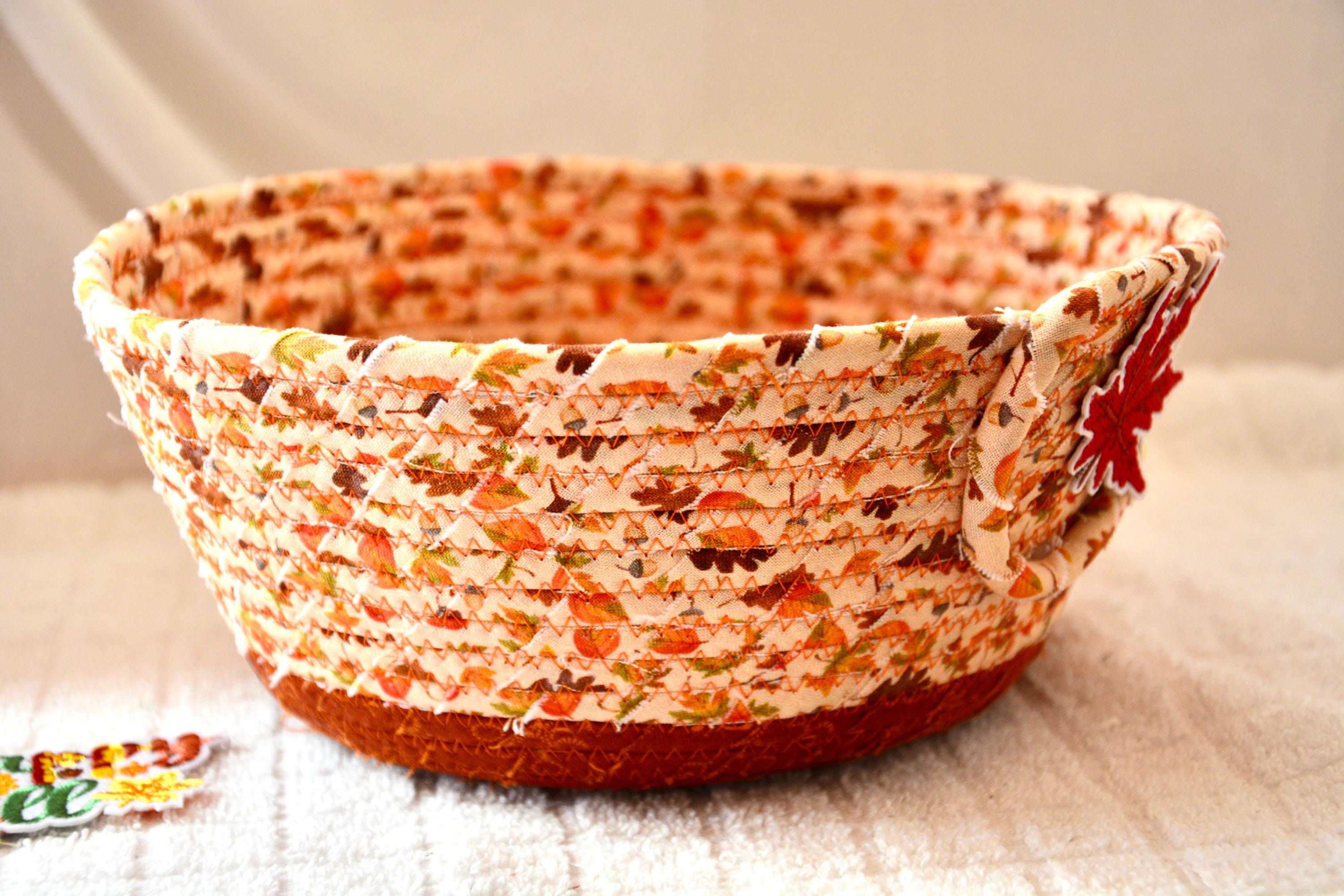 I hand wrapped these pretty beige and gold fabrics around cotton line, which I then hand coiled and machine quilted to make it sturdy. I used the raw edge technique with some fray to add texture. Both fabrics are high quality 100% cotton and show on the inside too! I added lovely leaves for a nice accent! Unique pattern!