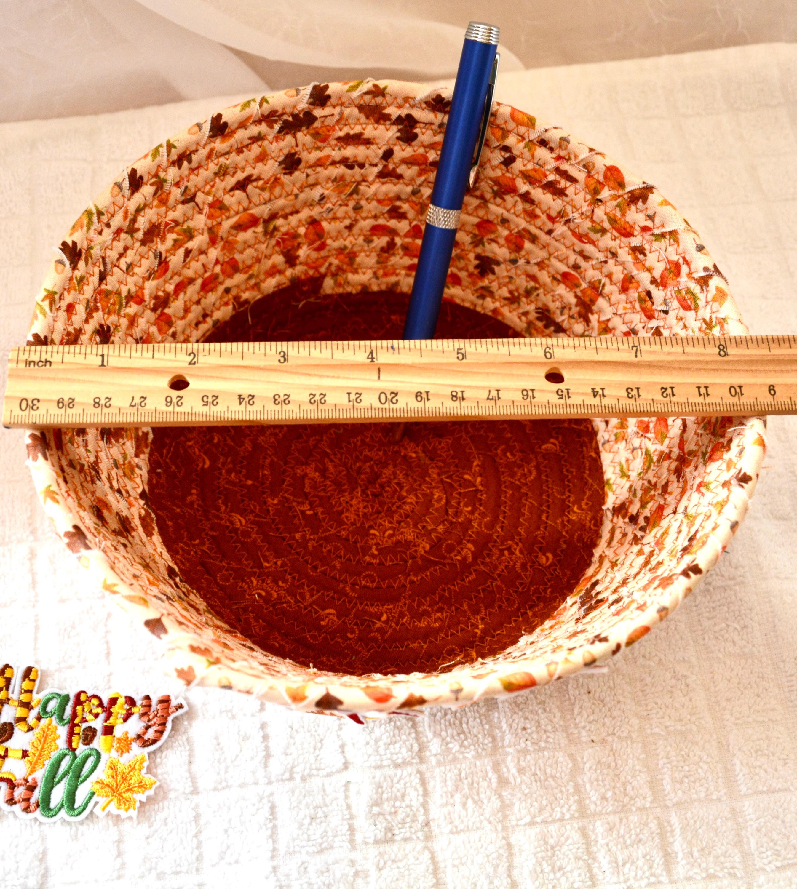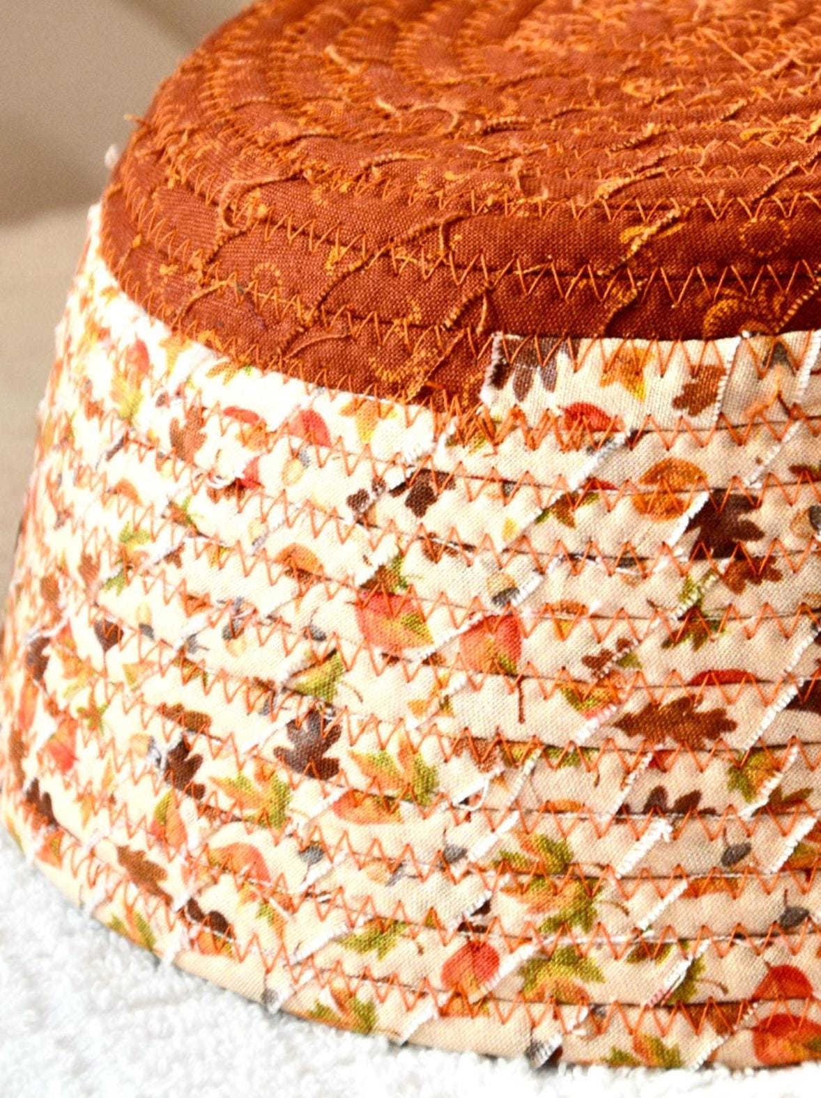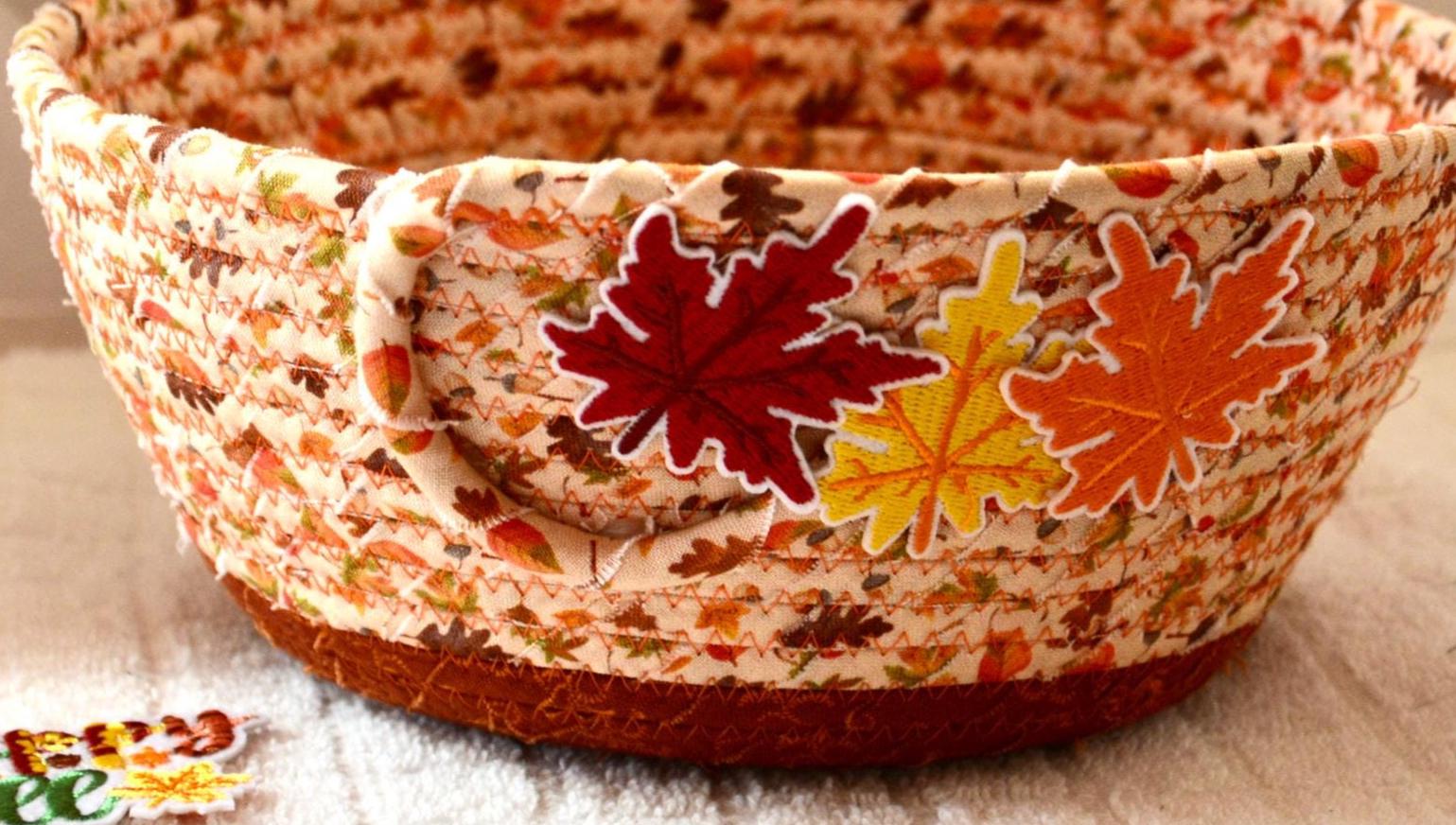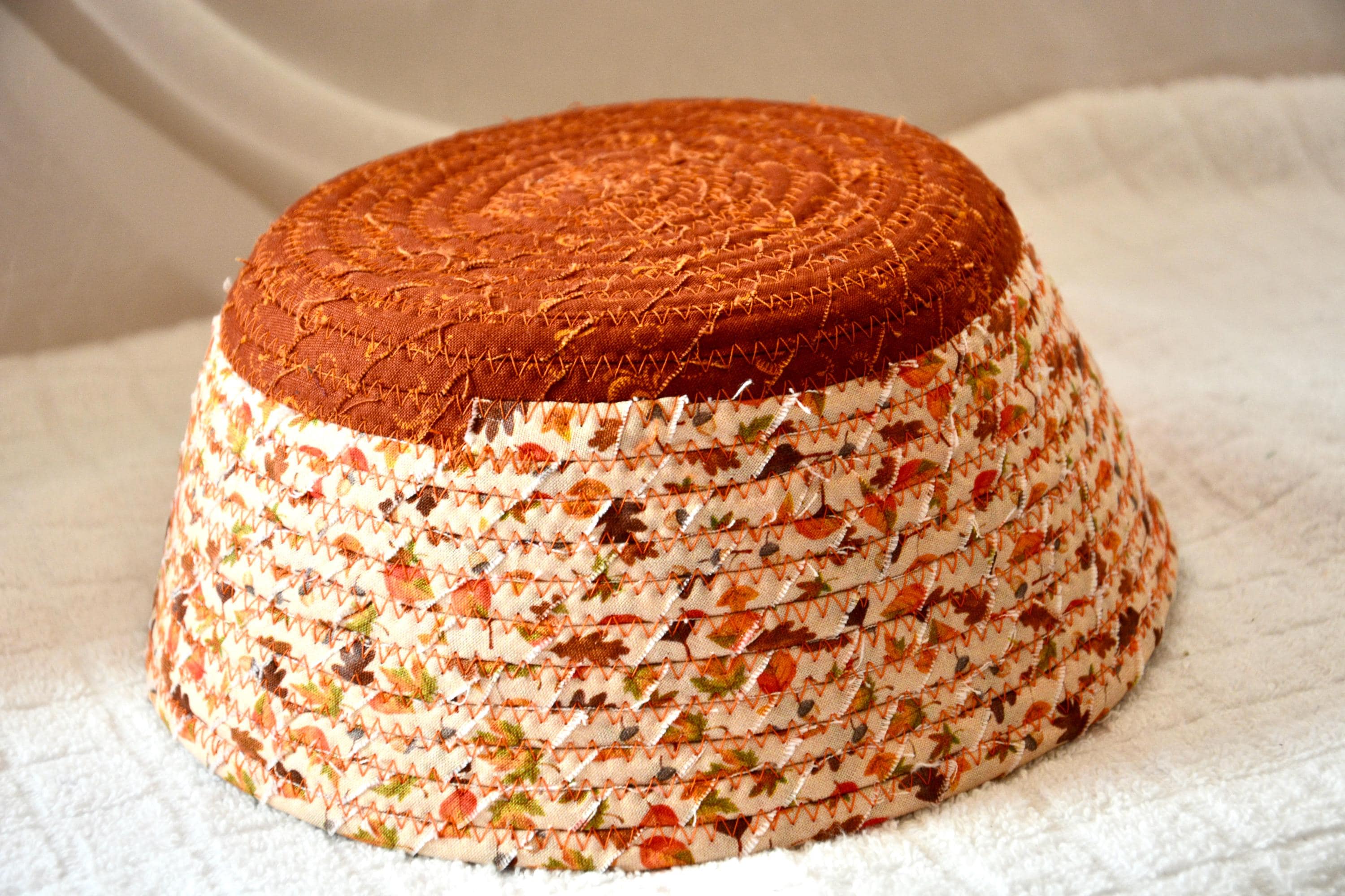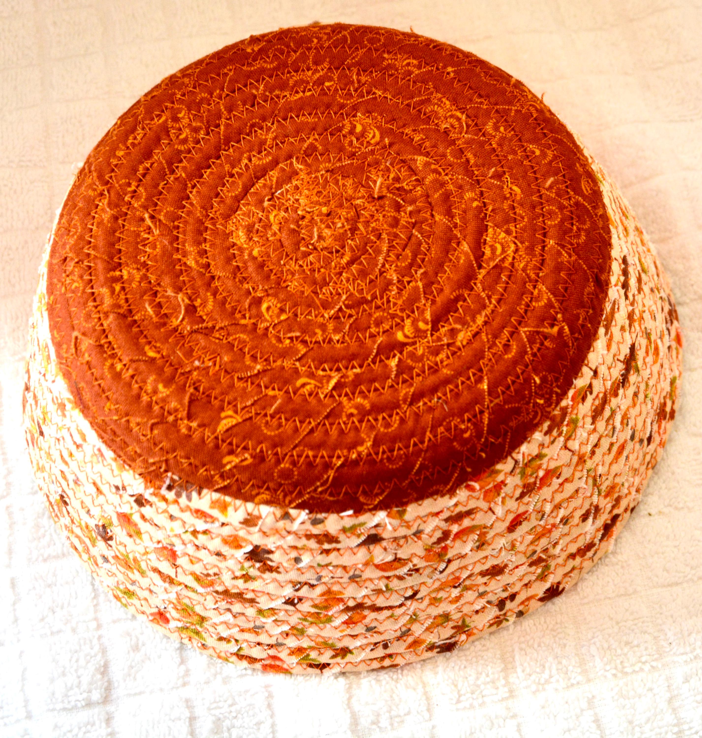 I hand wrapped these pretty beige and gold fabrics around cotton line, which I then hand coiled and machine quilted to make it sturdy. I used the raw edge technique with some fray to add texture. Both fabrics are high quality 100% cotton and show on the inside too! I added lovely leaves for a nice accent! Unique pattern!