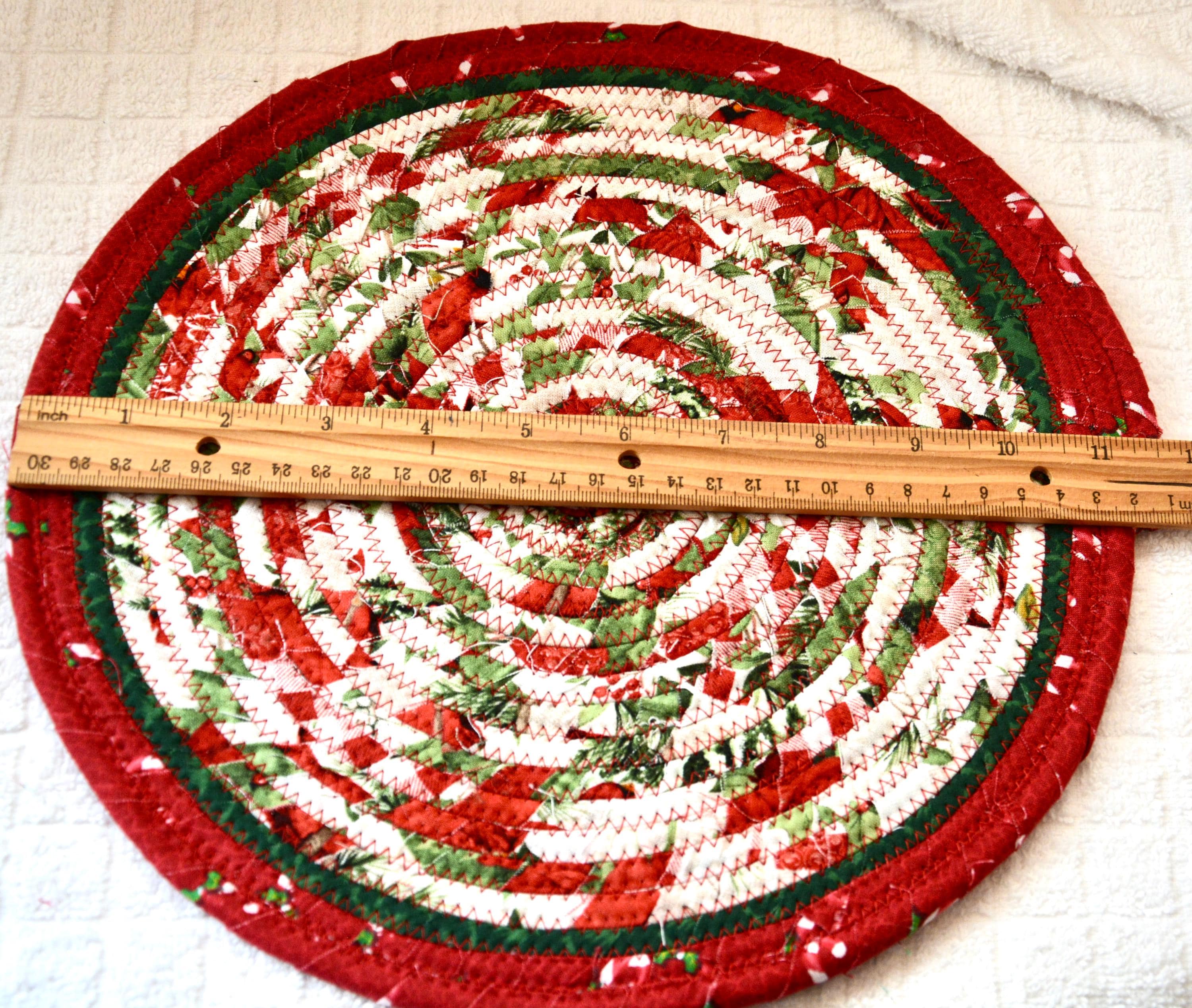 I hand wrapped these lovely Christmas fabrics around cotton line, which I then hand coiled and machine quilted to make it sturdy. I used the raw edge technique with some fray to add a nice shabby chic texture. These pretty Christmas fabrics show on both sides too! 100% cotton! Spot clean. Great Christmas Gift! Hostess Gift!