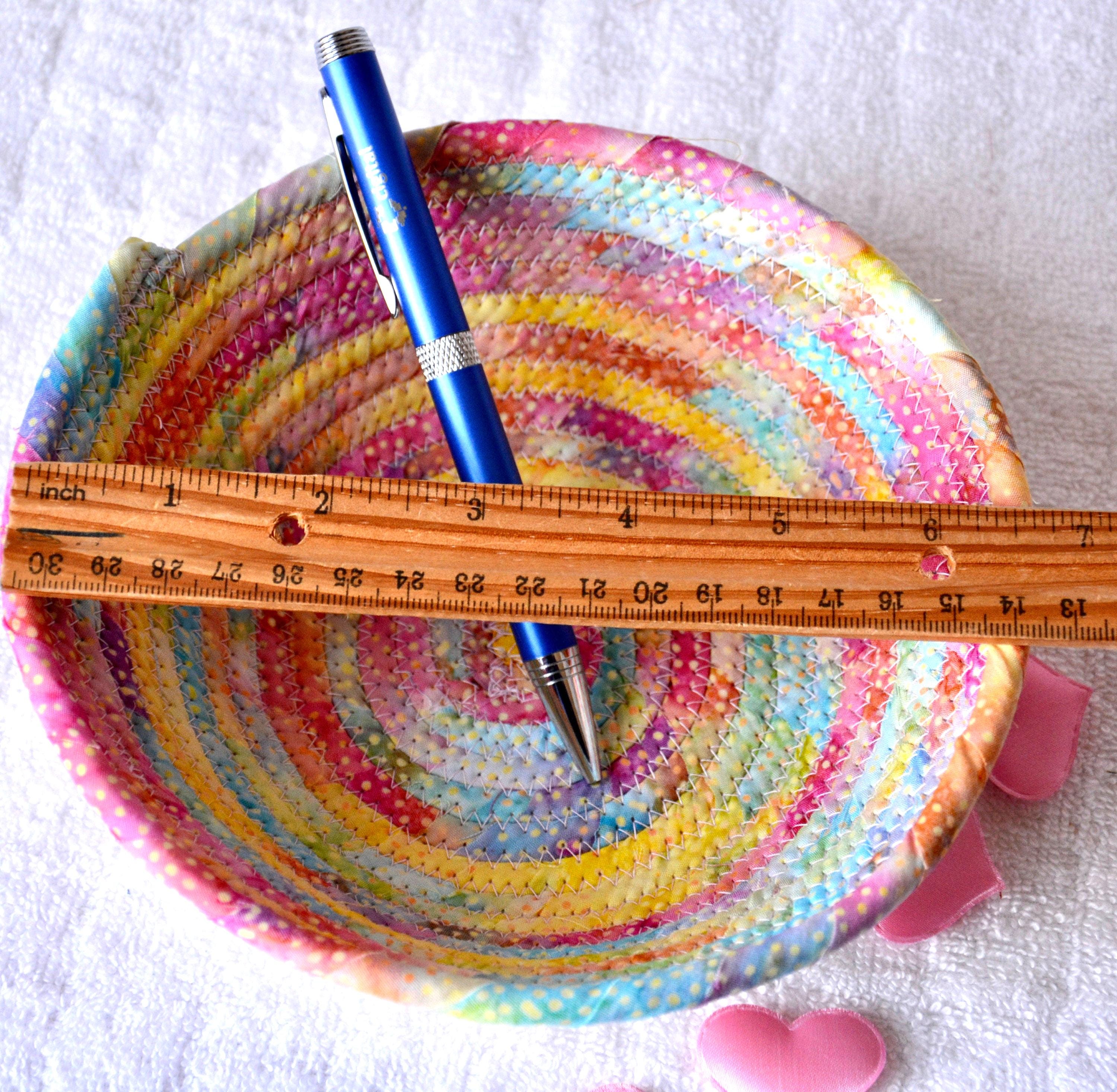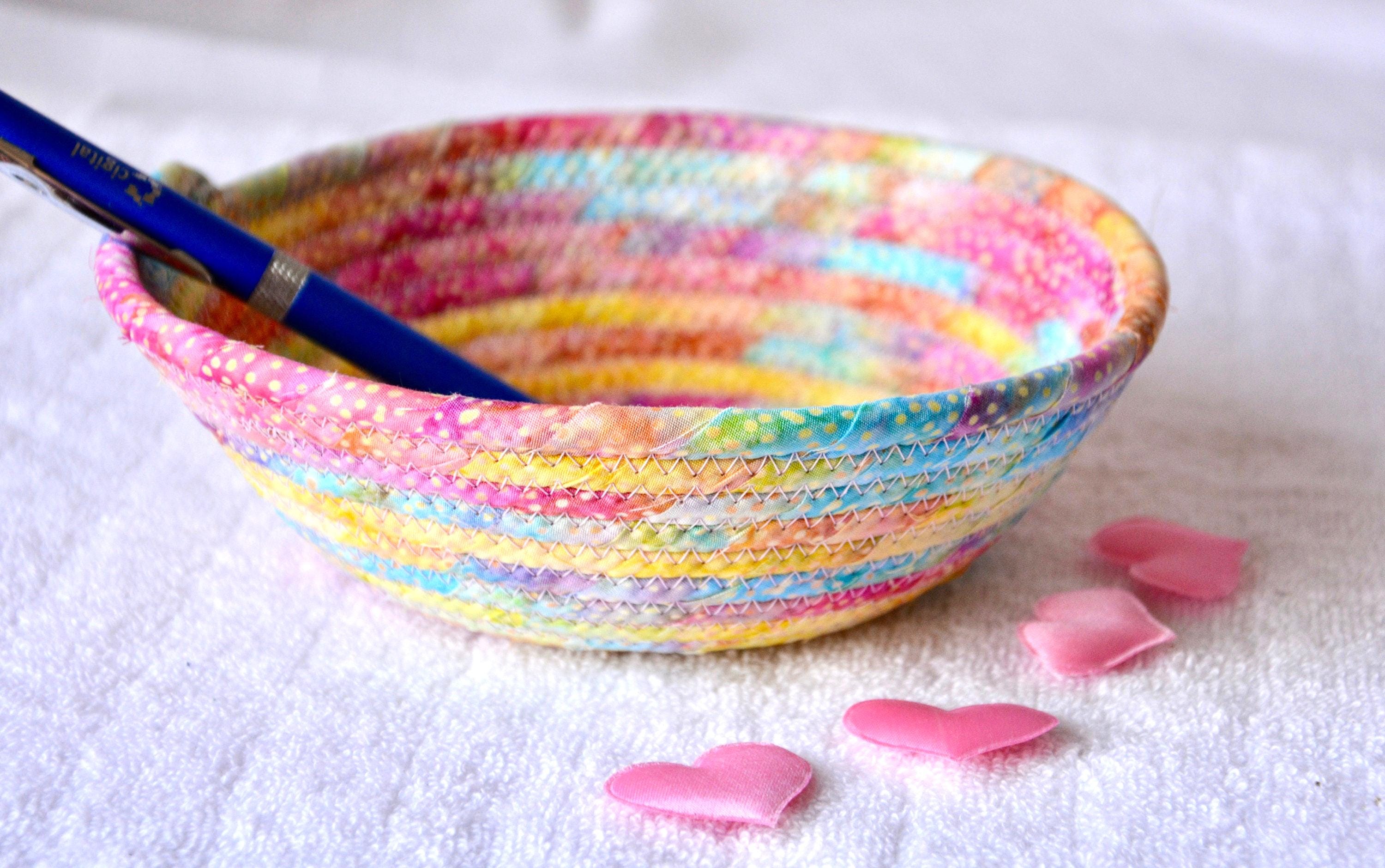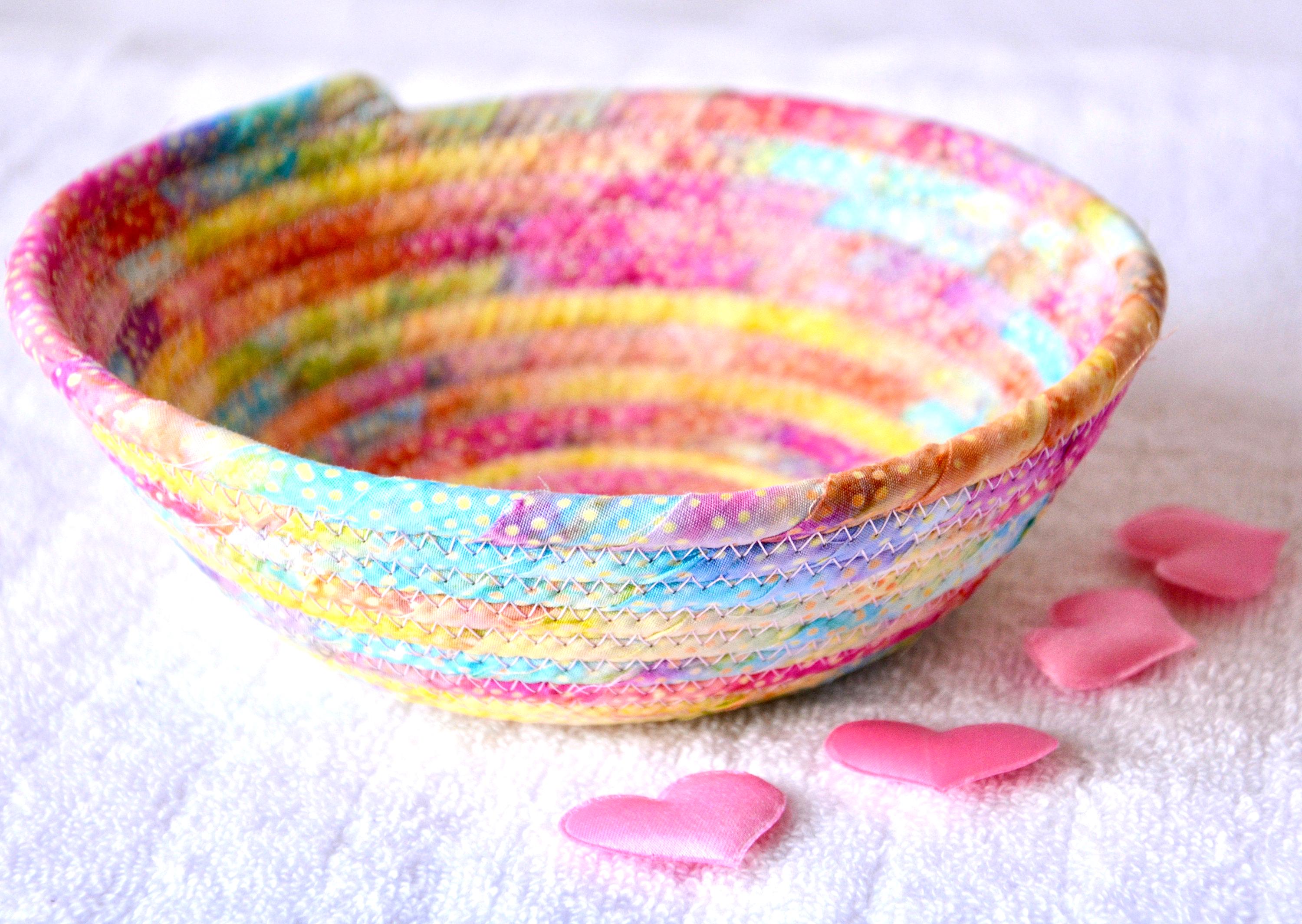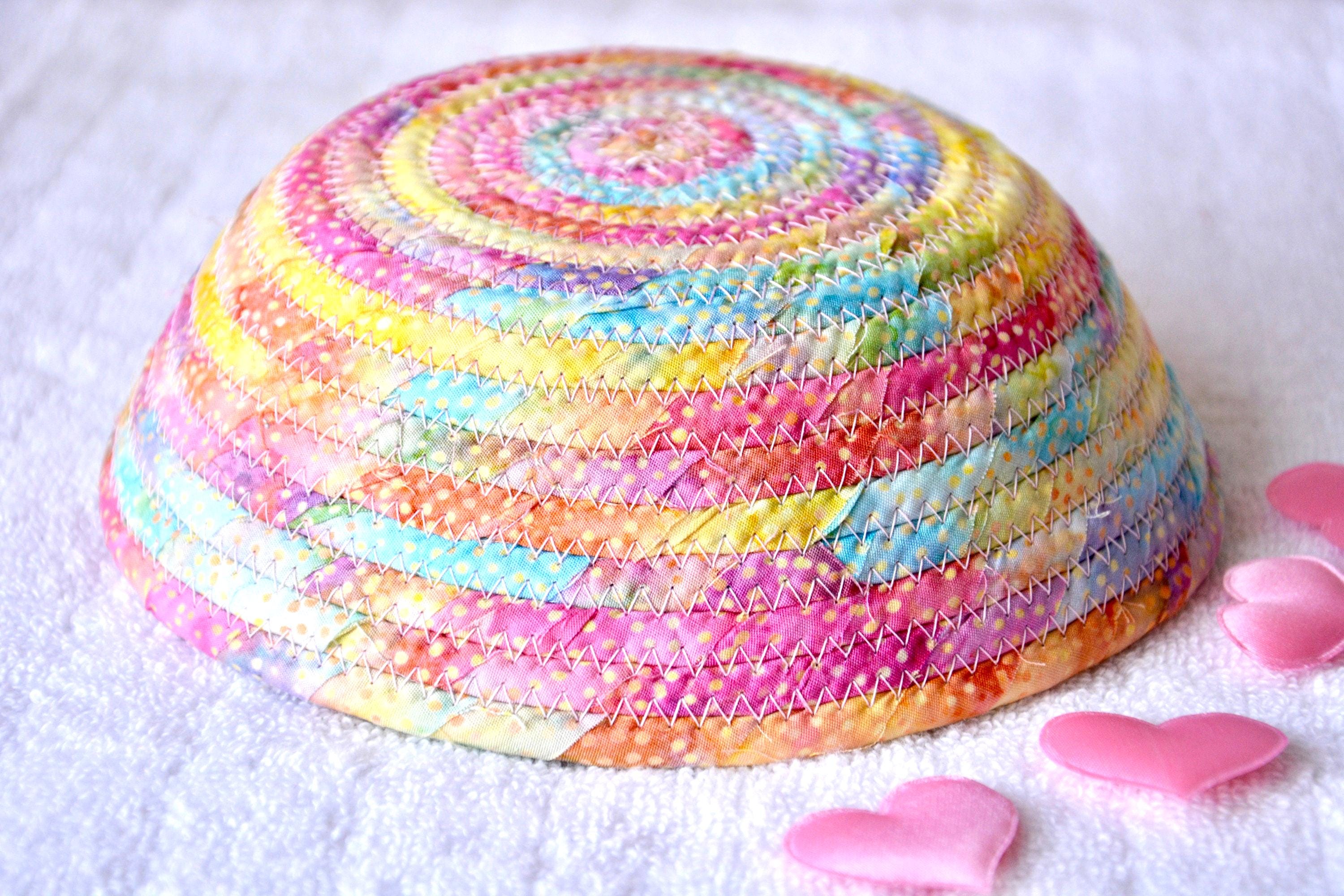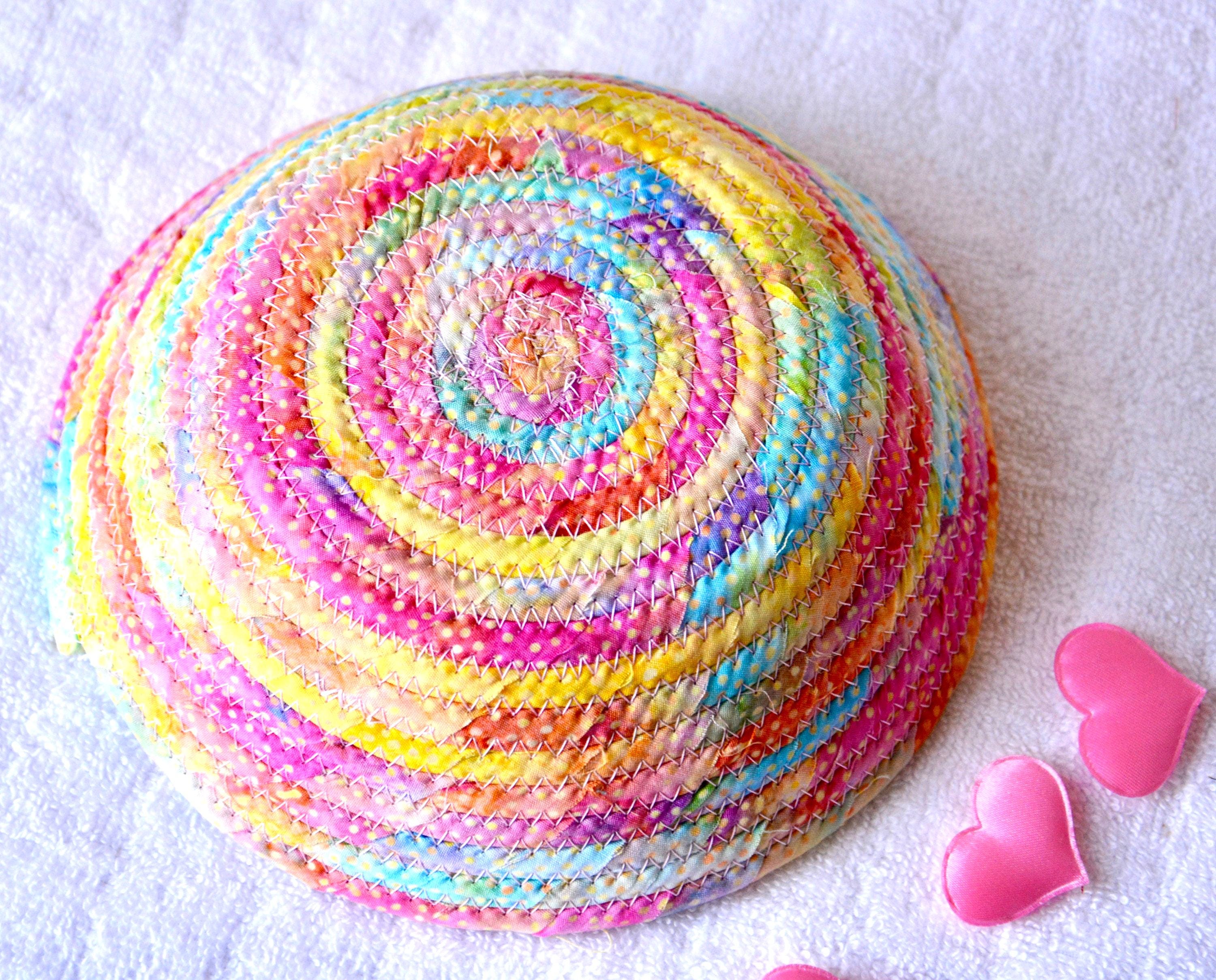 I hand wrapped this wonderful dot batik fabric around cotton line, which I then hand coiled and machine quilted to make it sturdy. I used the raw edge technique with some fray to add a great shabby chic texture. This is a high quality 100% cotton fabric and it shows on the inside too! Color placement will vary.