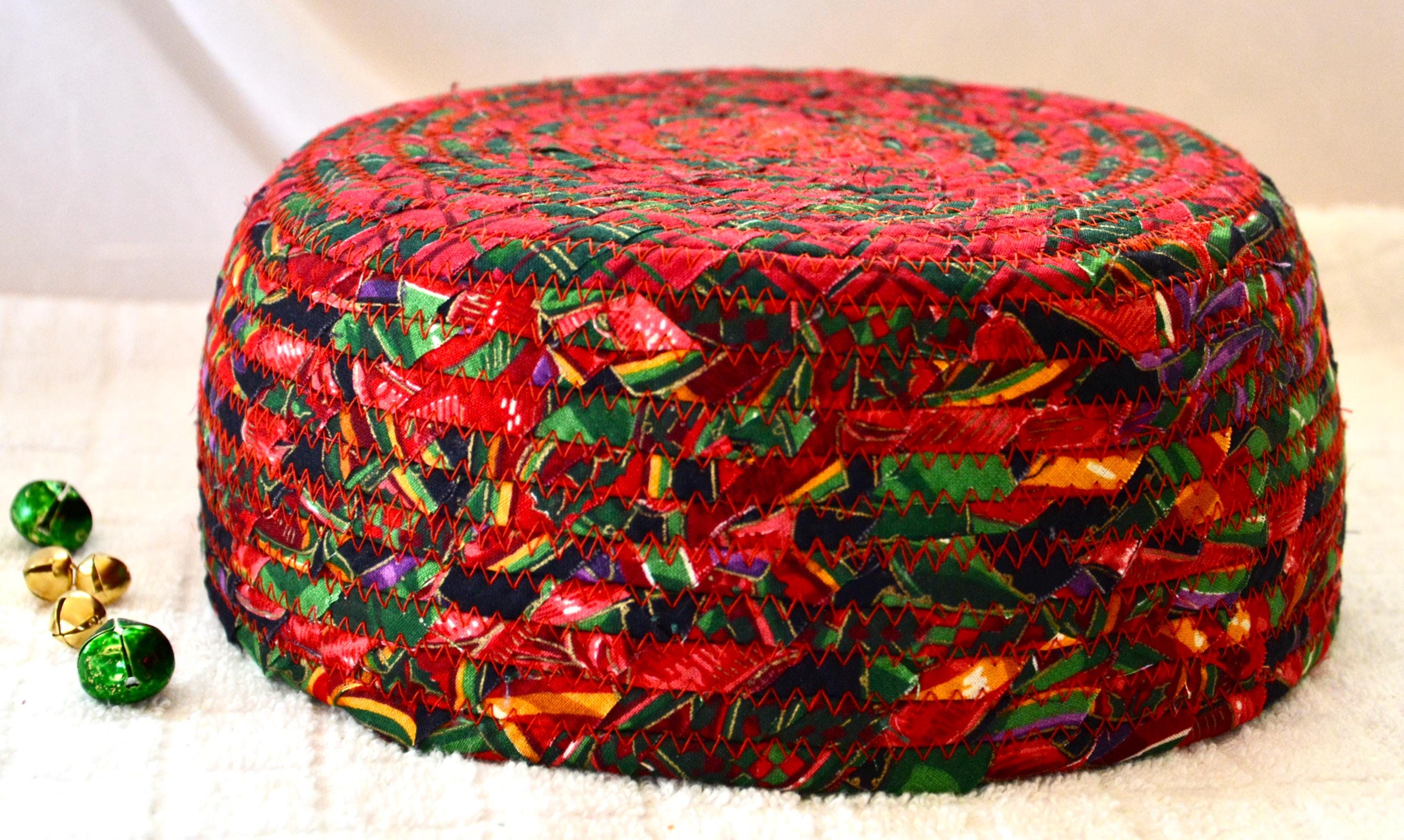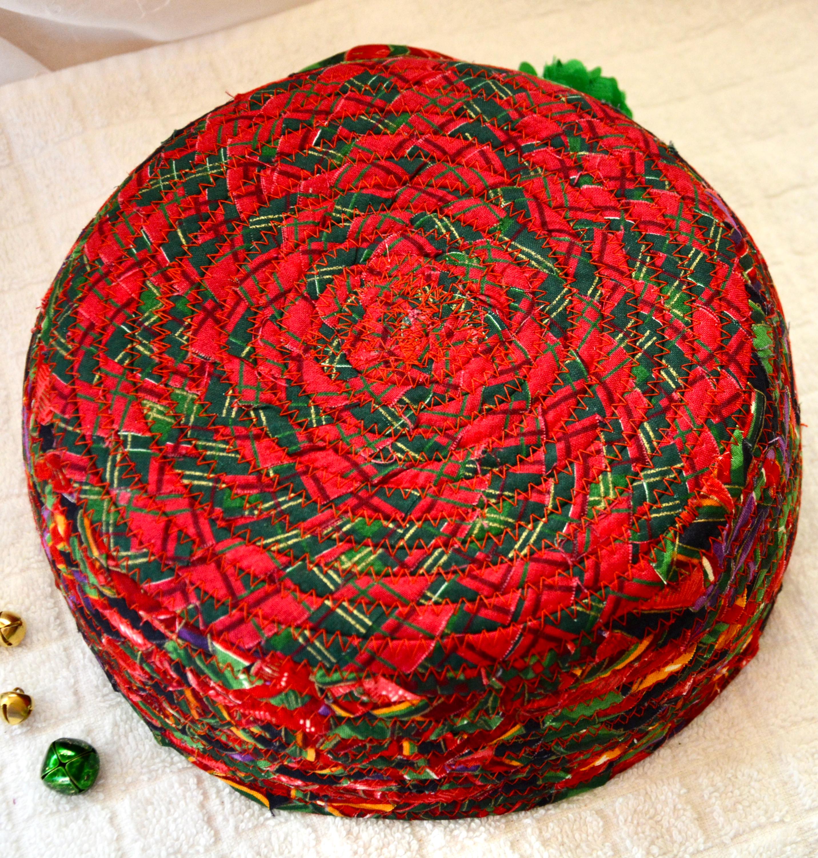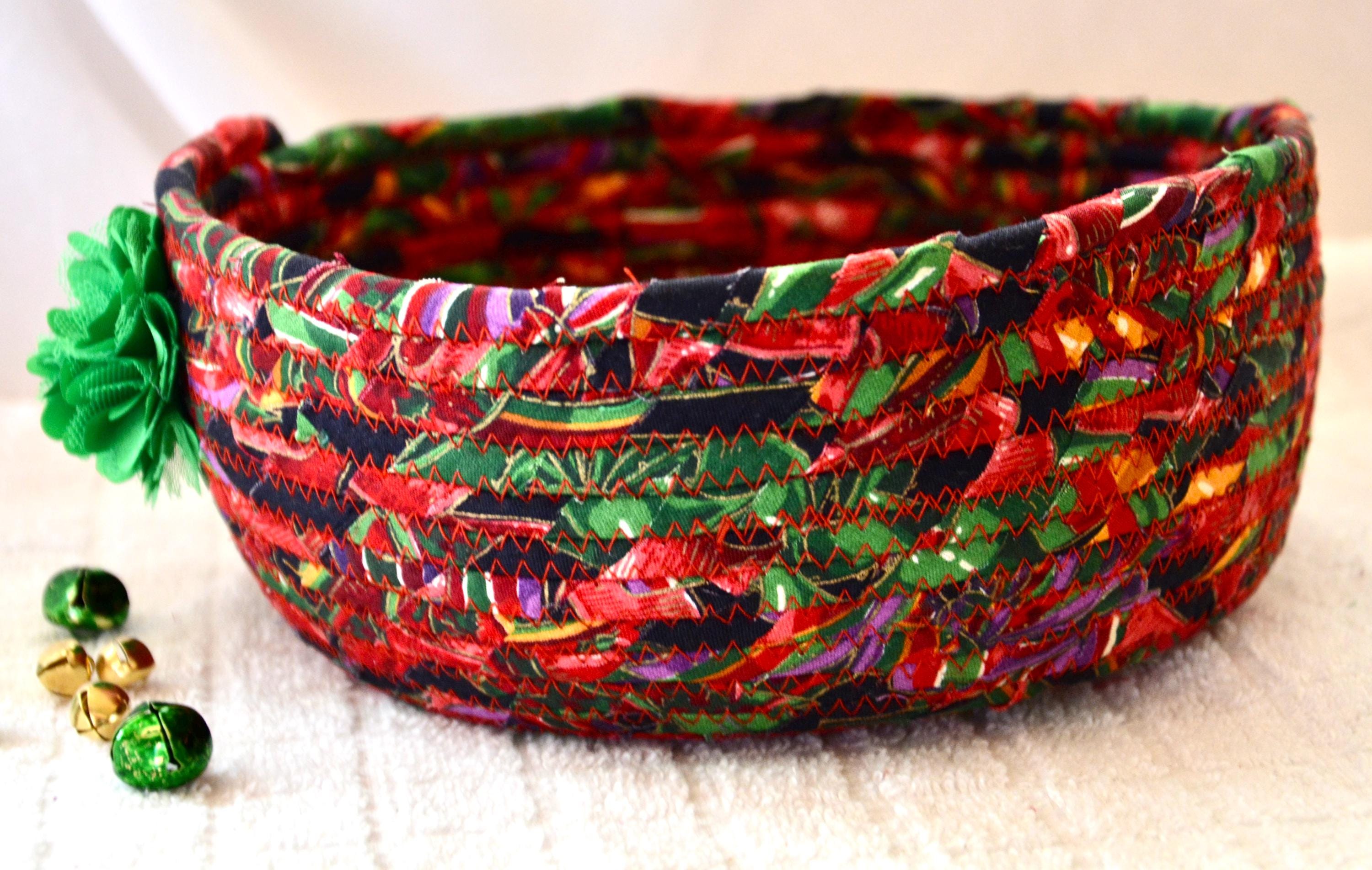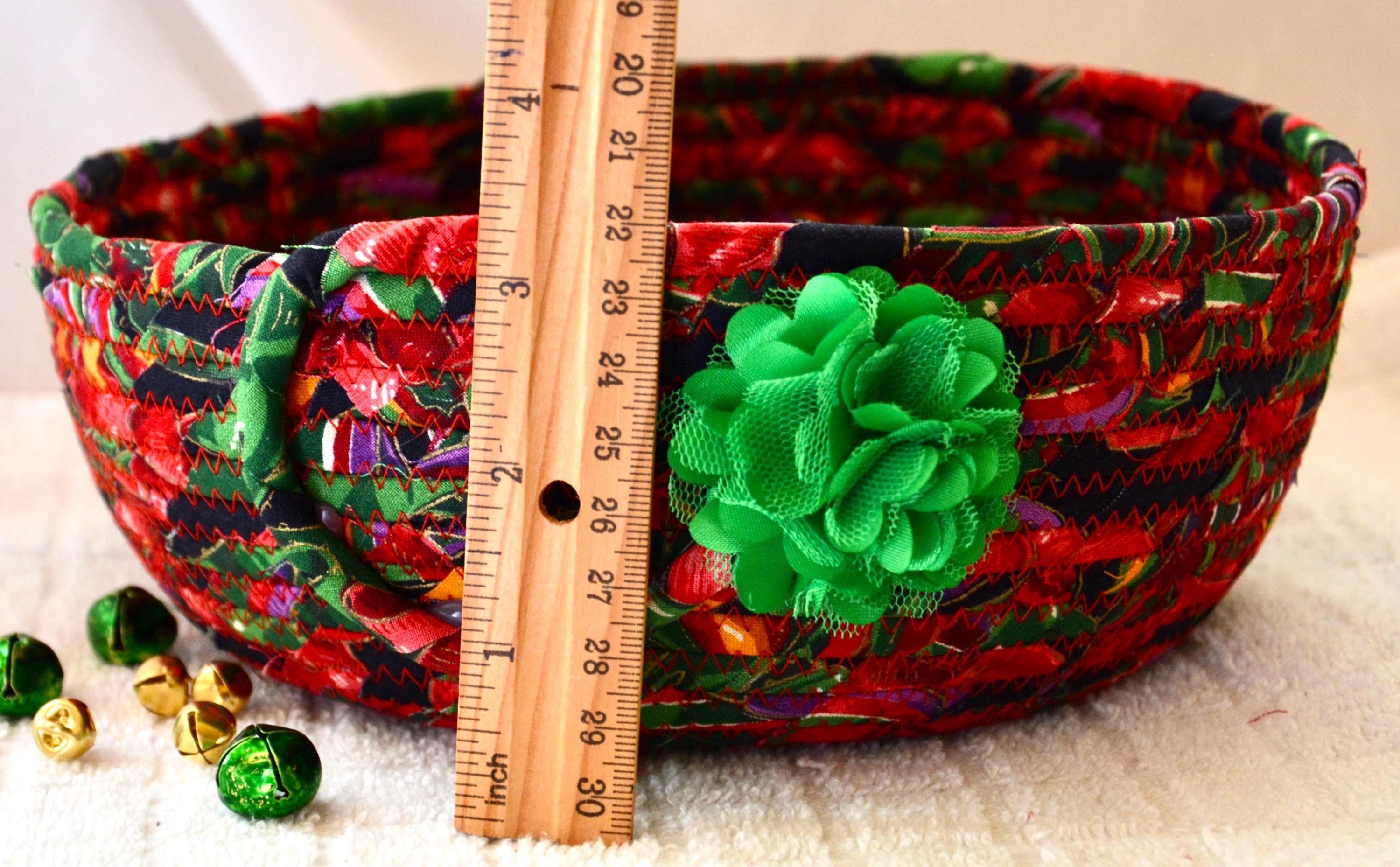 I hand wrapped these high quality Christmas fabrics around cotton line, which I then hand coiled and machine quilted to make it sturdy. I used the raw edge technique with some fray to add a wonderful shabby chic texture. I just love the gold metallic highlights in this beautiful floral Christmas fabric! So festive!
