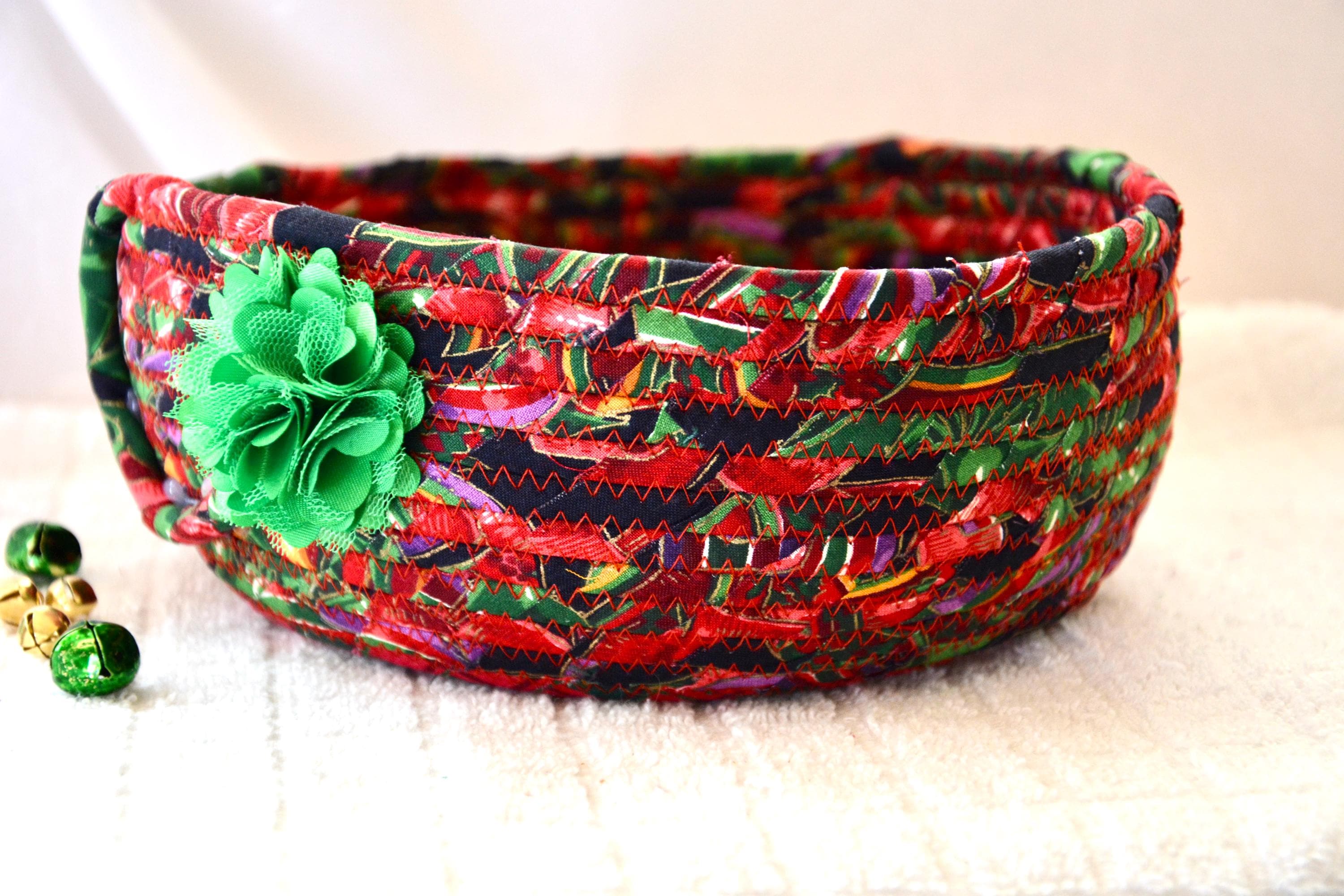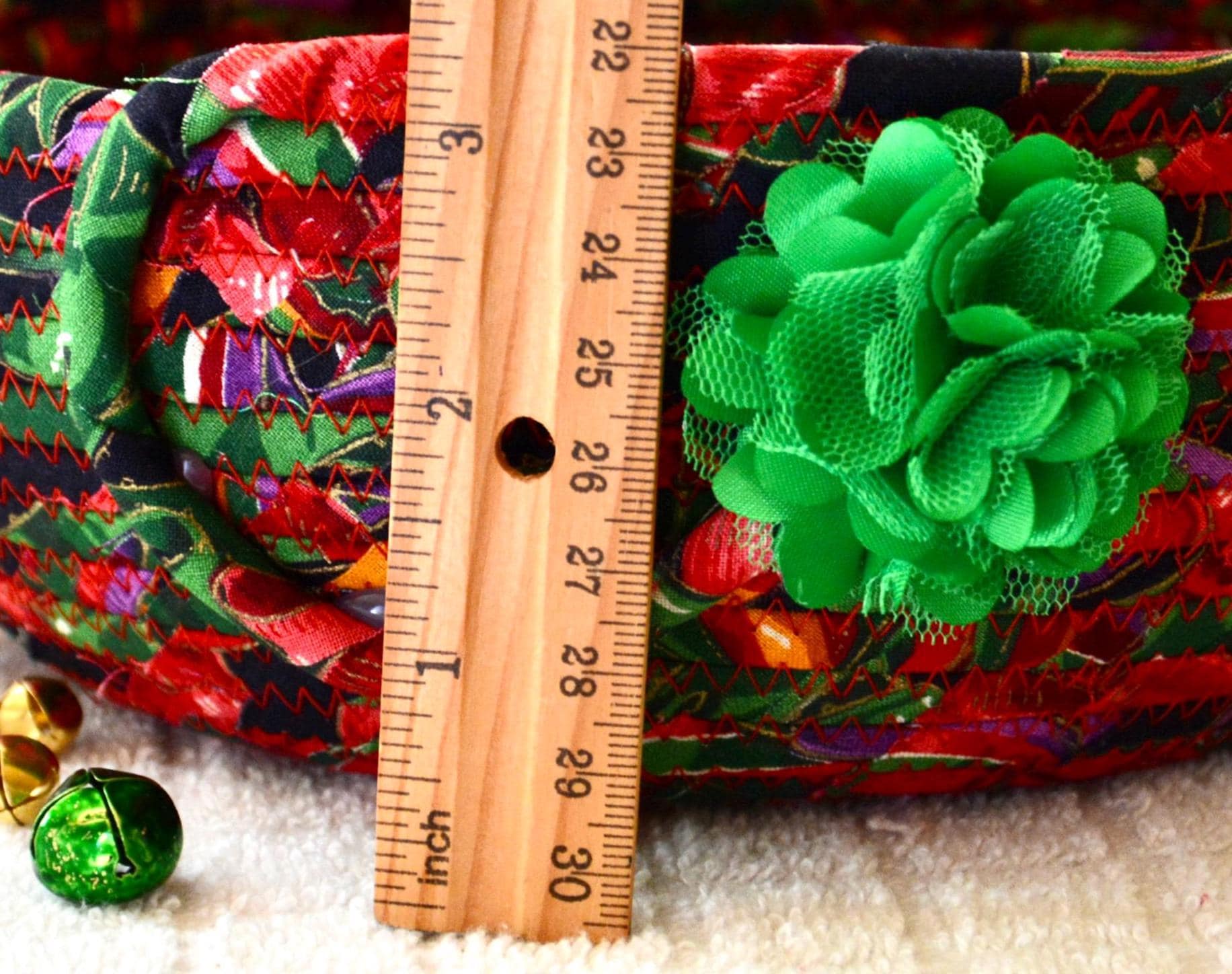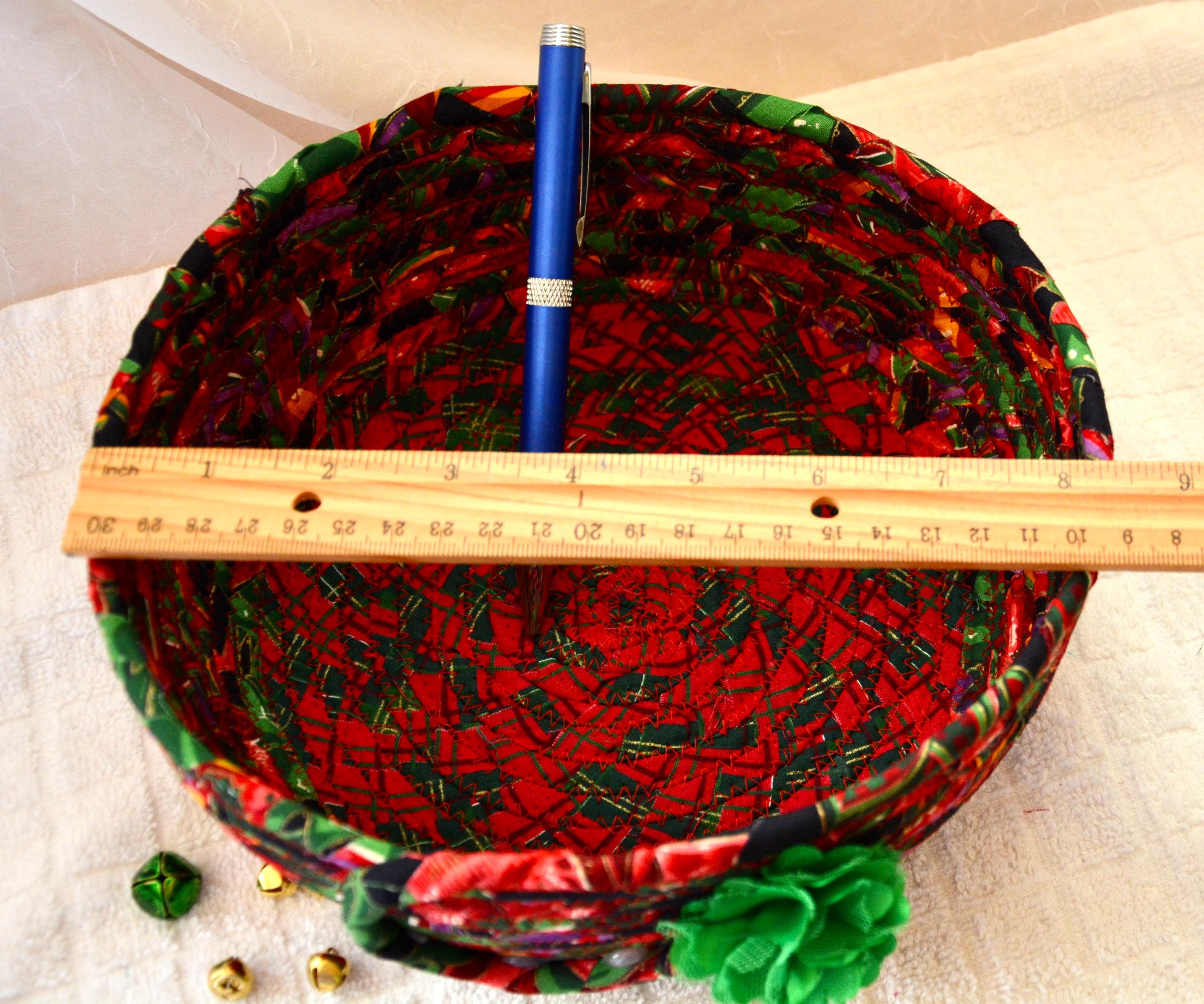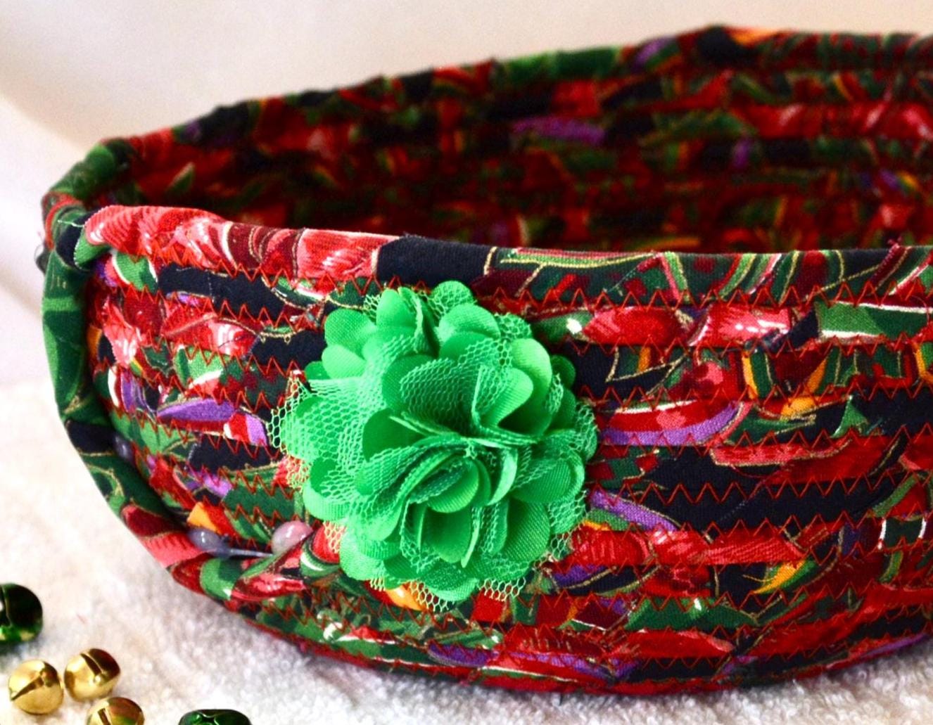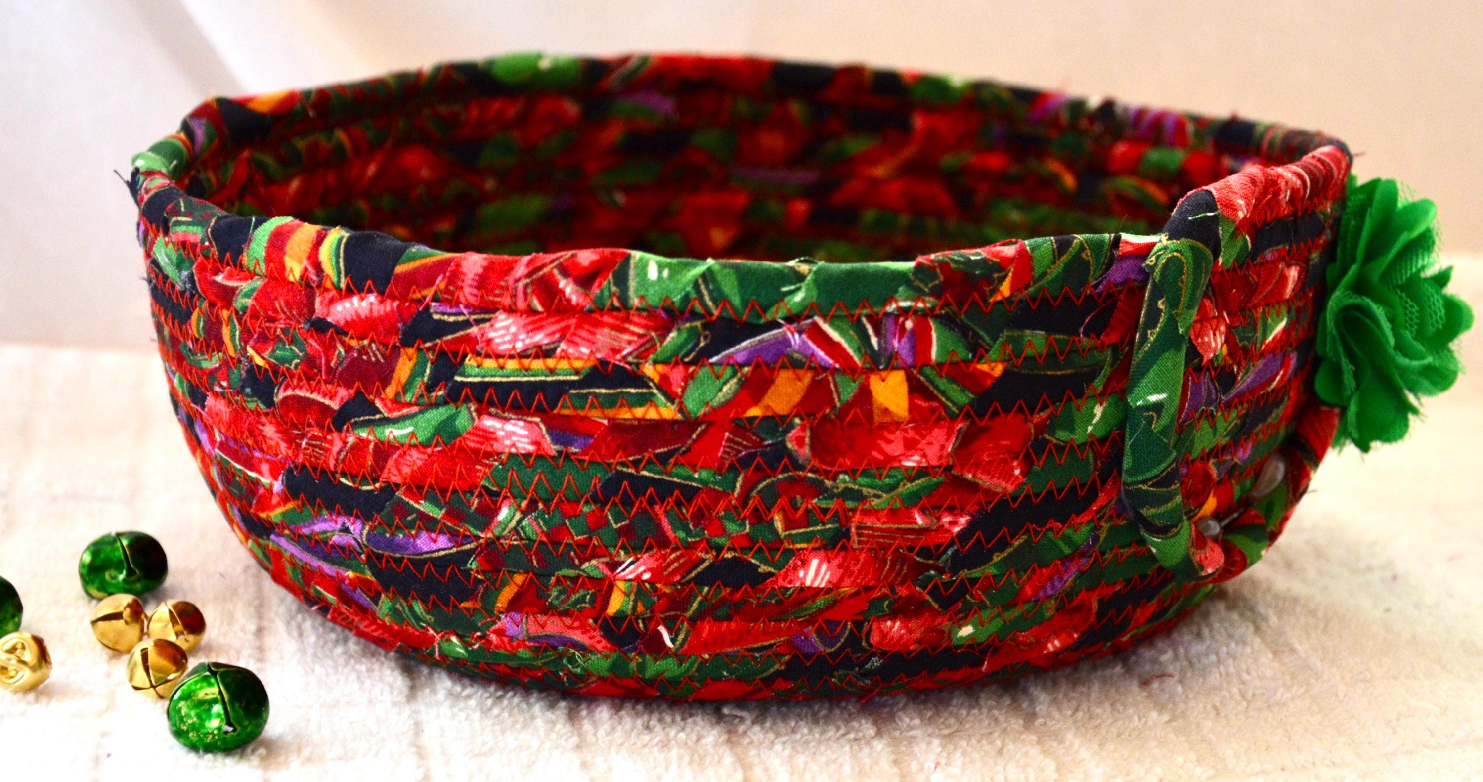 I hand wrapped these high quality Christmas fabrics around cotton line, which I then hand coiled and machine quilted to make it sturdy. I used the raw edge technique with some fray to add a wonderful shabby chic texture. I just love the gold metallic highlights in this beautiful floral Christmas fabric! So festive!