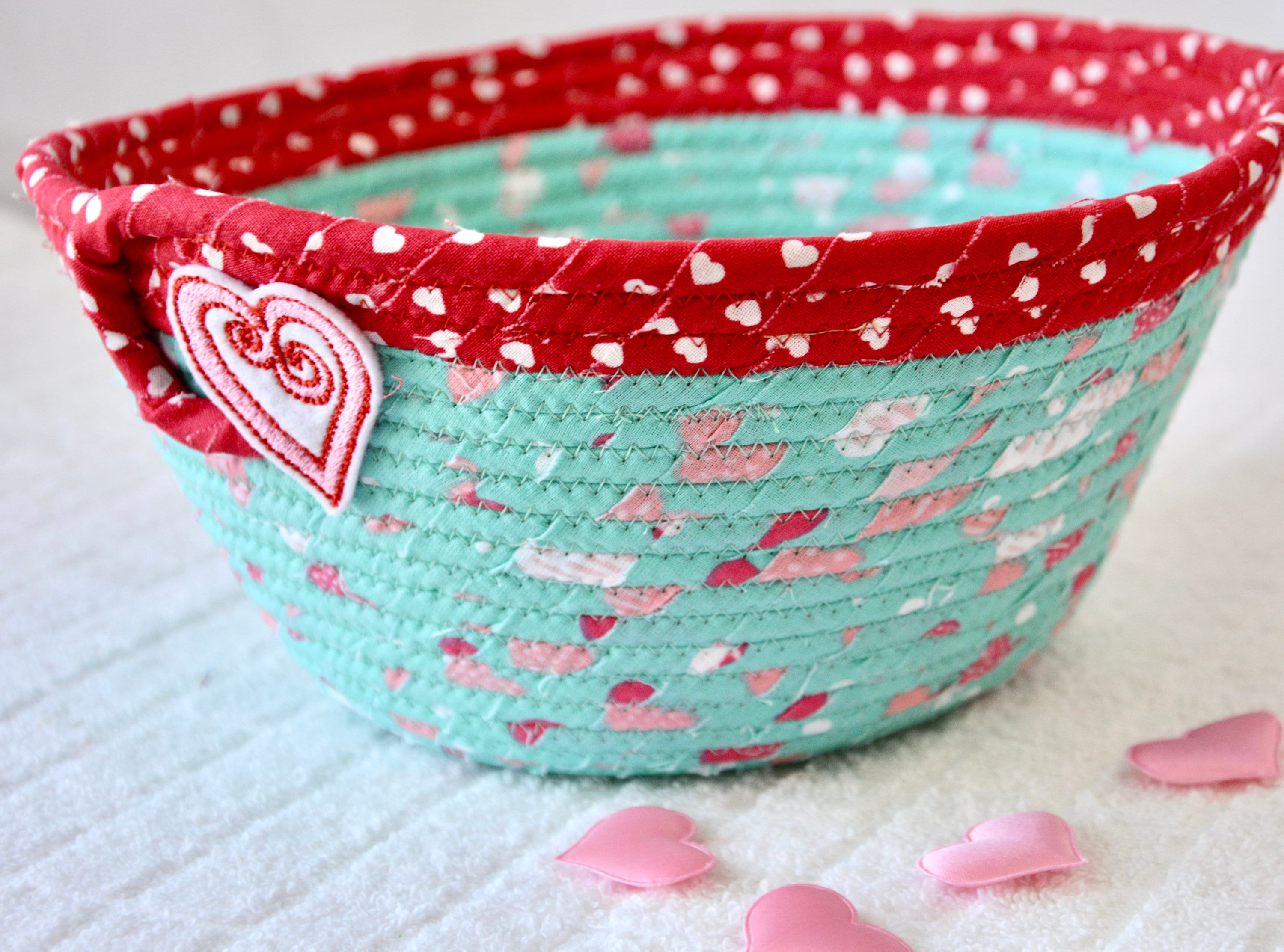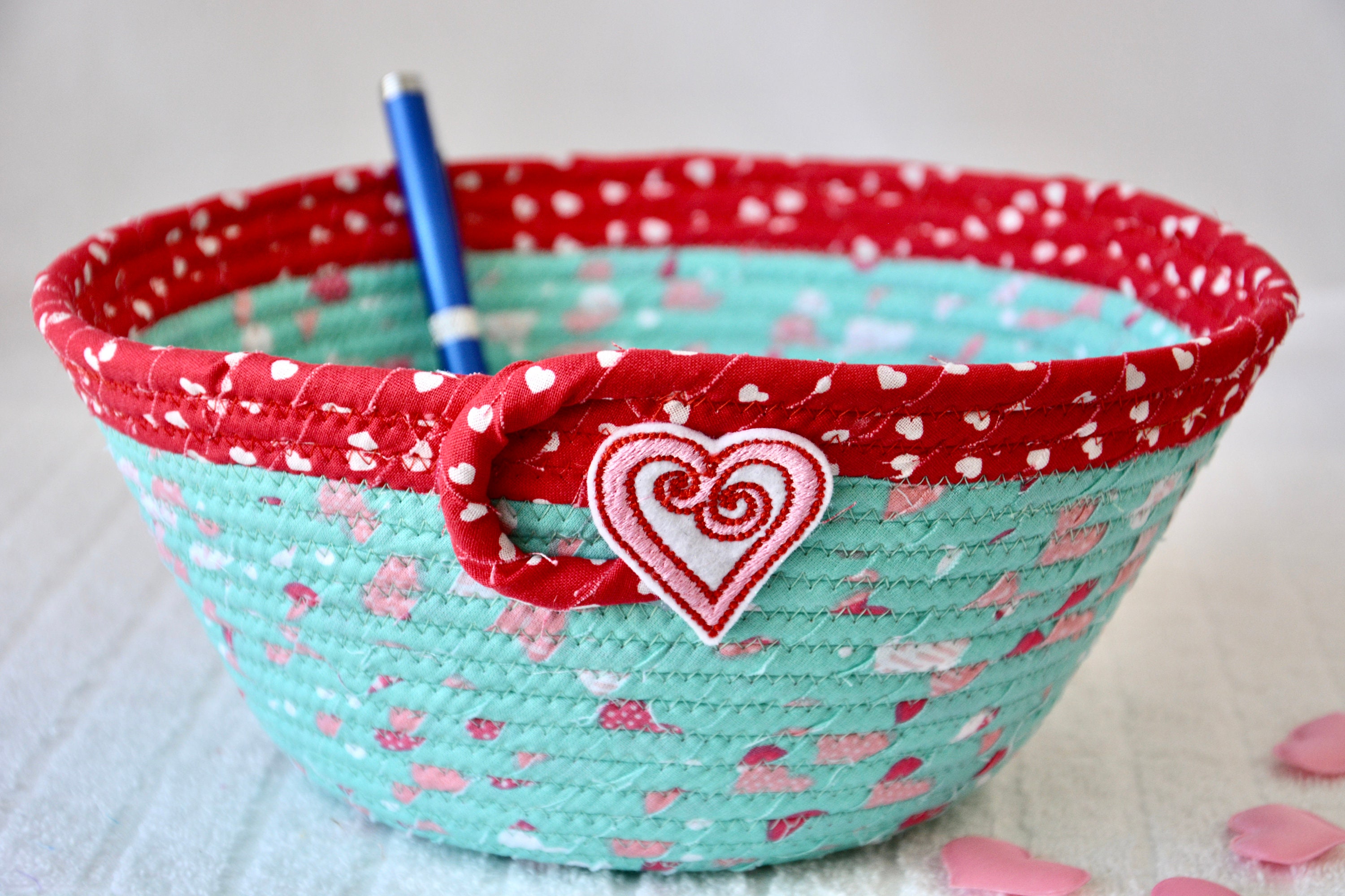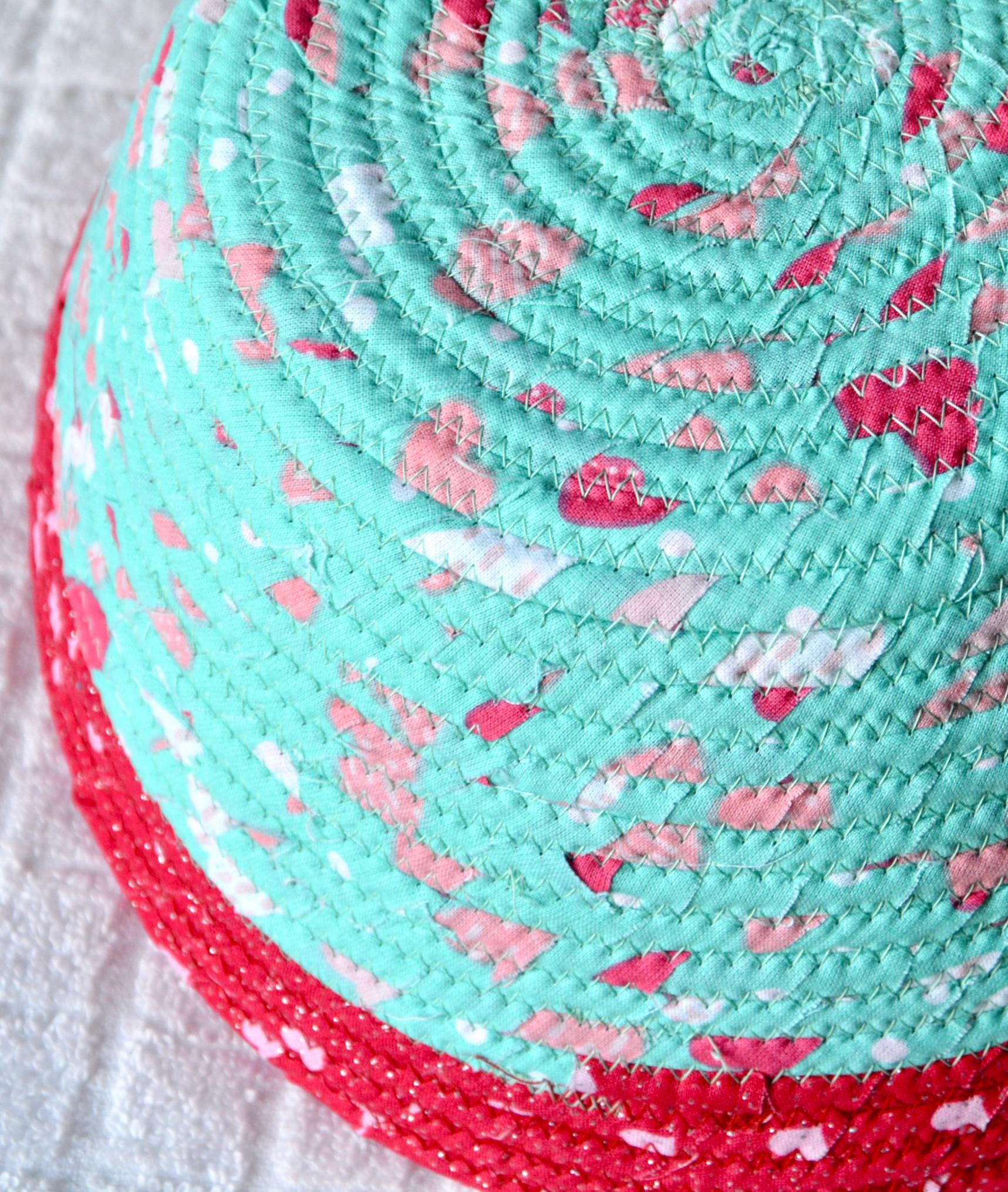 I hand wrapped these wonderful heart fabrics around cotton line, which I then hand coiled and machine quilted to make the basket sturdy. I used the raw edge technique with some fray to give it a lovely shabby chic texture. I just love the top red glitter fabric, it is so cute with the pink hearts. The pretty heart on the basket is included for a nice accent. Color placement will vary.