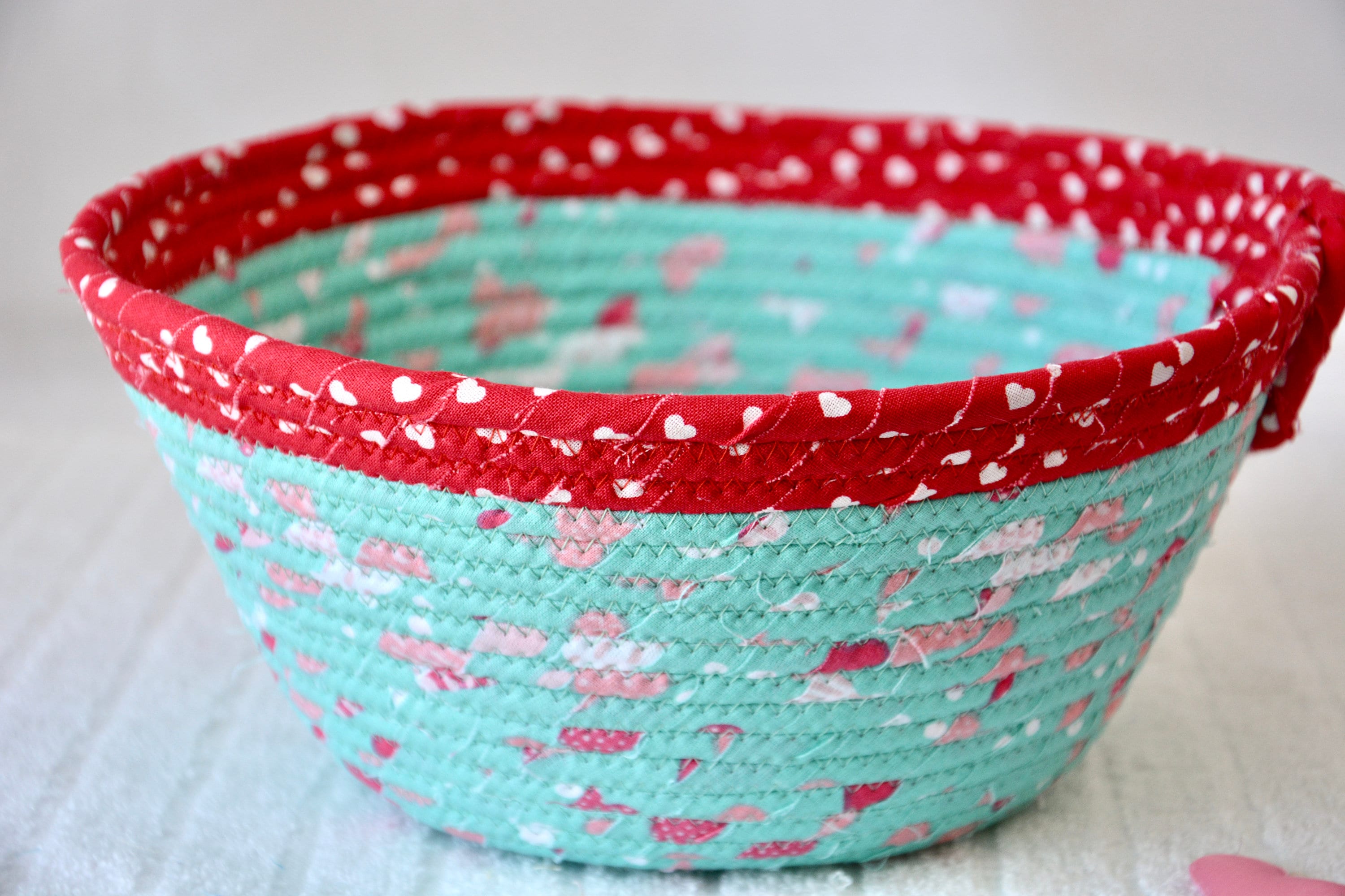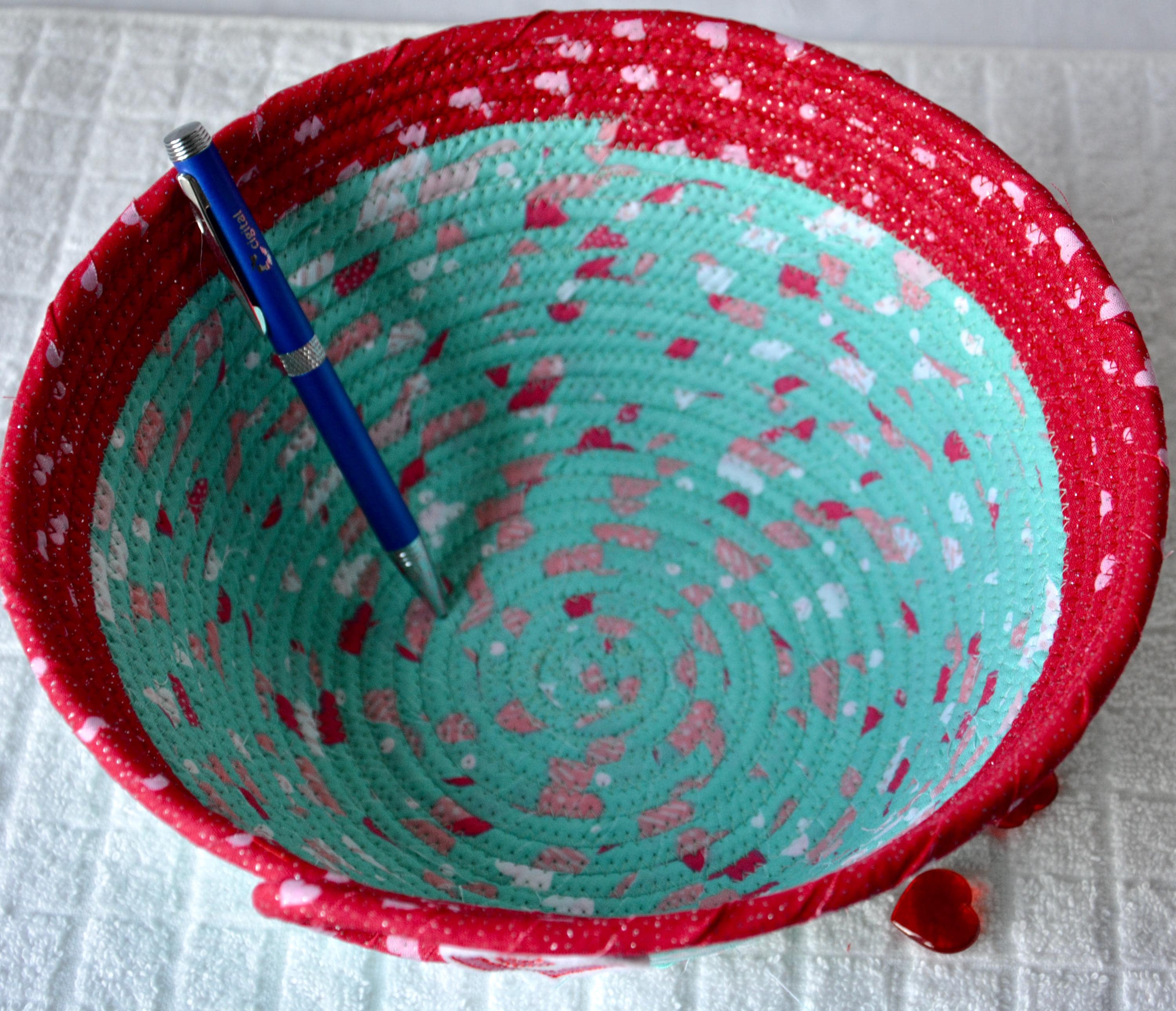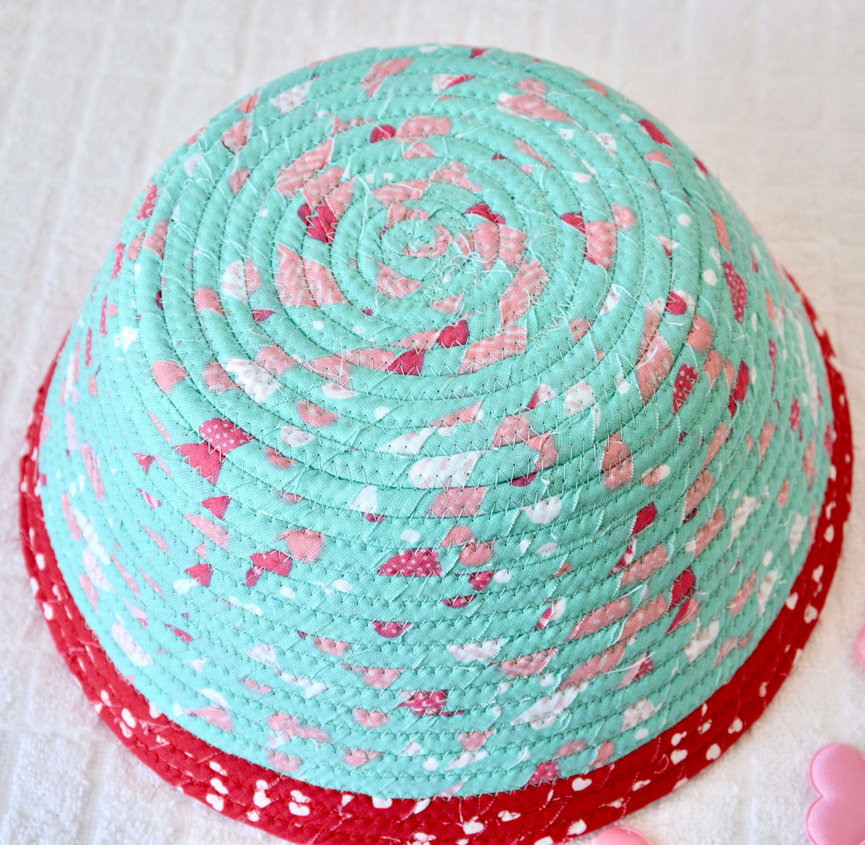 I hand wrapped these wonderful heart fabrics around cotton line, which I then hand coiled and machine quilted to make the basket sturdy. I used the raw edge technique with some fray to give it a lovely shabby chic texture. I just love the top red glitter fabric, it is so cute with the pink hearts. The pretty heart on the basket is included for a nice accent. Color placement will vary.
