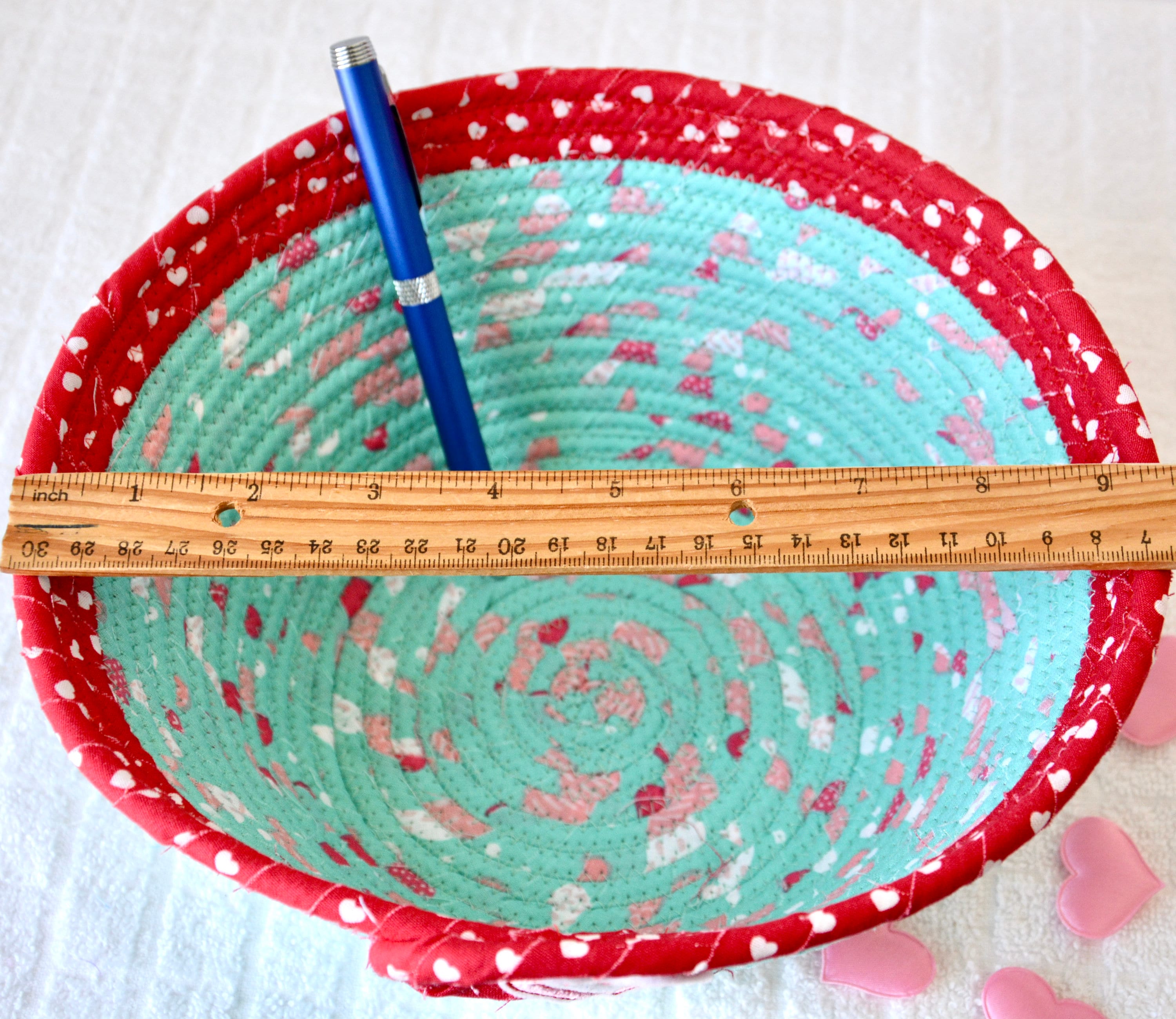 All of these cute fabrics are 100% cotton and show on the inside of the basket too! Please see the picture with the ruler to help gauge the size of this lovely basket. Candy, heart, petal, pen, ruler, bead props not included.