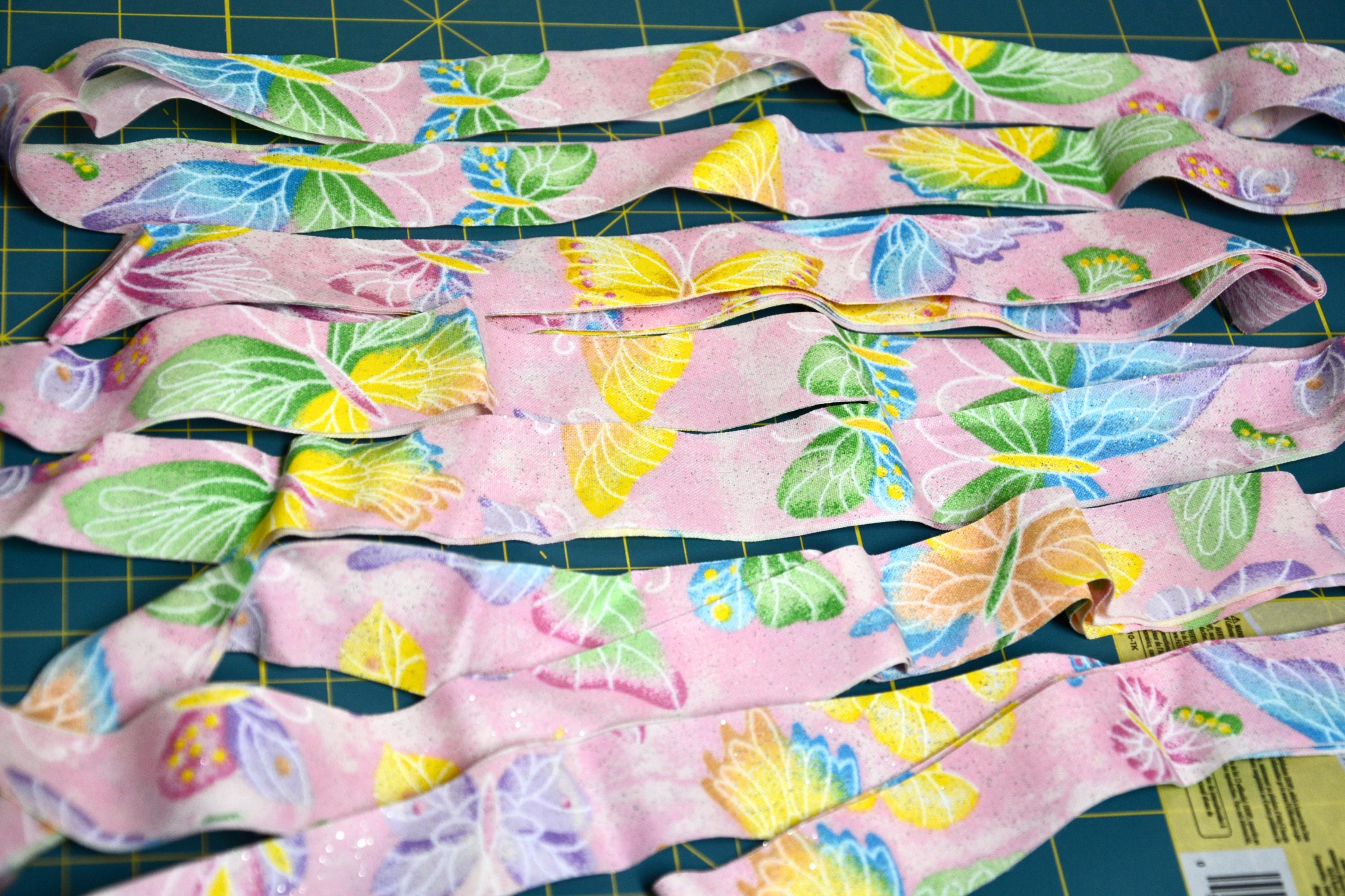 I hand wrapped these lovely pink and lavender glitter fabrics around cotton line, which I then hand coiled and machine quilted to make it sturdy. I used the raw edge technique with a little fray, adding a nice shabby chic texture. The cute felted bunny on the basket is included for a nice accent. All of these pretty fabrics are 100% cotton and all show on the inside of the basket too! Jelly beans, ruler, pen, candy props not included. The last picture is this pretty pink fabric on my cutting table.
