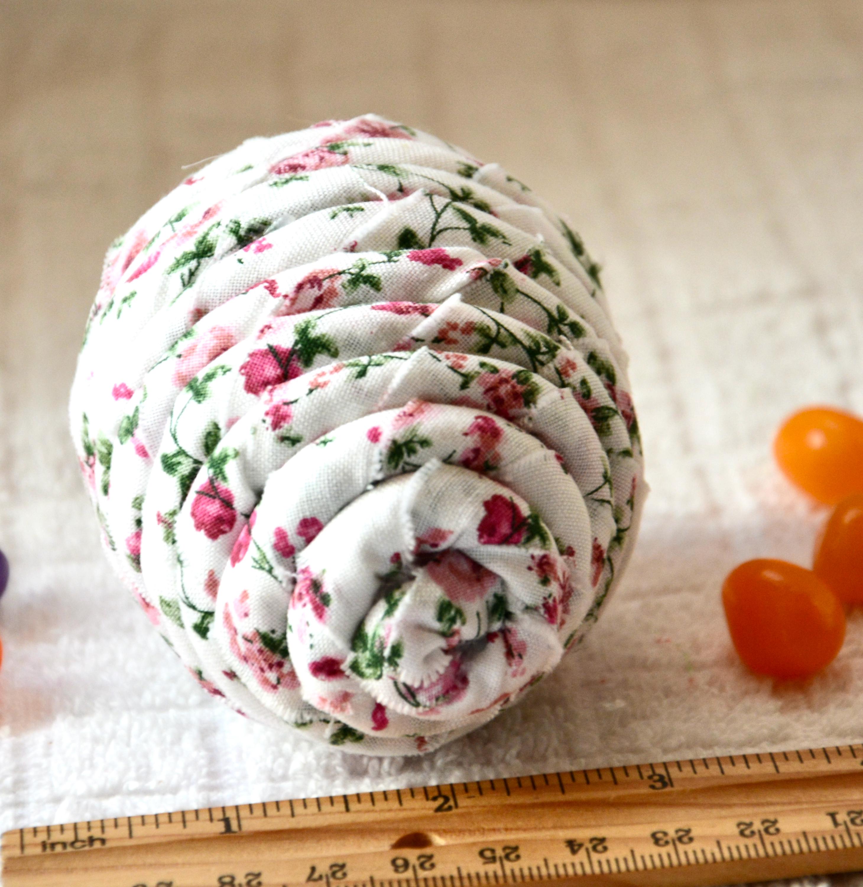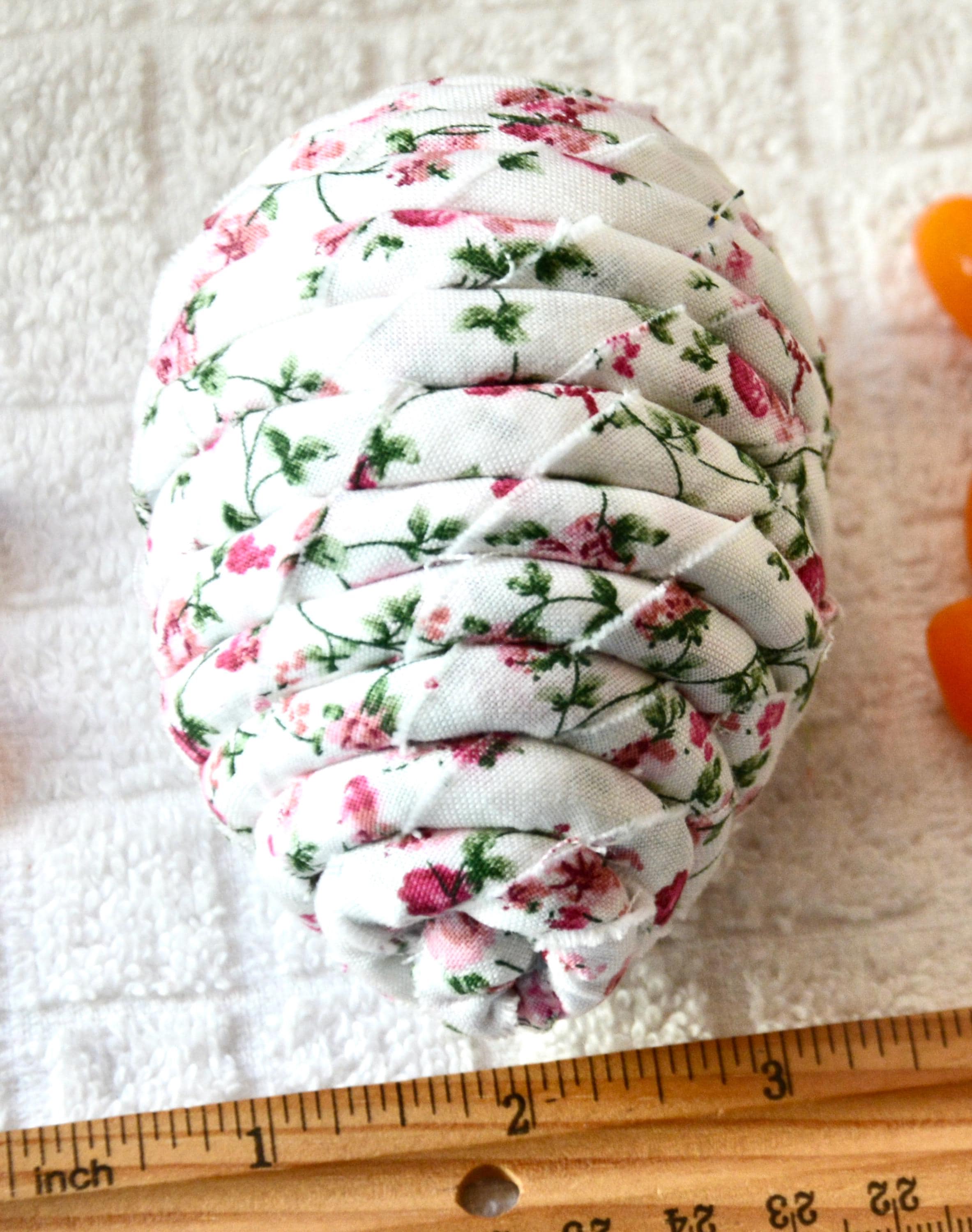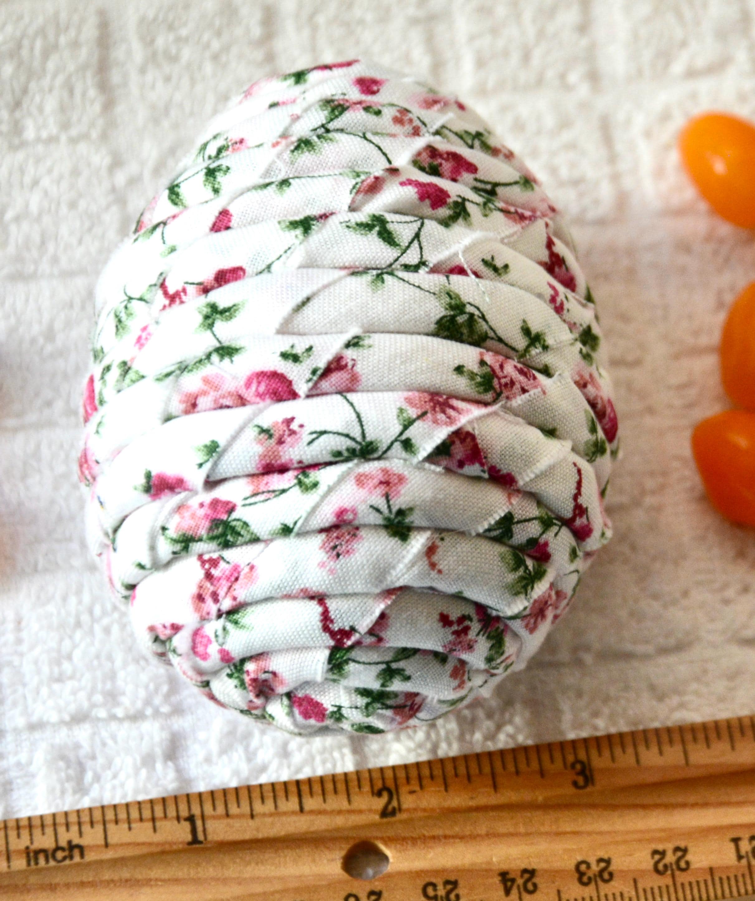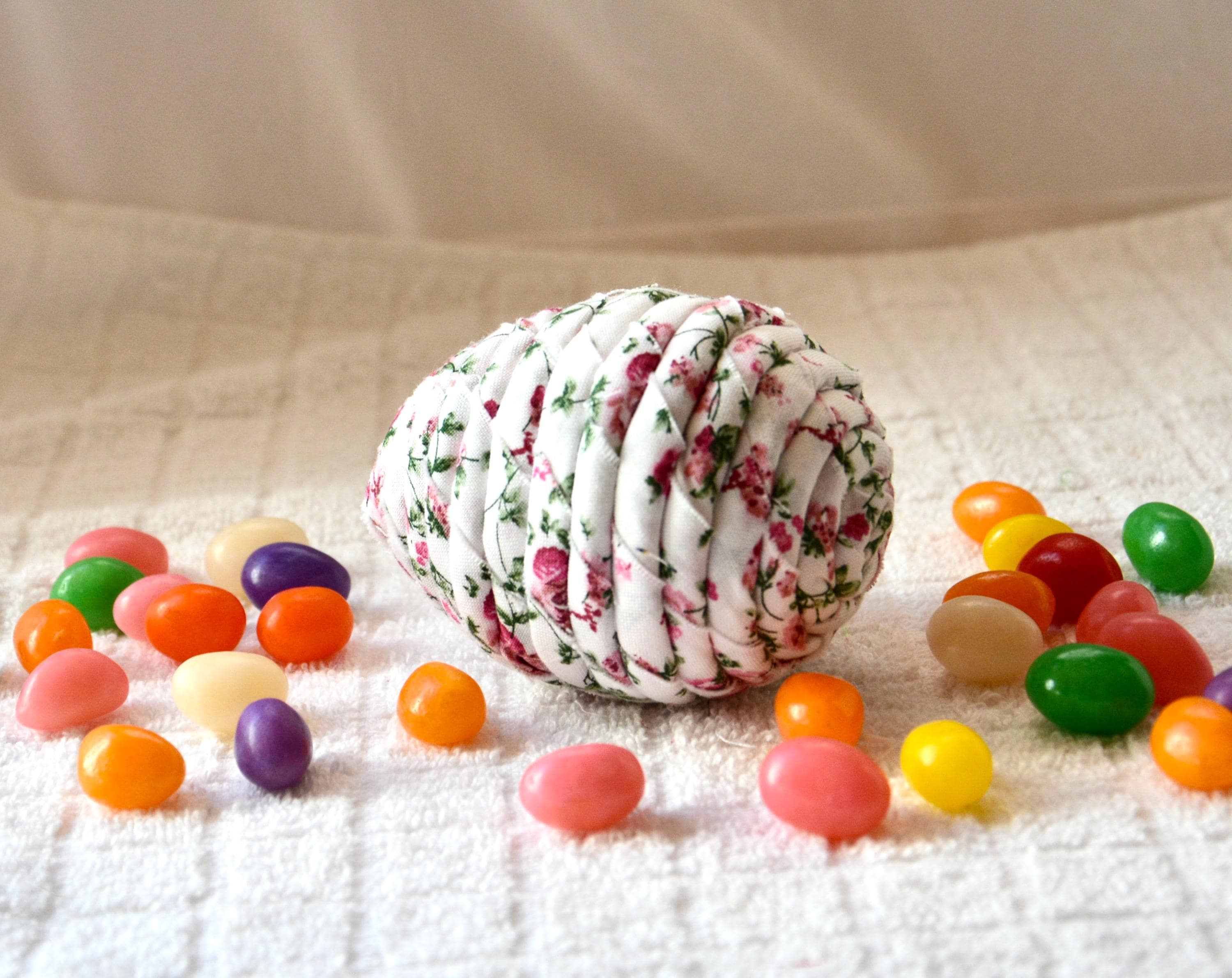 I hand wrapped this lovely pink floral fabric around cotton line which I than hand coiled into an Easter Egg shape. The fabric edge is unfinished for a lovely shabby chic texture. I just love this pretty pink fabric, it created a unique pattern. I designed and created this lovely Easter egg in my smoke free home studio. Color placement will vary. Bunny, jelly bean, ruler props not included. Egg does not open. Spot clean.