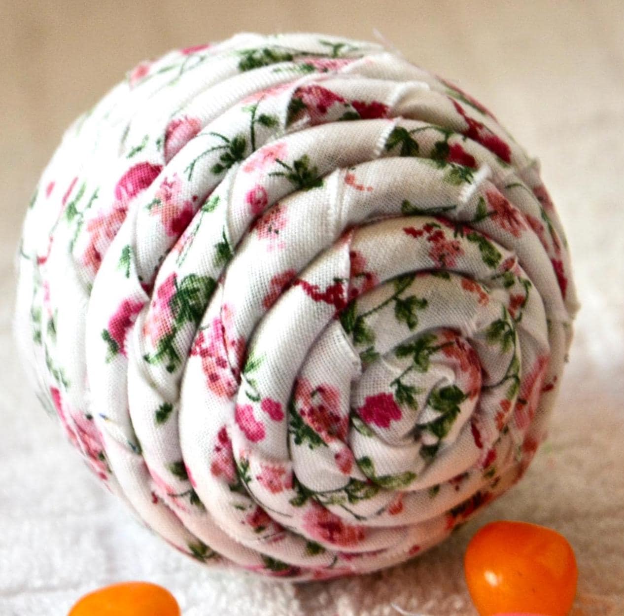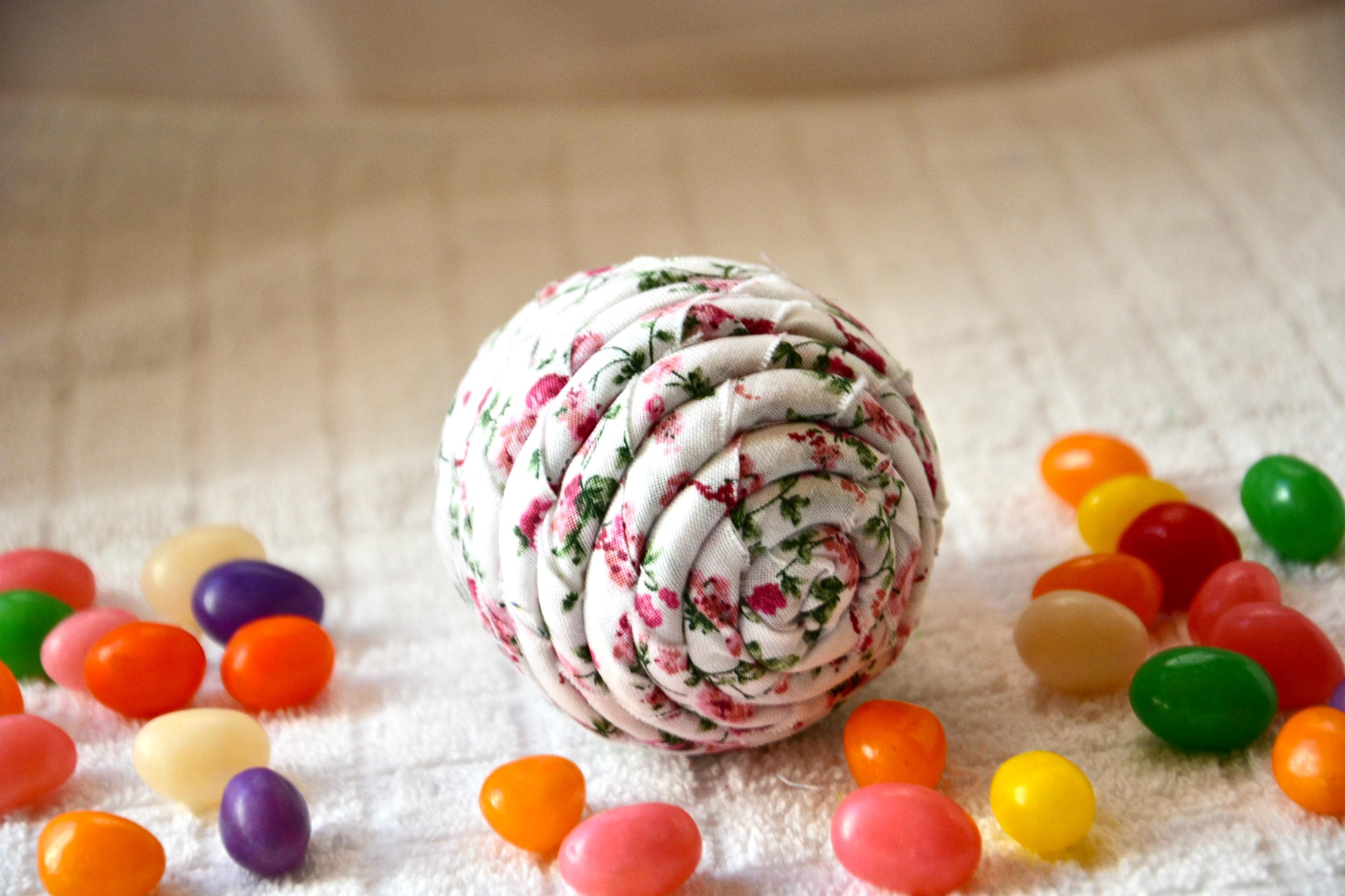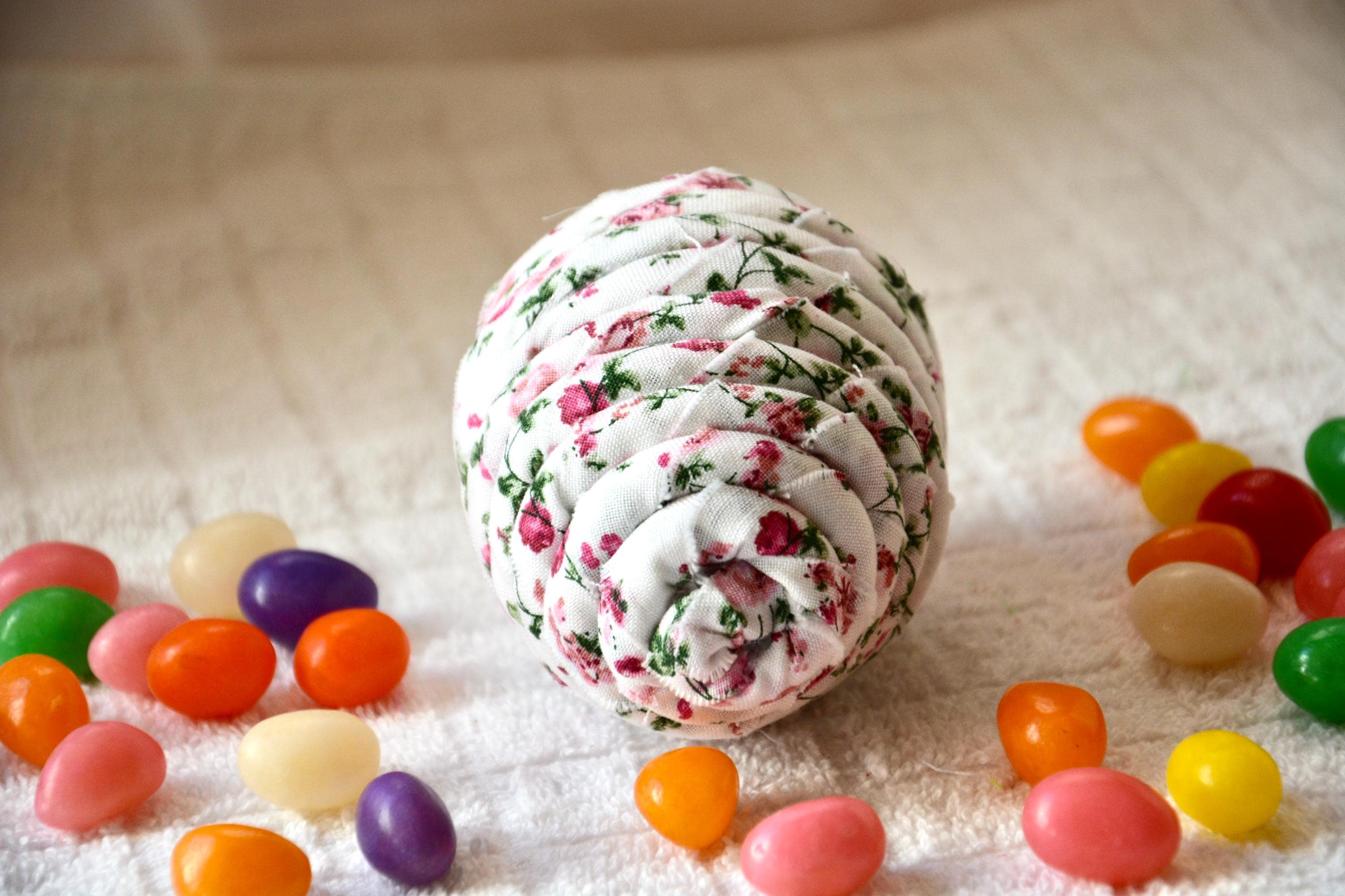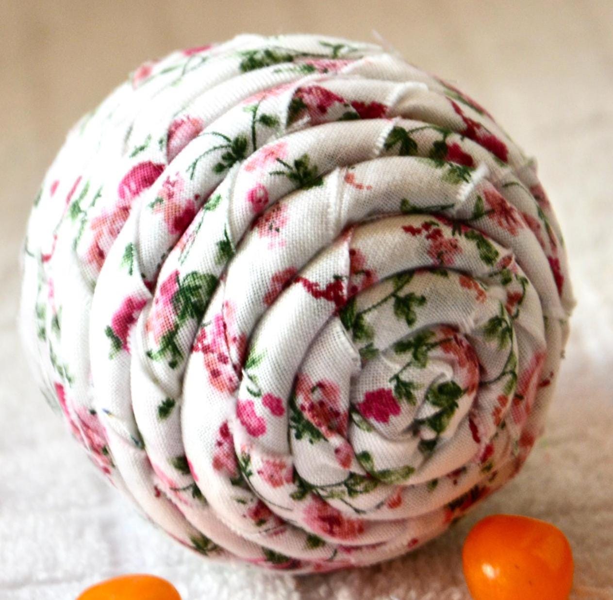 I hand wrapped this lovely pink floral fabric around cotton line which I than hand coiled into an Easter Egg shape. The fabric edge is unfinished for a lovely shabby chic texture. I just love this pretty pink fabric, it created a unique pattern. I designed and created this lovely Easter egg in my smoke free home studio. Color placement will vary. Bunny, jelly bean, ruler props not included. Egg does not open. Spot clean.