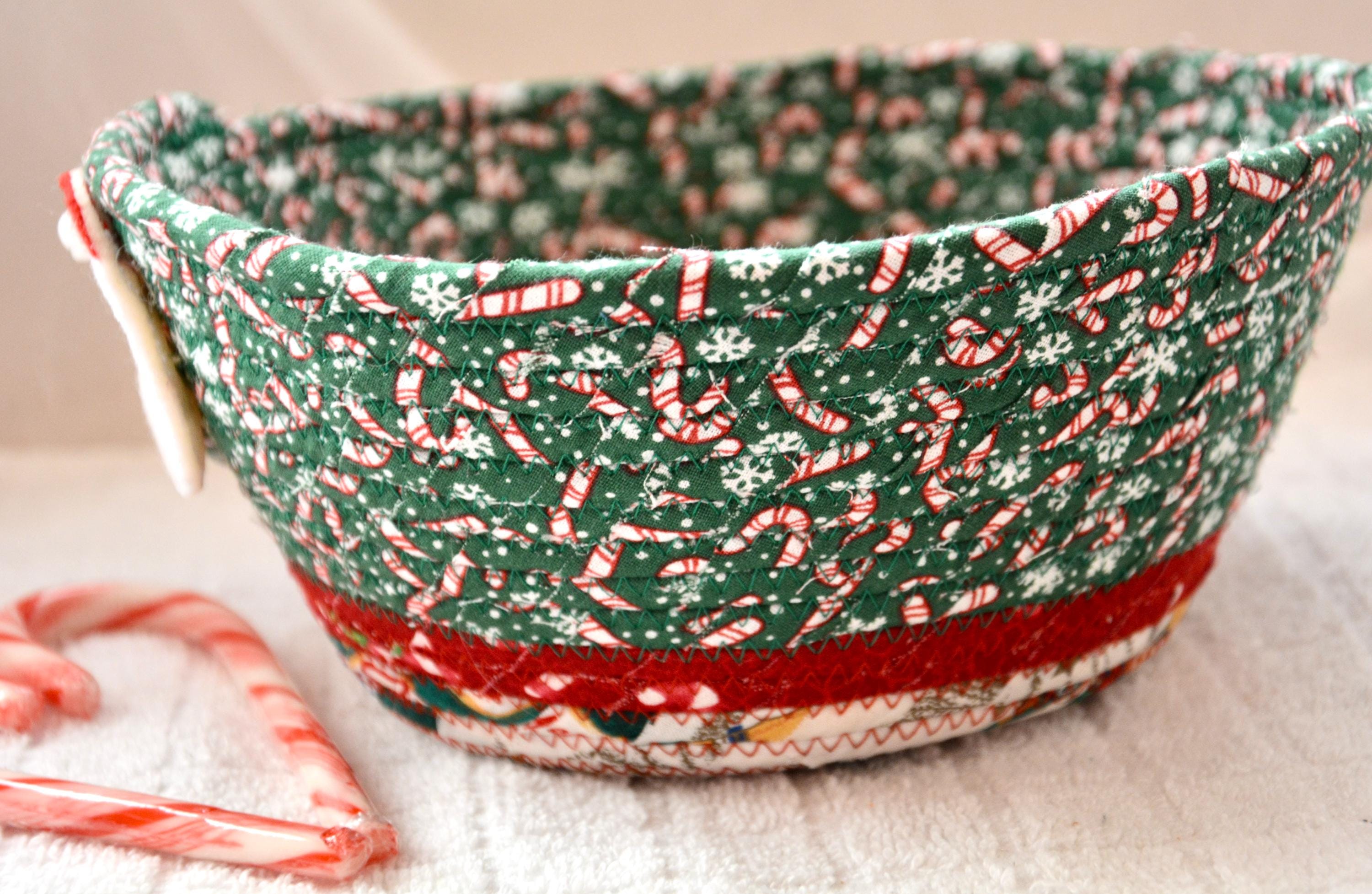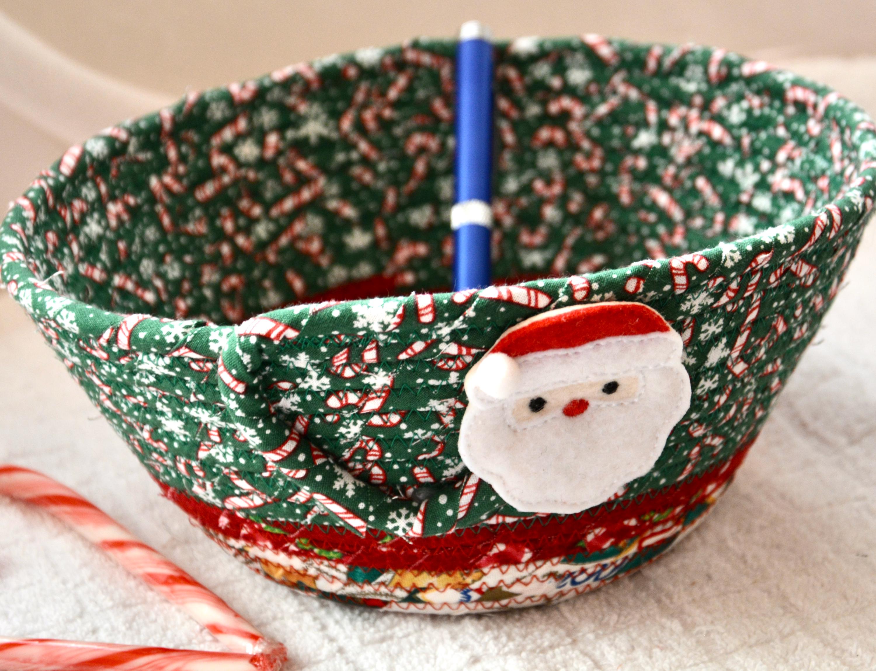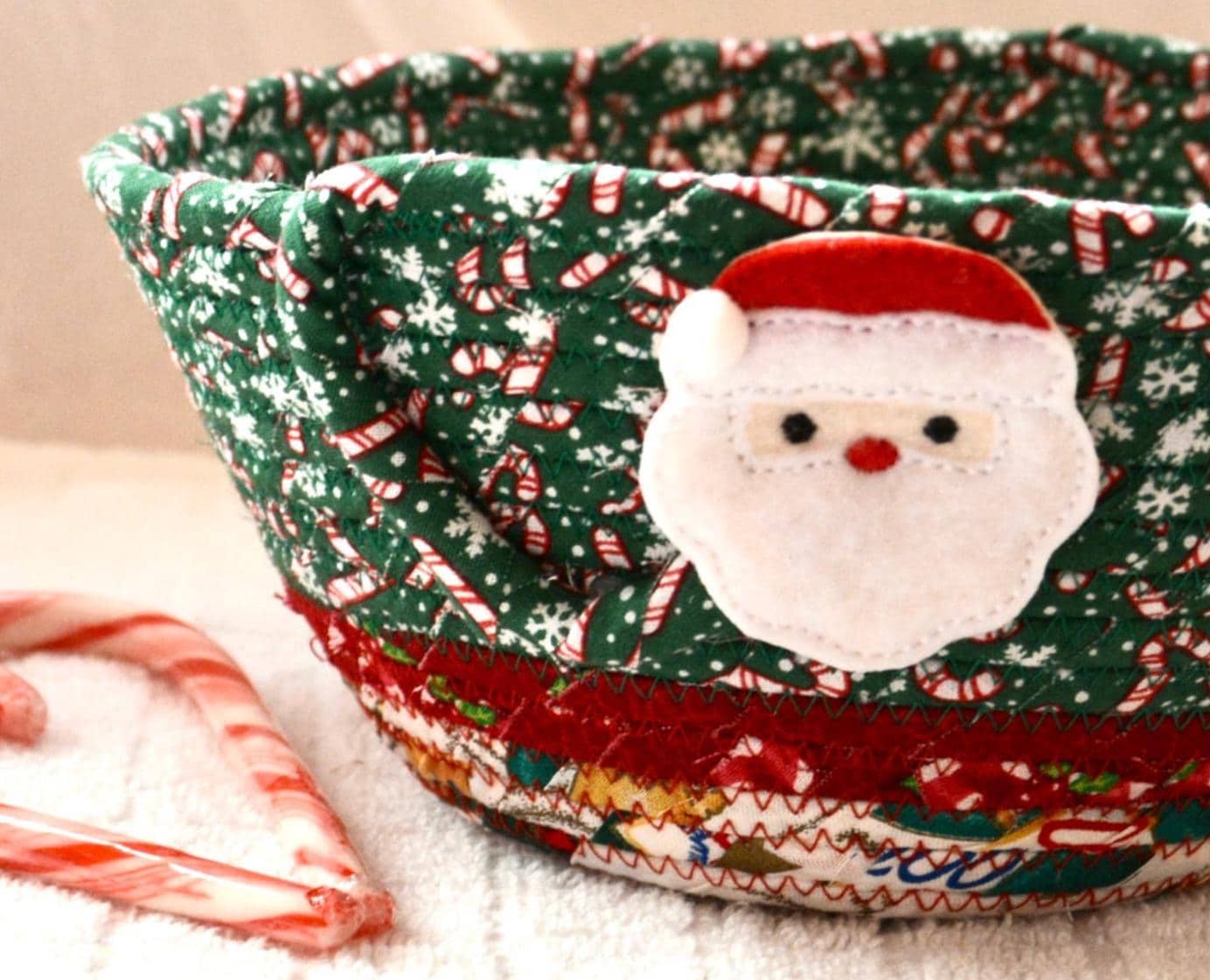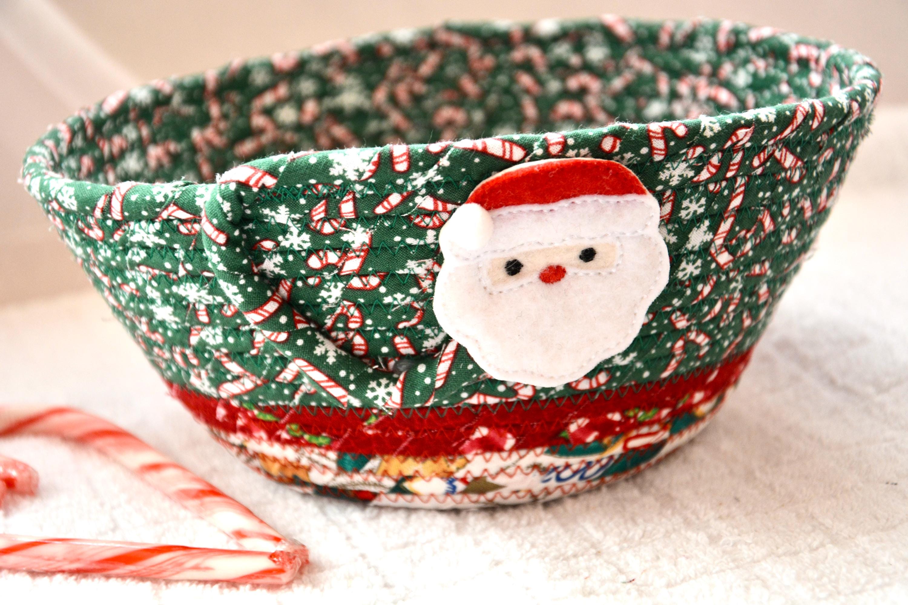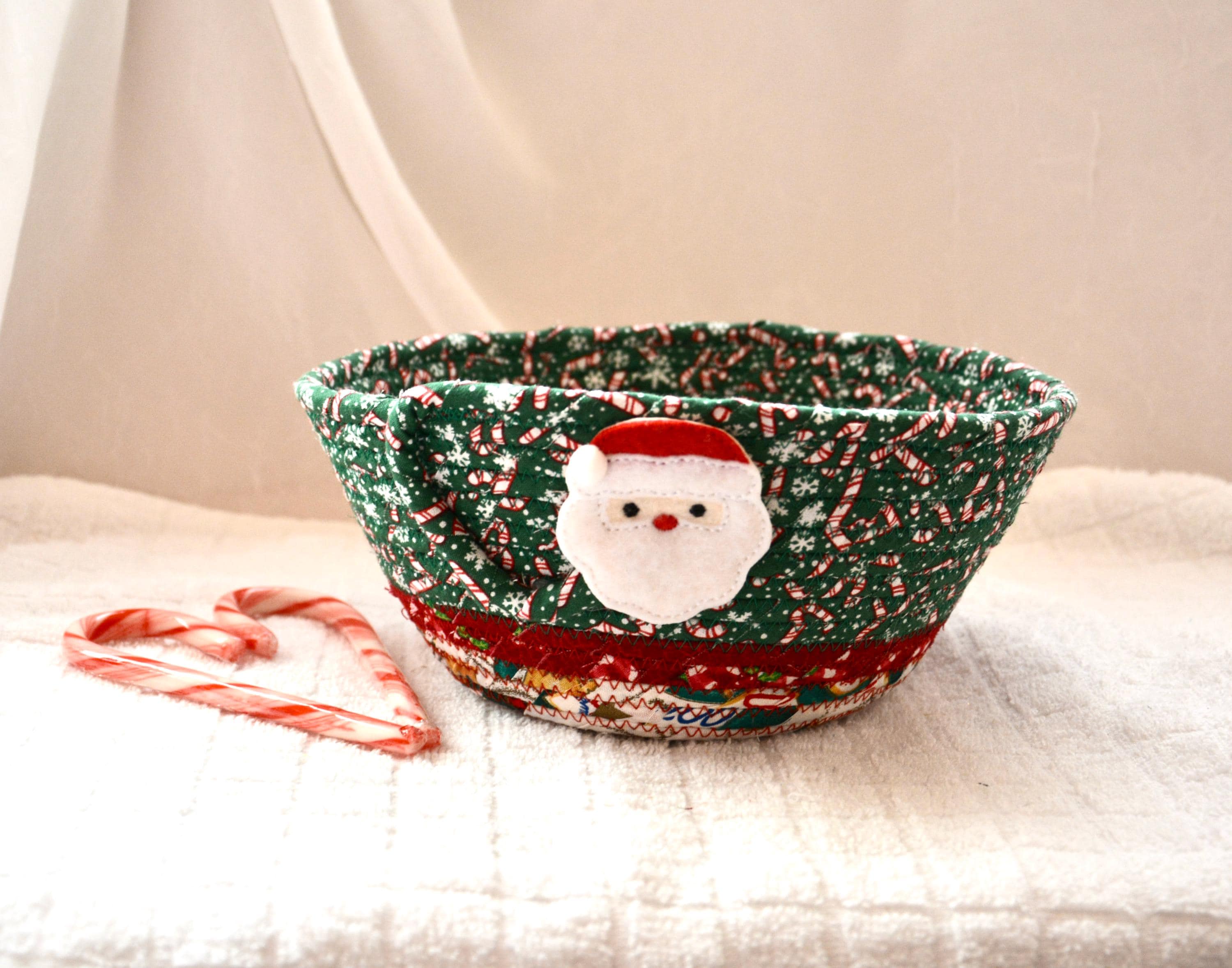 I hand wrapped this high quality Christmas fabric around cotton line, which I then hand coiled and machine quilted to make it sturdy. I used the raw edge technique with a little fray to add a wonderful shabby chic texture. I just love this cute Santa, so cheery! The fun Santa feltie on the basket is included for a nice accent.