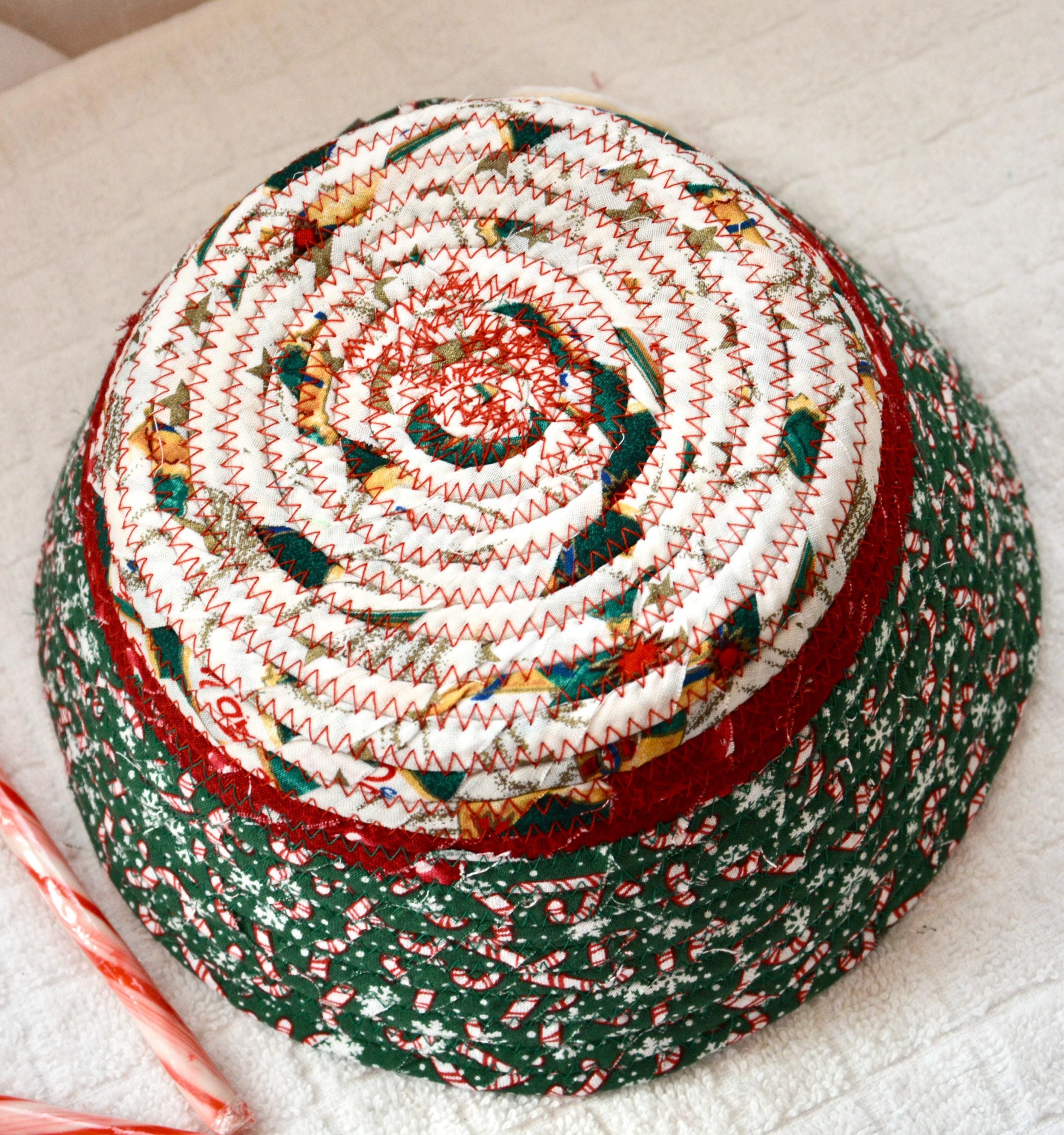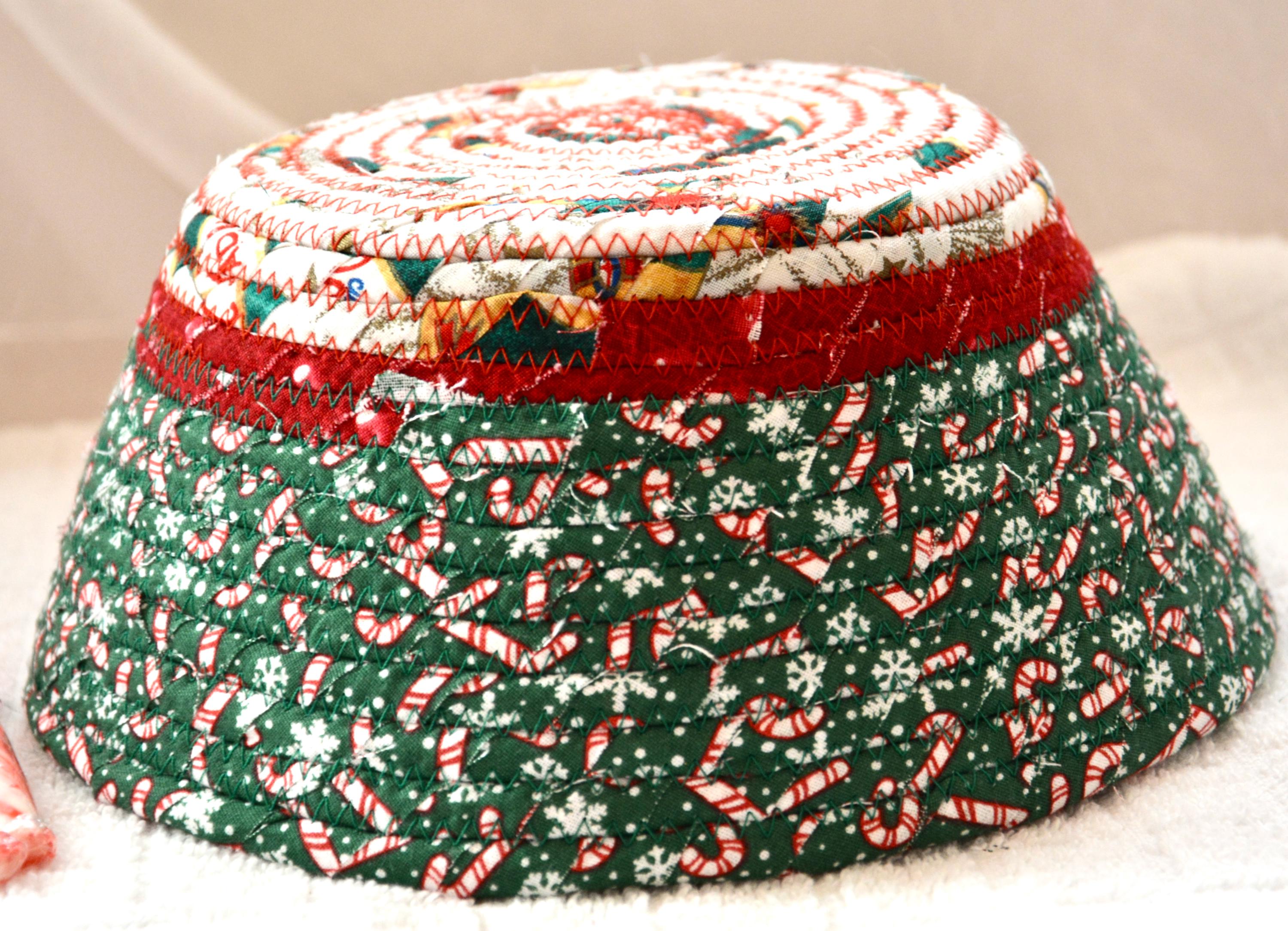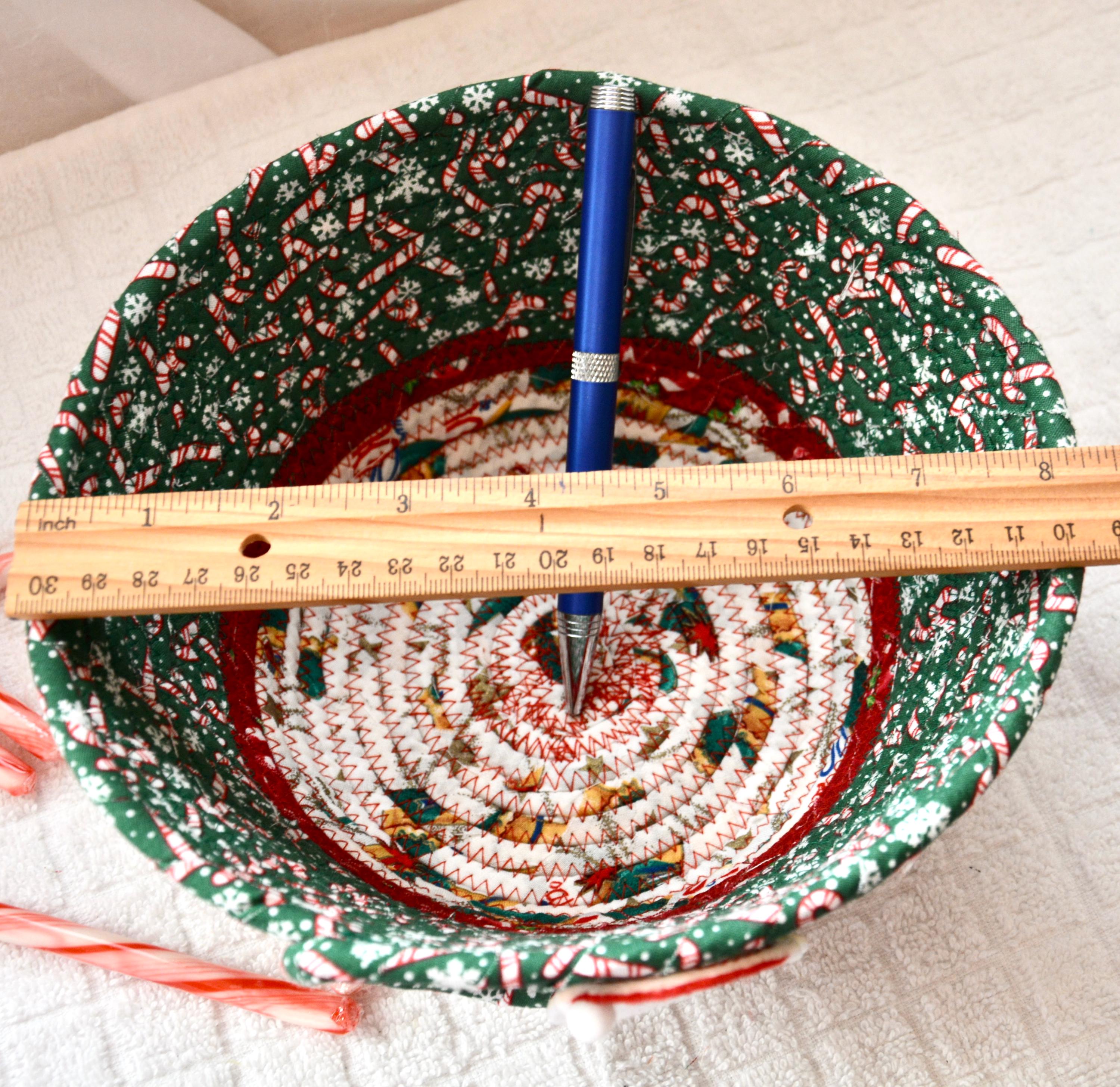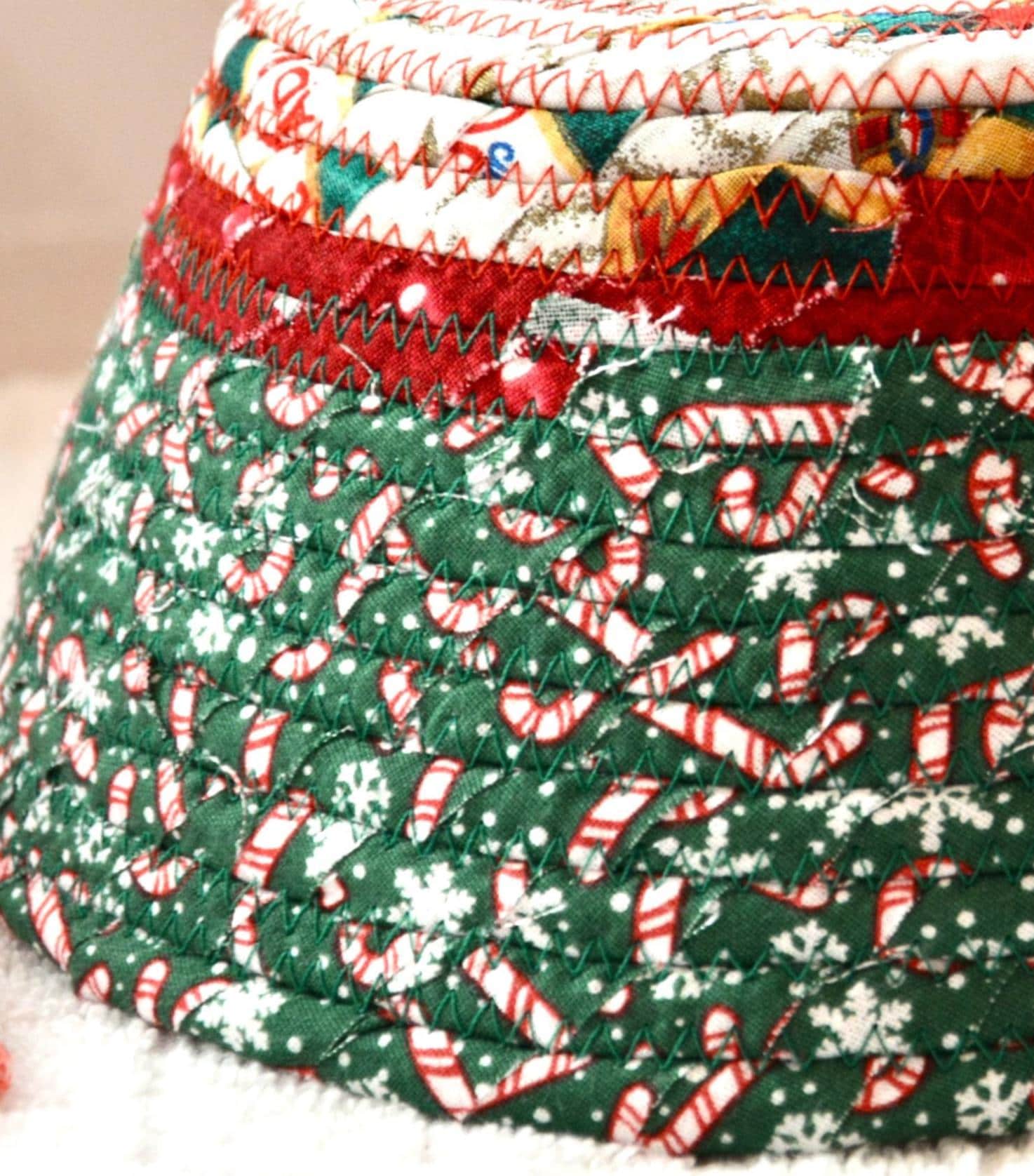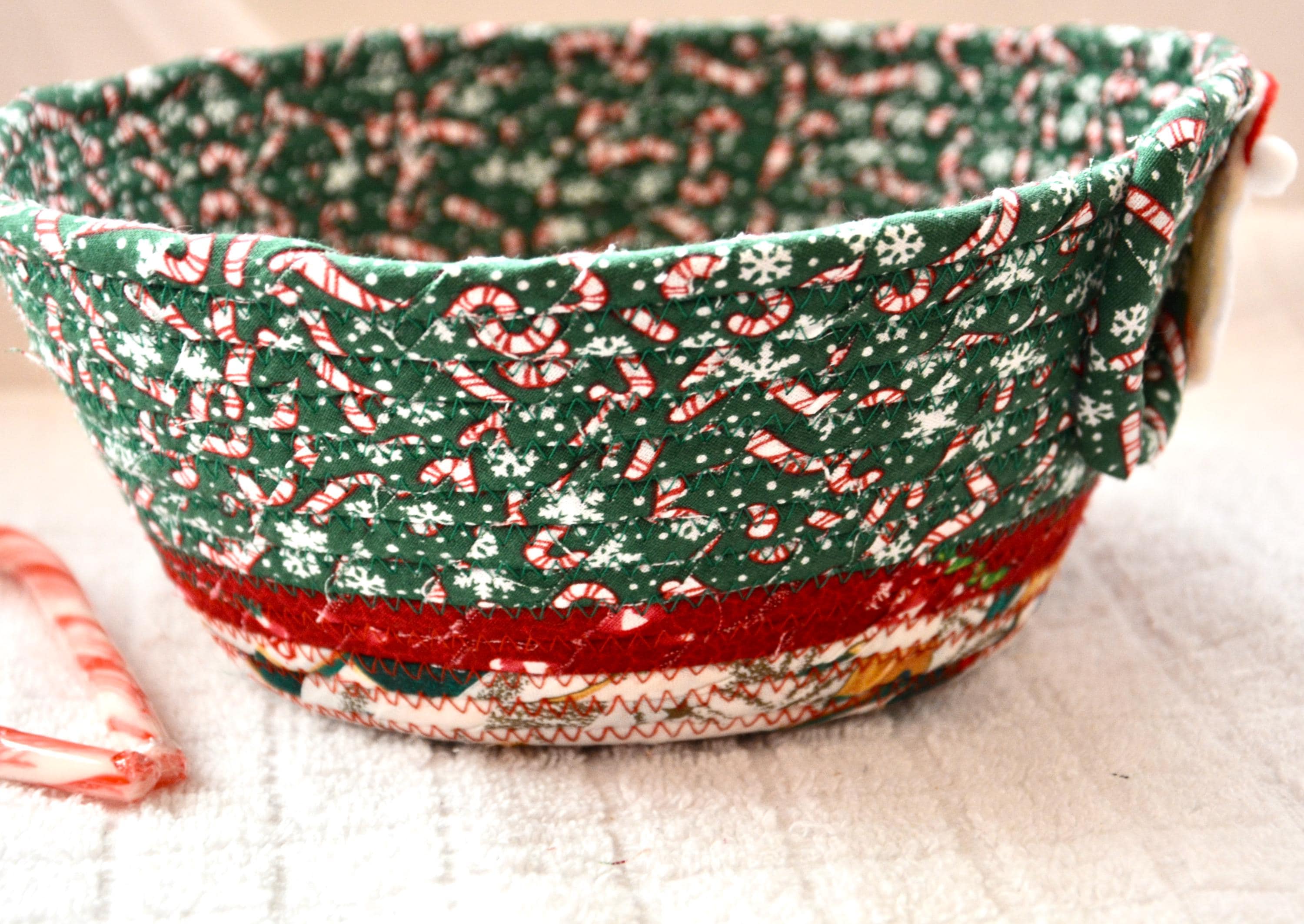 I hand wrapped this high quality Christmas fabric around cotton line, which I then hand coiled and machine quilted to make it sturdy. I used the raw edge technique with a little fray to add a wonderful shabby chic texture. I just love this cute Santa, so cheery! The fun Santa feltie on the basket is included for a nice accent.