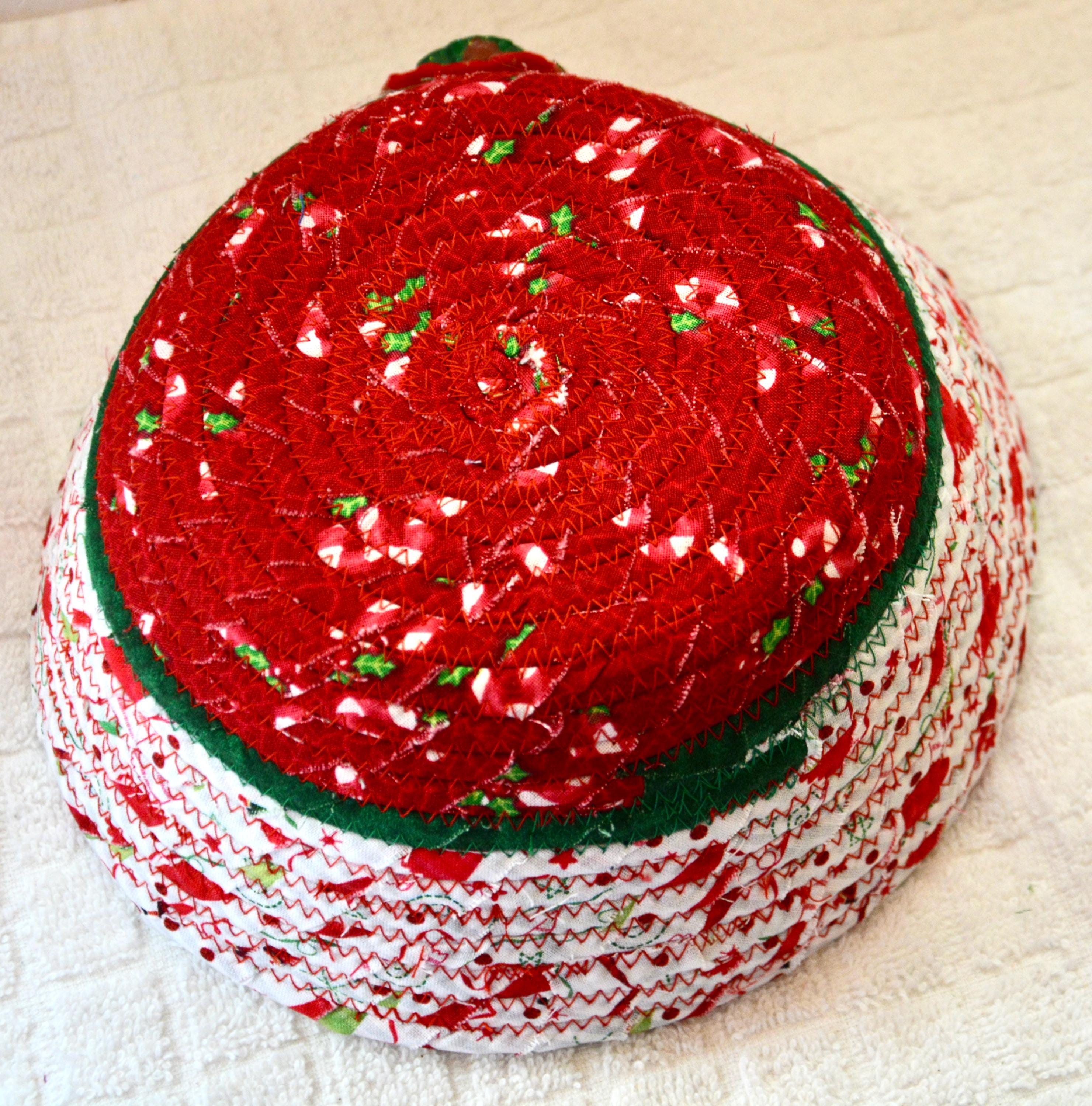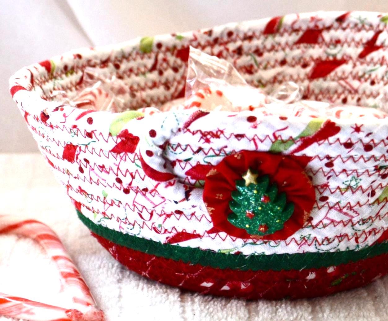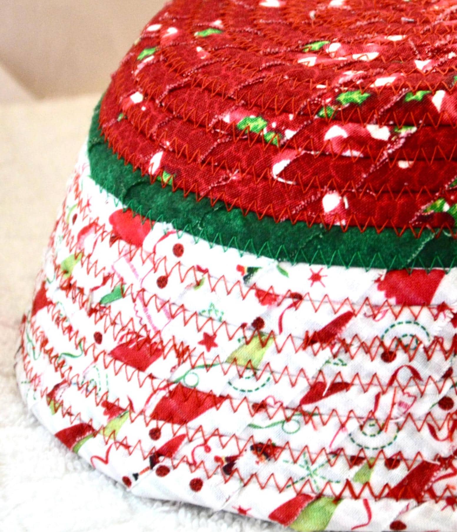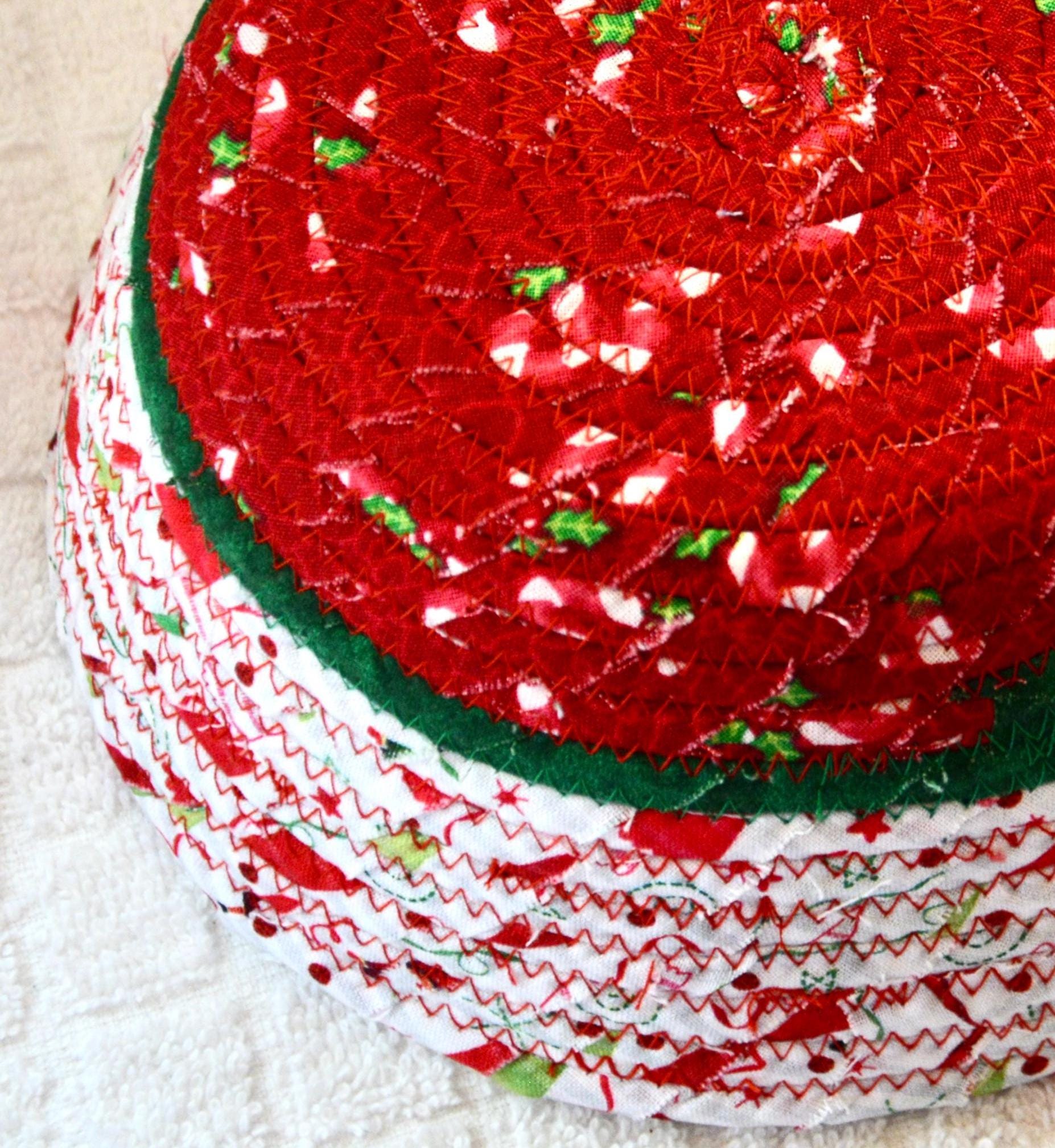 I hand wrapped these high quality Christmas fabrics around cotton line, which I then hand coiled and machine quilted to make it sturdy. I used the raw edge technique with a little fray to add a wonderful shabby chic texture. I just love the pretty red highlights in these beautiful Christmas fabrics! So festive!