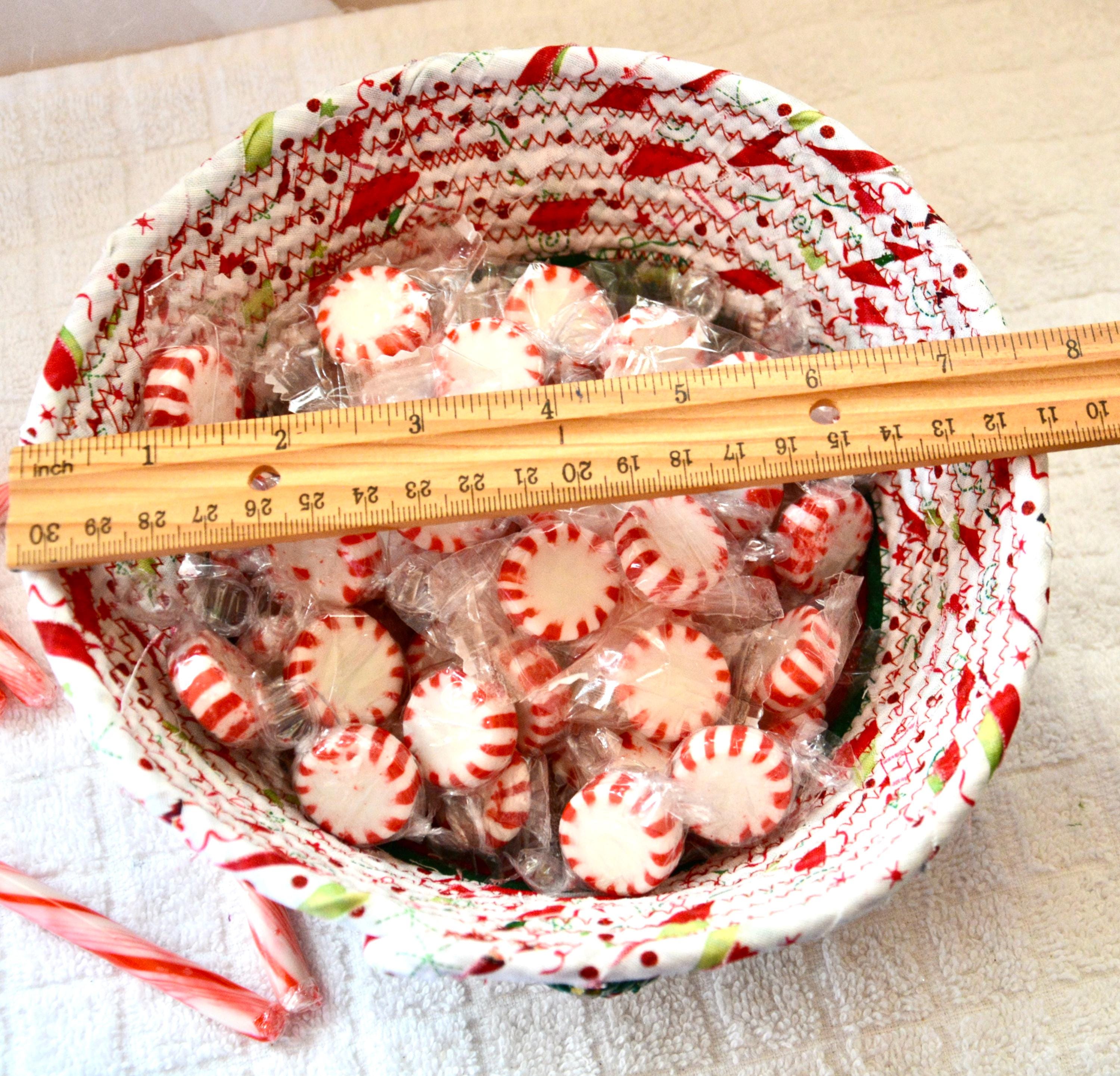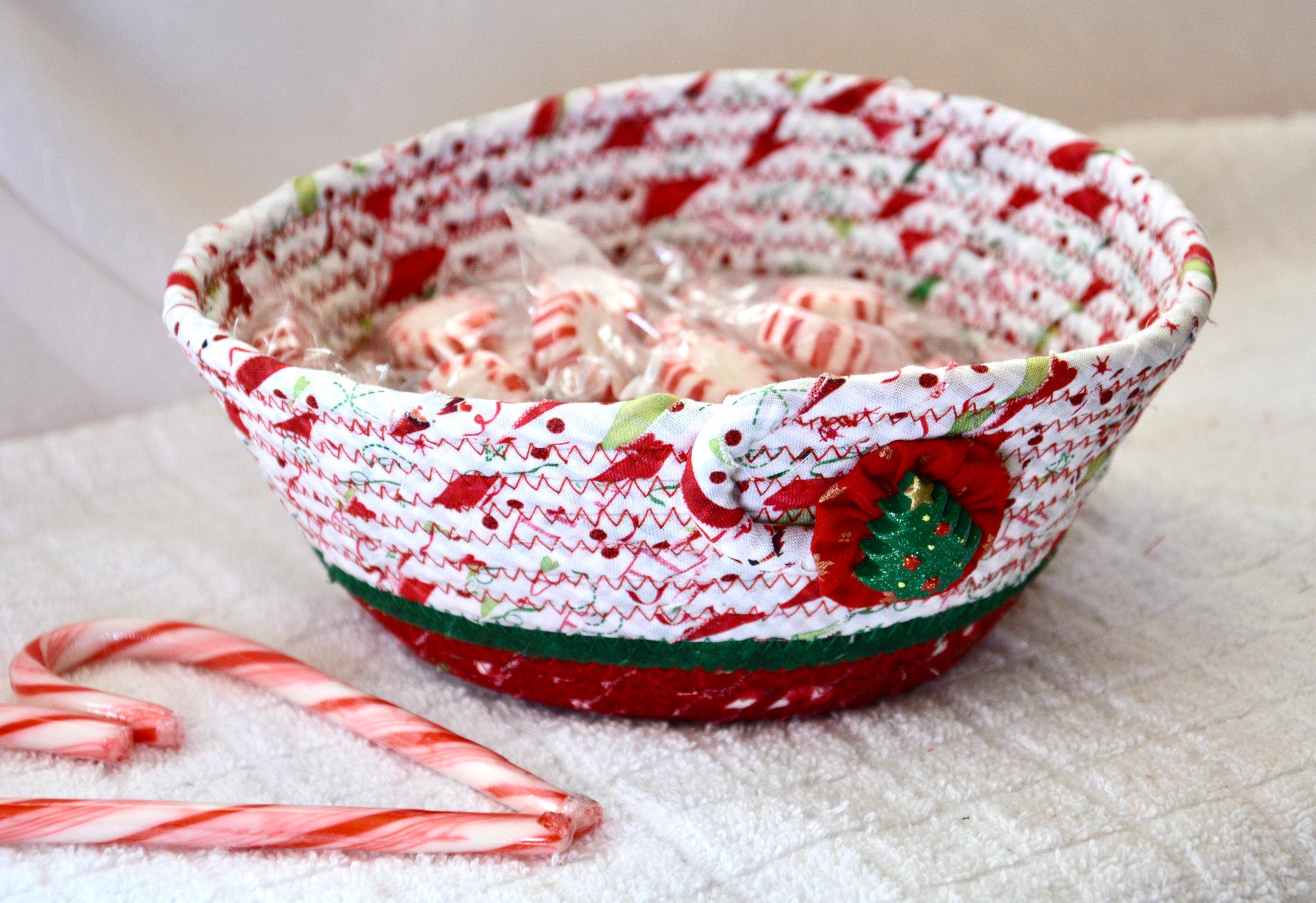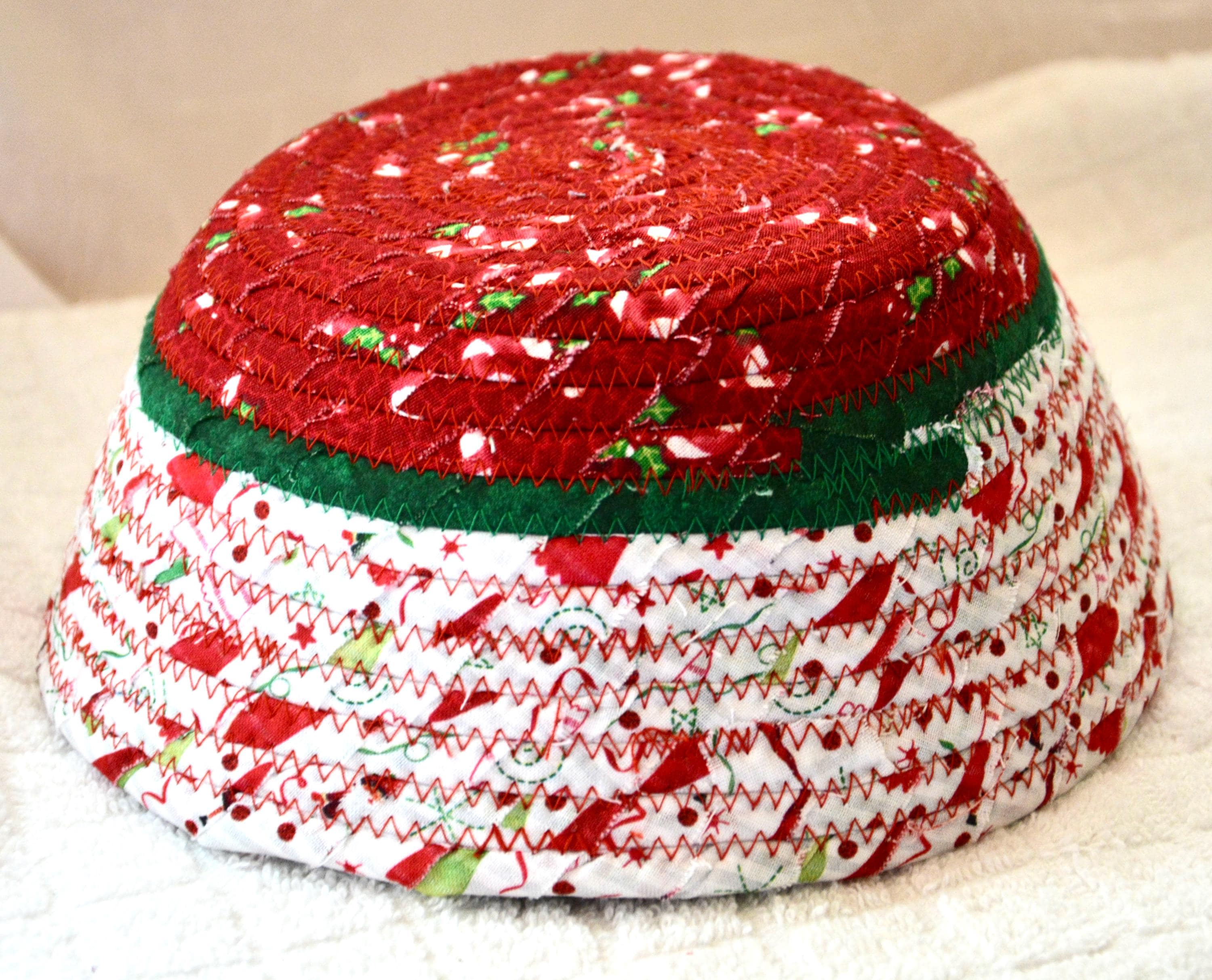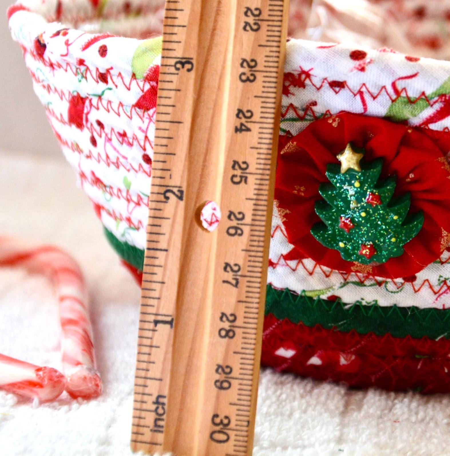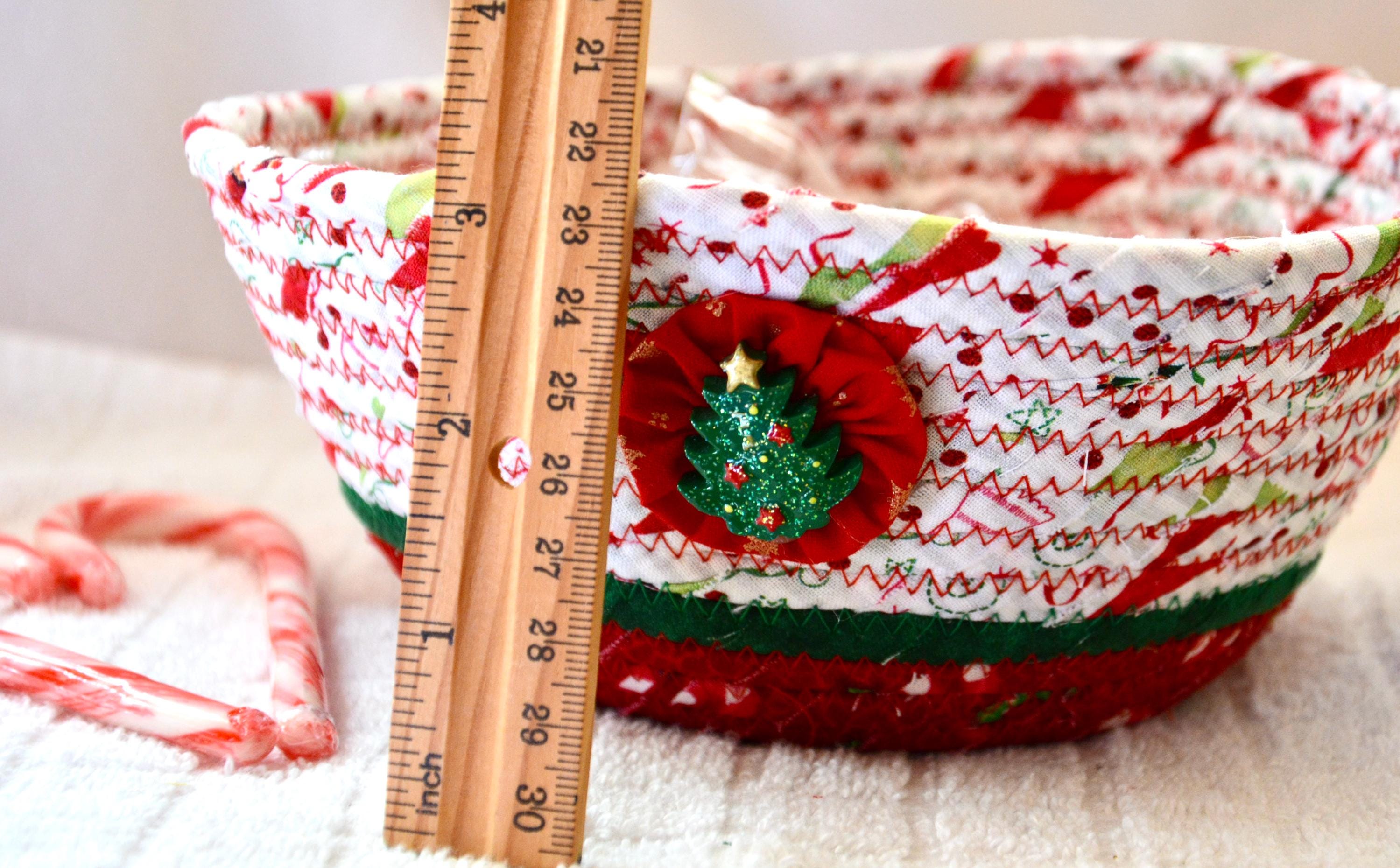 I hand wrapped these high quality Christmas fabrics around cotton line, which I then hand coiled and machine quilted to make it sturdy. I used the raw edge technique with a little fray to add a wonderful shabby chic texture. I just love the pretty red highlights in these beautiful Christmas fabrics! So festive!