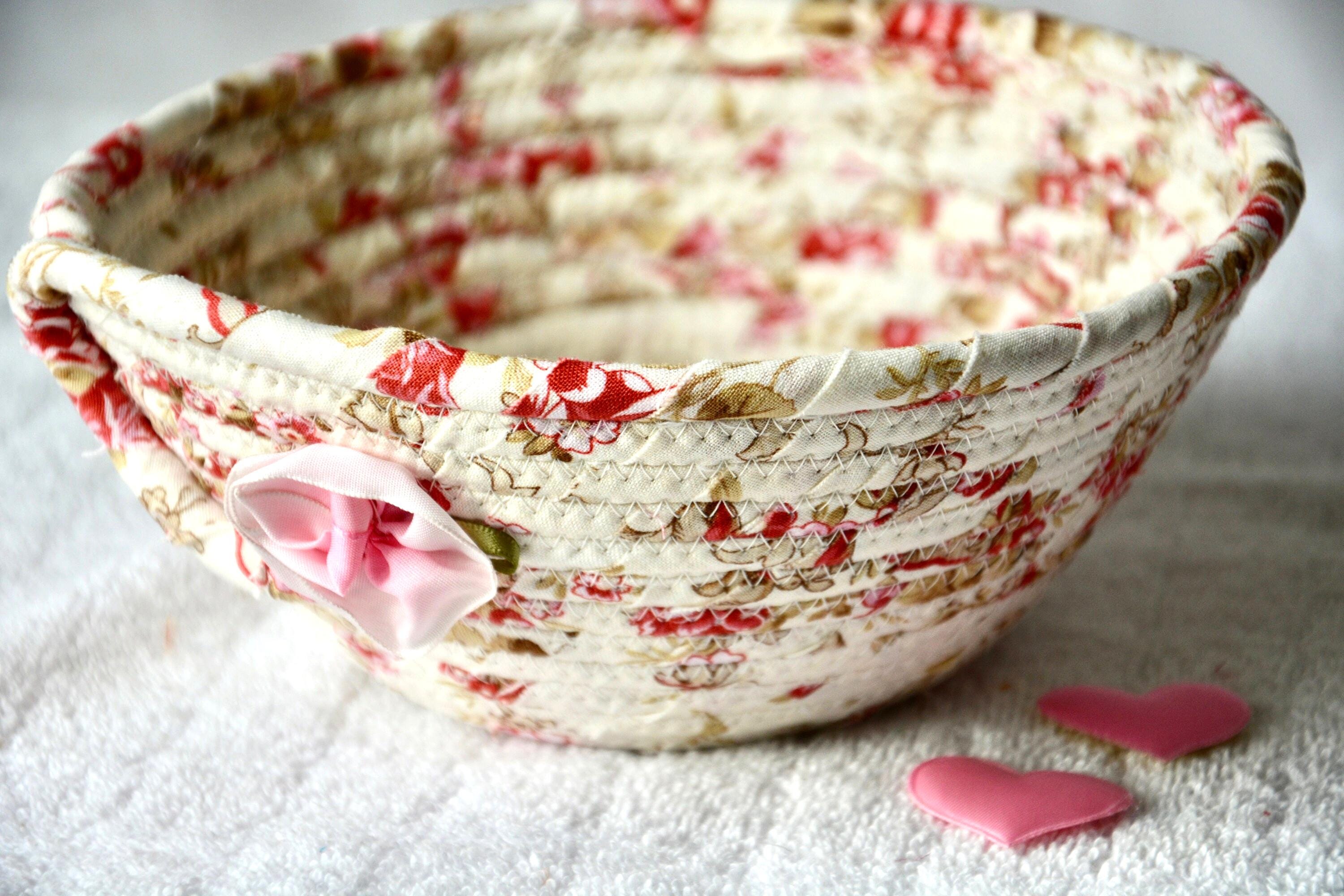 I hand wrapped these lovely beige and pink fabrics around cotton line, which I then hand coiled and machine quilted to make it sturdy. I used the raw edge technique with some fray, adding a nice shabby chic texture. The pretty flower on the basket is included for a nice accent.