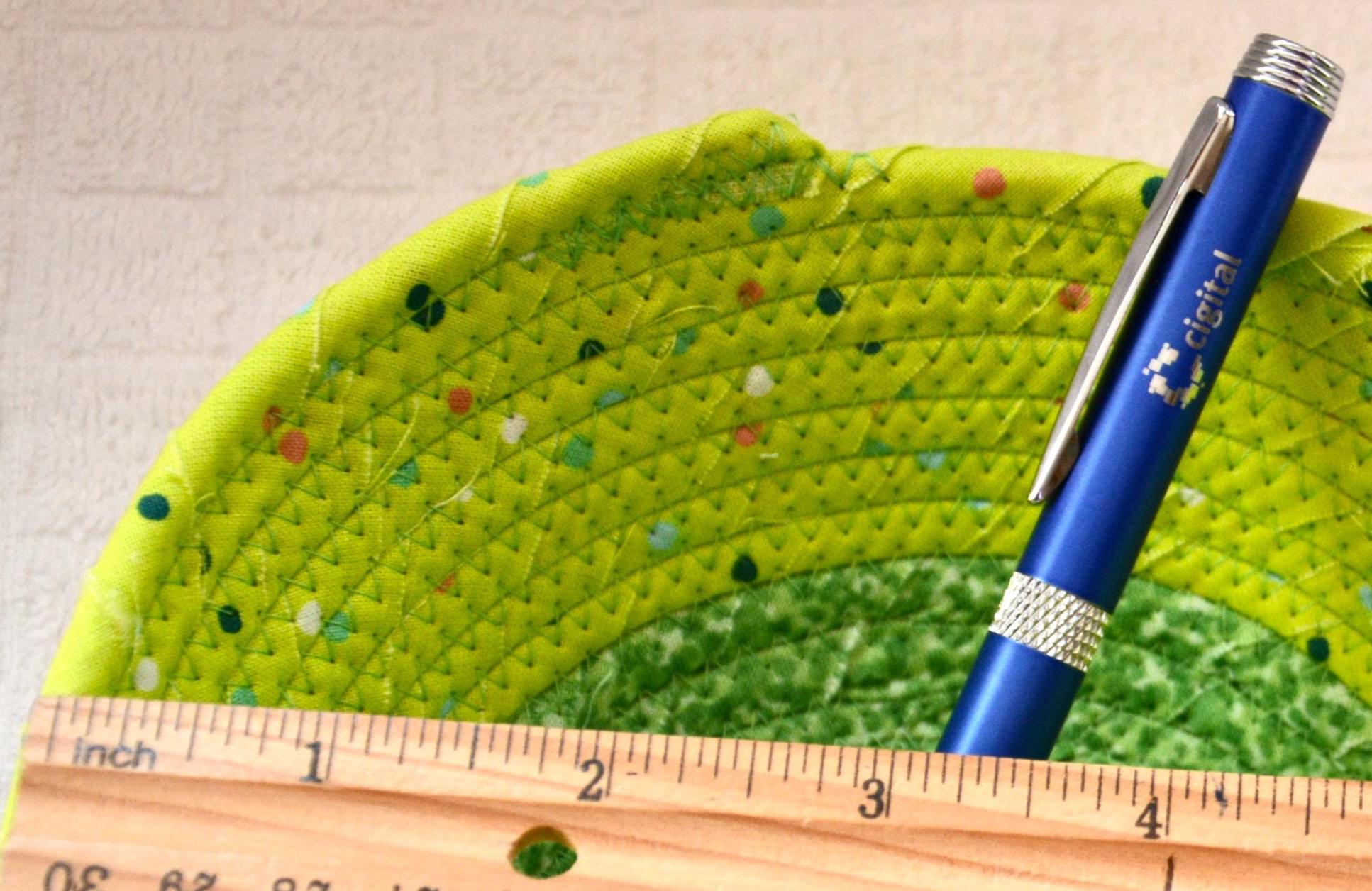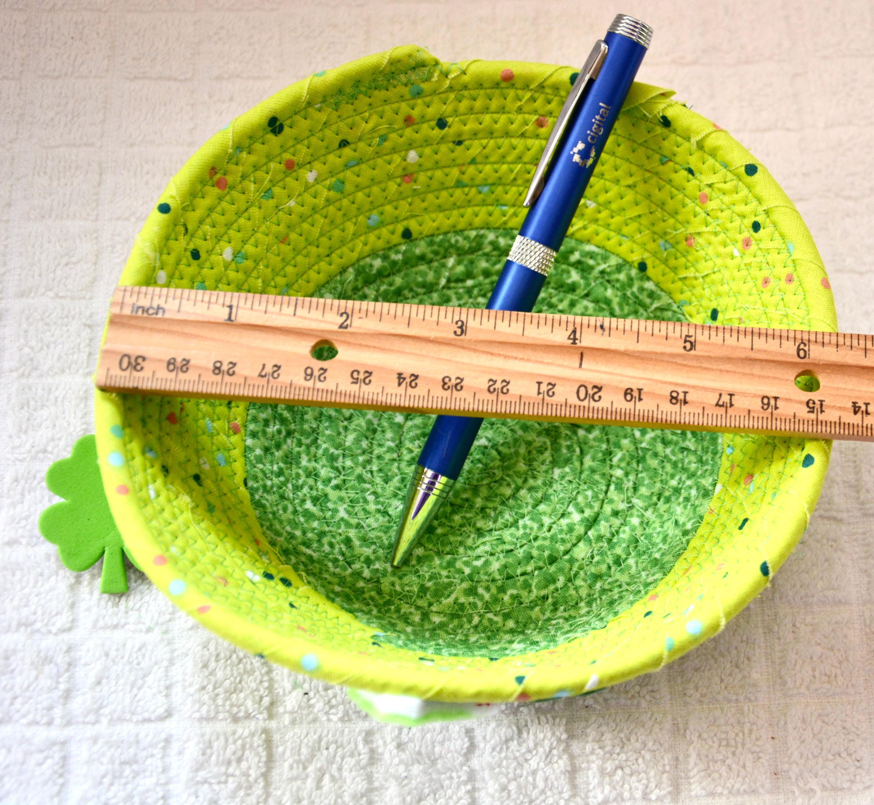 These cute fabrics are 100% cotton and show on the inside of the basket too! Please see the picture with the pen and ruler to help gauge the size of this lovely basket. Ruler, pen, bead, shamrock props not included.