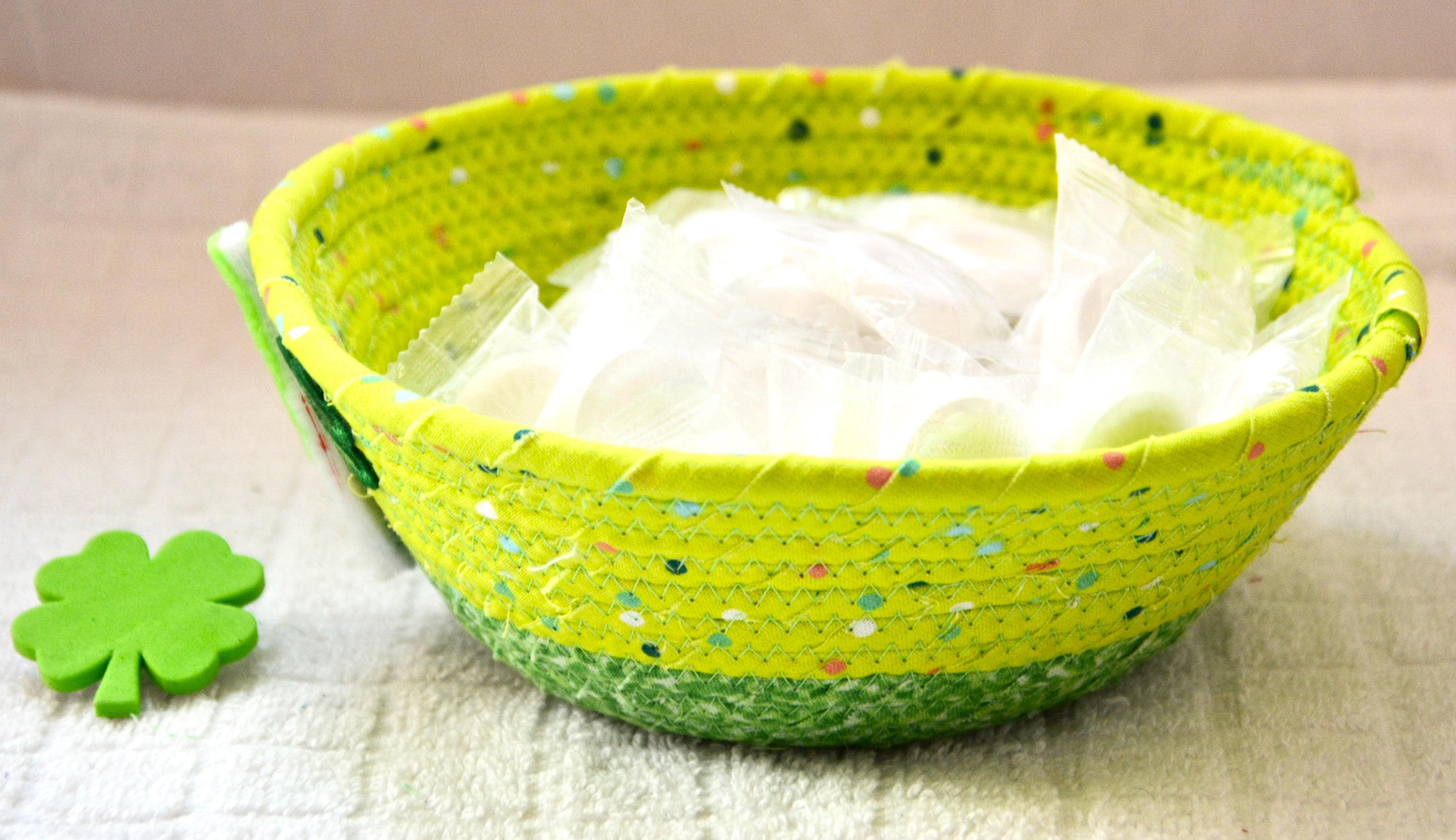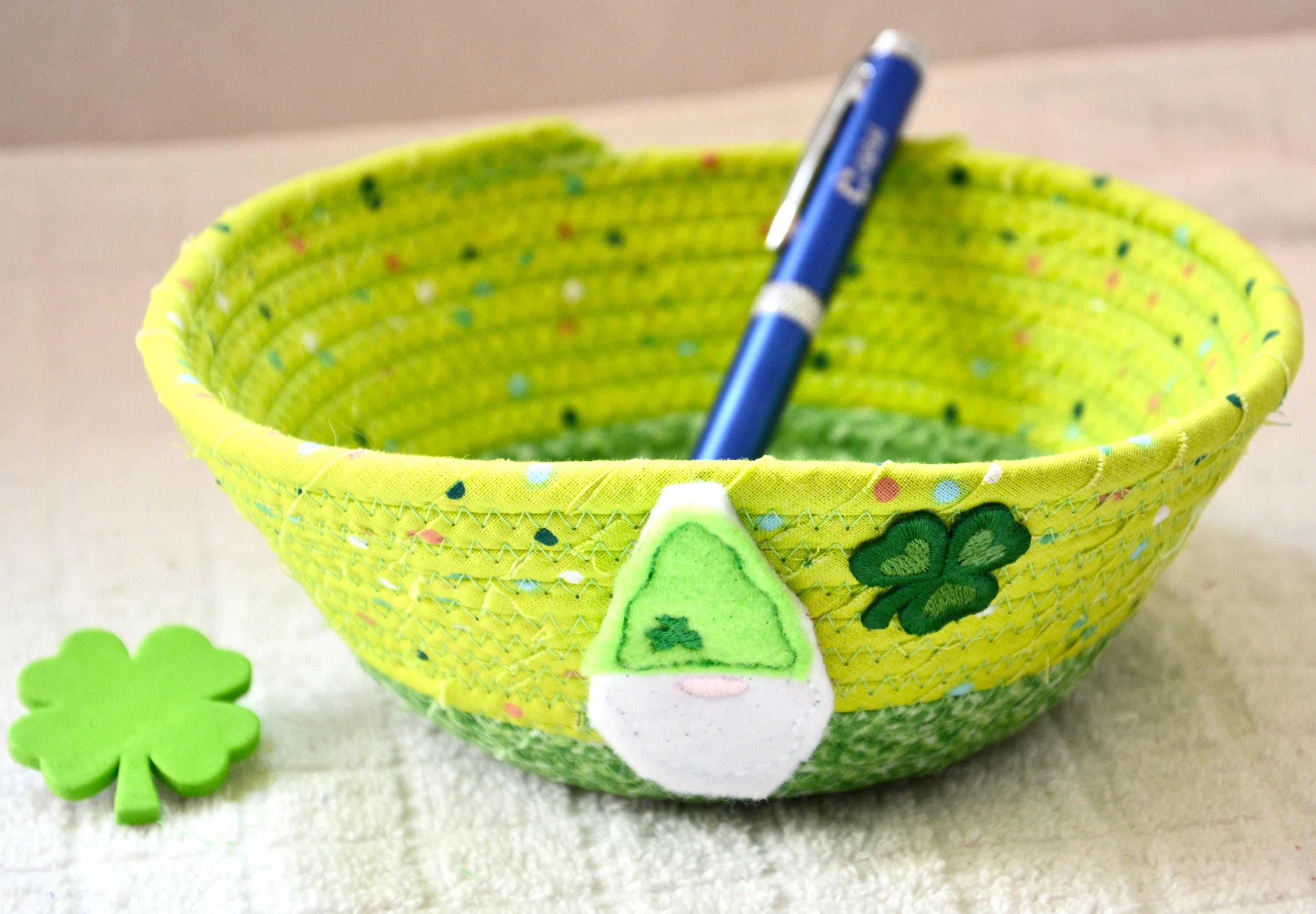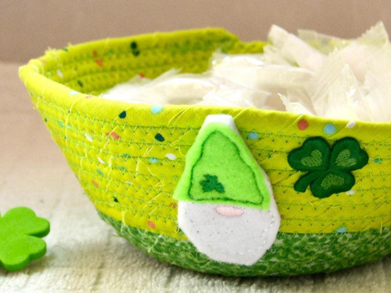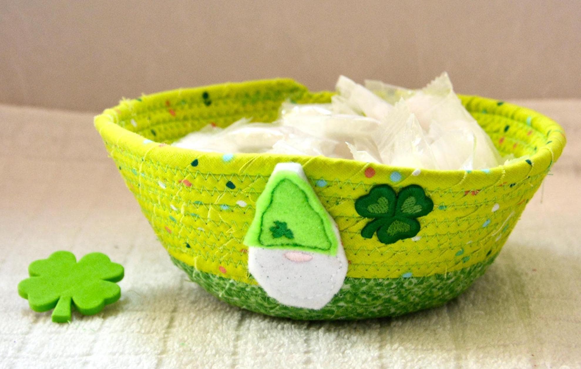 I hand wrapped these wonderful lime green fabrics around cotton line, which I then hand coiled and machine quilted to make the basket sturdy. I used the raw edge technique with some fray to give it a lovely shabby chic texture. The cute GNOME and shamrock on the basket are included for a nice accent.