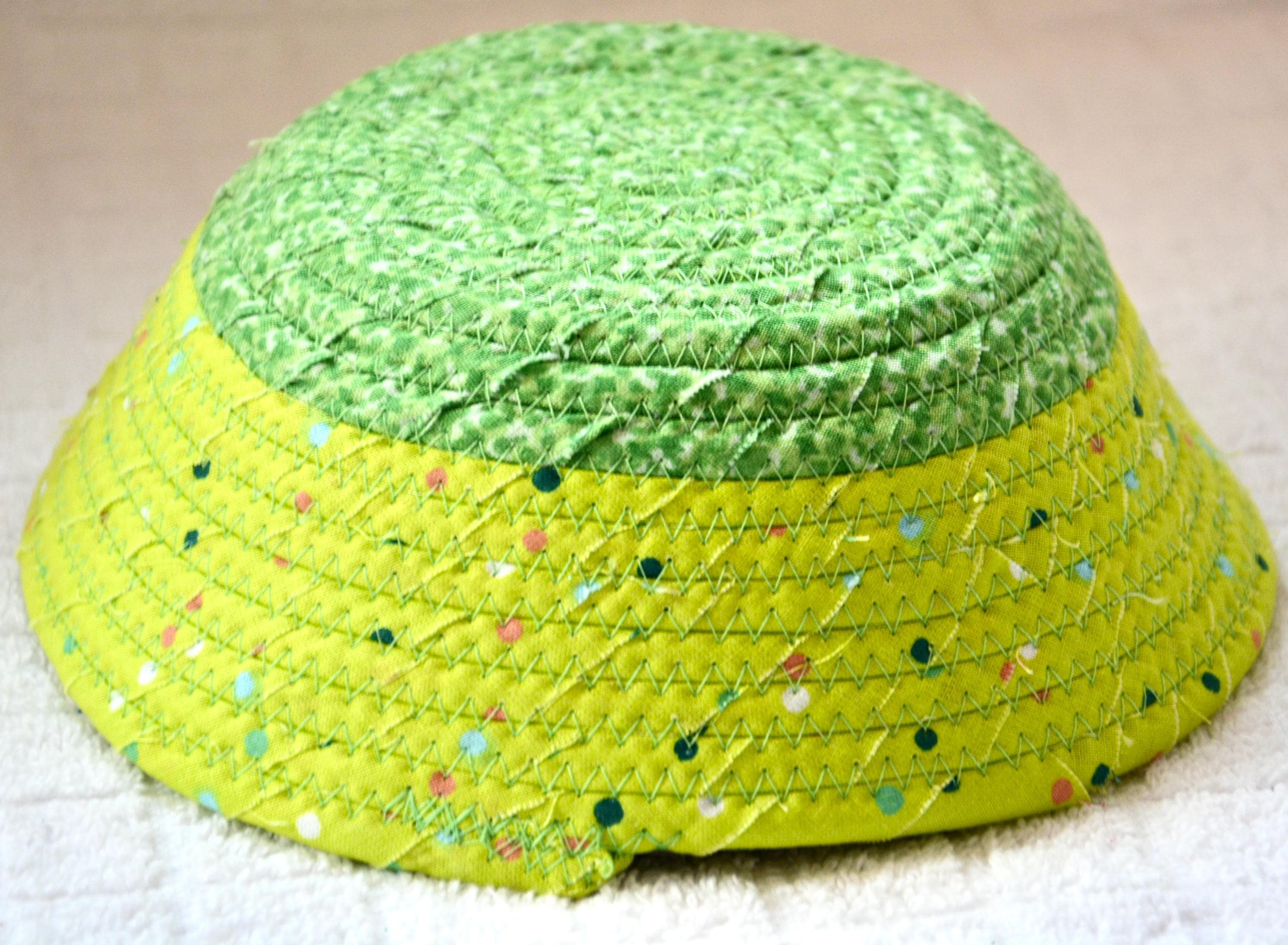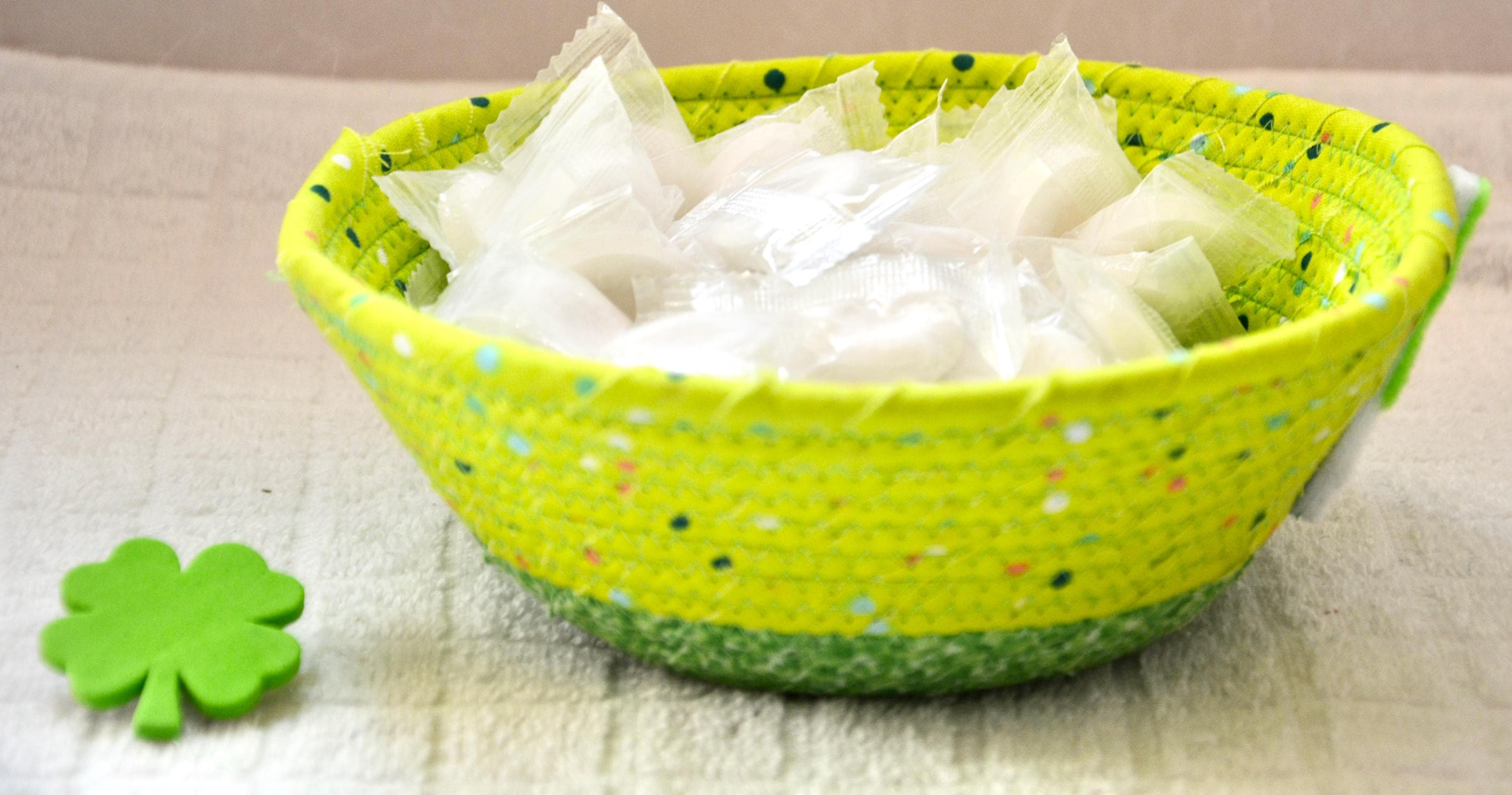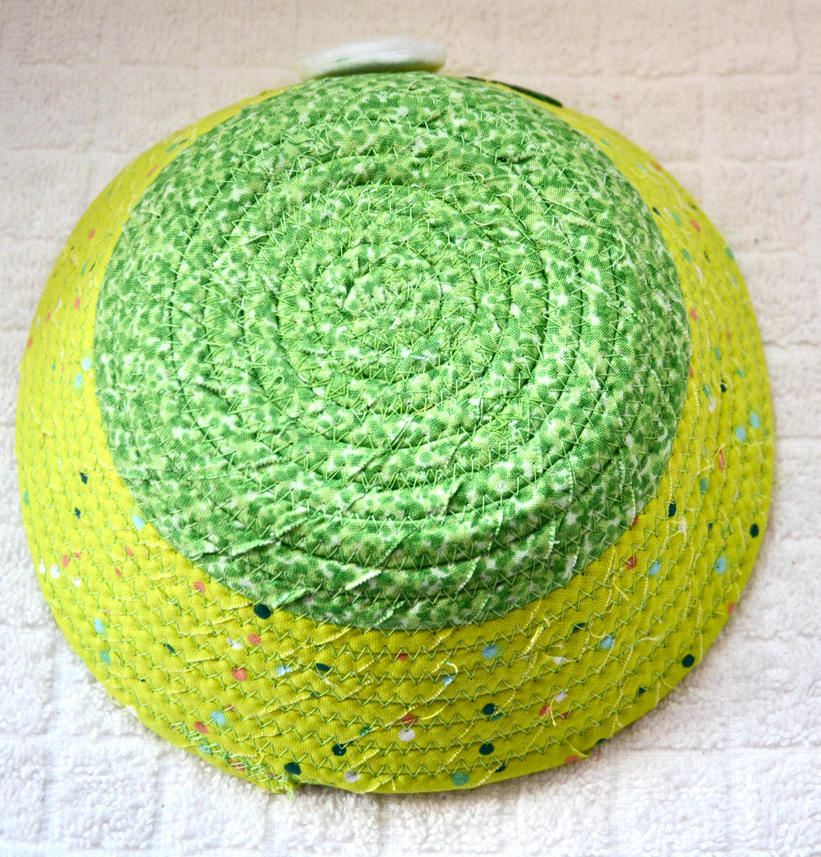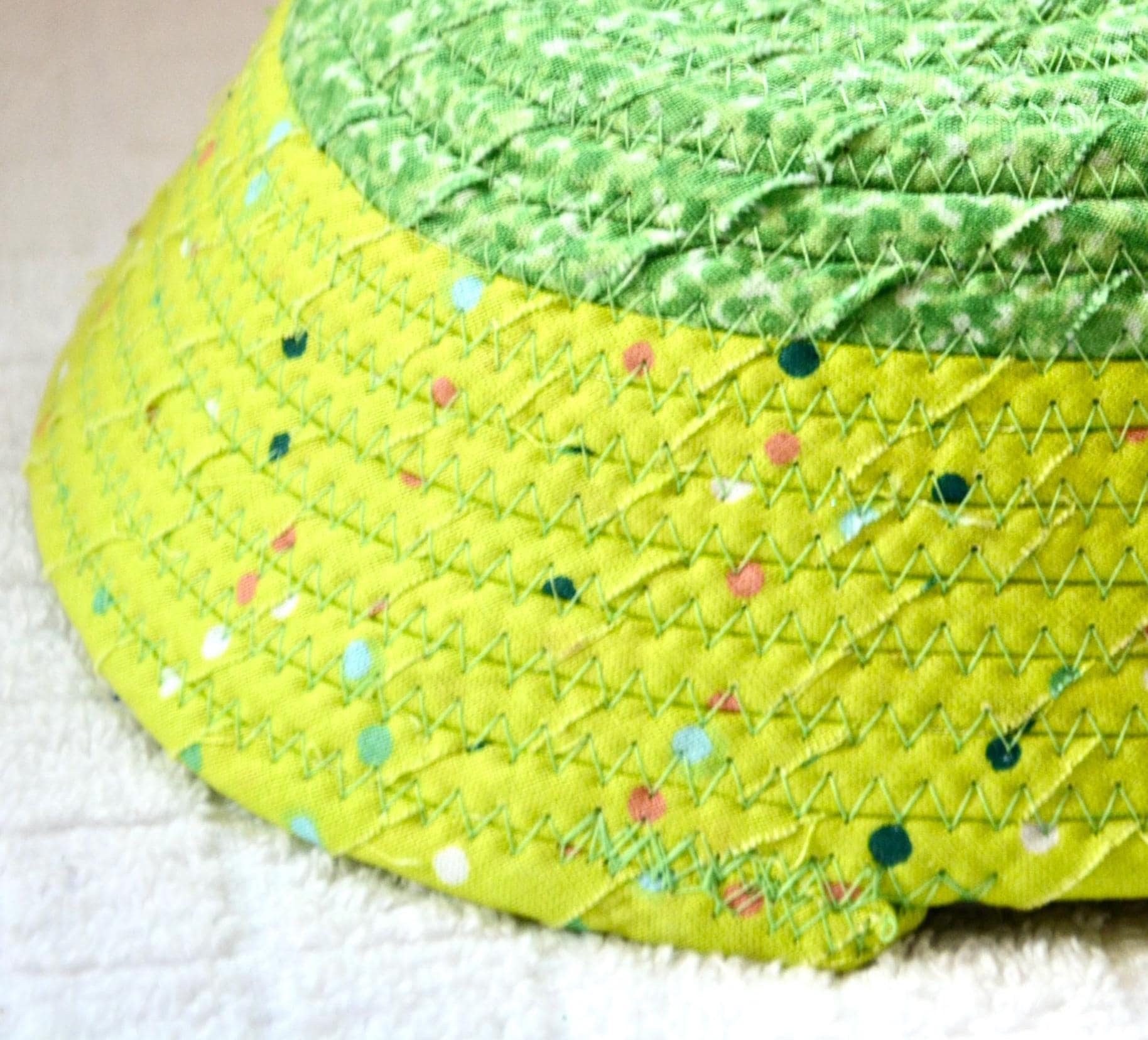 I hand wrapped these wonderful lime green fabrics around cotton line, which I then hand coiled and machine quilted to make the basket sturdy. I used the raw edge technique with some fray to give it a lovely shabby chic texture. The cute GNOME and shamrock on the basket are included for a nice accent.