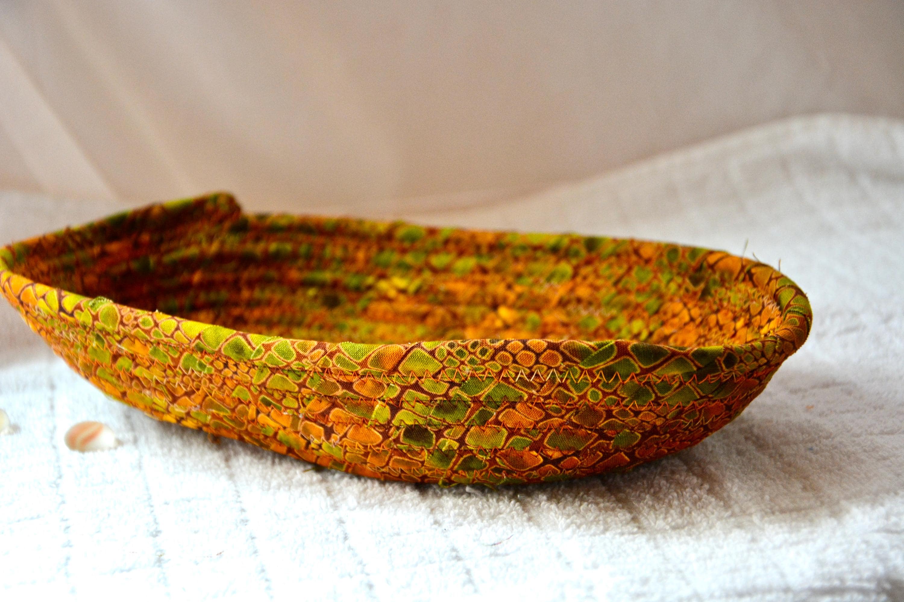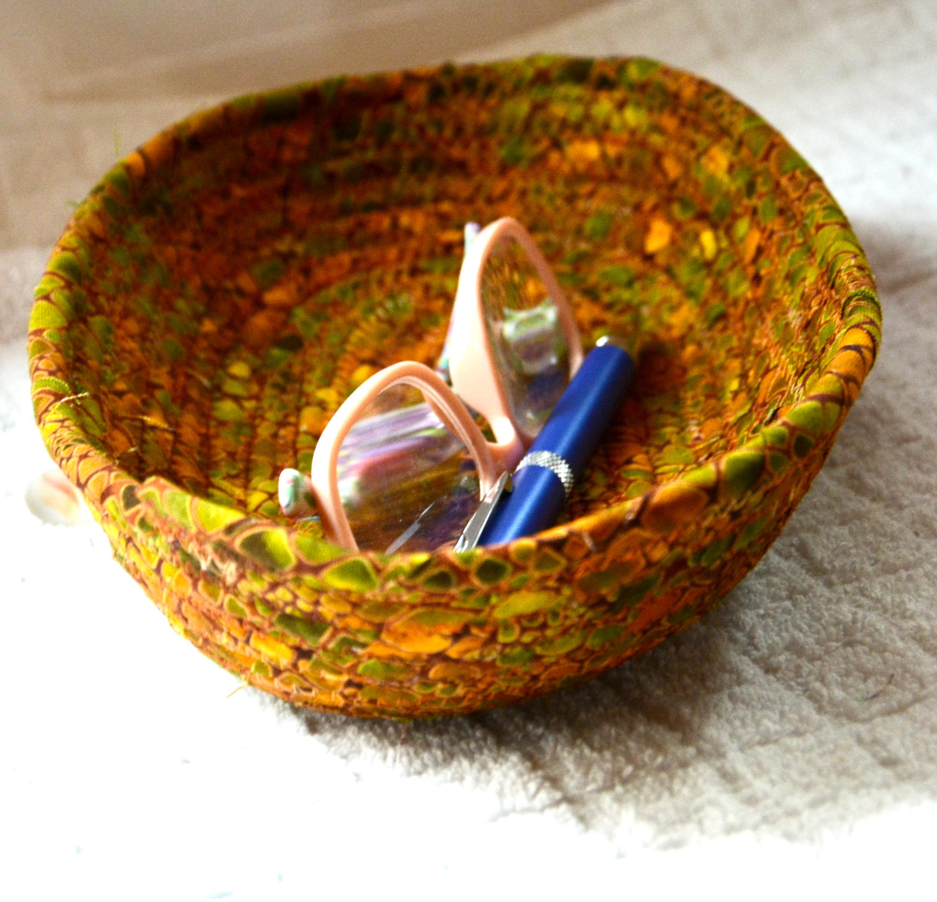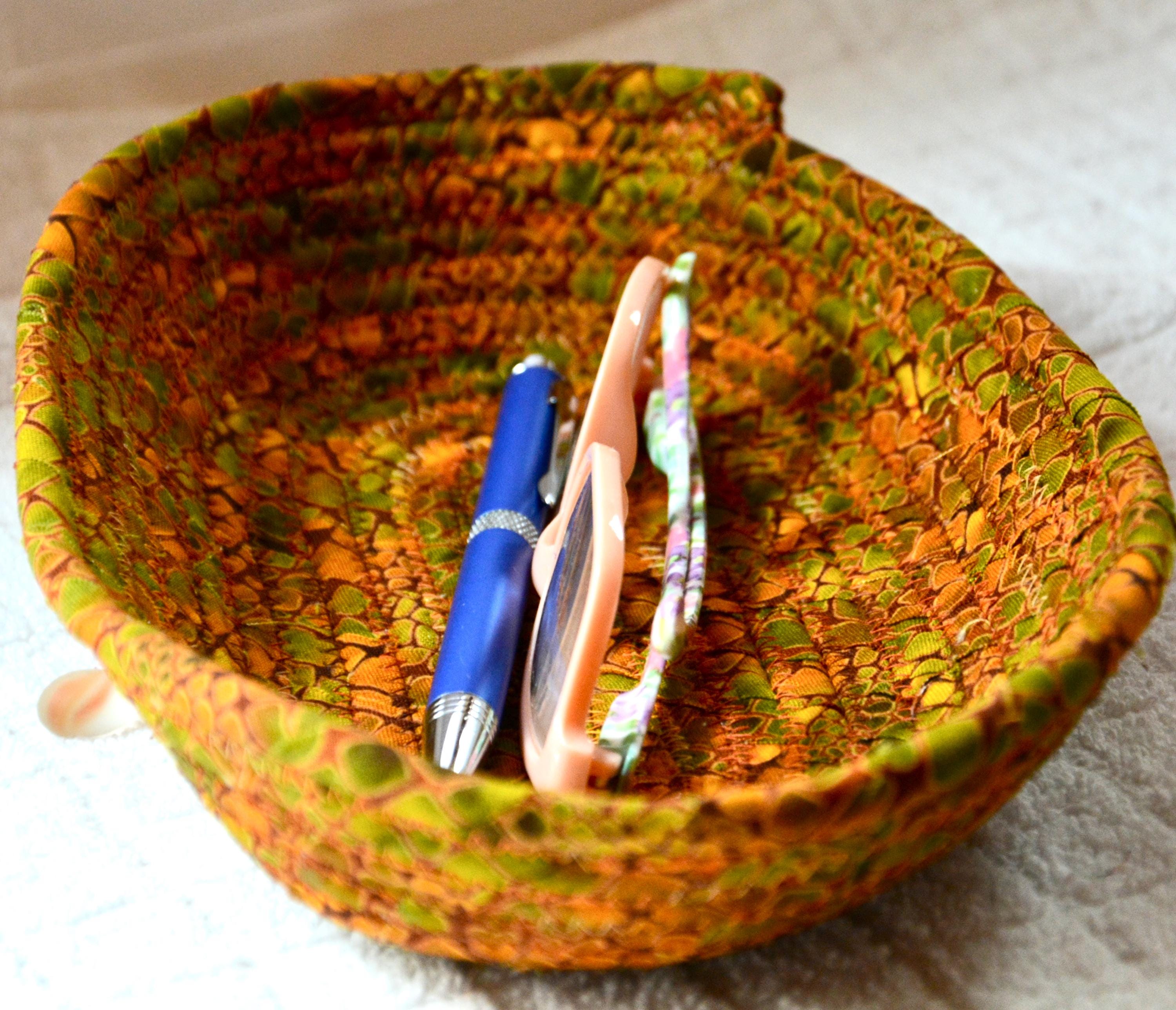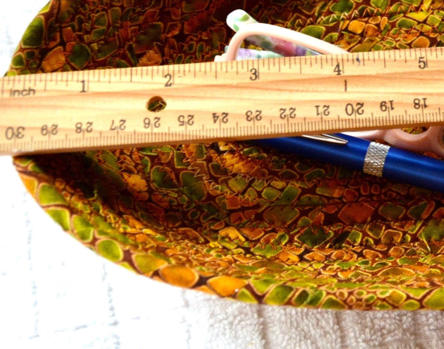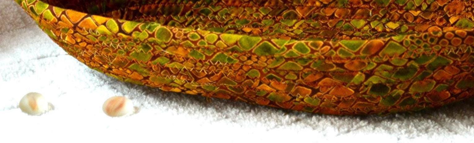 I hand wrapped this wonderful fabric around cotton line, which I then hand coiled and machine quilted to make it sturdy. I used the raw edge technique with a little fray for a great shabby chic texture. This rich fabric shows on the inside too! 100% cotton!