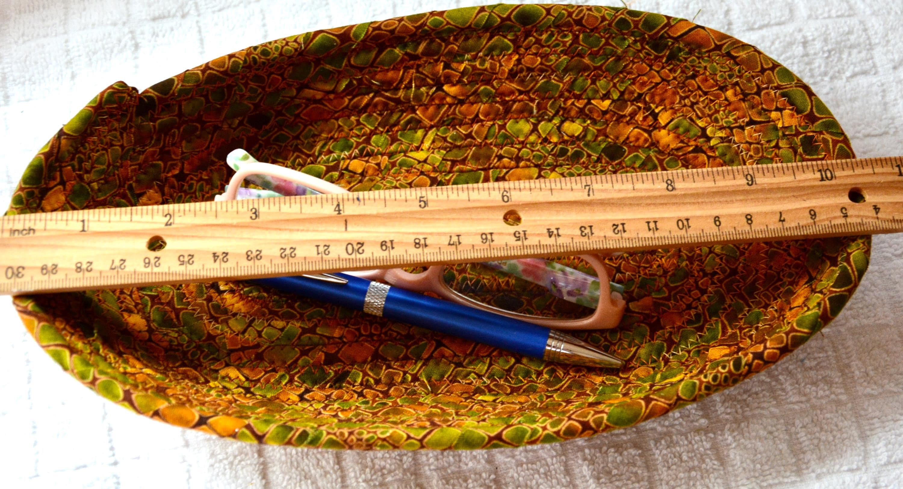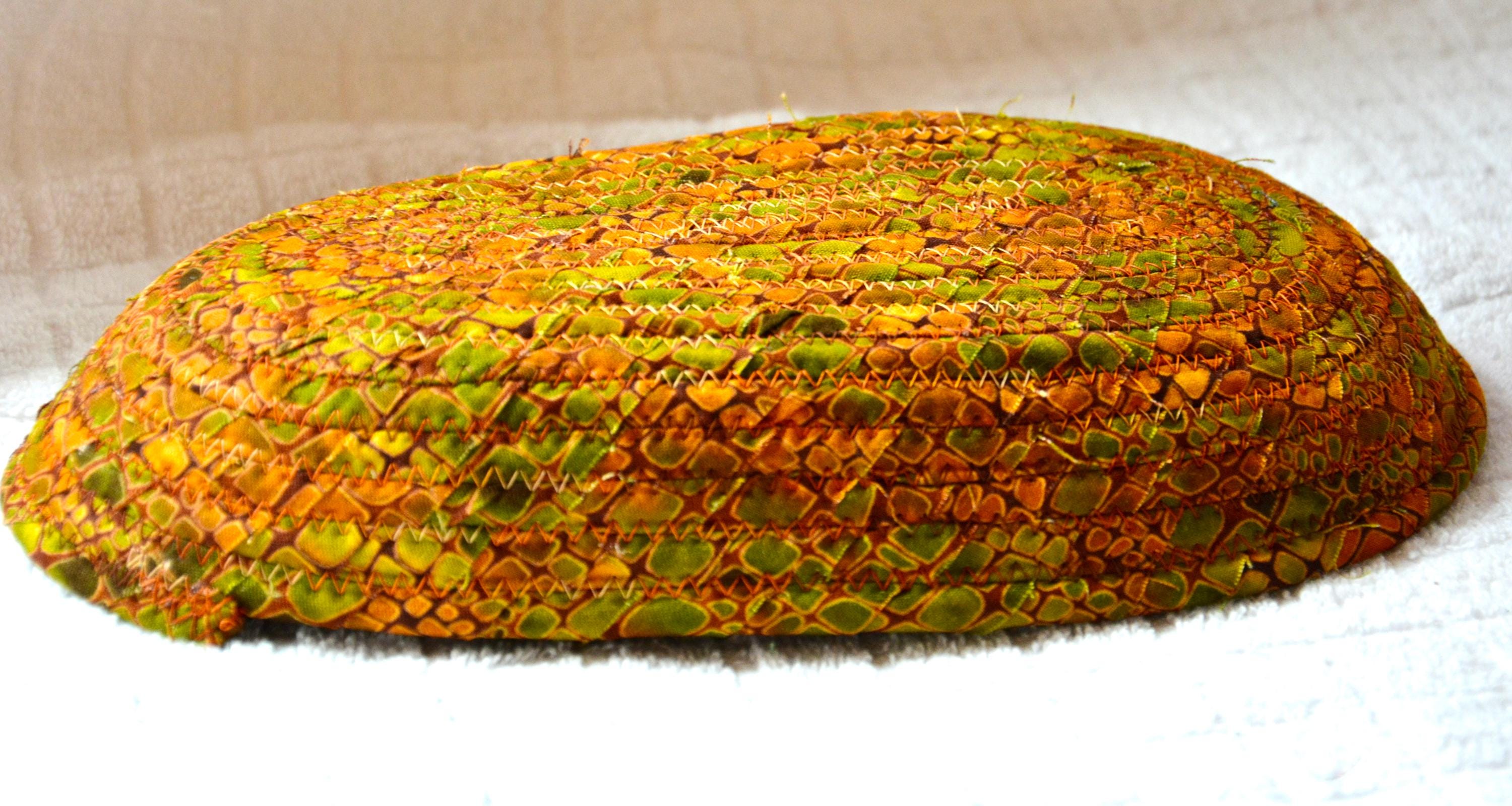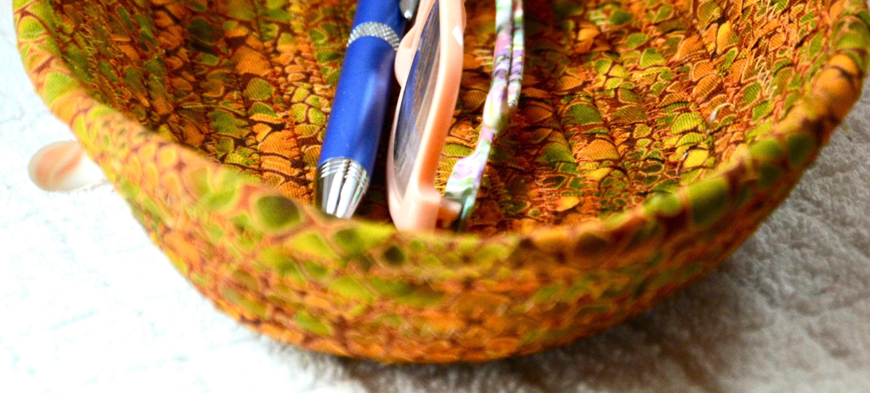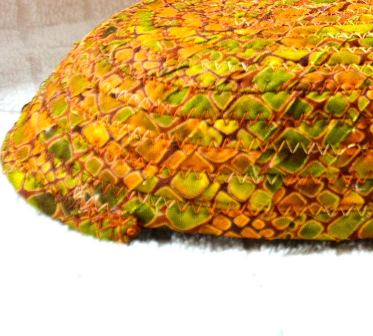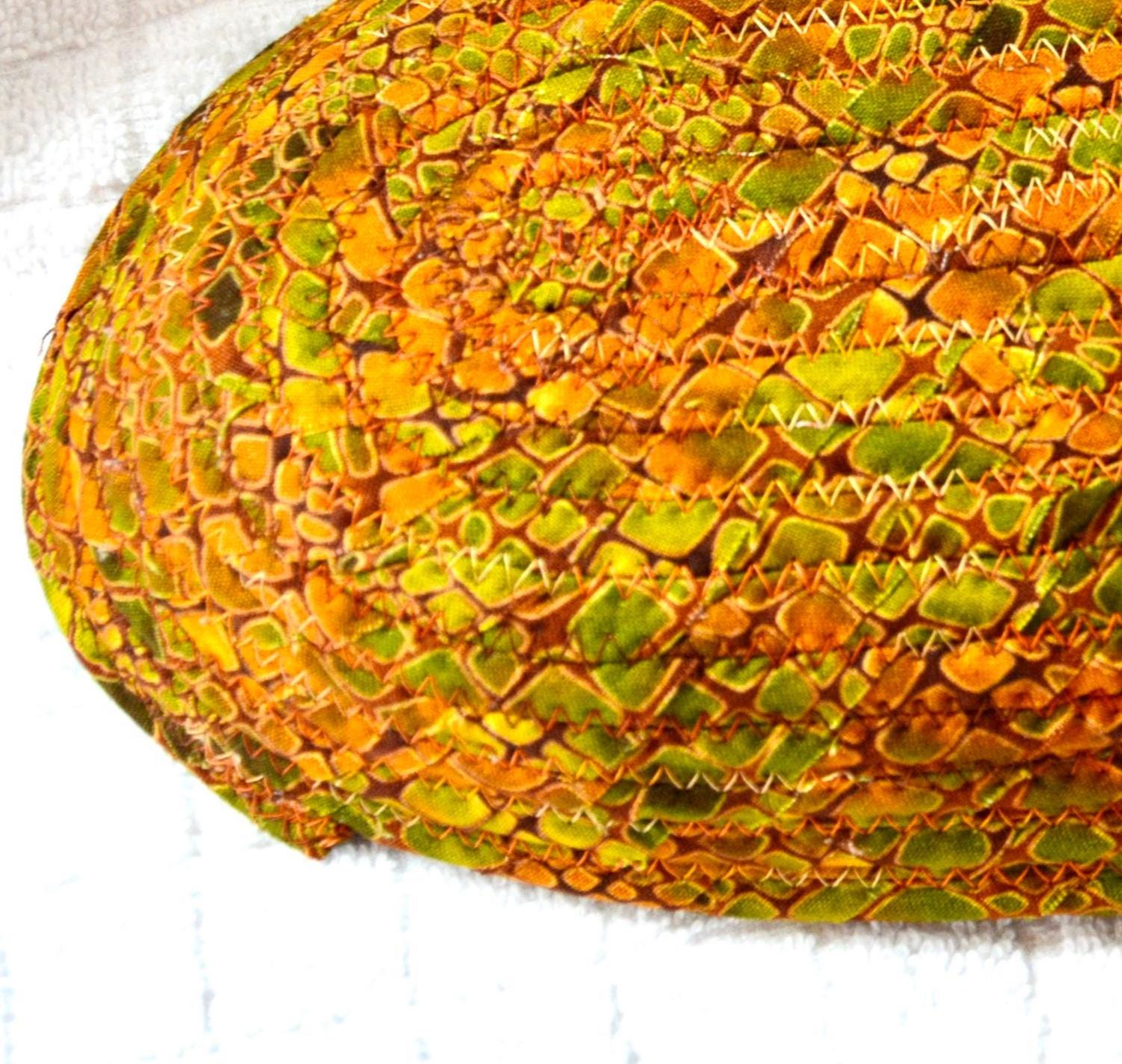 I hand wrapped this wonderful fabric around cotton line, which I then hand coiled and machine quilted to make it sturdy. I used the raw edge technique with a little fray for a great shabby chic texture. This rich fabric shows on the inside too! 100% cotton!
