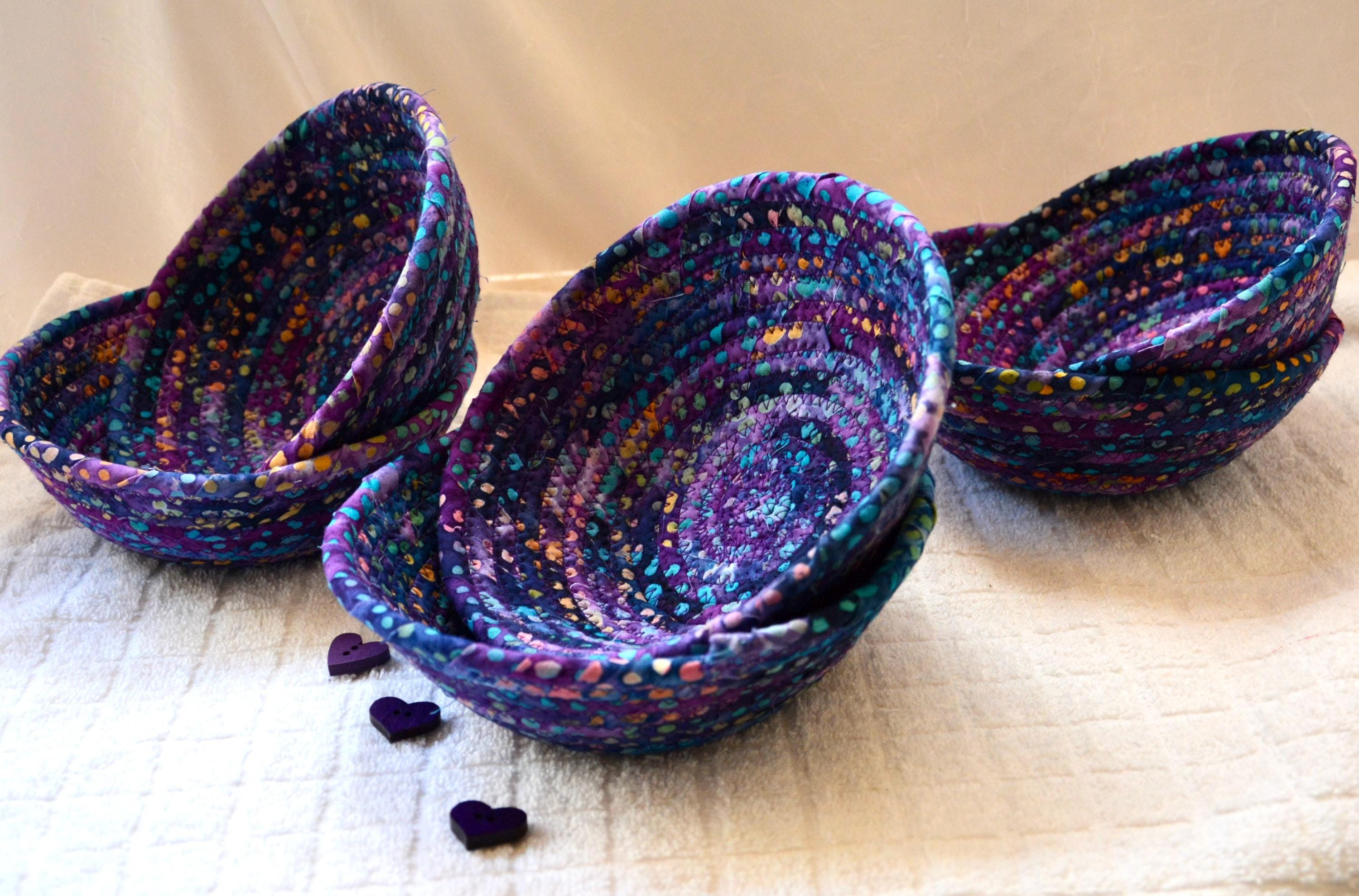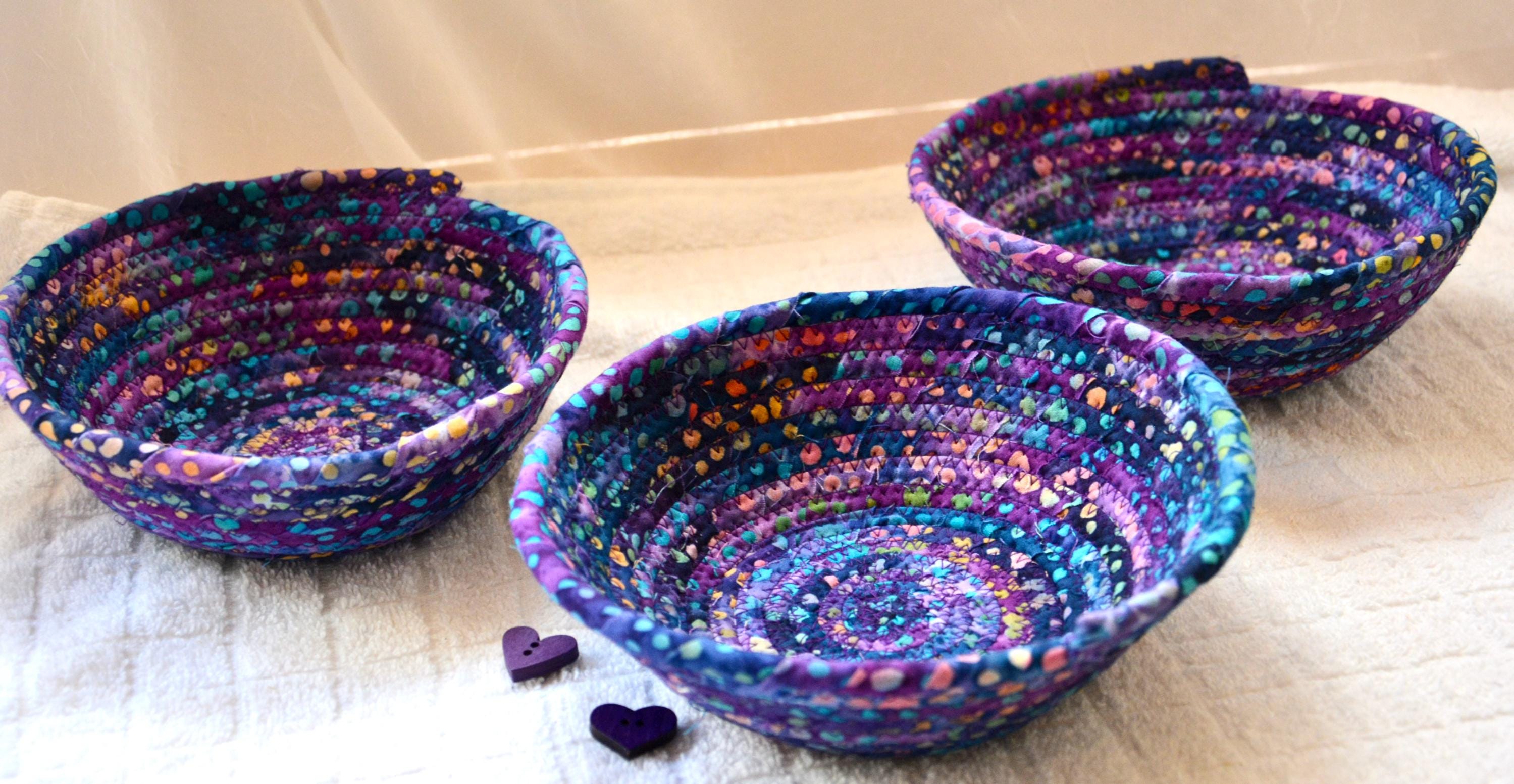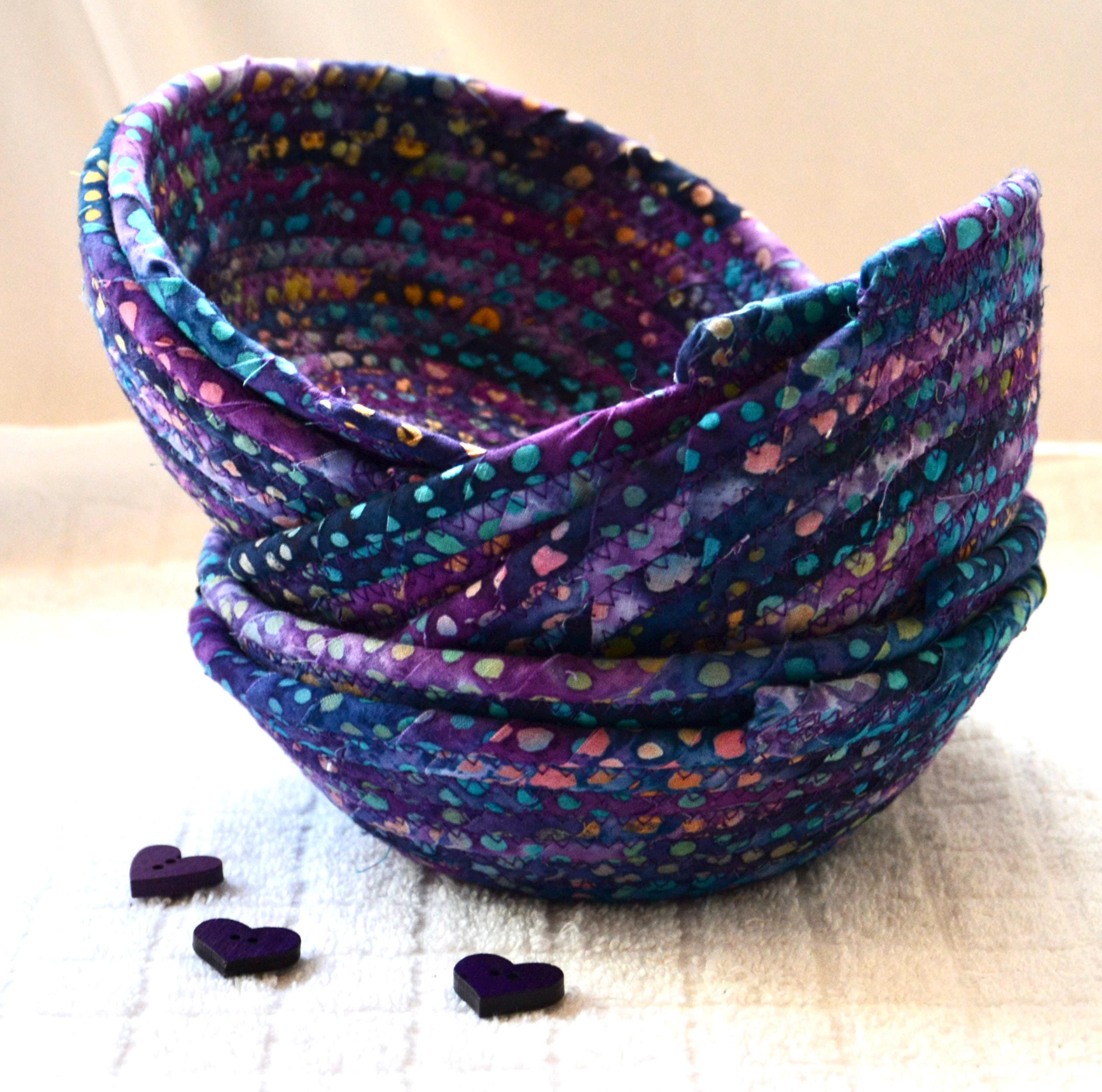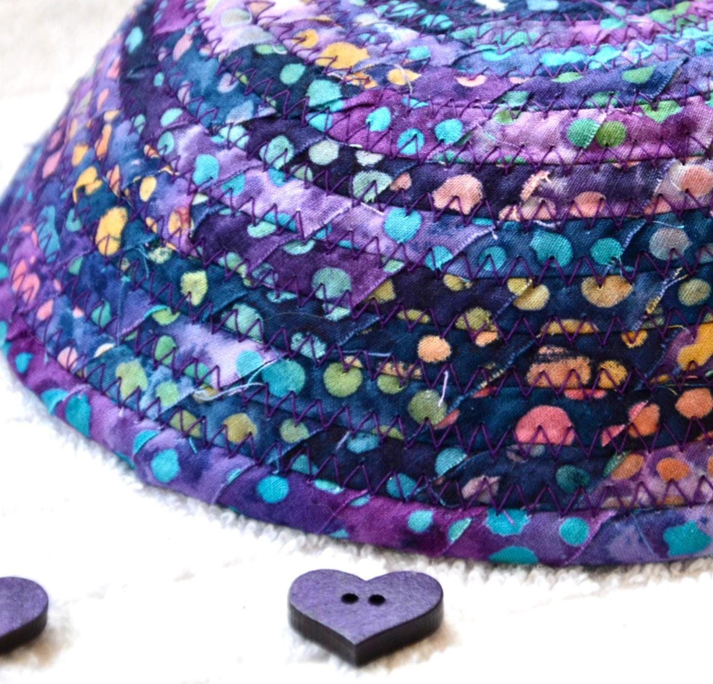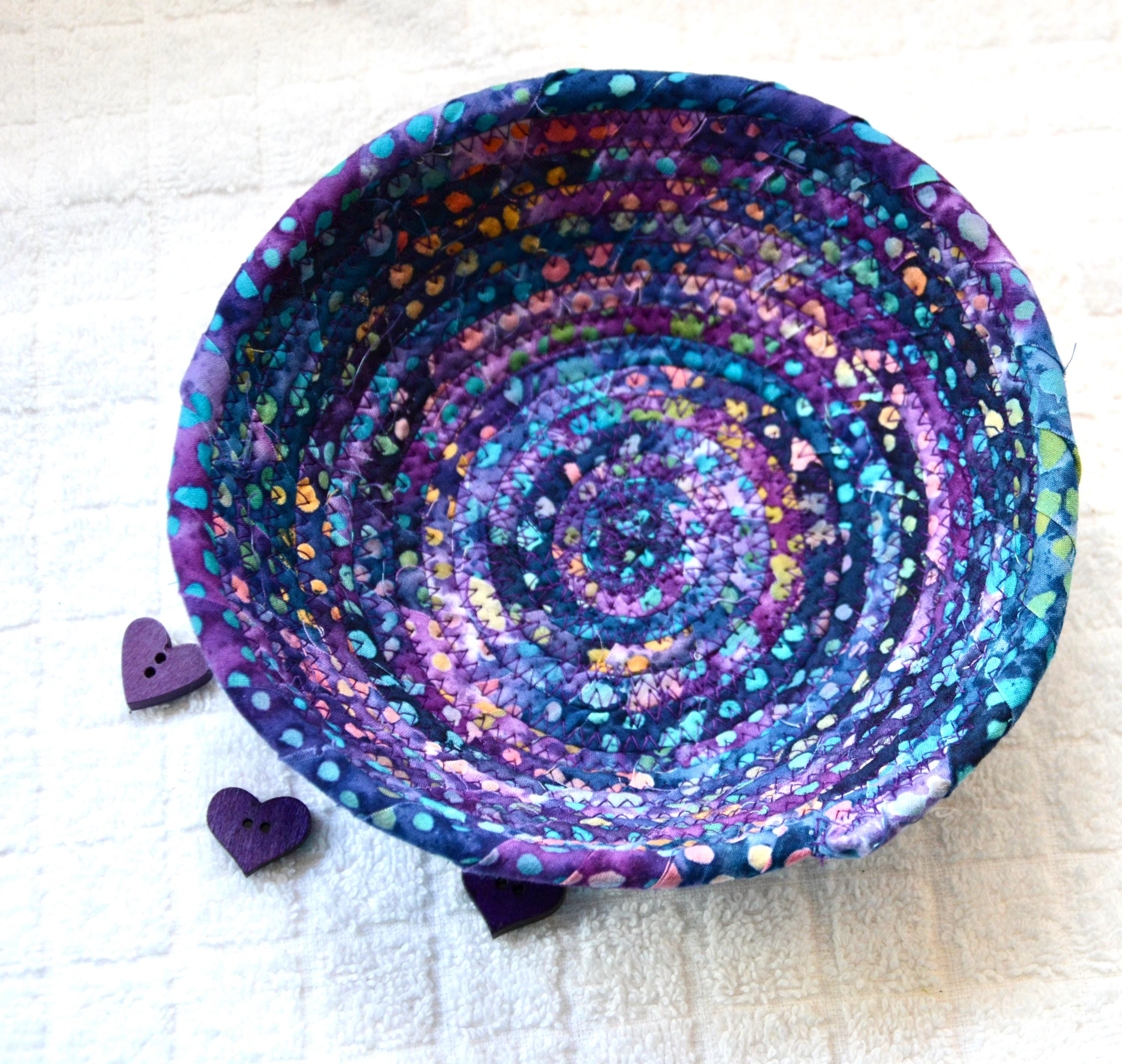 I hand wrapped this wonderful batik fabric around cotton line, which I then hand coiled and machine quilted to make it sturdy. I used the raw edge technique with some fray to add a great shabby chic texture. This is a high quality 100% cotton fabric and it shows on the inside too! Color placement will vary.