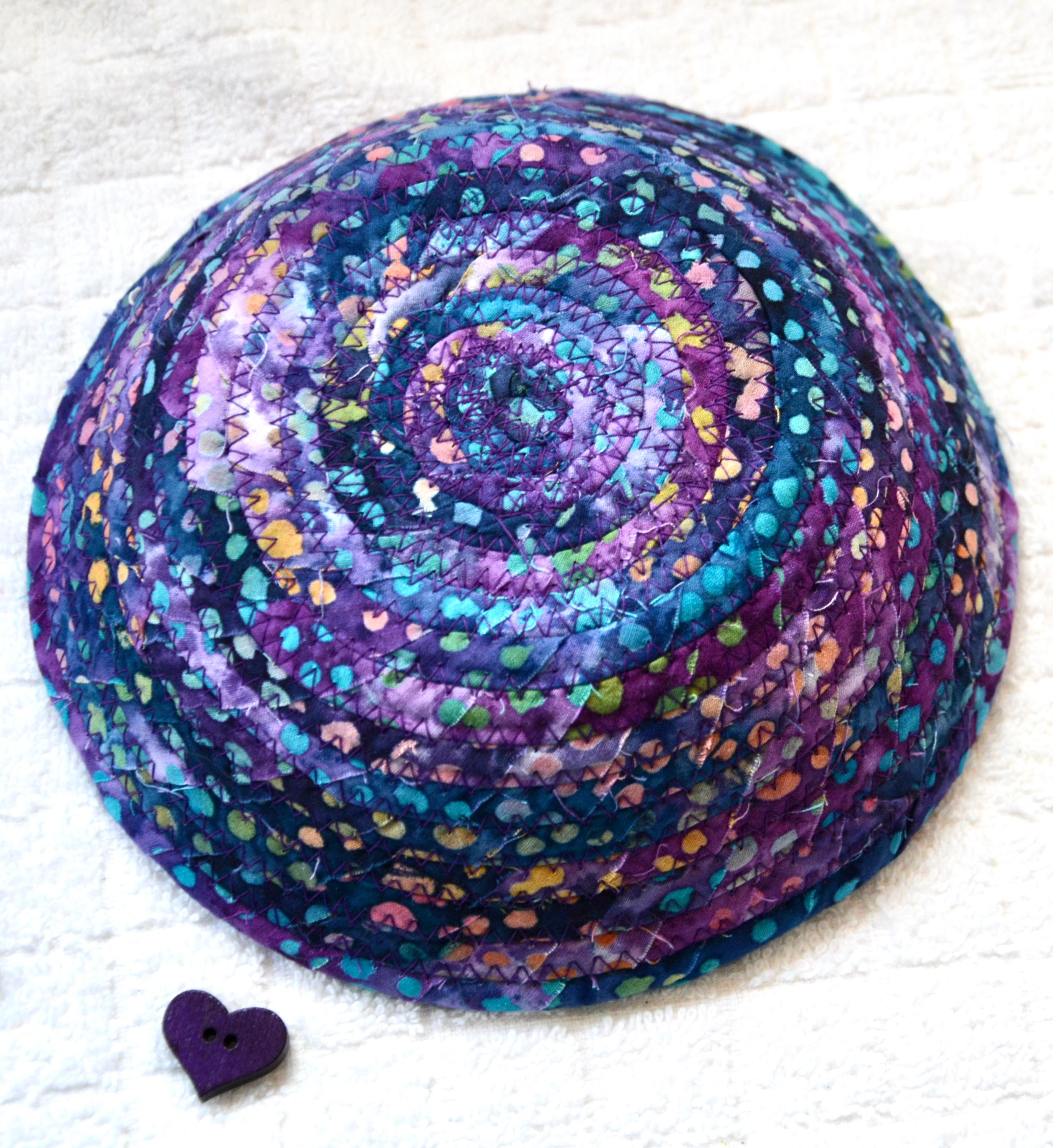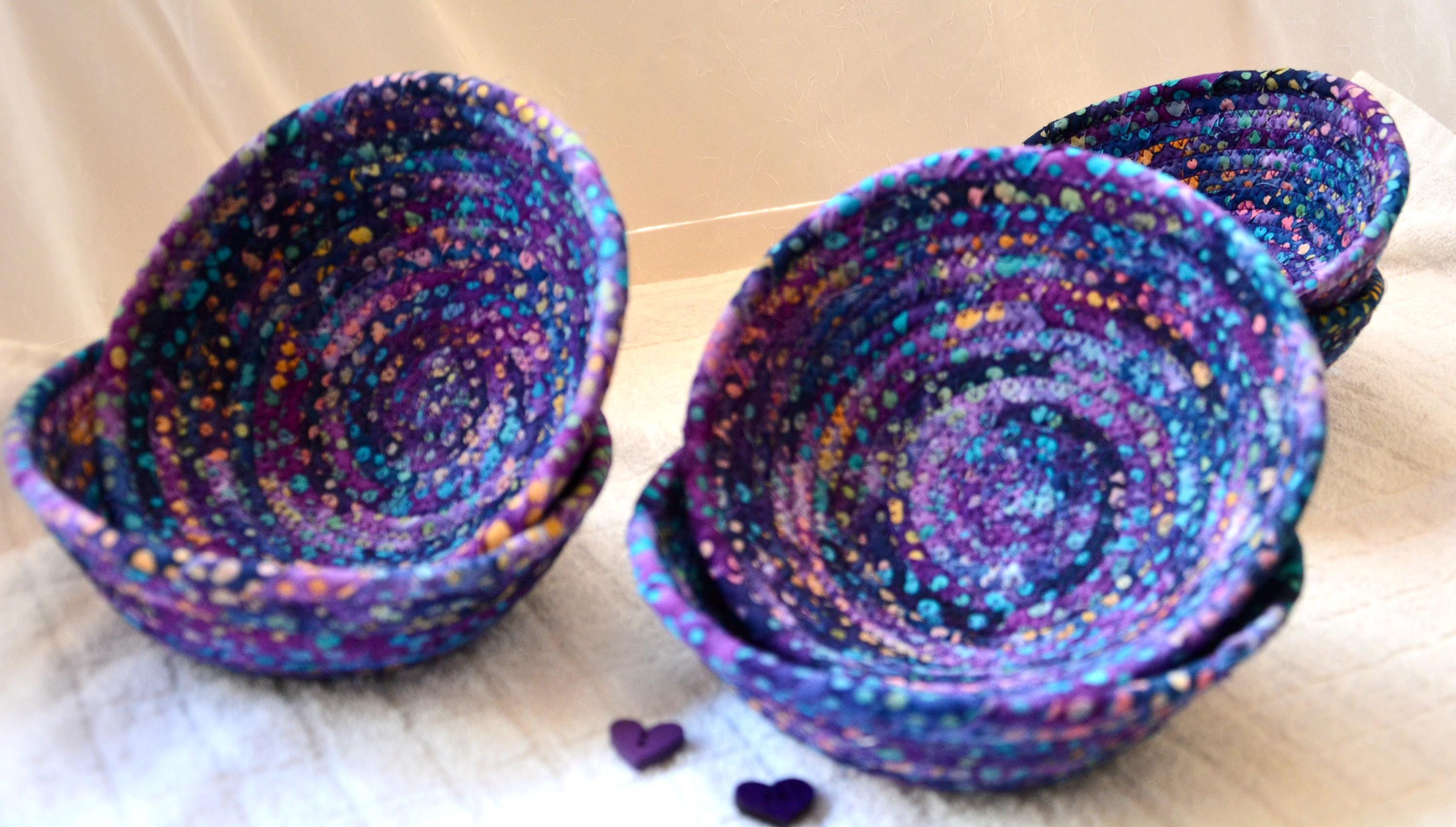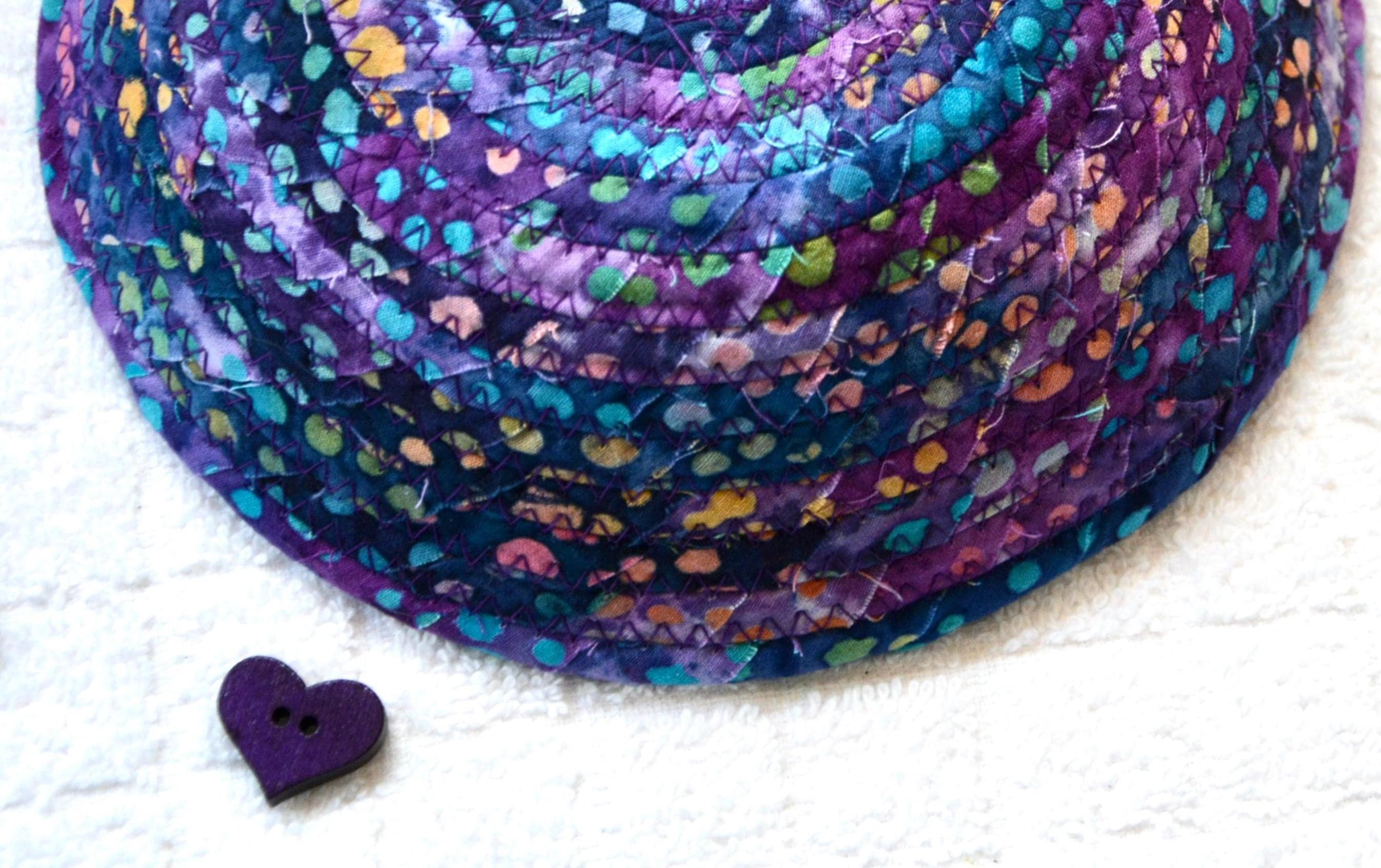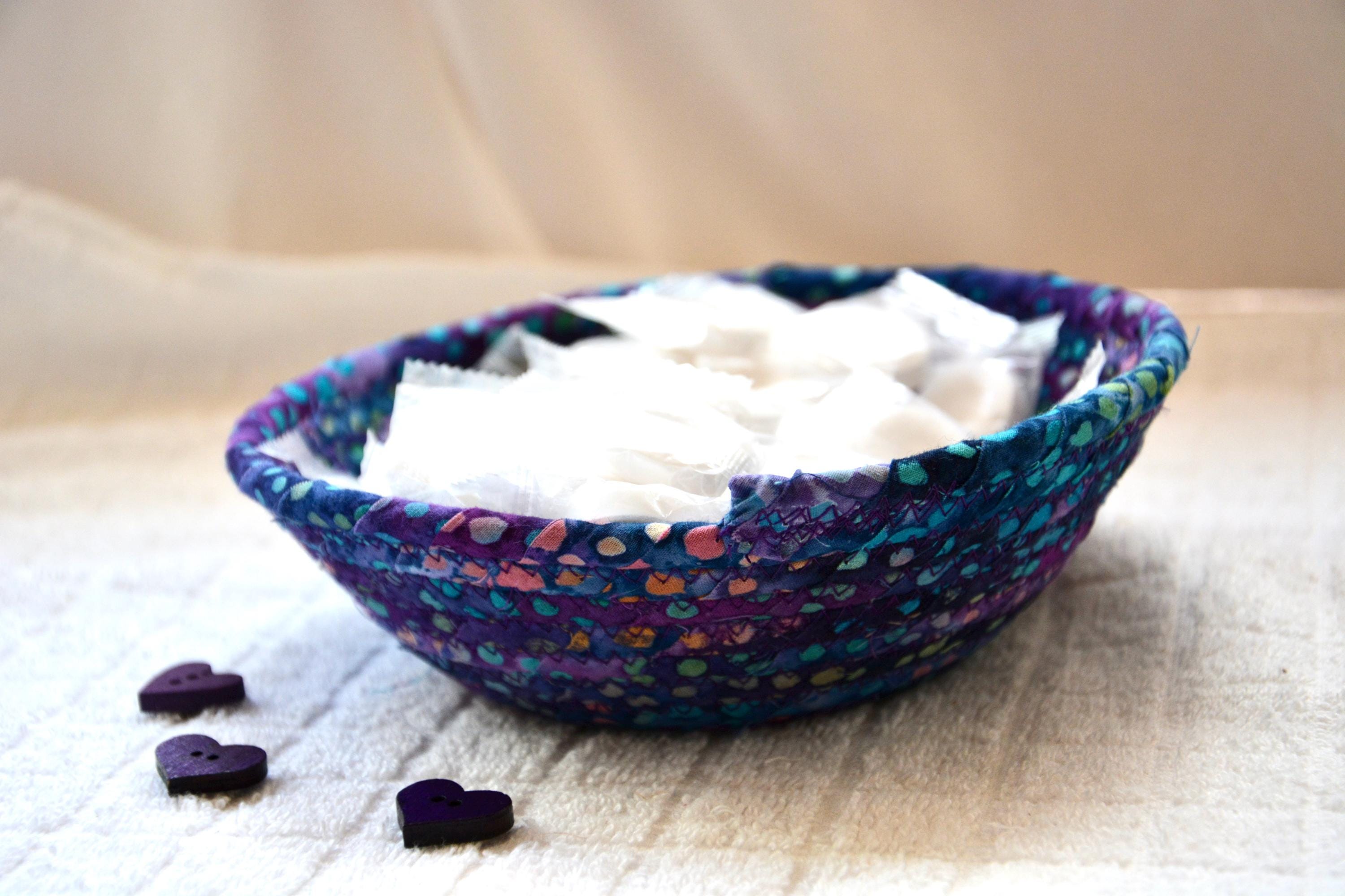 I hand wrapped this wonderful batik fabric around cotton line, which I then hand coiled and machine quilted to make it sturdy. I used the raw edge technique with some fray to add a great shabby chic texture. This is a high quality 100% cotton fabric and it shows on the inside too! Color placement will vary.