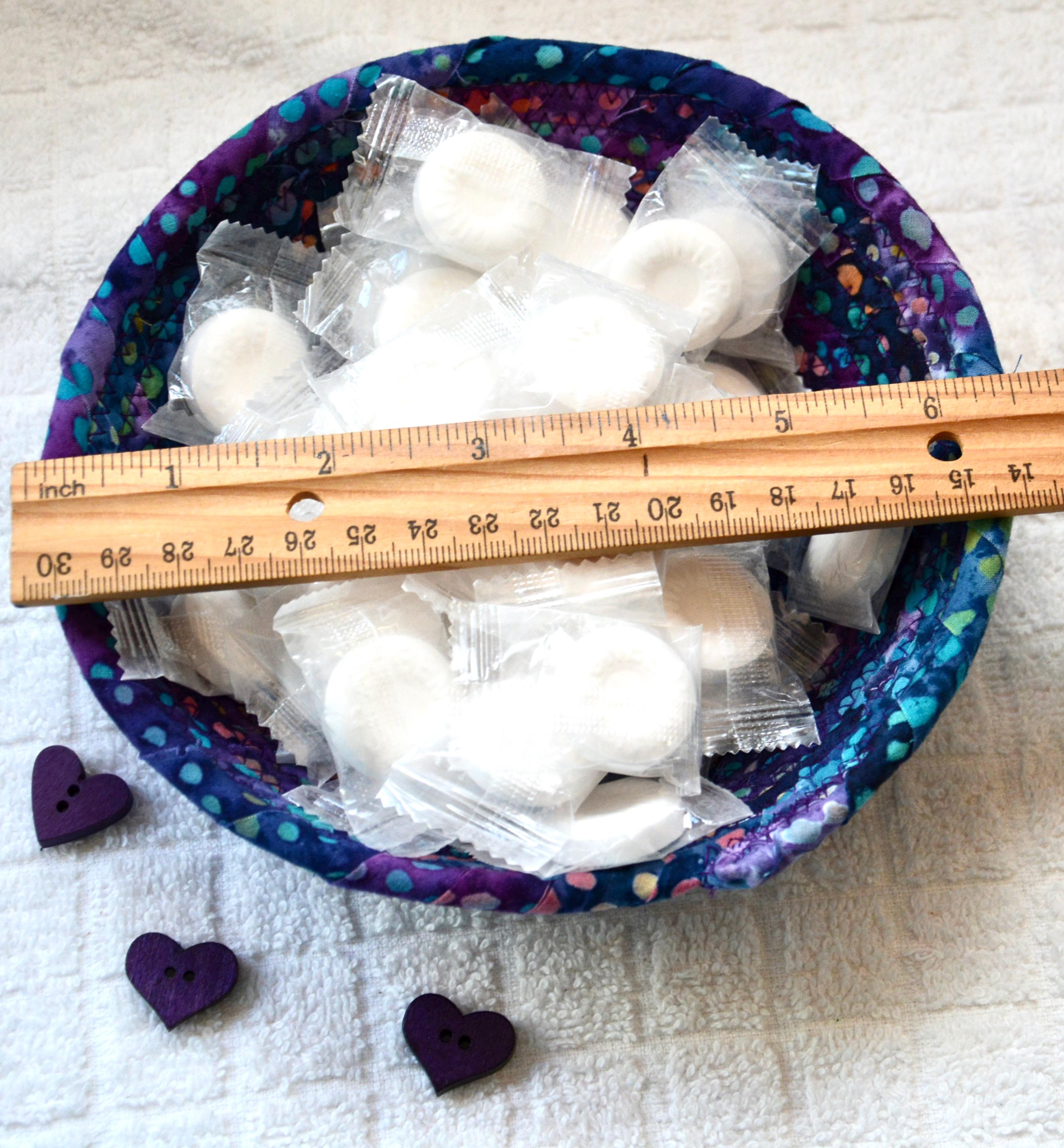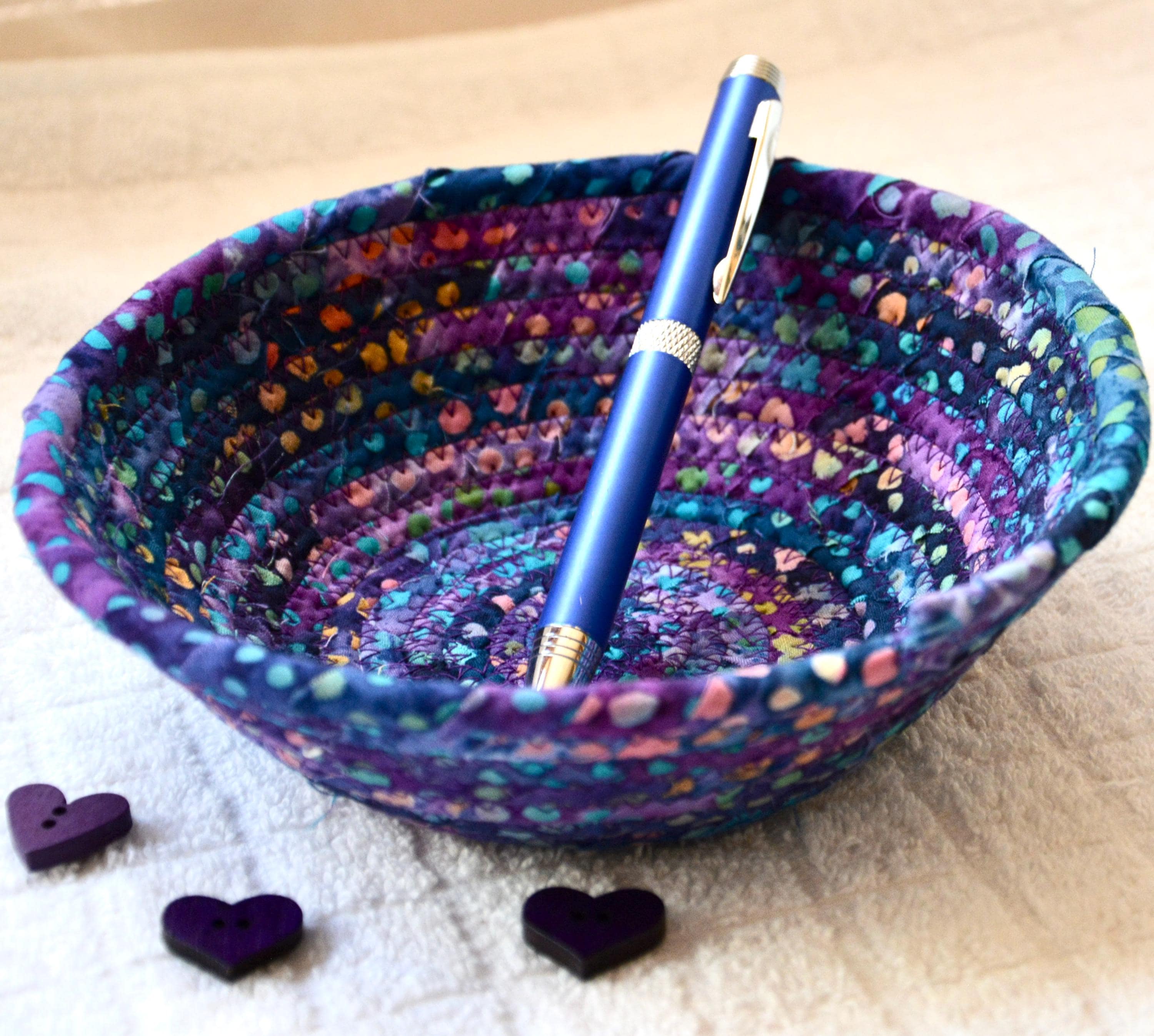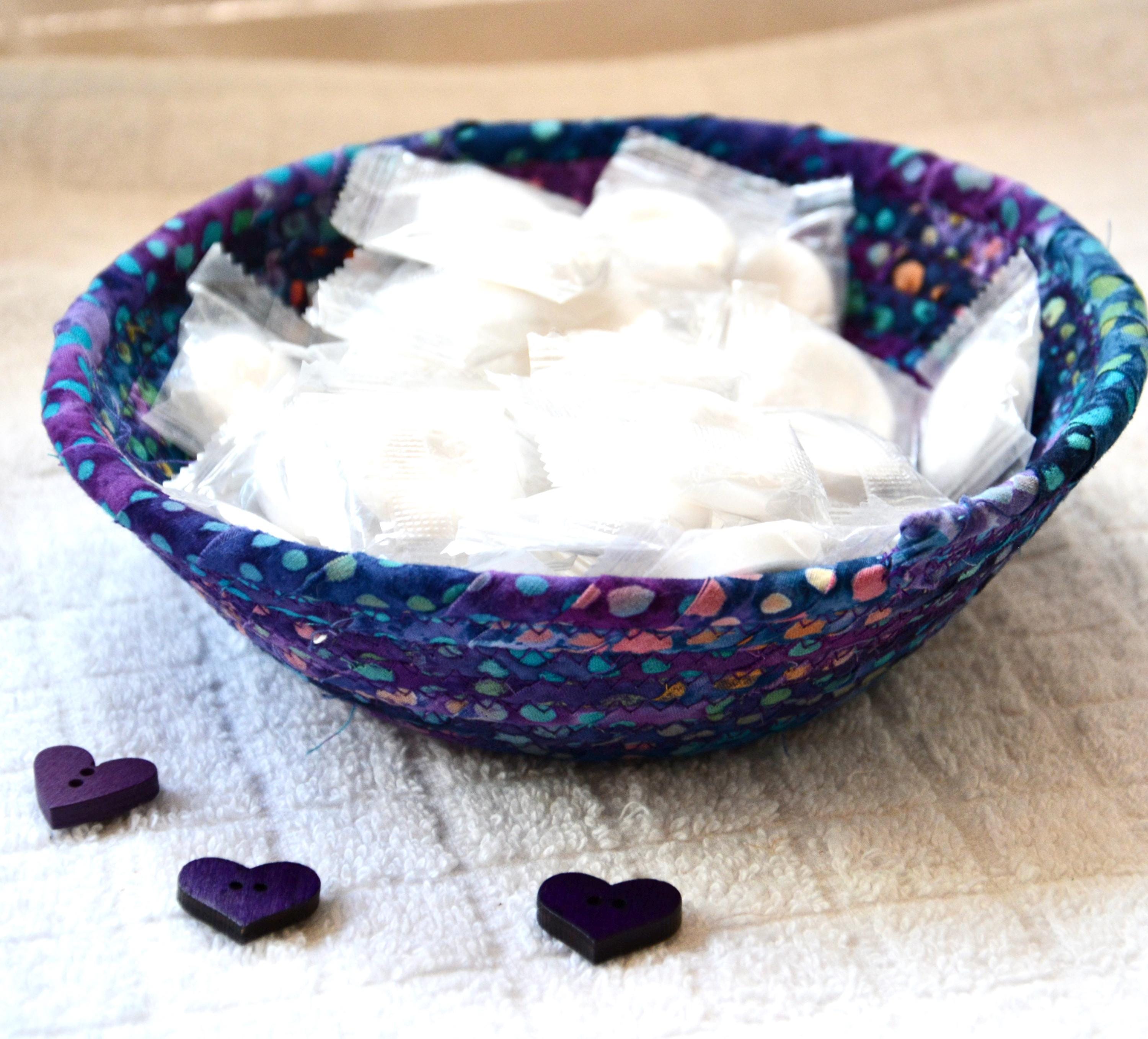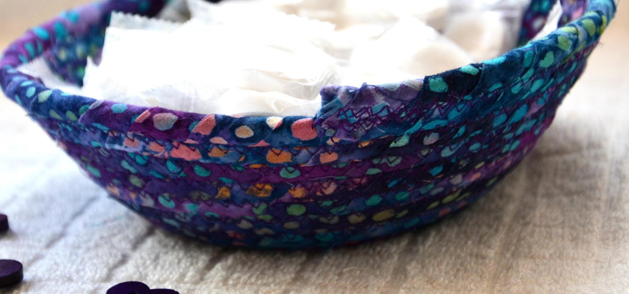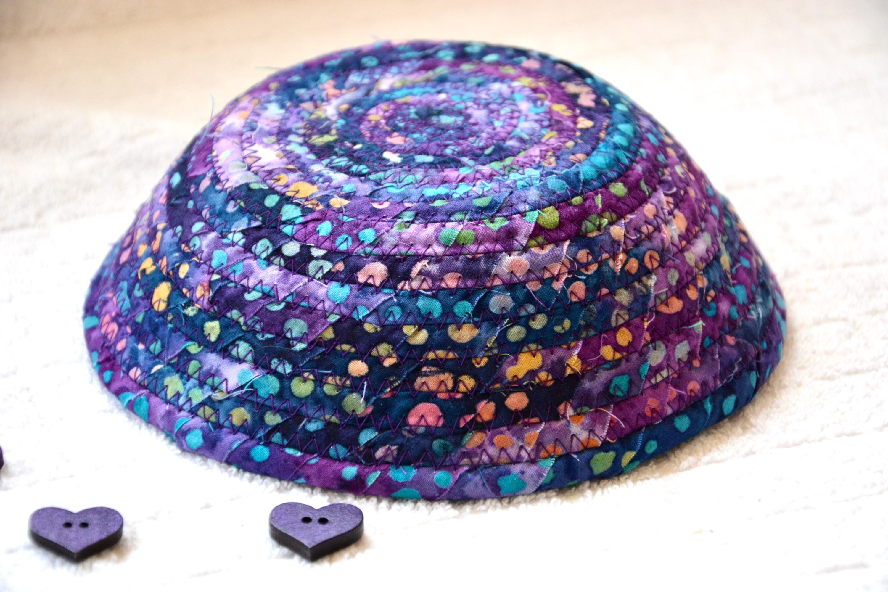 I hand wrapped this wonderful batik fabric around cotton line, which I then hand coiled and machine quilted to make it sturdy. I used the raw edge technique with some fray to add a great shabby chic texture. This is a high quality 100% cotton fabric and it shows on the inside too! Color placement will vary.