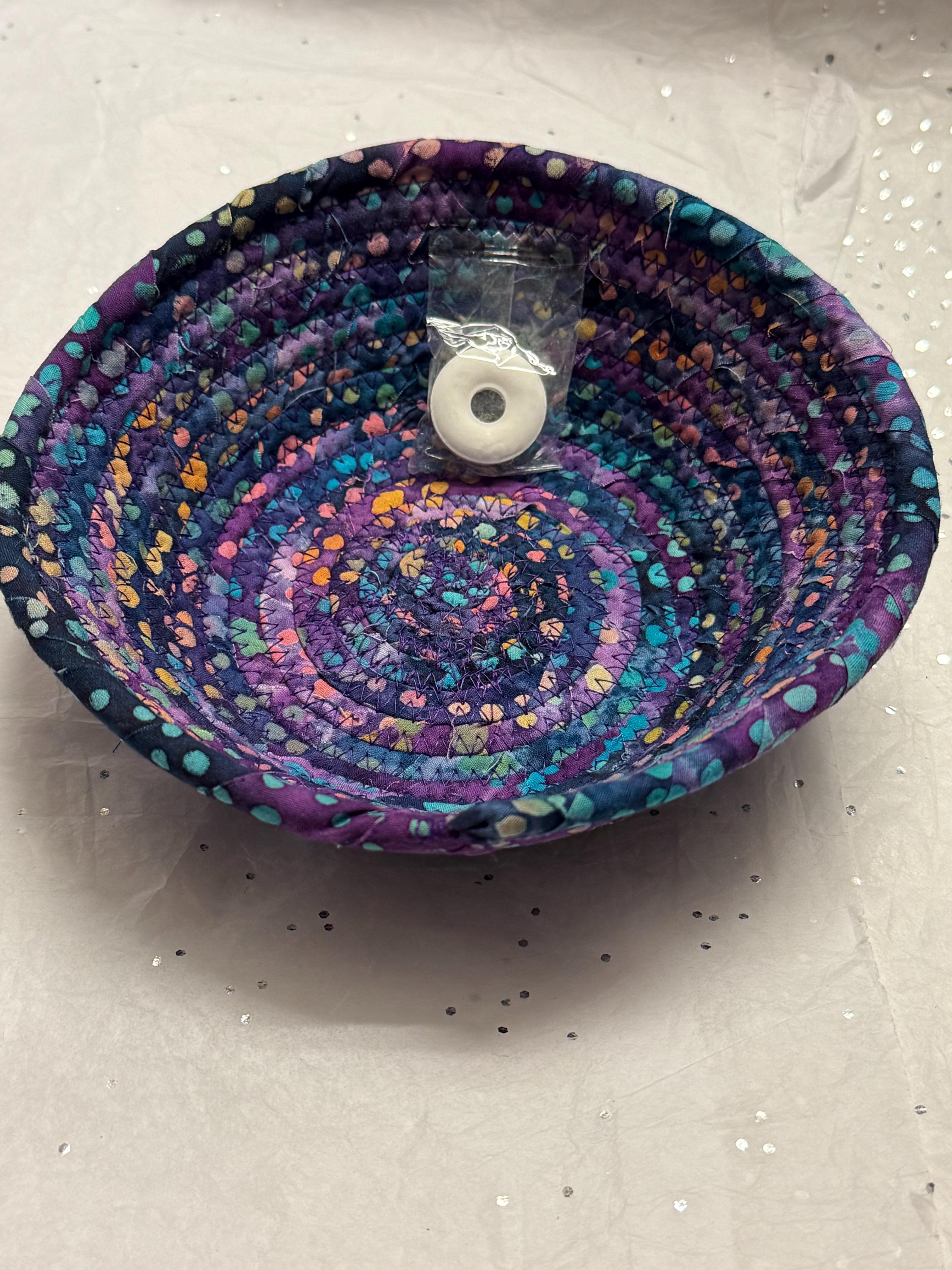 I hand wrapped this wonderful batik fabric around cotton line, which I then hand coiled and machine quilted to make it sturdy. I used the raw edge technique with some fray to add a great shabby chic texture. This is a high quality 100% cotton fabric and it shows on the inside too! Color placement will vary. This listing is for 1 purple basket.
