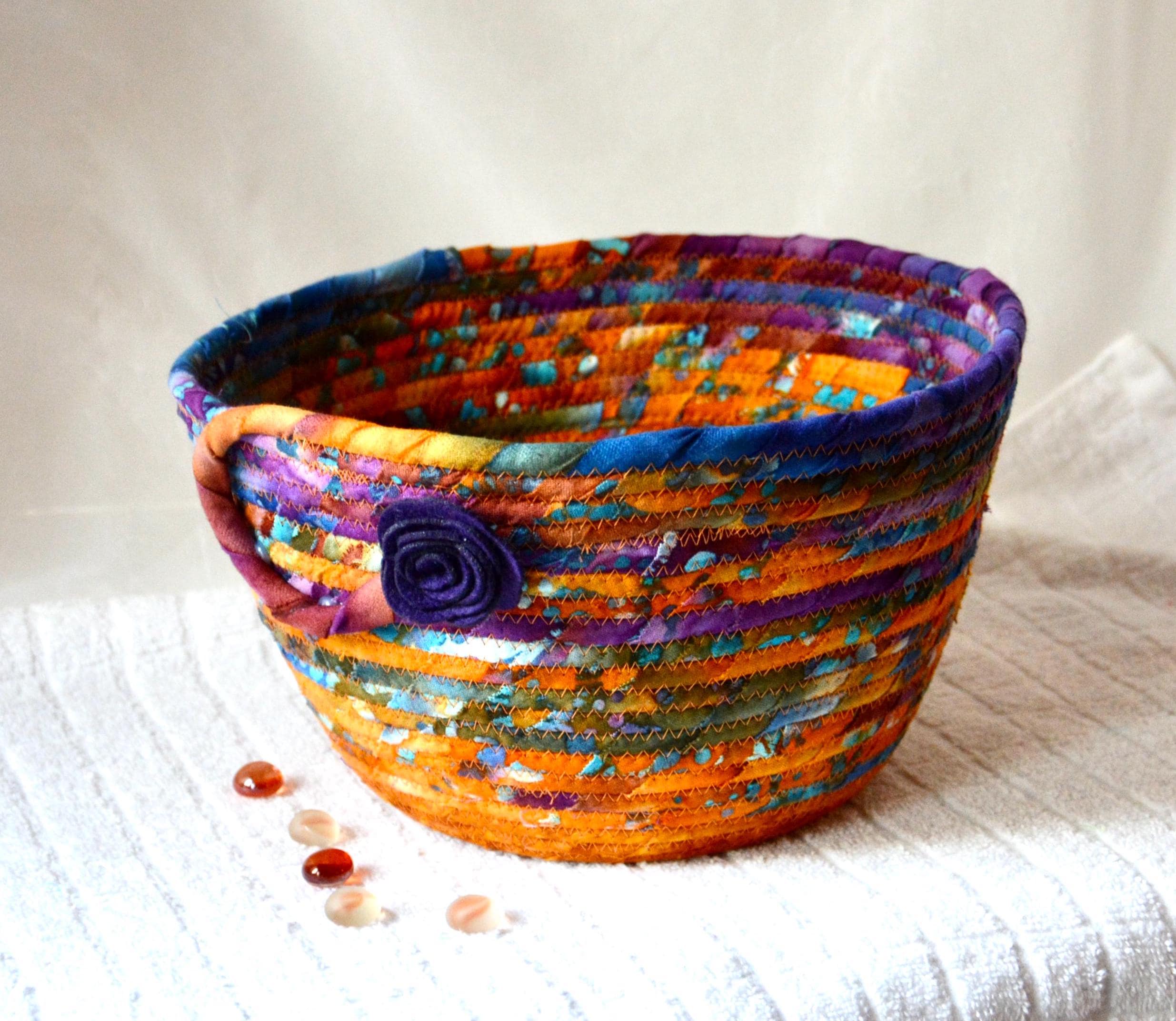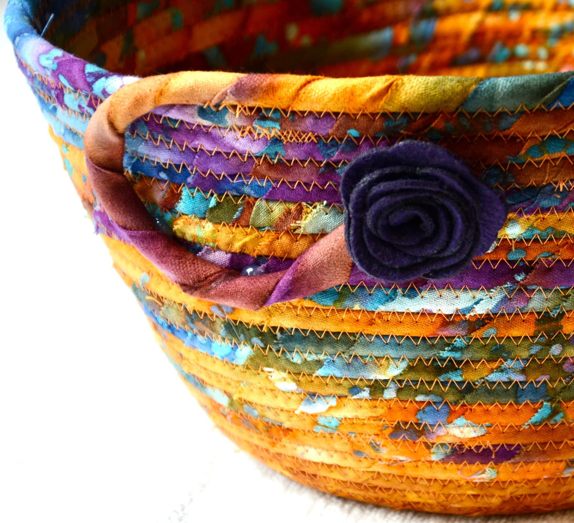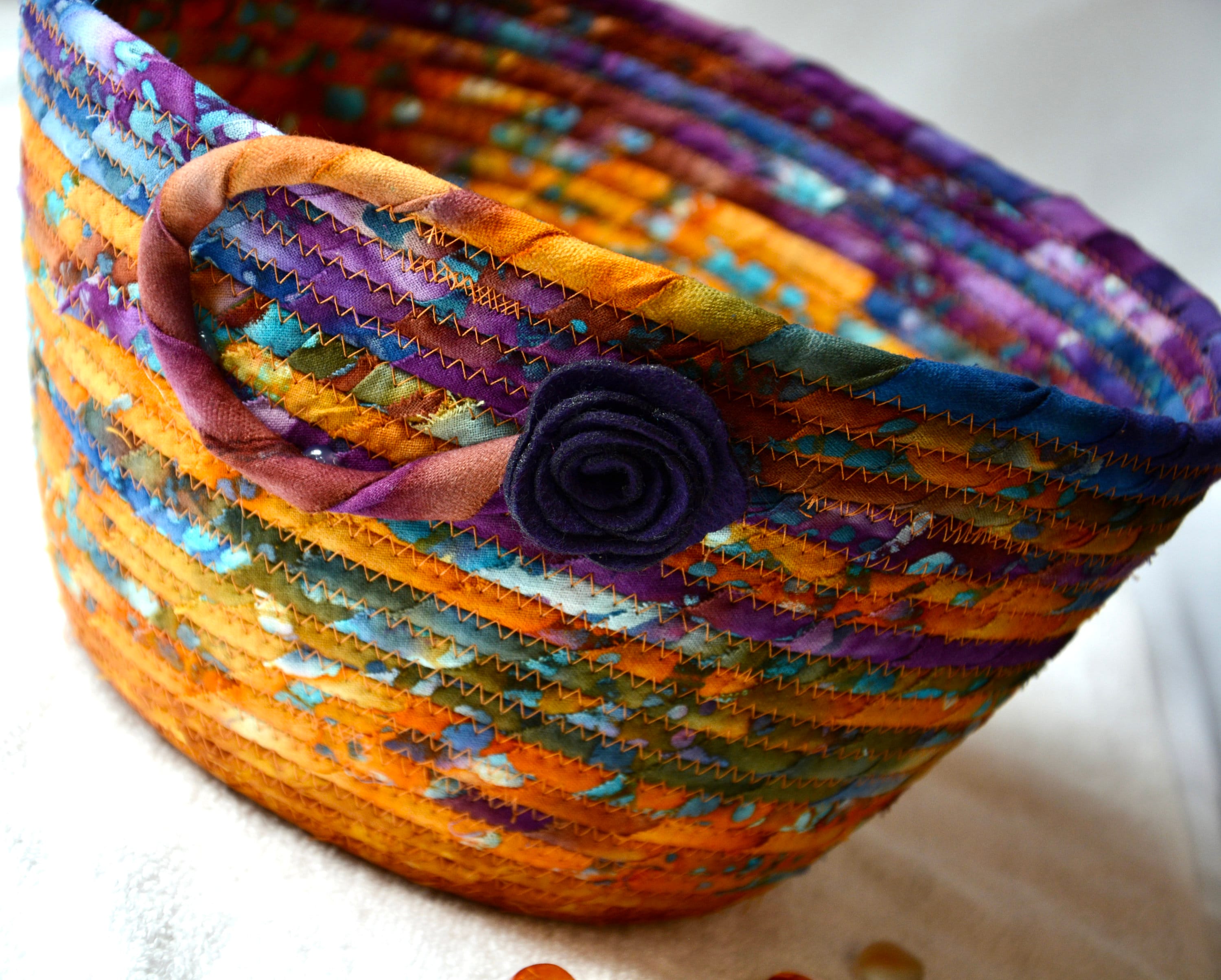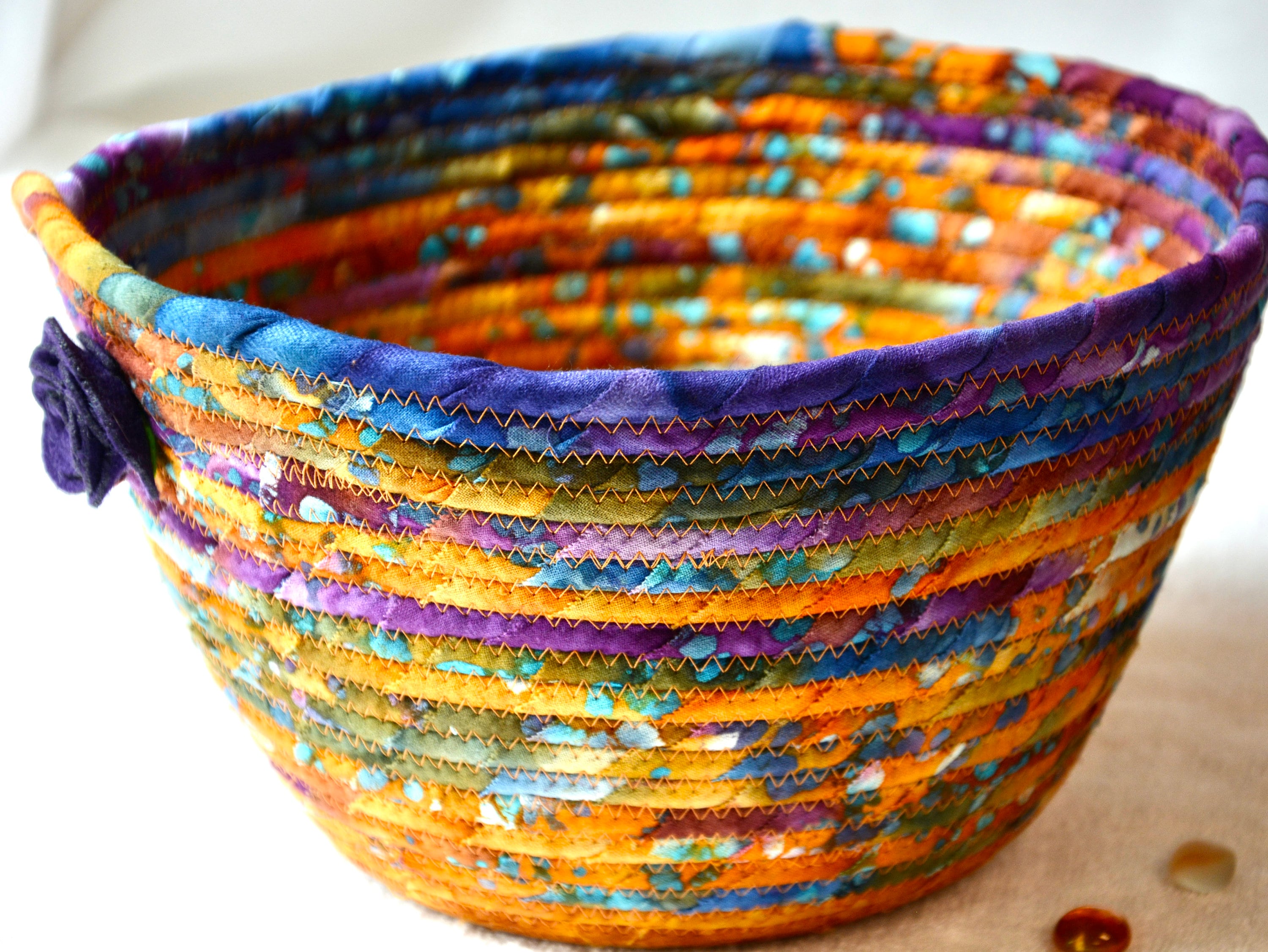 I hand wrapped these wonderful batik fabrics around cotton line, which I then hand coiled and machine quilted to make it sturdy. I used the raw edge technique with some fray to add a great shabby chic texture. The purple flower on the basket is included for a nice accent. This is a high quality 100% cotton fabric and it shows on the inside too!