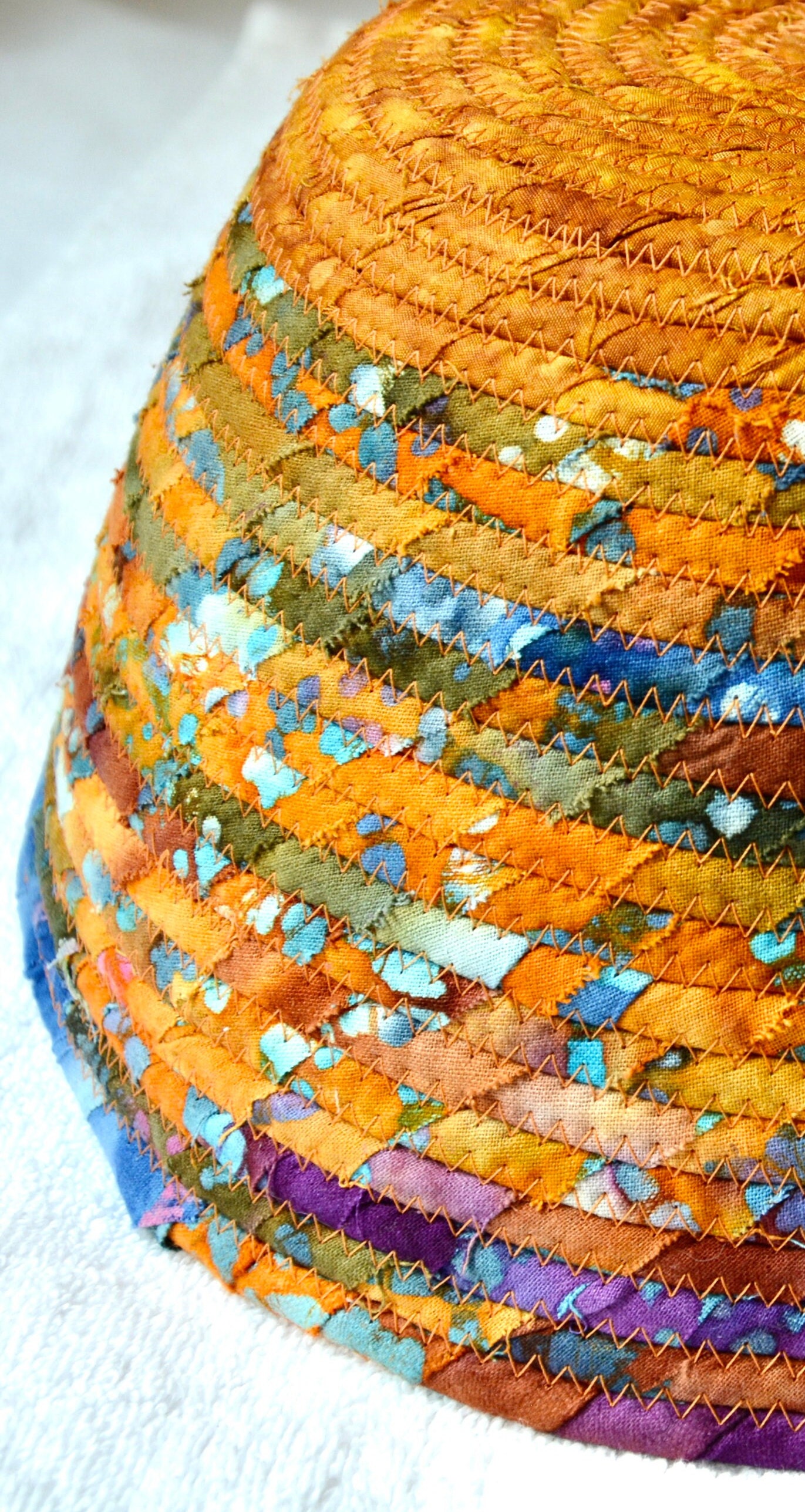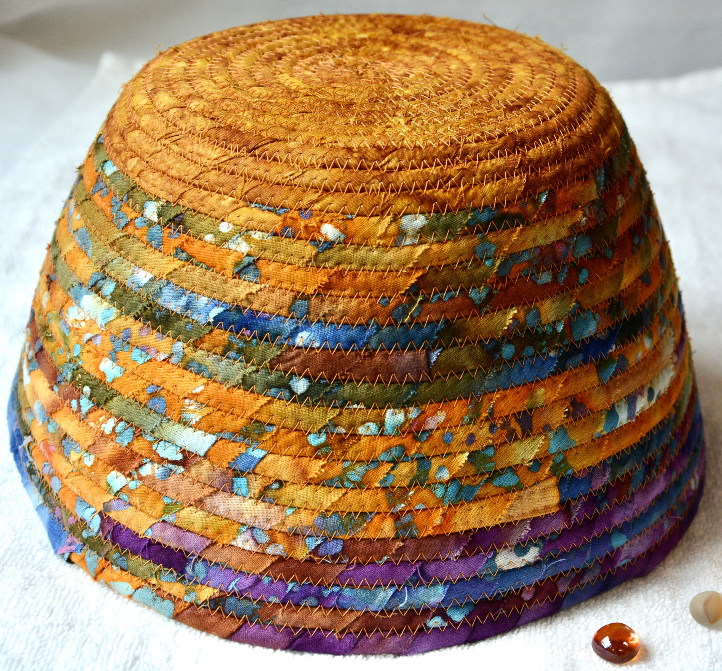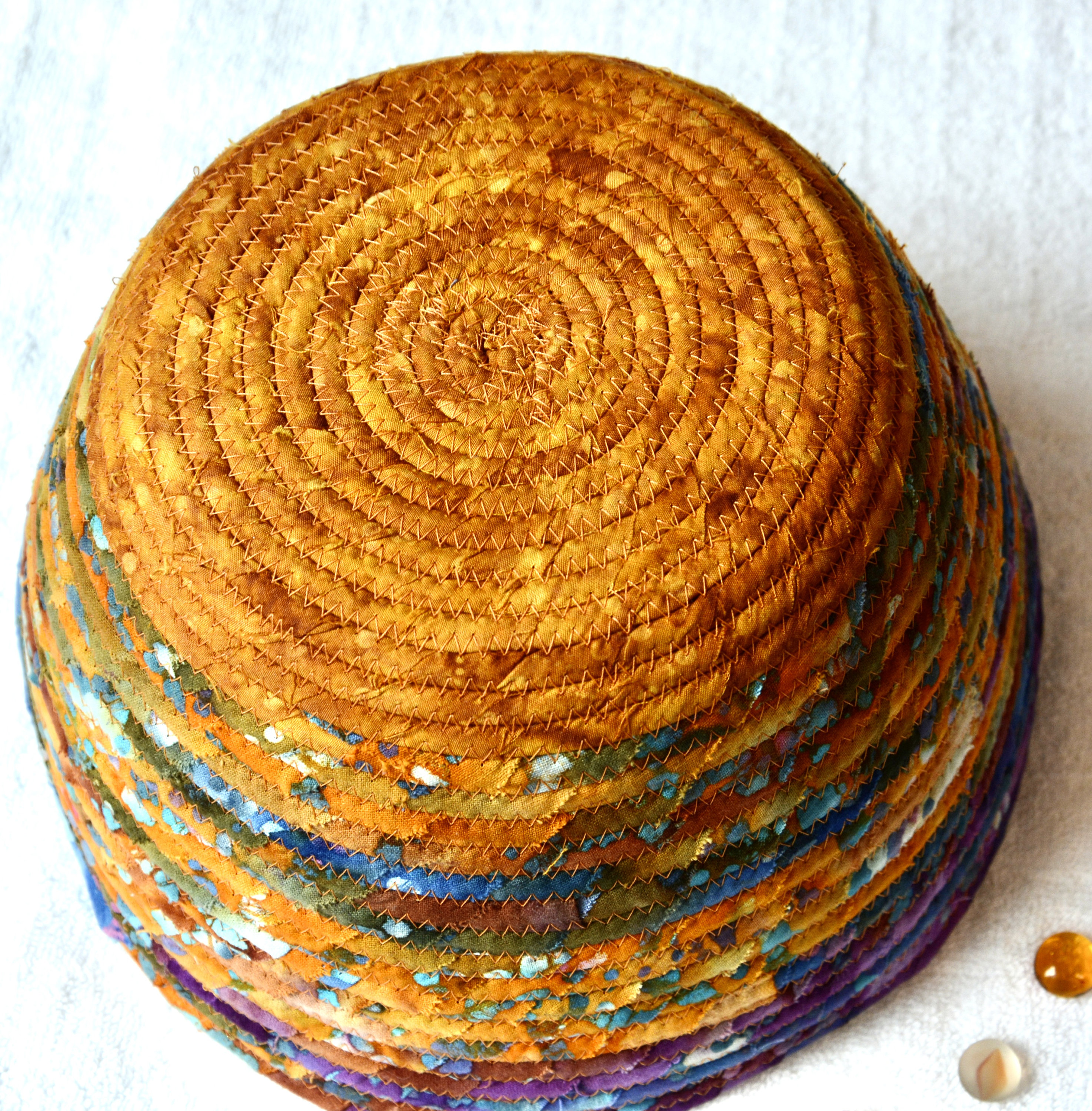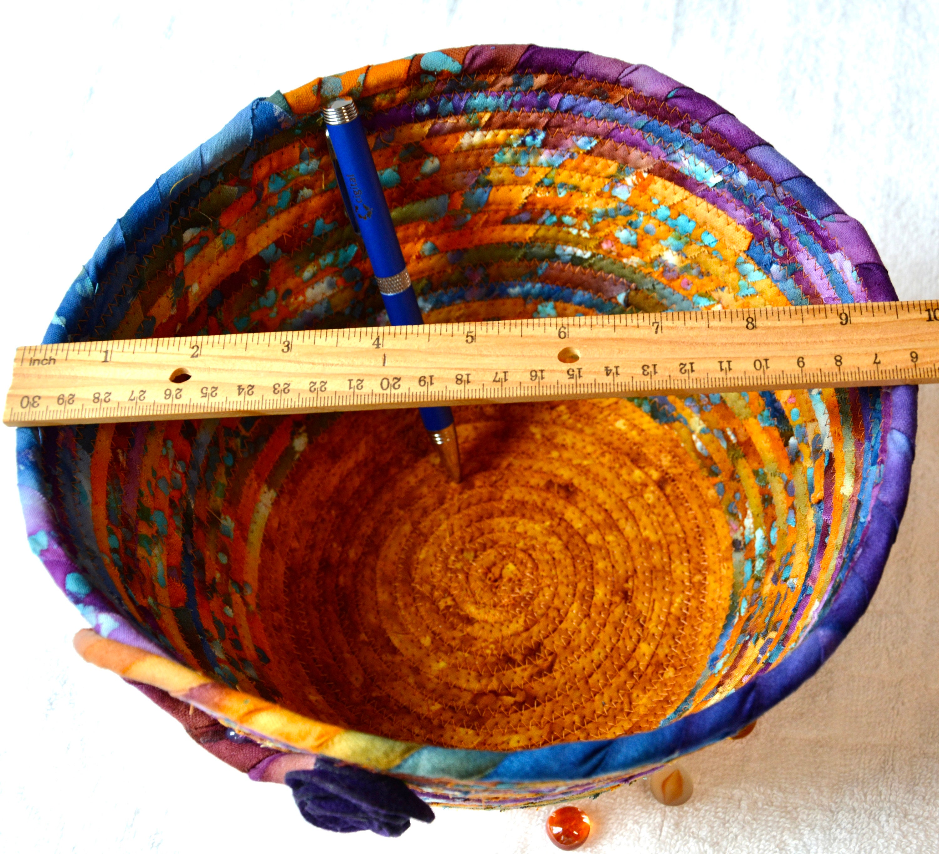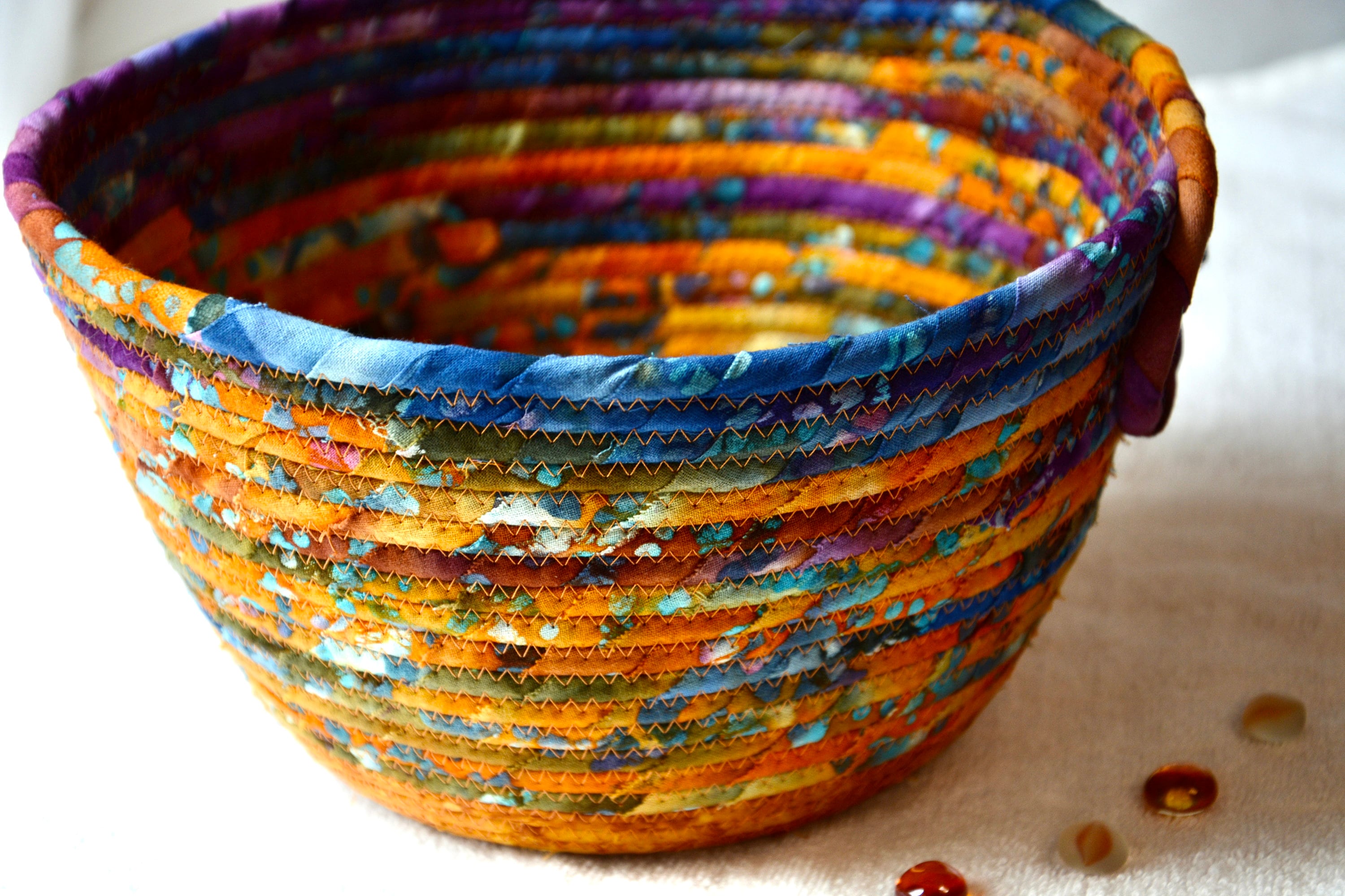 I hand wrapped these wonderful batik fabrics around cotton line, which I then hand coiled and machine quilted to make it sturdy. I used the raw edge technique with some fray to add a great shabby chic texture. The purple flower on the basket is included for a nice accent. This is a high quality 100% cotton fabric and it shows on the inside too!