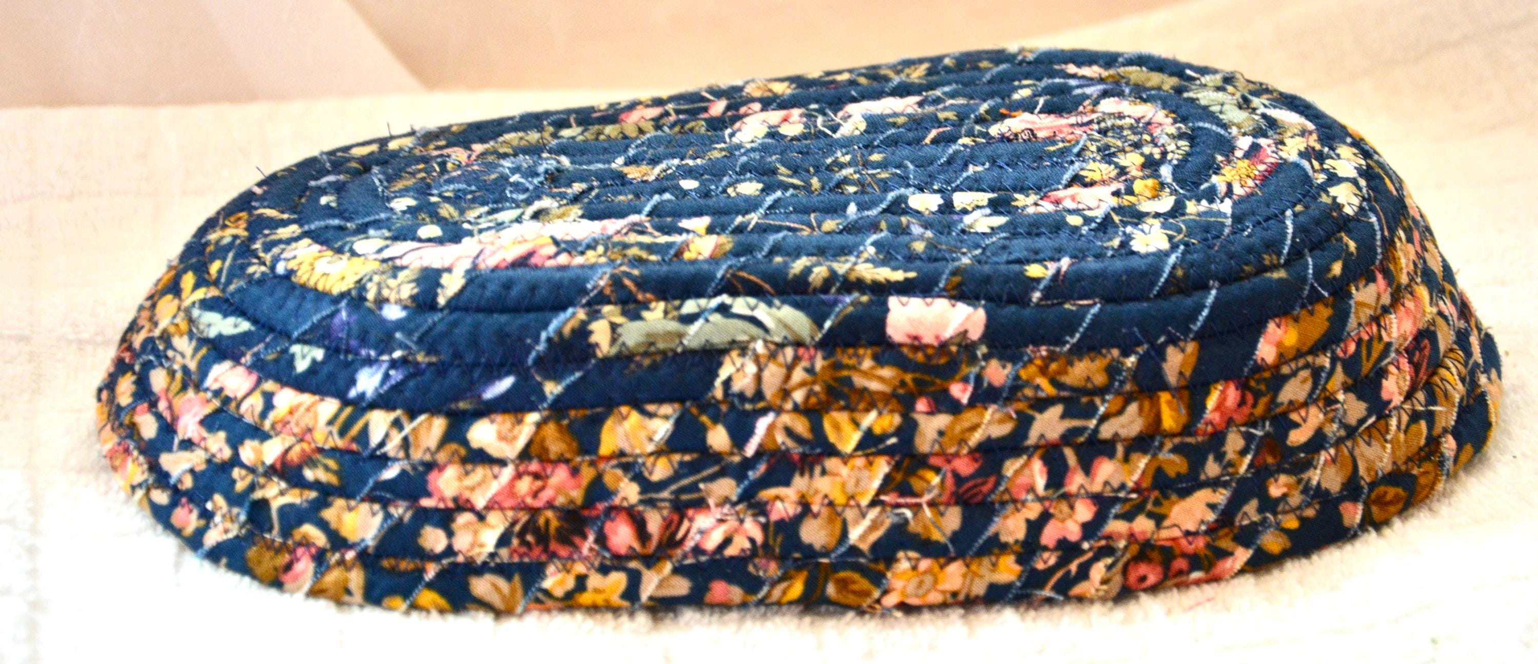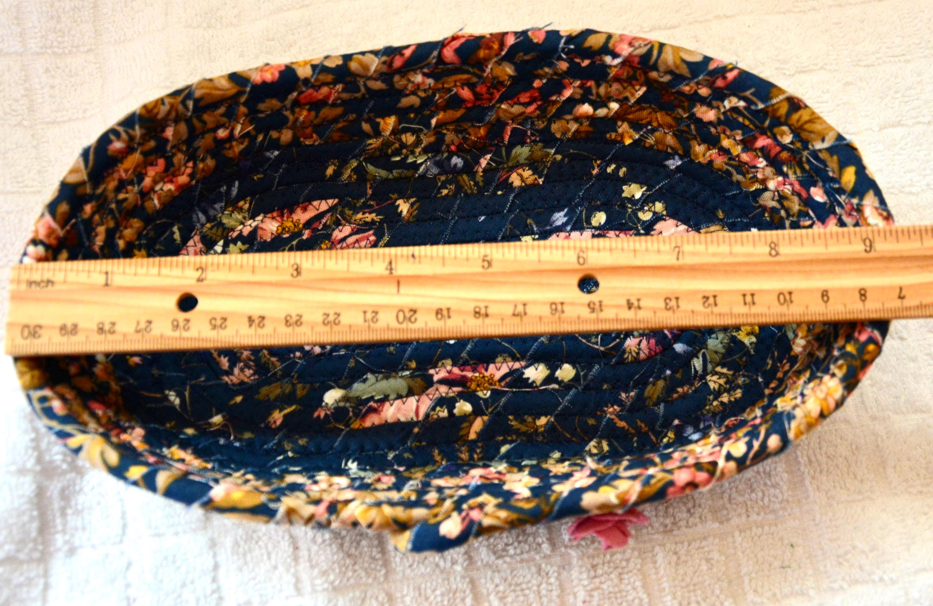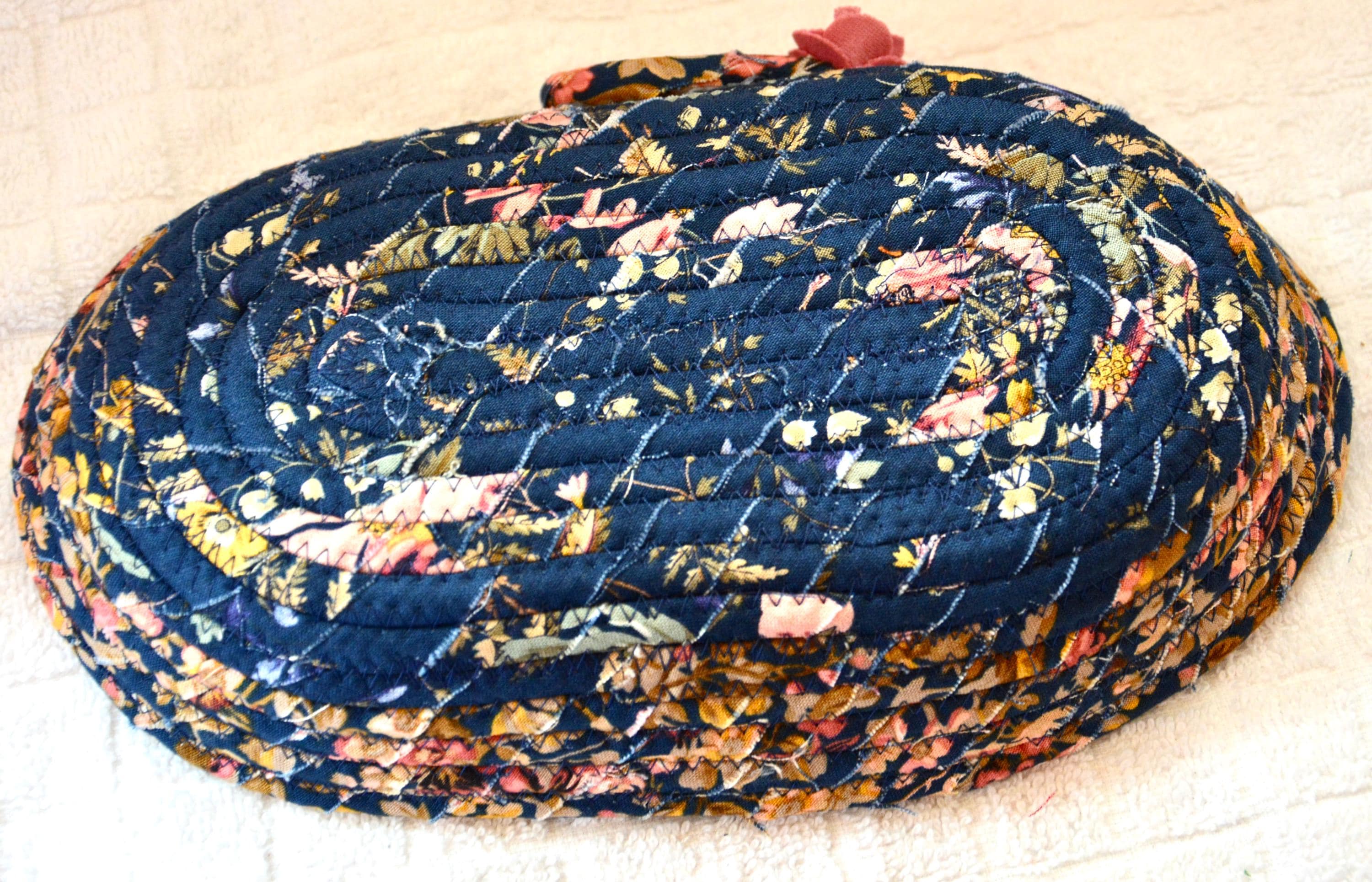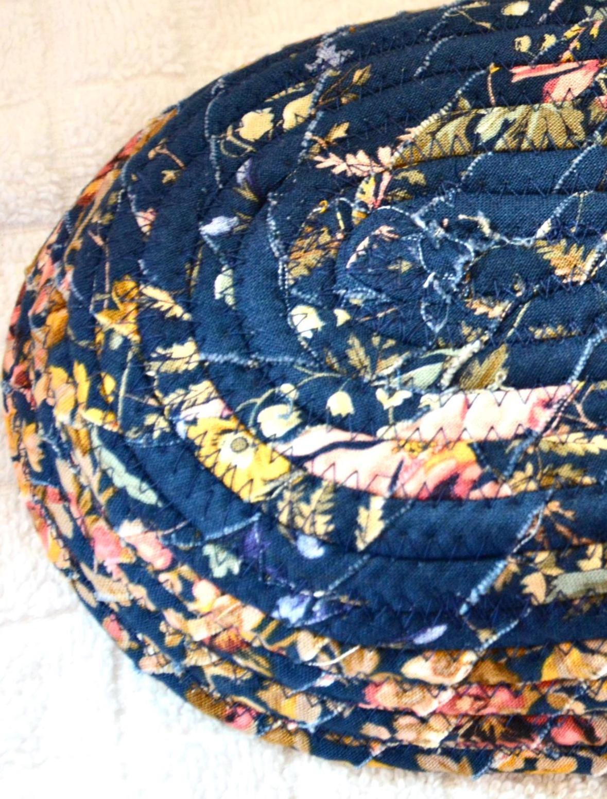 I hand wrapped this wonderful floral fabric around cotton line, which I then hand coiled and machine quilted to make it sturdy. I used the raw edge technique with a little fray for a great shabby chic texture. This rich fabric shows on the inside too! 100% cotton! I added a lovely navy blue floral fabric to the base for contrast.