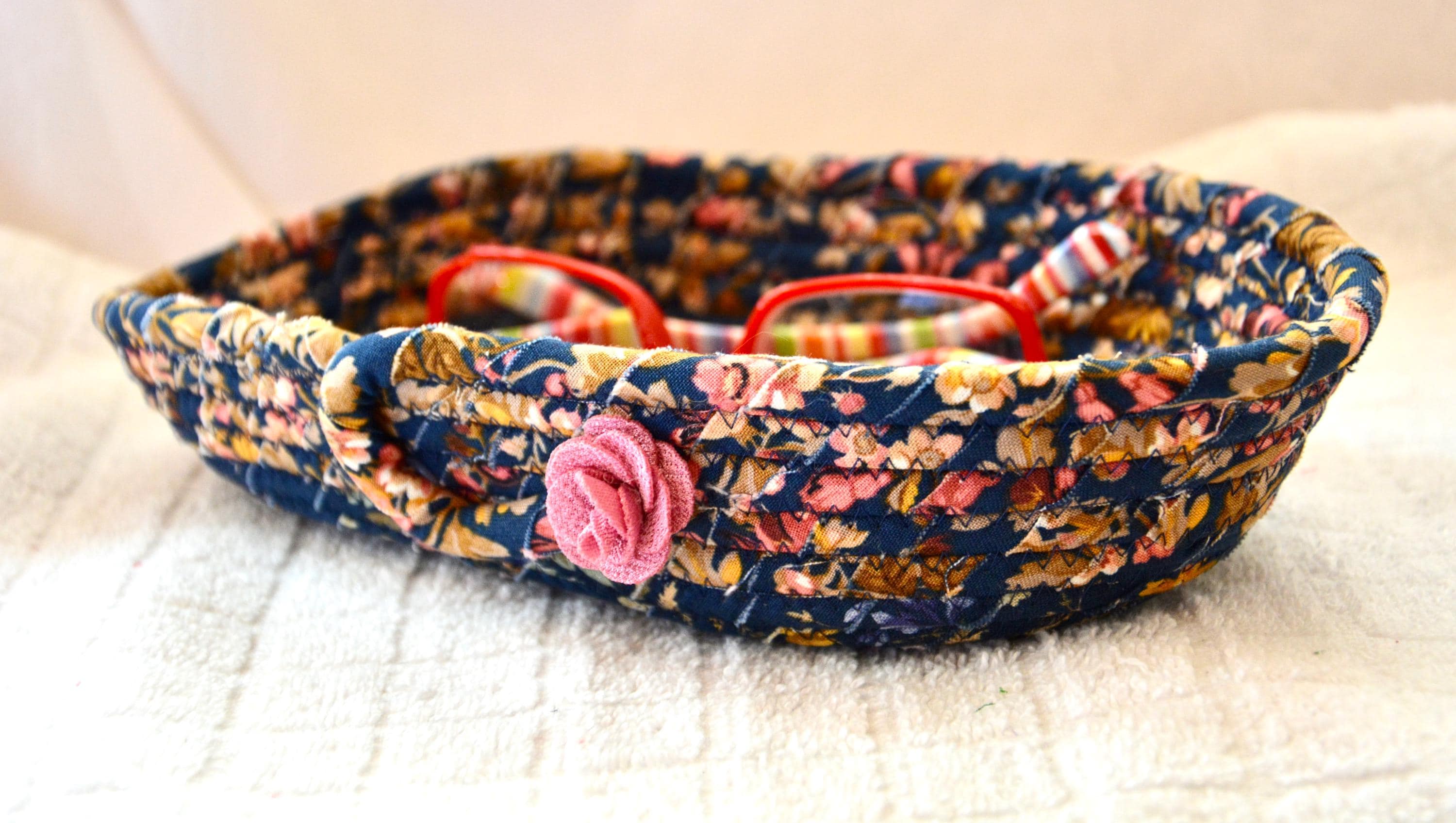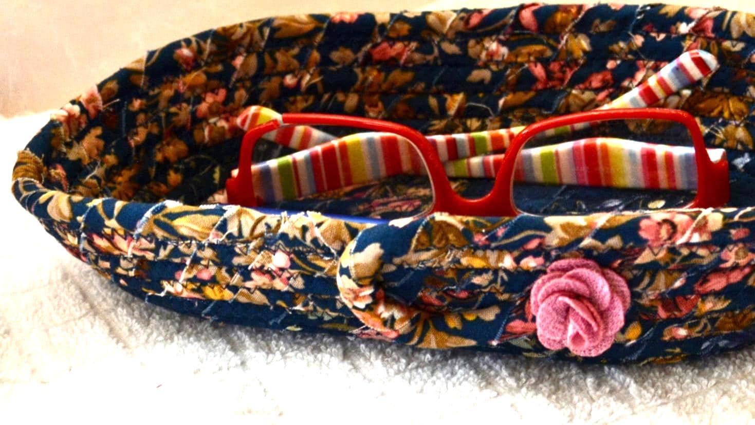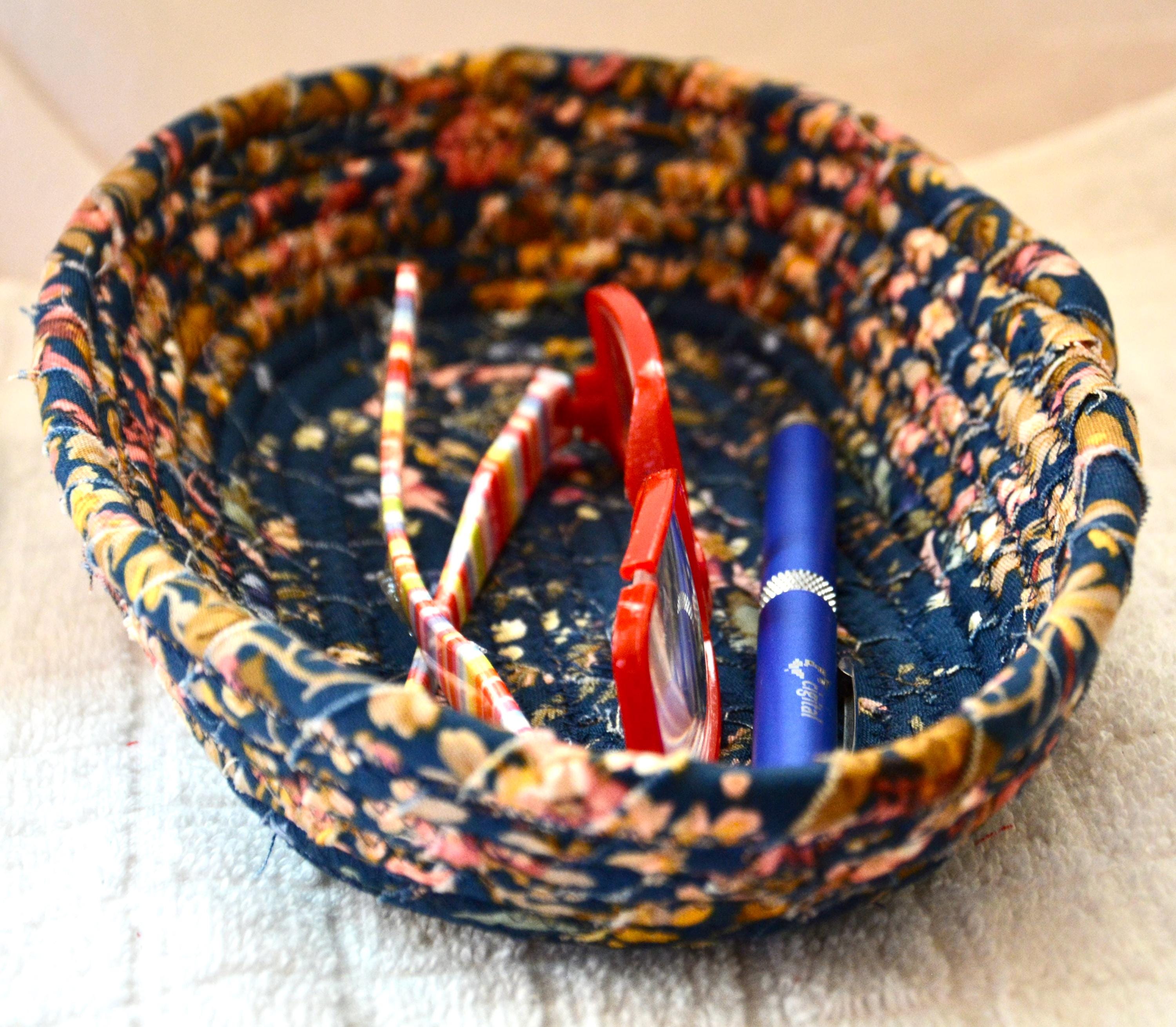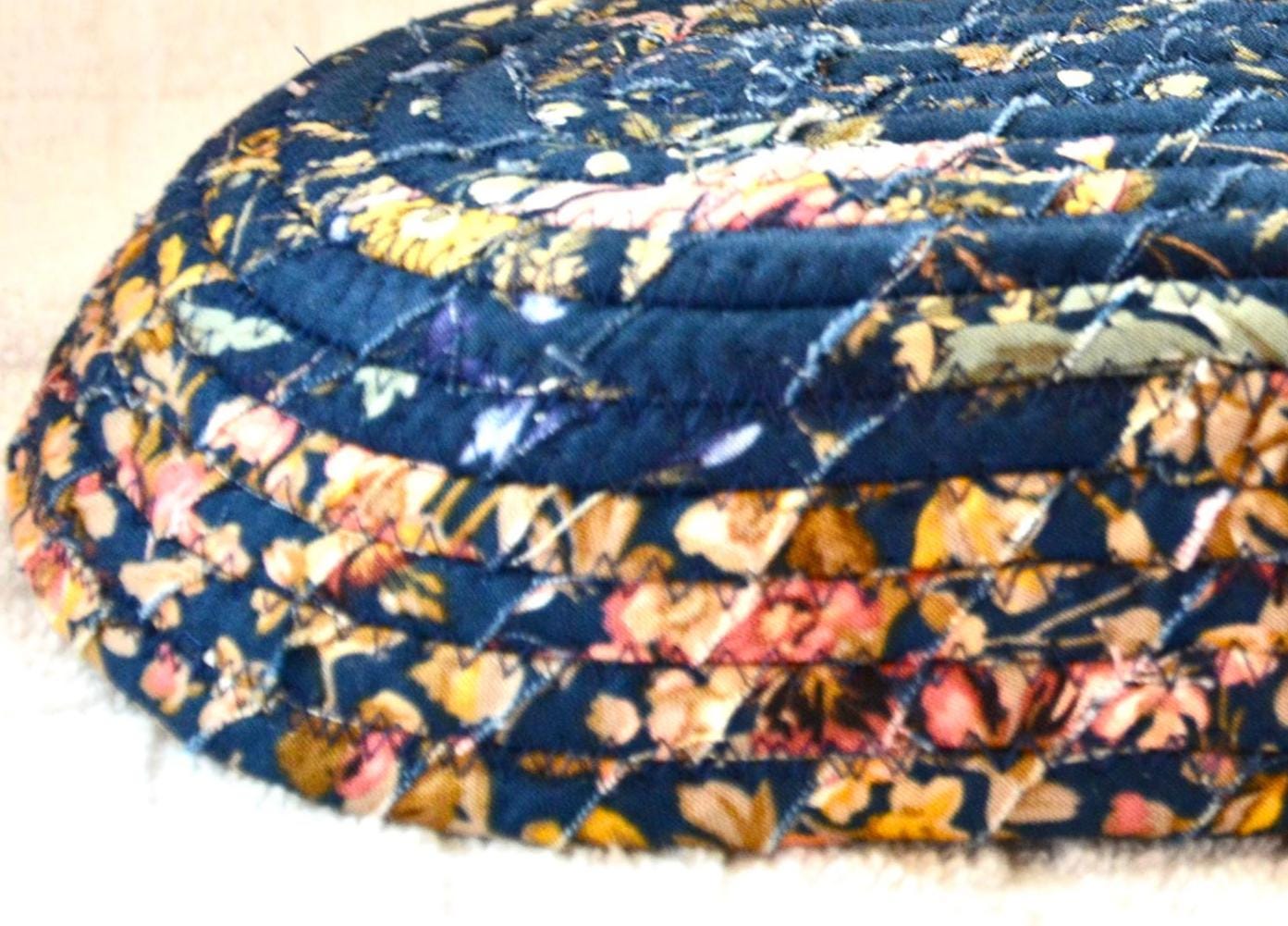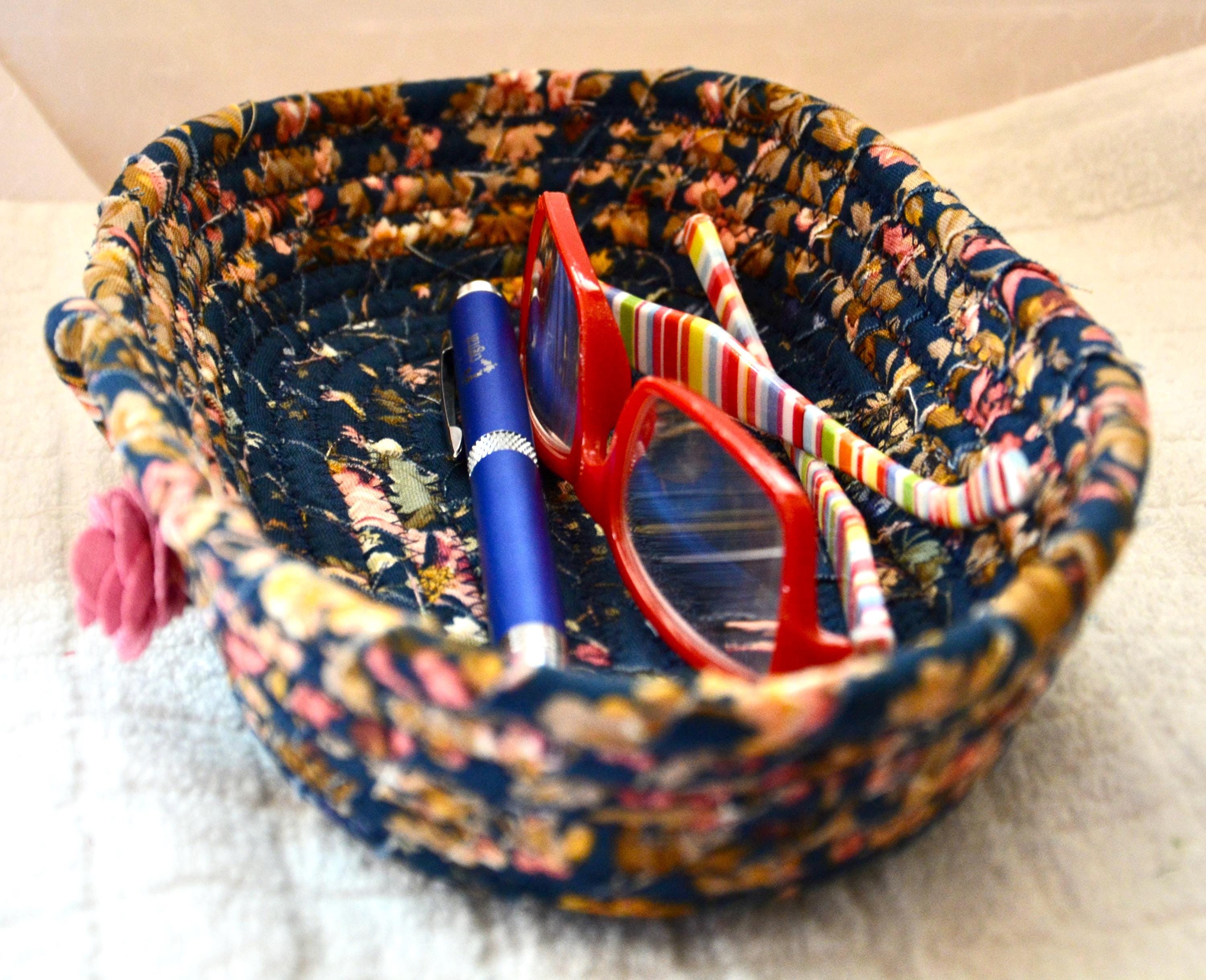 I hand wrapped this wonderful floral fabric around cotton line, which I then hand coiled and machine quilted to make it sturdy. I used the raw edge technique with a little fray for a great shabby chic texture. This rich fabric shows on the inside too! 100% cotton! I added a lovely navy blue floral fabric to the base for contrast.