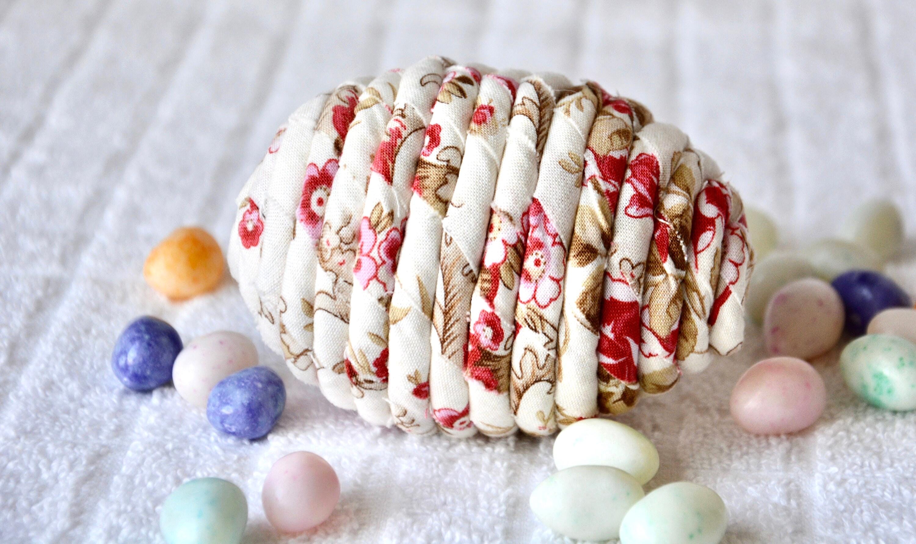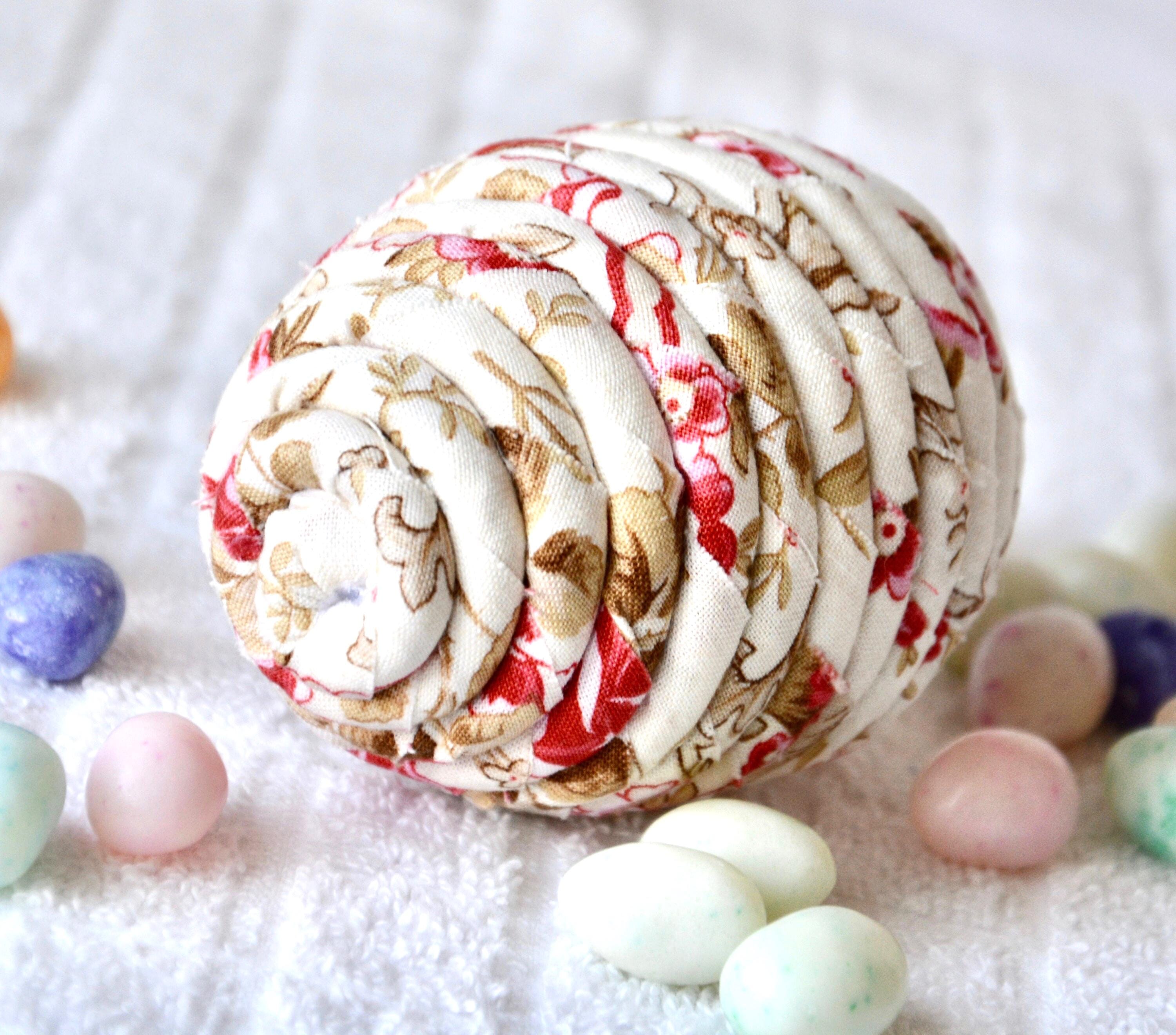 I hand wrapped this lovely Victorian Rose floral fabric around cotton line which I than hand coiled into an Easter Egg shape. The fabric edge is unfinished for a lovely shabby chic texture. I just love this pretty pink fabric, it created a unique pattern. I designed and created this lovely egg in my smoke free home studio. Color placement will vary. Bunny, jelly bean, ruler, candy props not included.