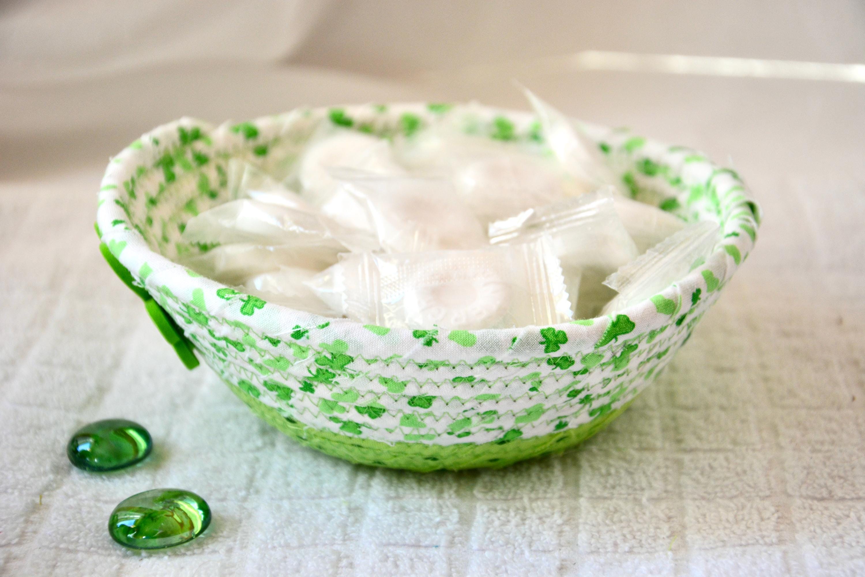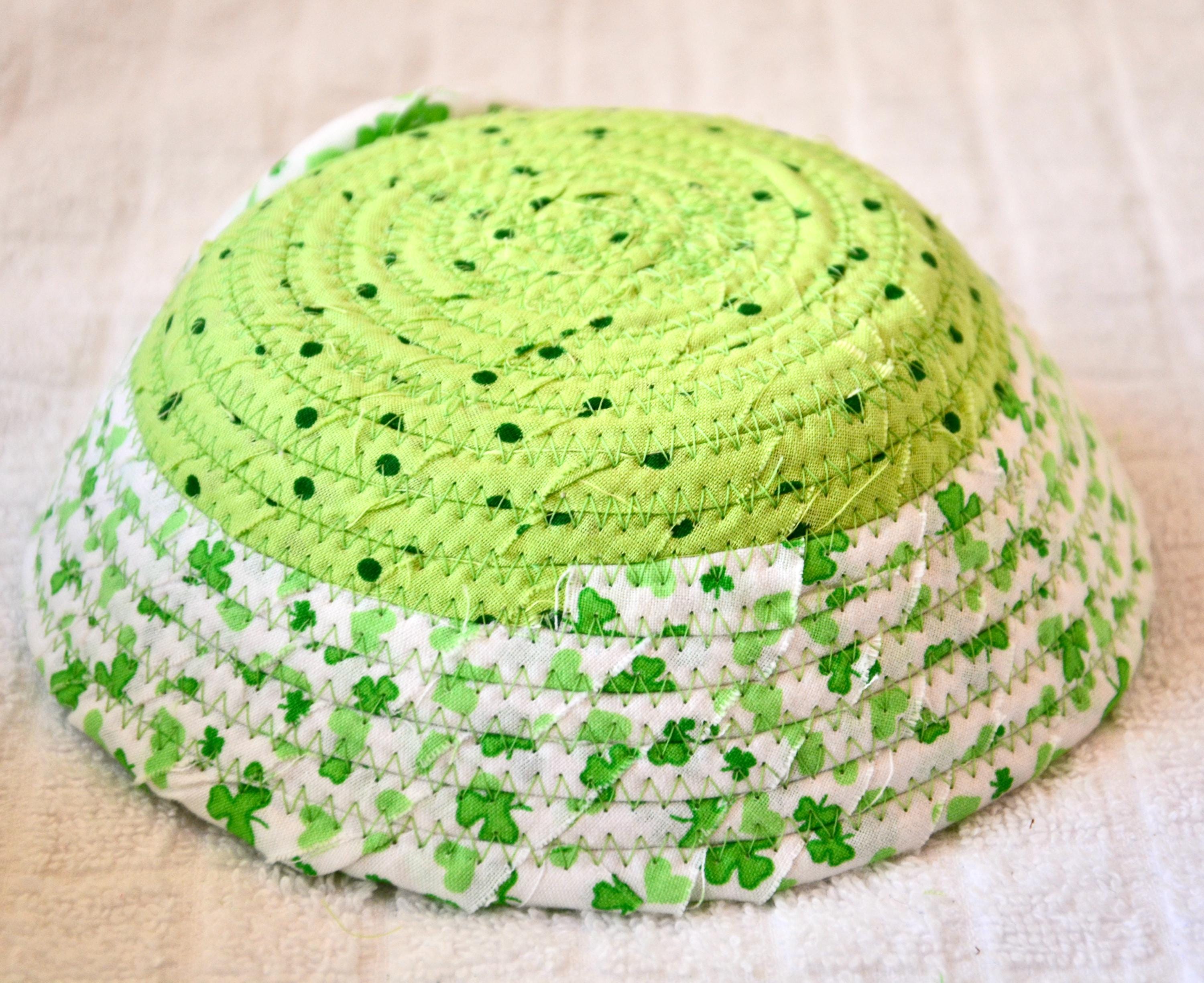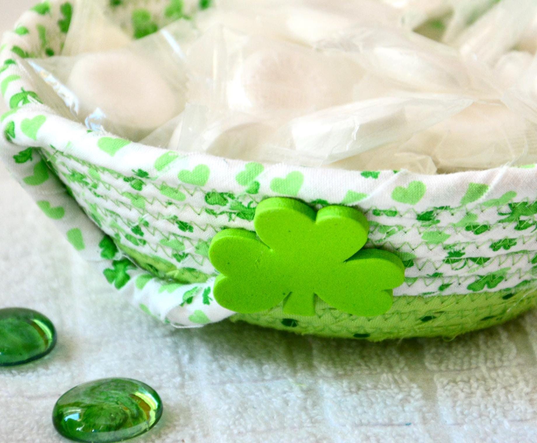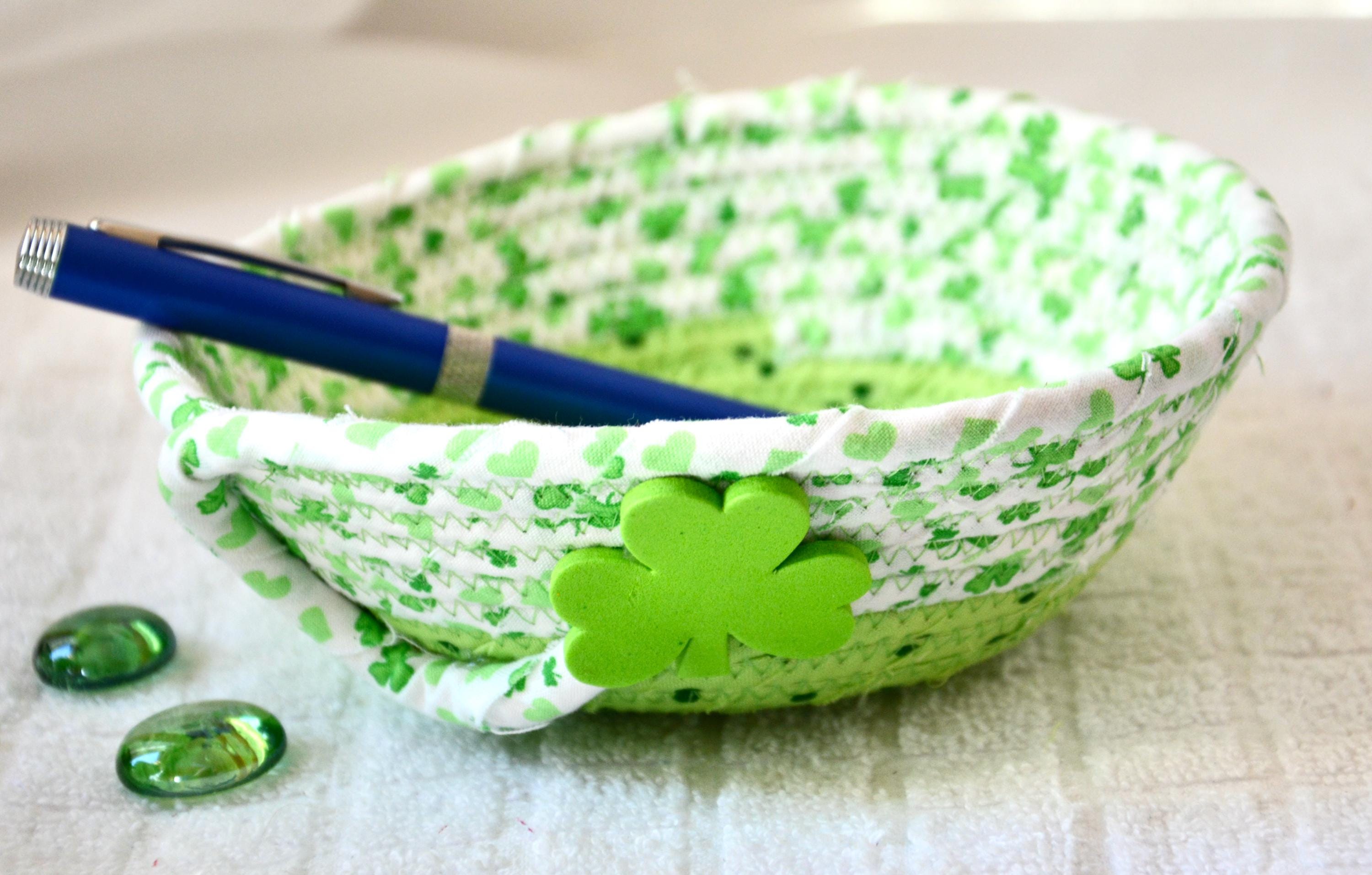 I hand wrapped high quality fabrics around cotton line, which I then hand coiled and machine quilted to make it sturdy. I used the raw edge technique with some fray. These fun fabrics show on the inside too!. The cute shamrock on the basket is included for a cute accent.