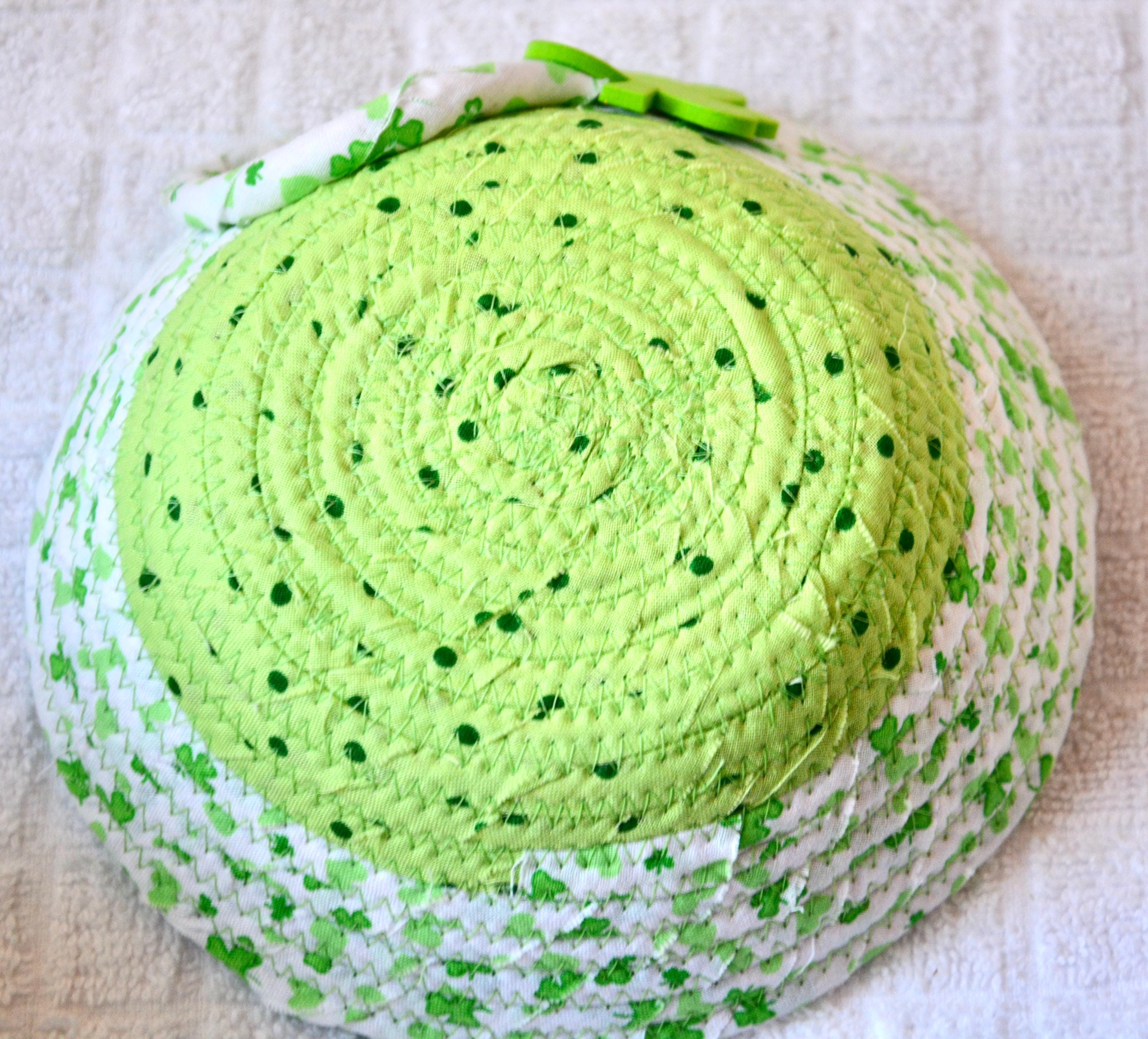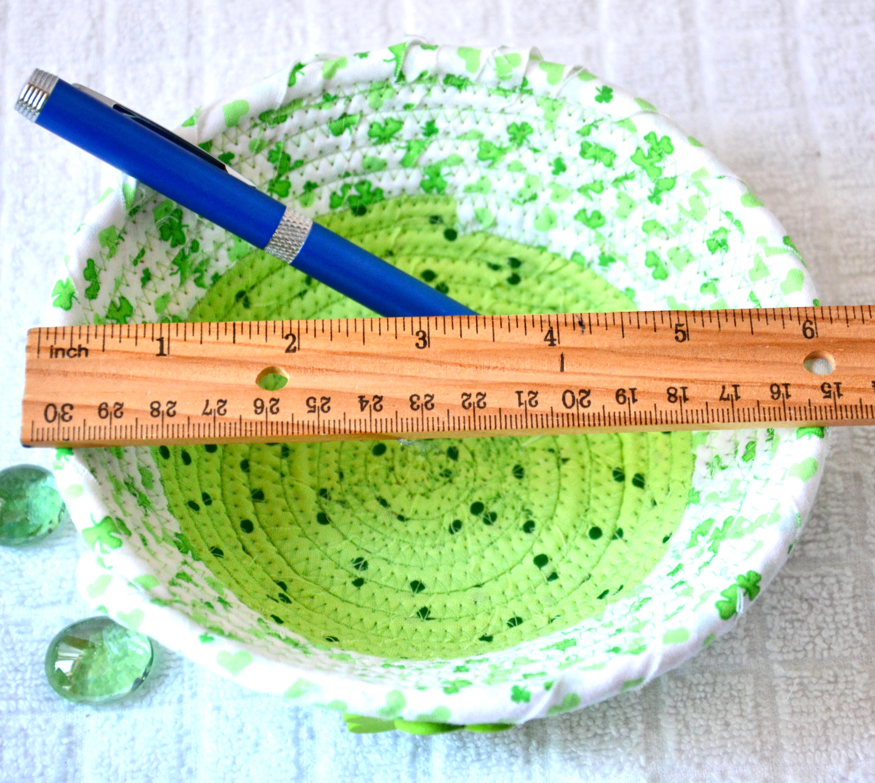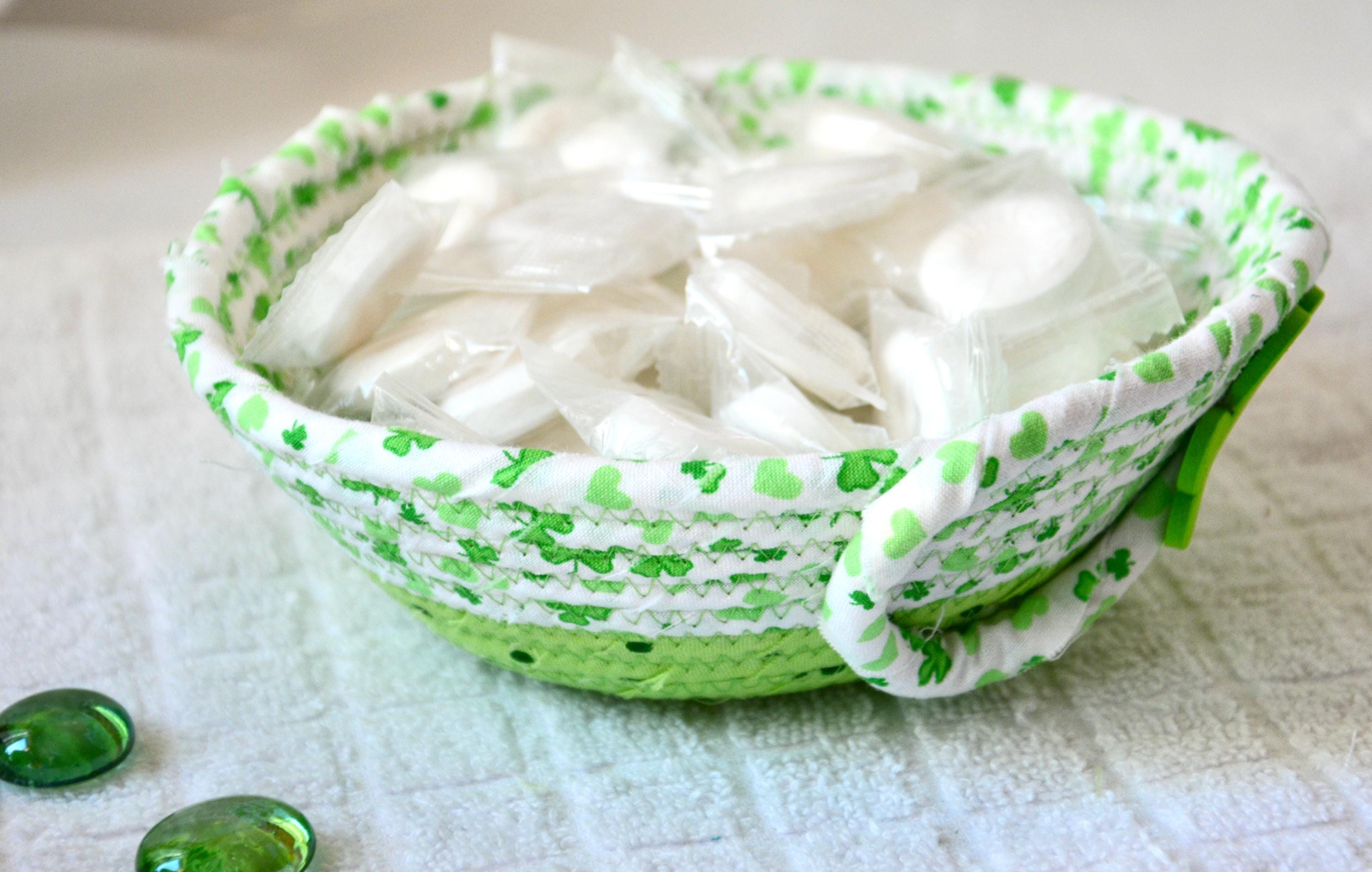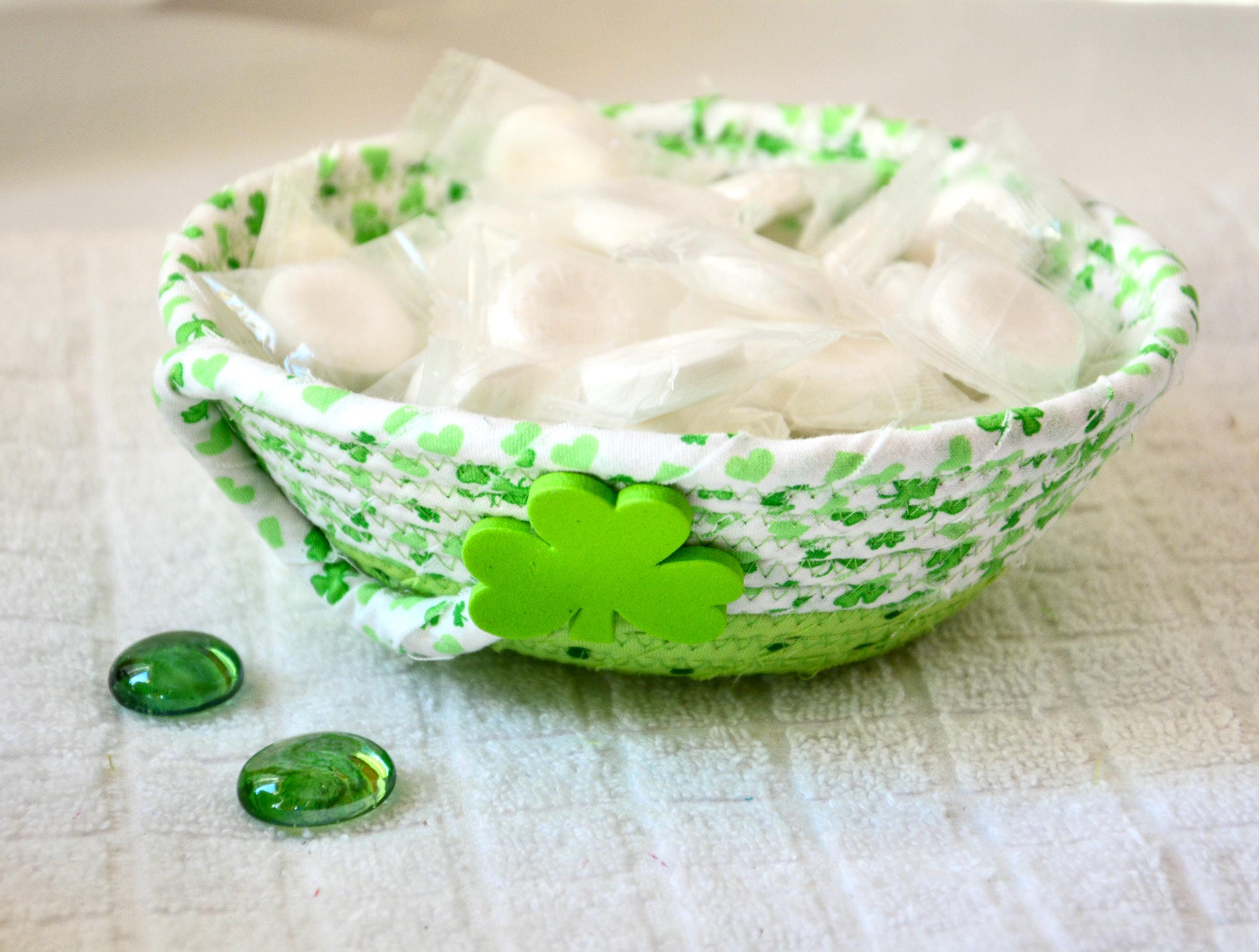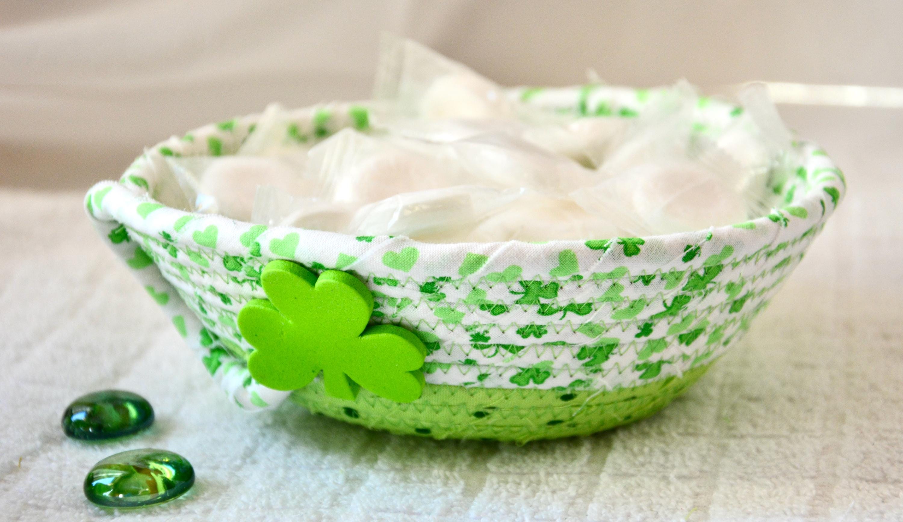 I hand wrapped high quality fabrics around cotton line, which I then hand coiled and machine quilted to make it sturdy. I used the raw edge technique with some fray. These fun fabrics show on the inside too!. The cute shamrock on the basket is included for a cute accent.