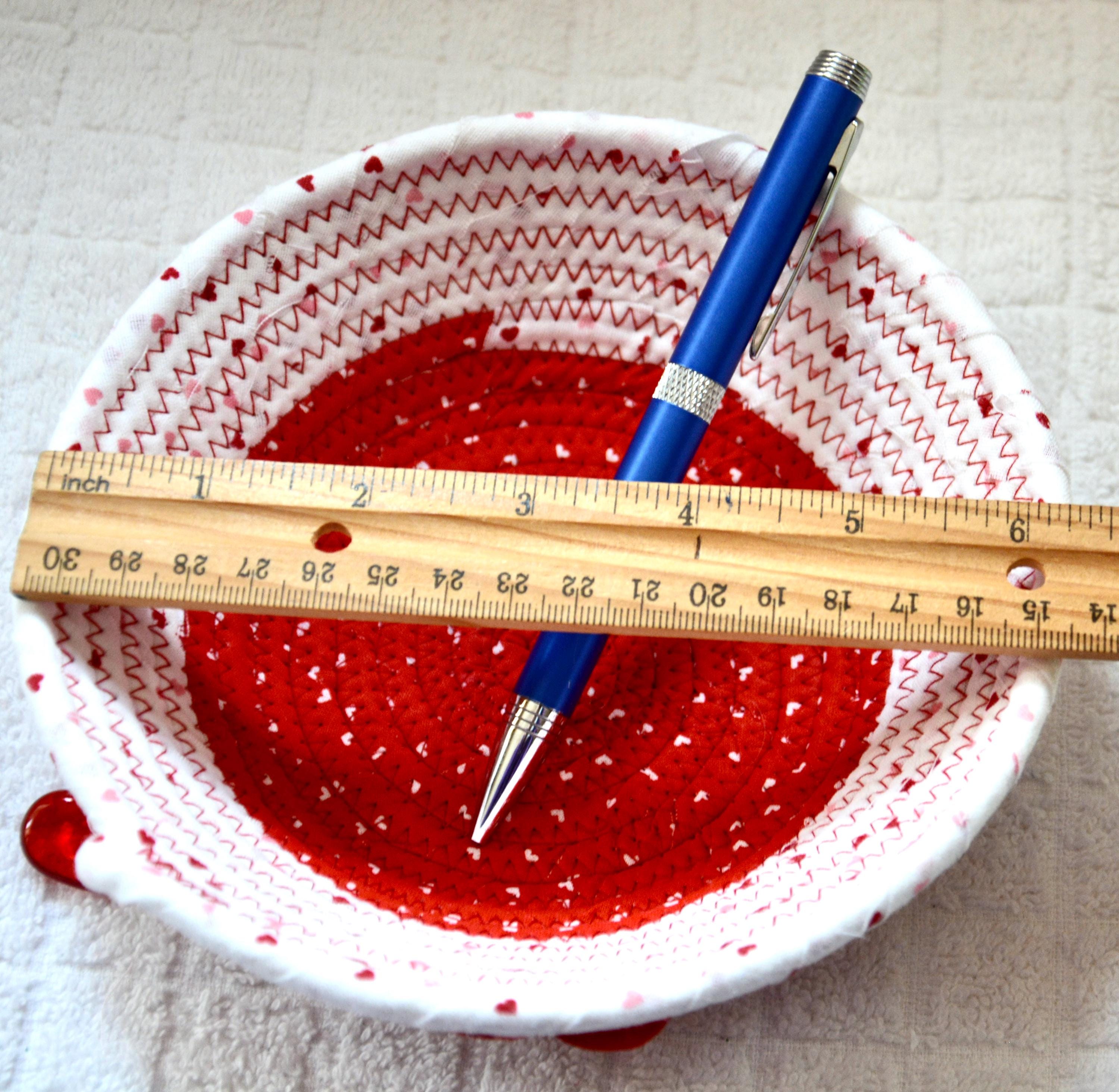 All of these cute fabrics are 100% cotton and show on the inside of the basket too! Please see the picture with the ruler to help gauge the size of this lovely basket. Ruler, heart, pen, bead, candy props not included. Spot clean.
