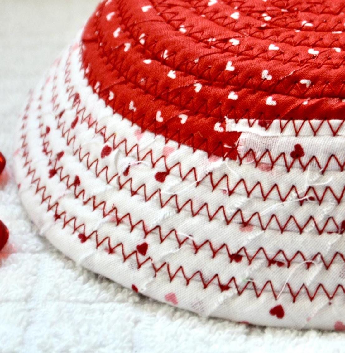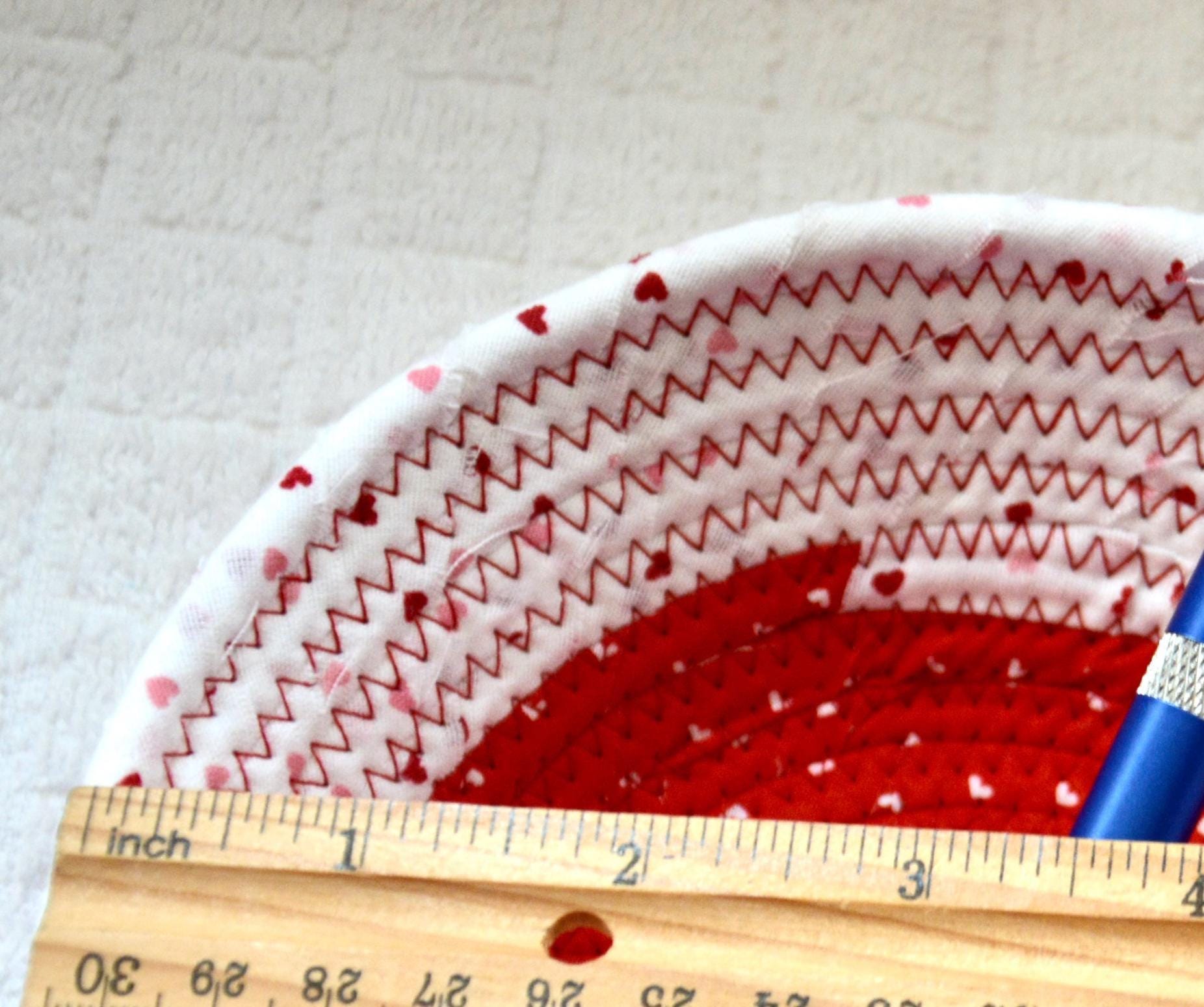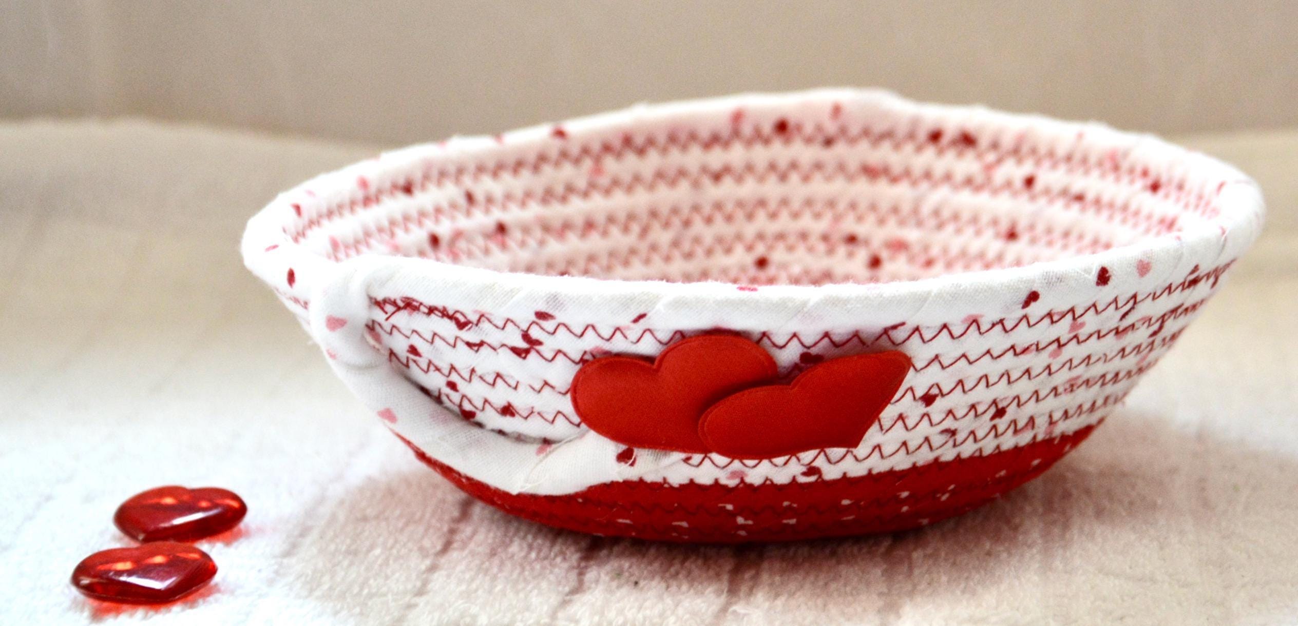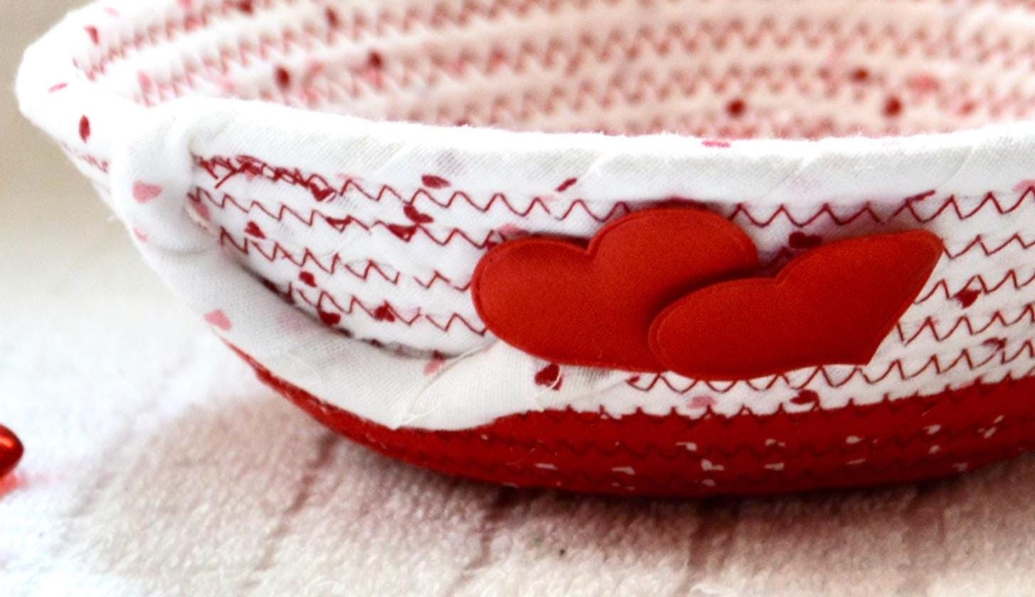 I hand wrapped these wonderful fabrics around cotton line, which I then hand coiled and machine quilted to make the basket sturdy. I used the raw edge technique with some fray to give it a lovely shabby chic texture. The cute hearts on the basket are included for a nice accent.