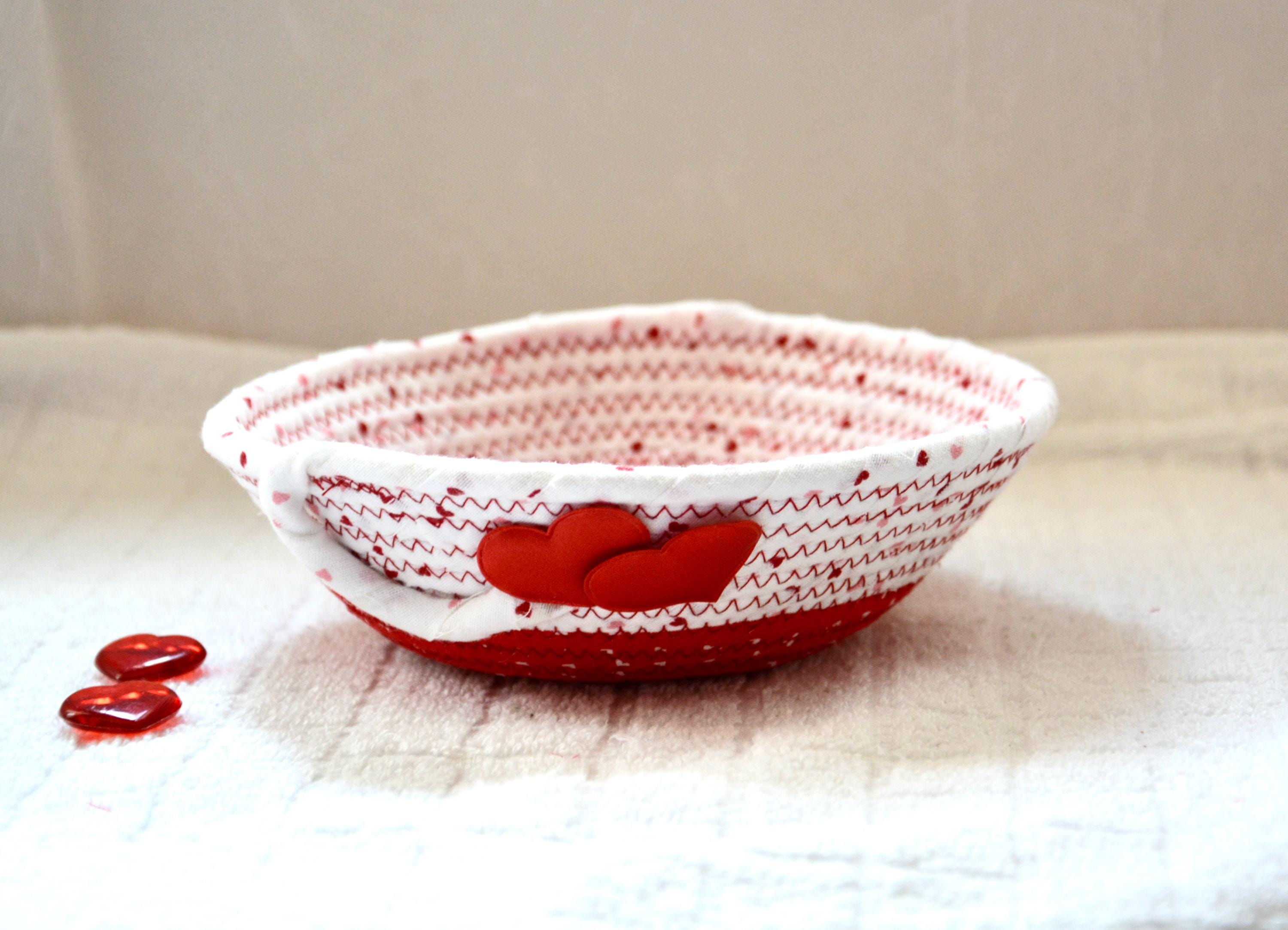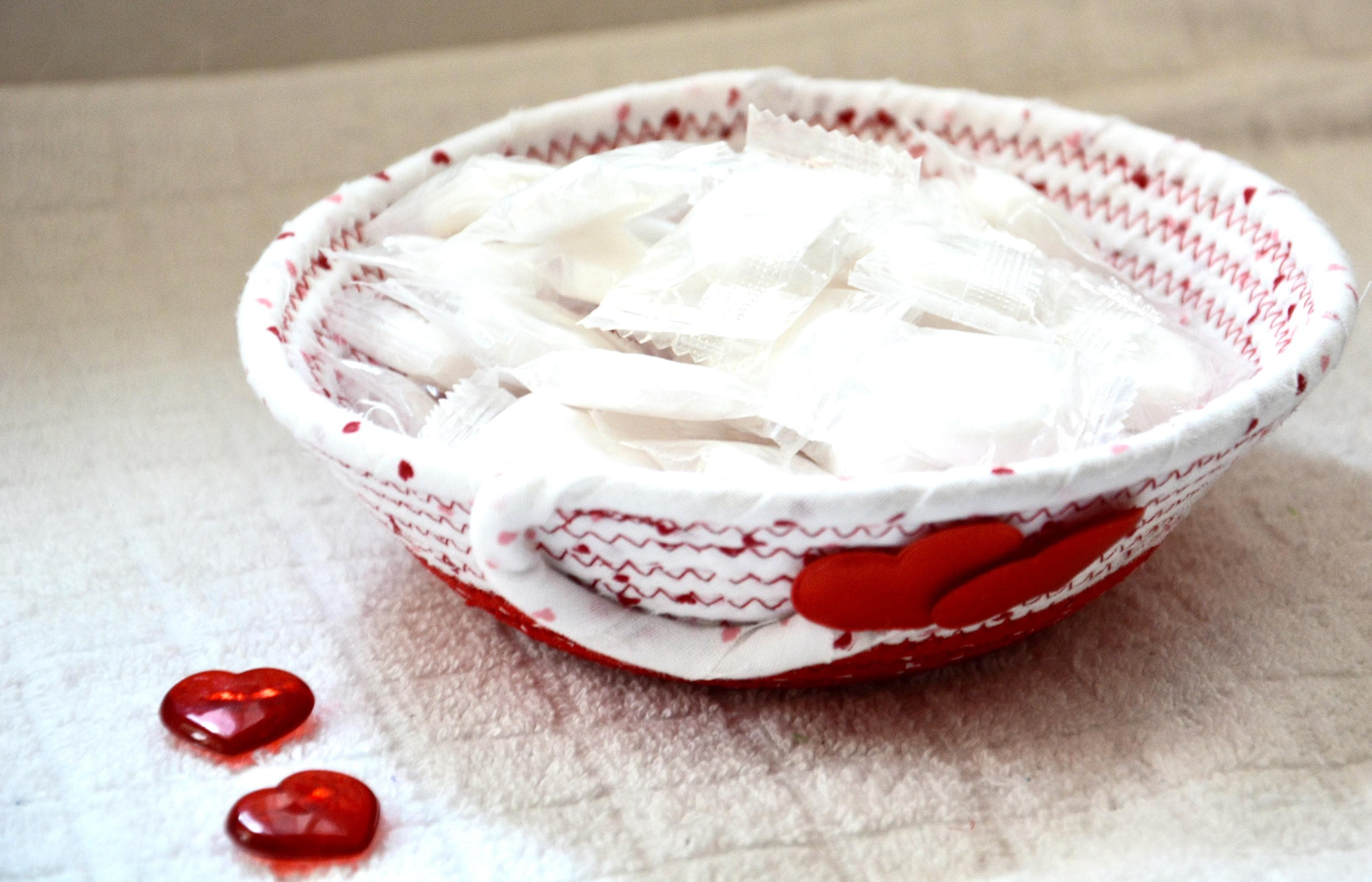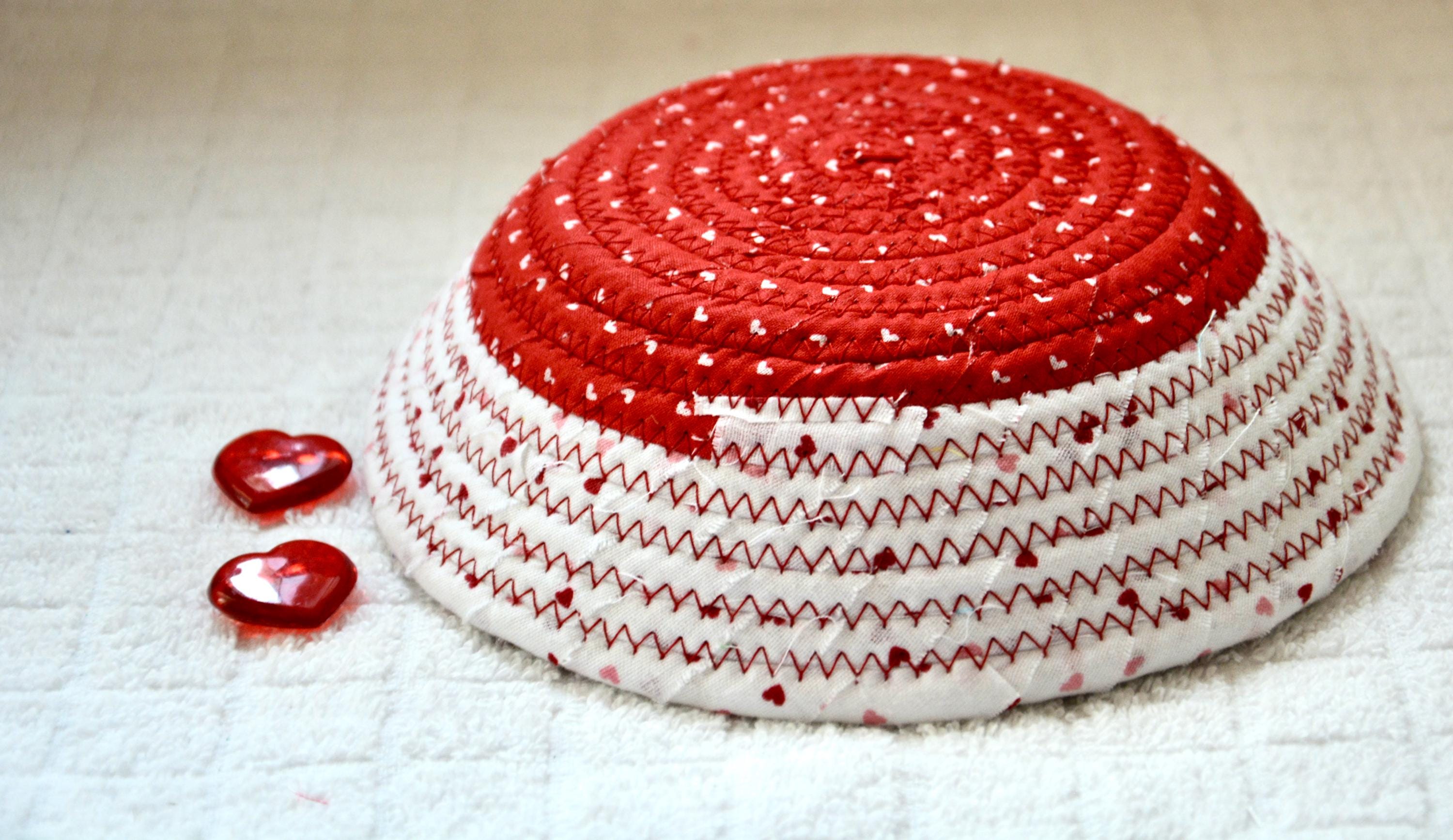 I hand wrapped these wonderful fabrics around cotton line, which I then hand coiled and machine quilted to make the basket sturdy. I used the raw edge technique with some fray to give it a lovely shabby chic texture. The cute hearts on the basket are included for a nice accent.