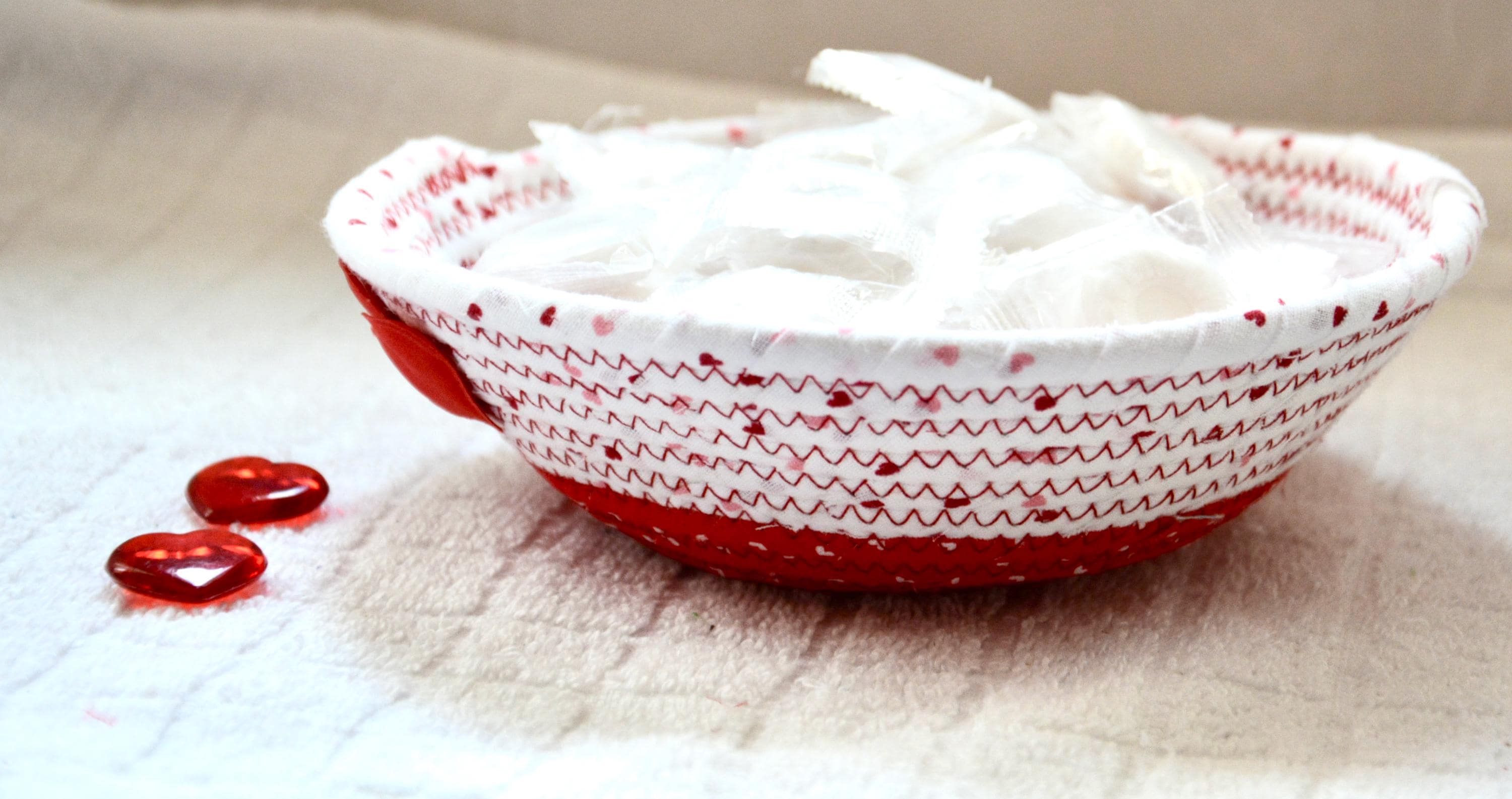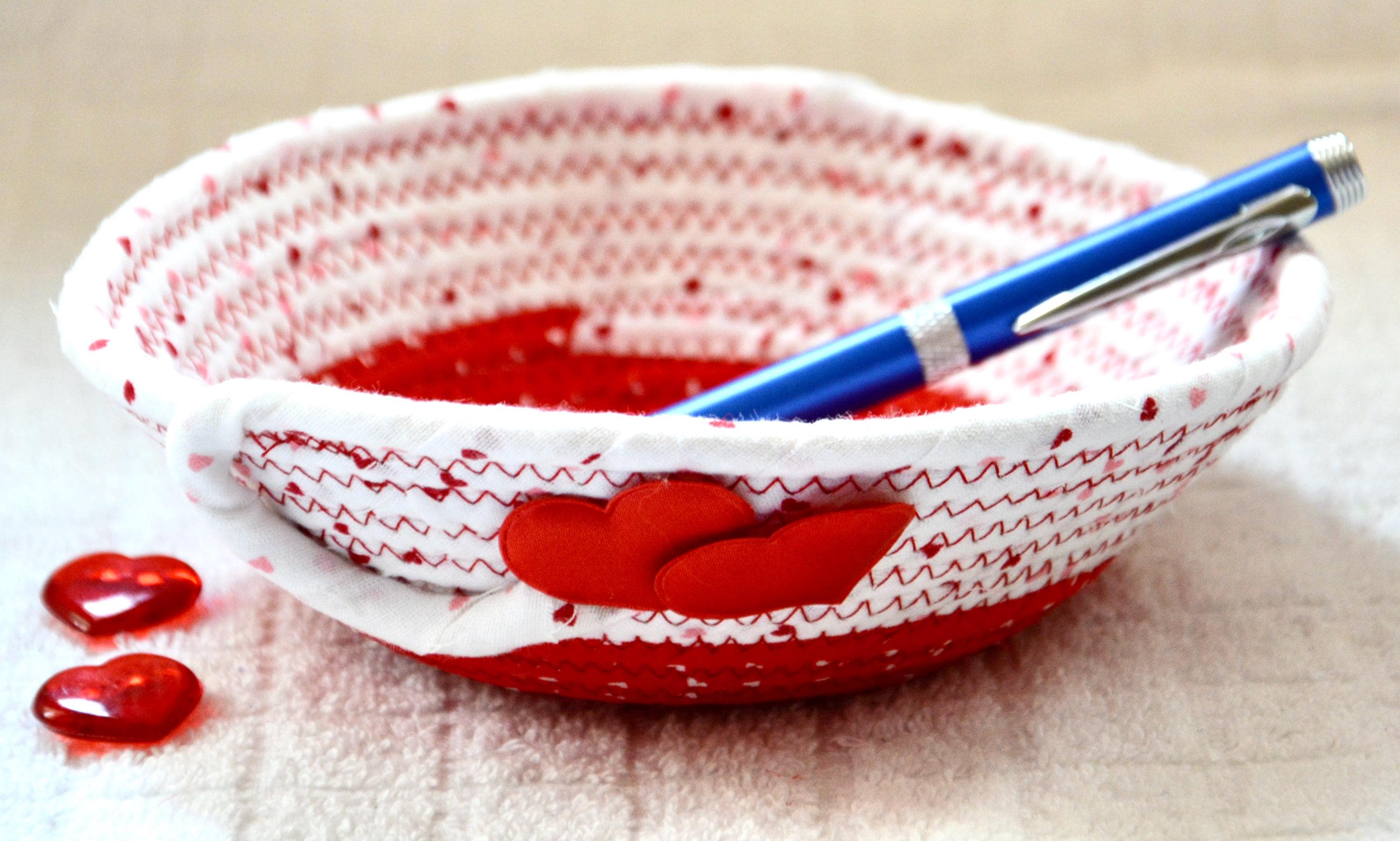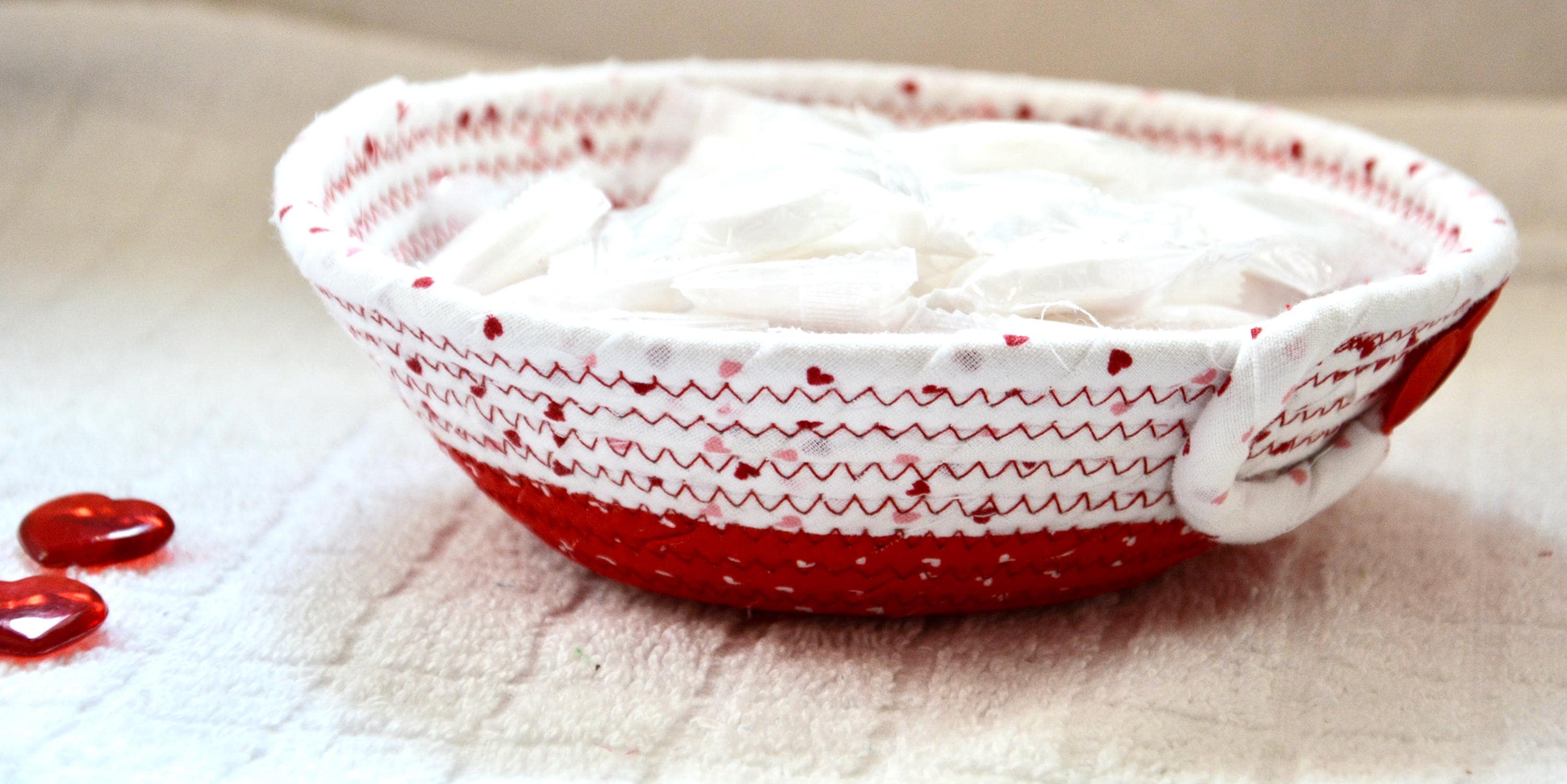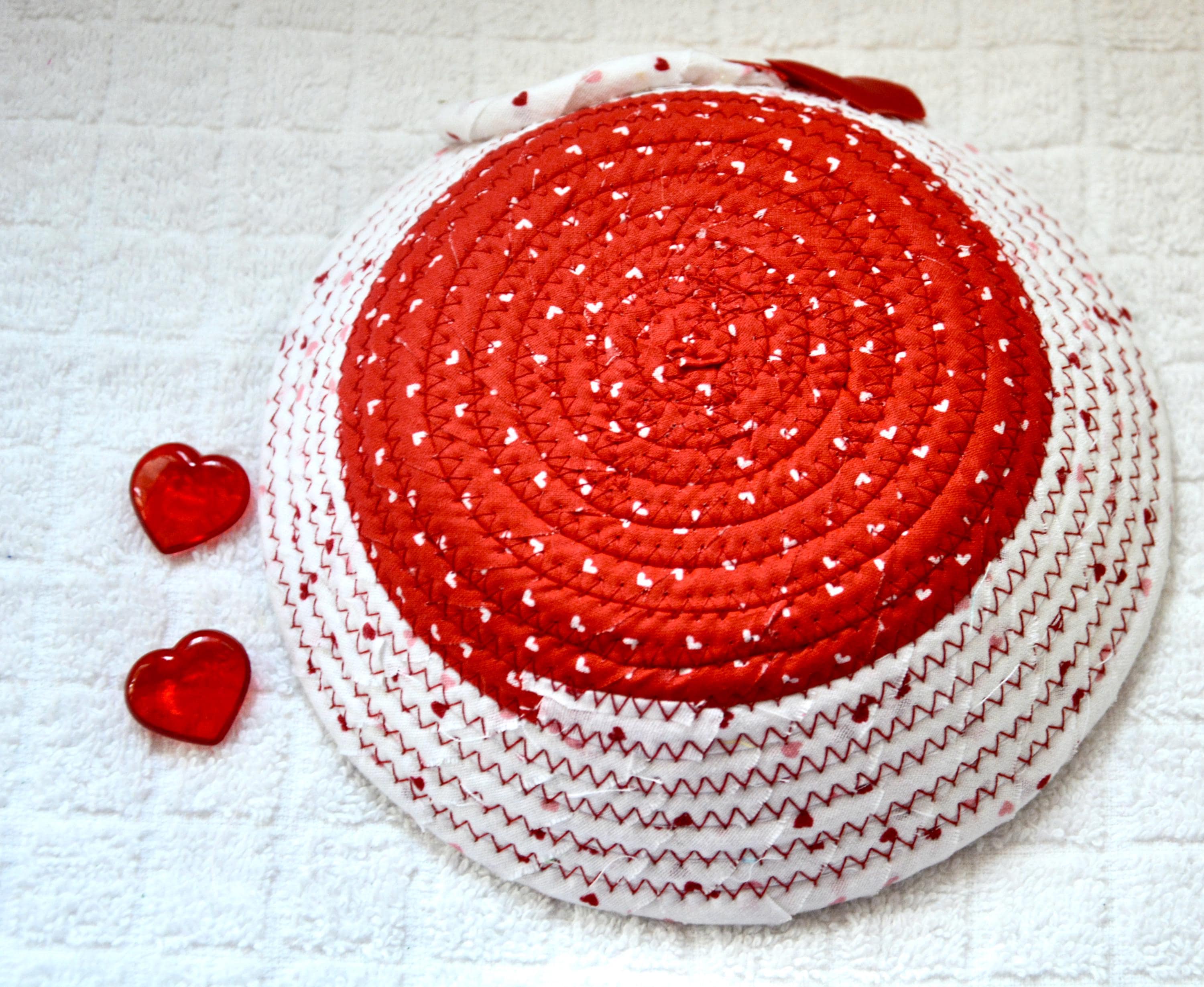 I hand wrapped these wonderful fabrics around cotton line, which I then hand coiled and machine quilted to make the basket sturdy. I used the raw edge technique with some fray to give it a lovely shabby chic texture. The cute hearts on the basket are included for a nice accent.