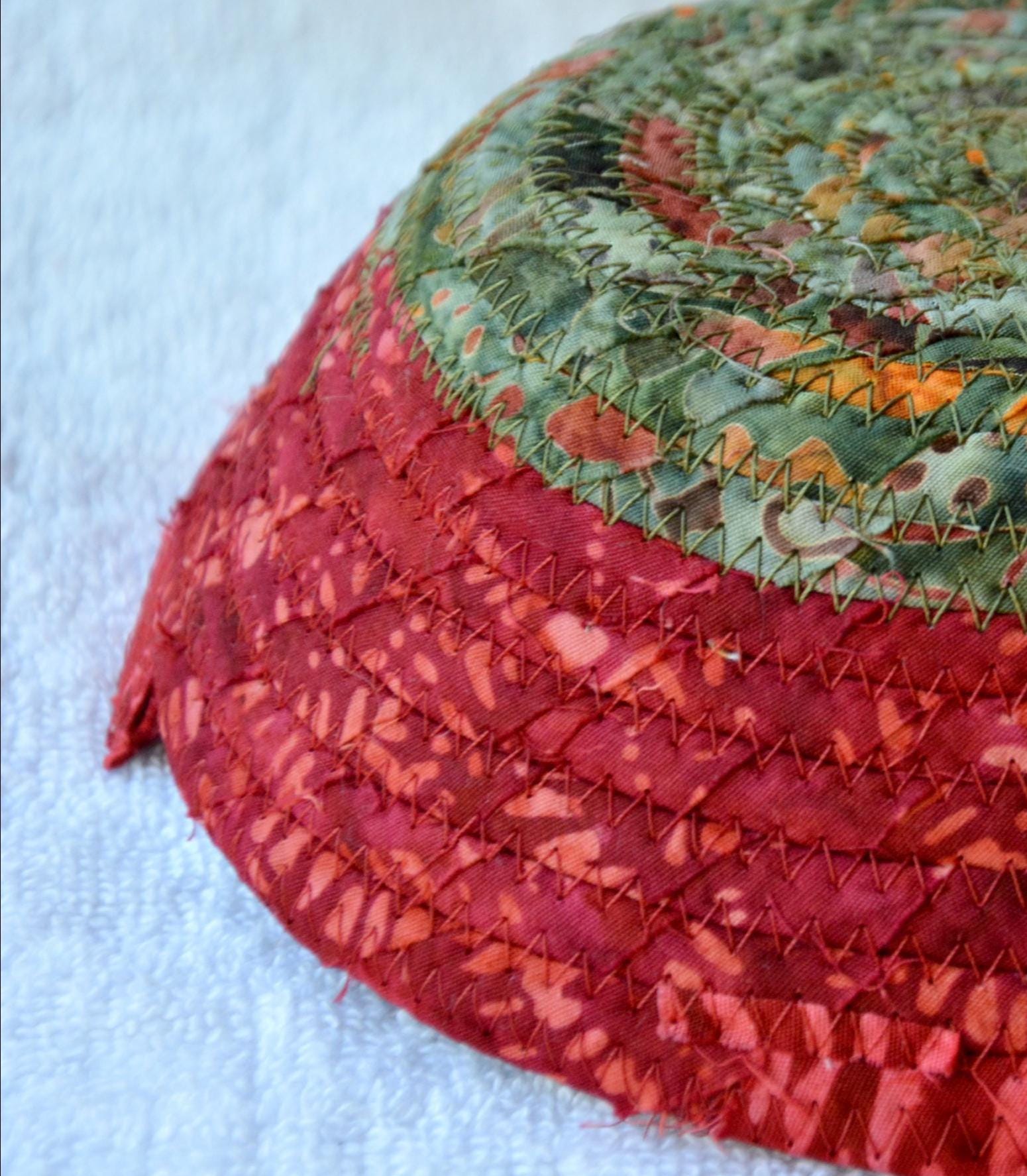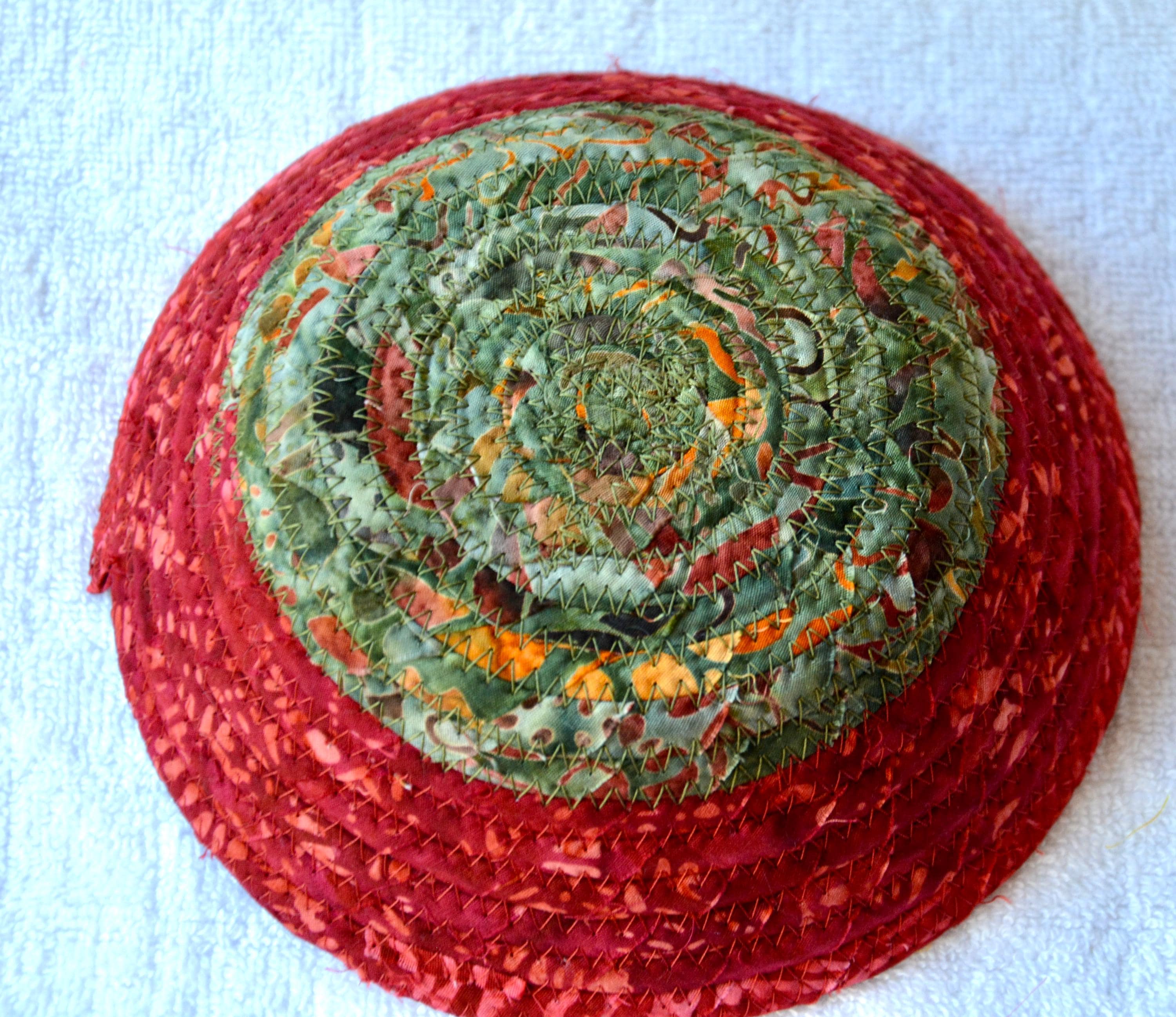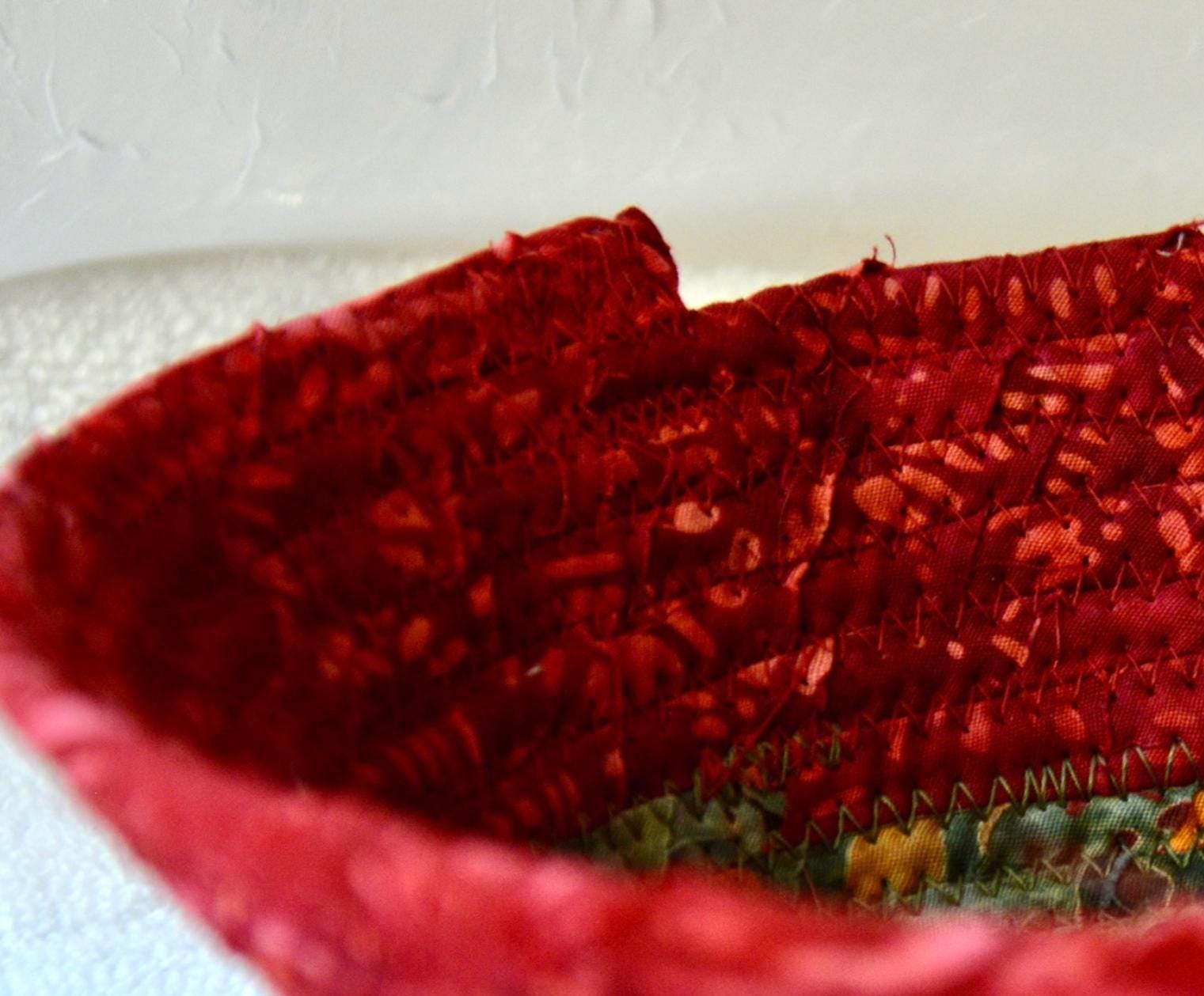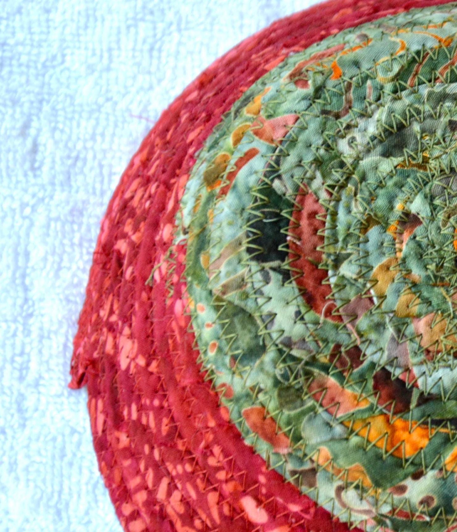 I hand wrapped this wonderful batik fabric around cotton line, which I then hand coiled and machine quilted to make it sturdy. I used the raw edge technique with some fray to add a great shabby chic texture. This is a high quality 100% cotton fabric and it shows on the inside too! I added a beautiful rustic green batik fabric to the base for contrast.