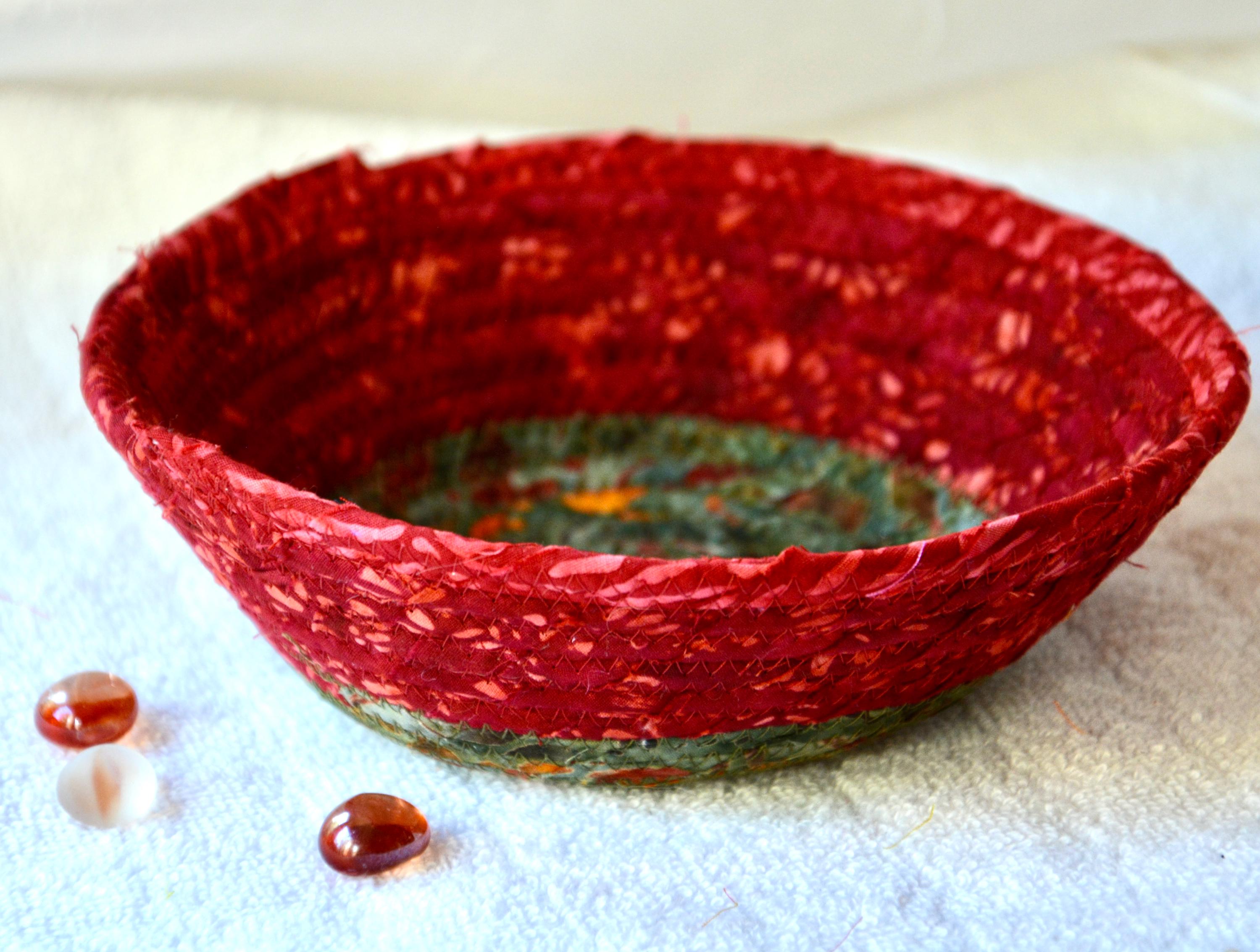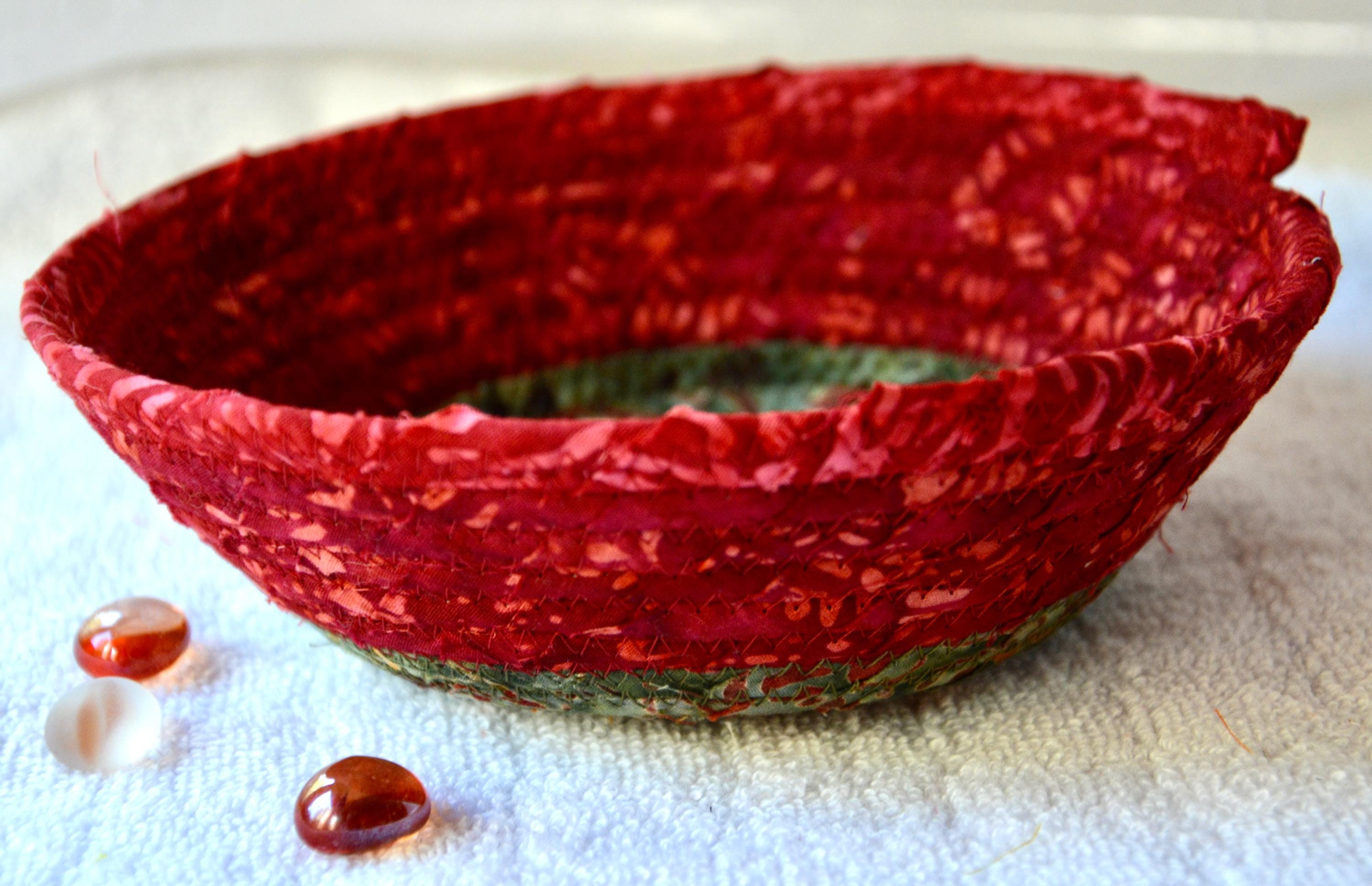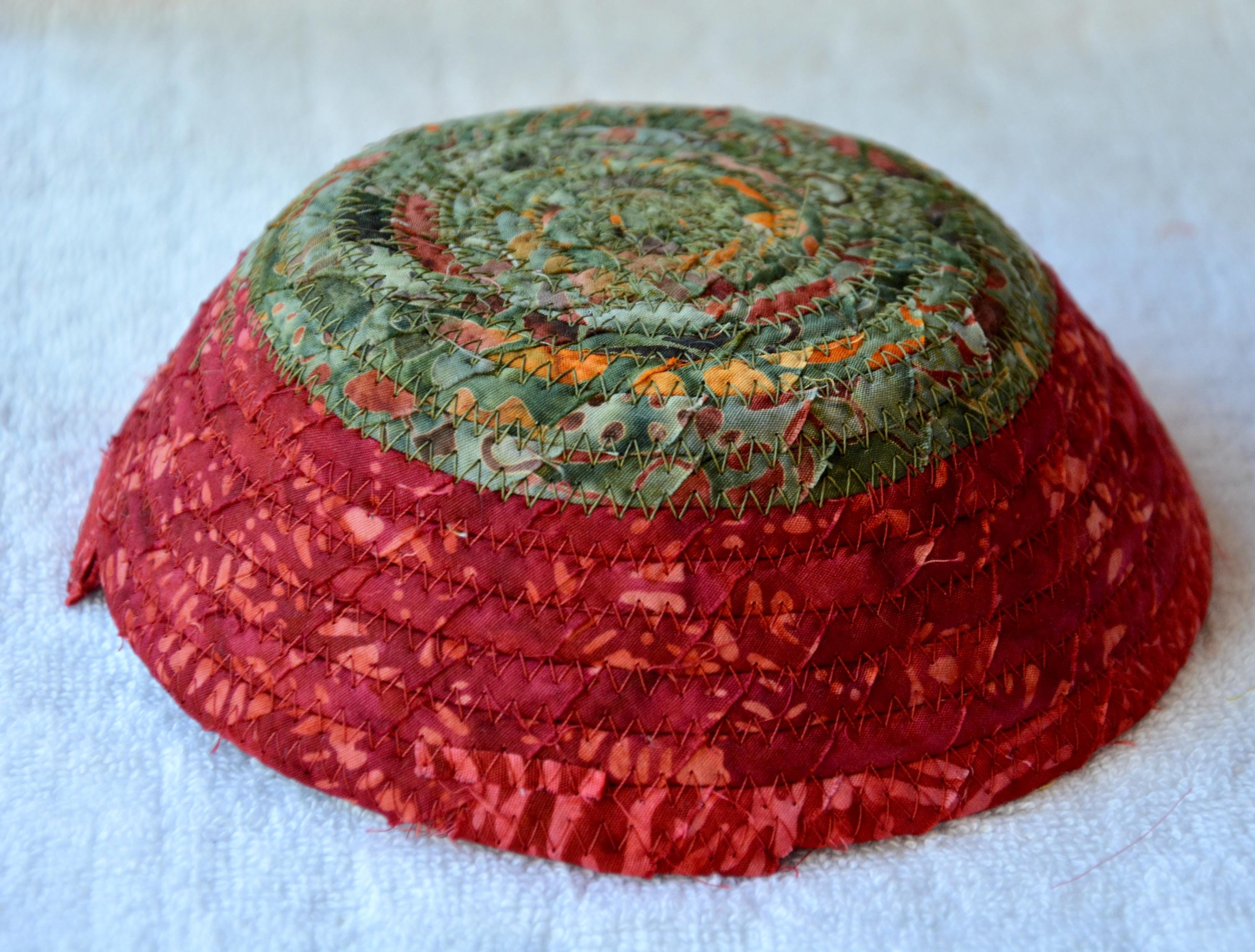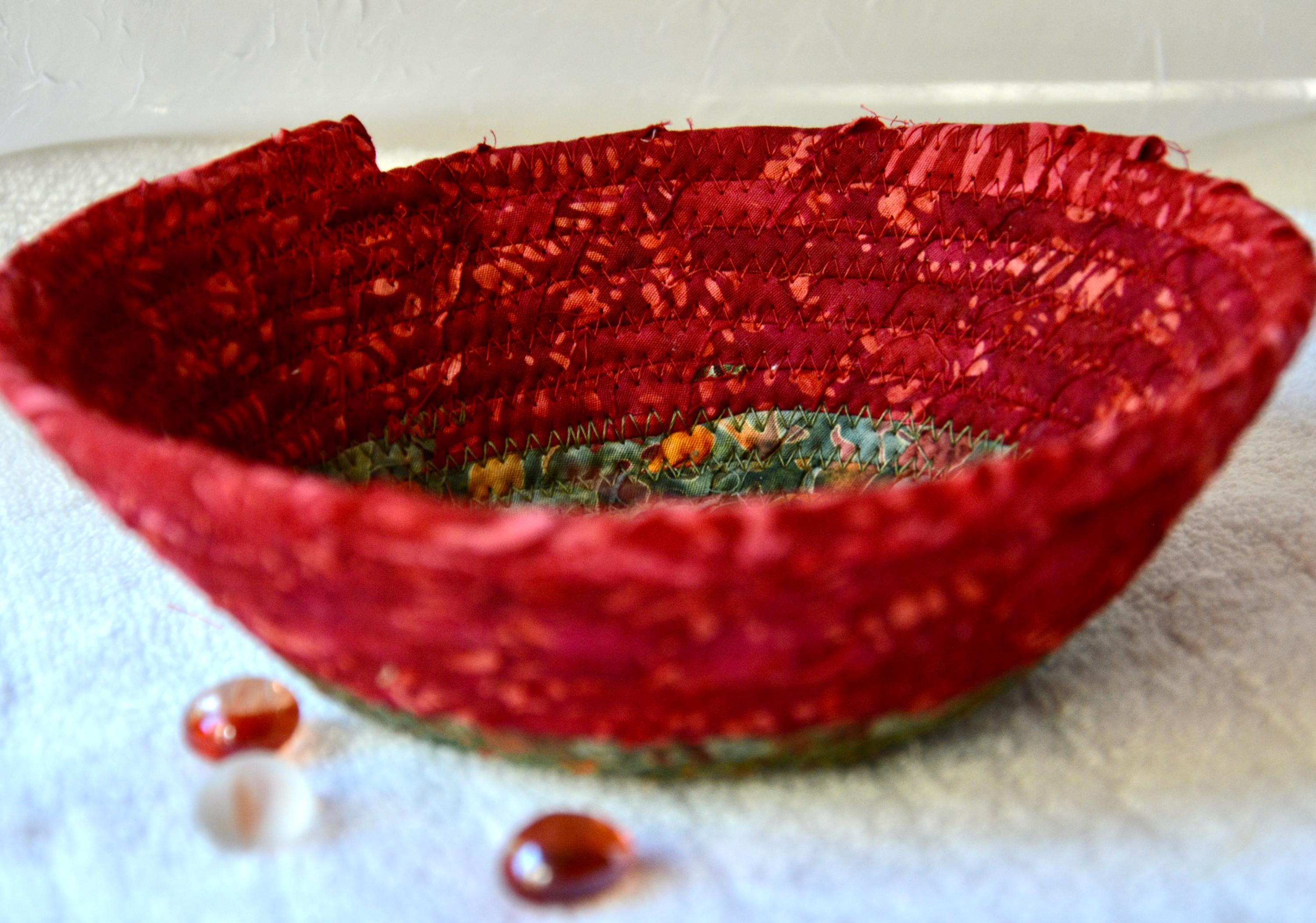 I hand wrapped this wonderful batik fabric around cotton line, which I then hand coiled and machine quilted to make it sturdy. I used the raw edge technique with some fray to add a great shabby chic texture. This is a high quality 100% cotton fabric and it shows on the inside too! I added a beautiful rustic green batik fabric to the base for contrast.