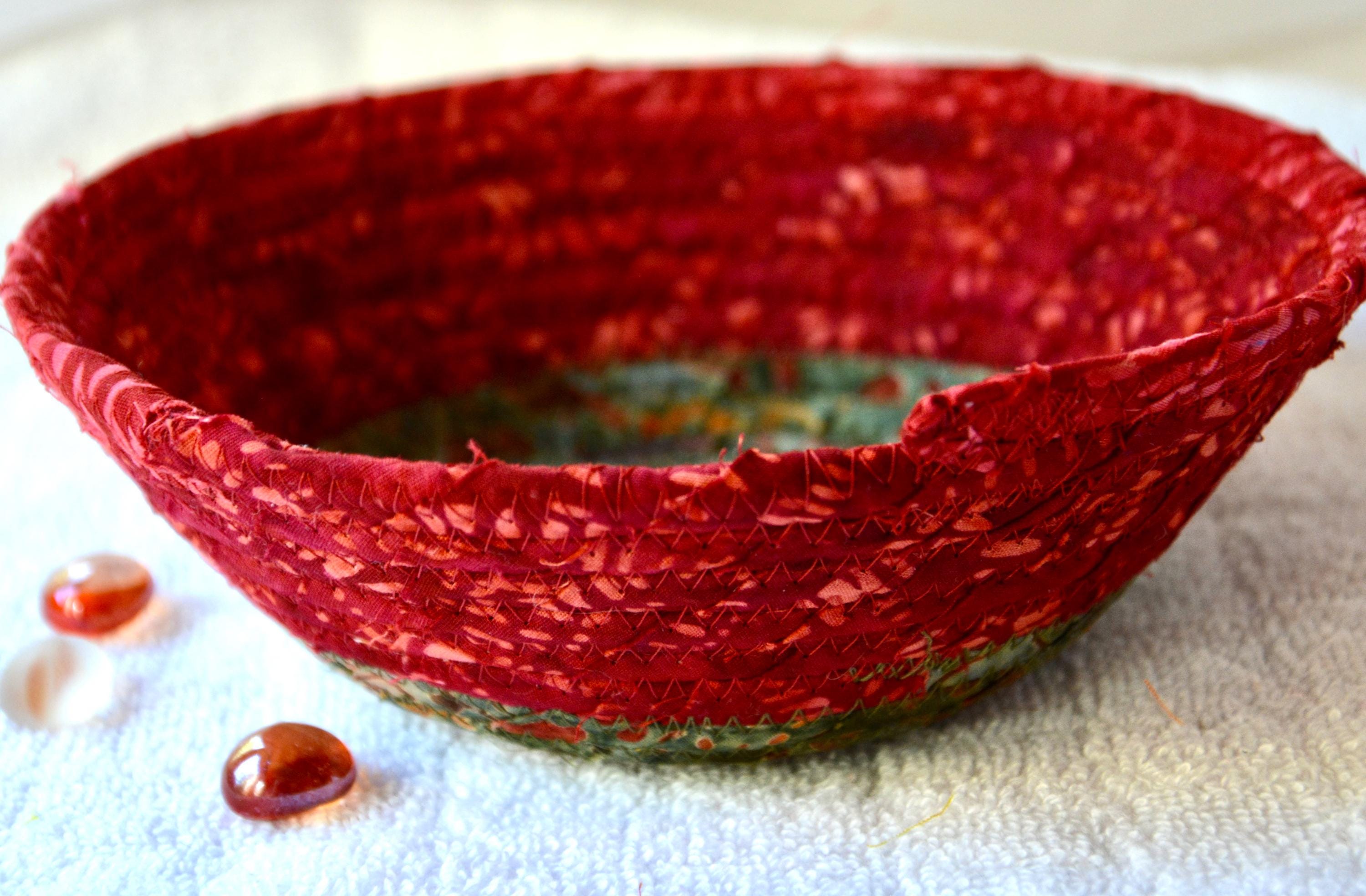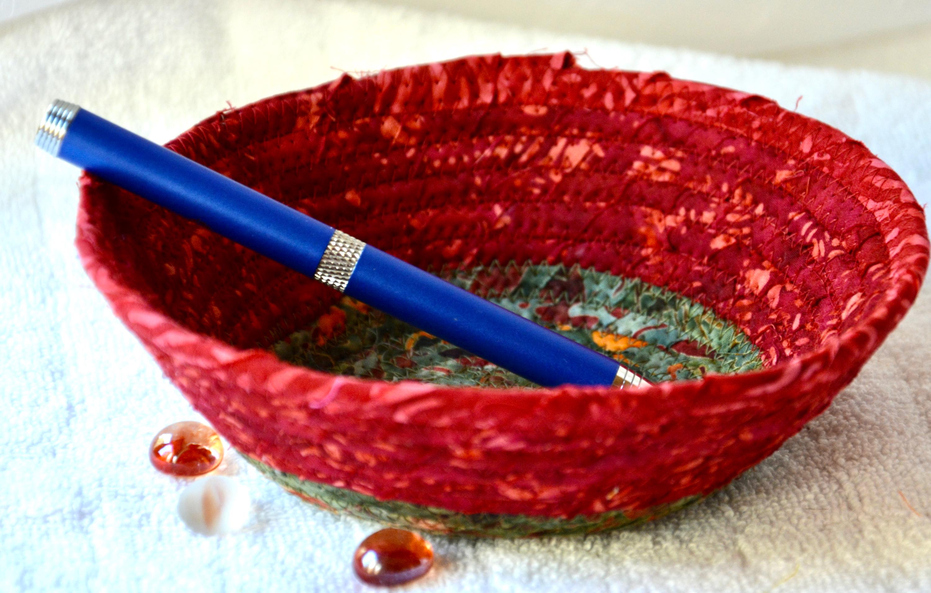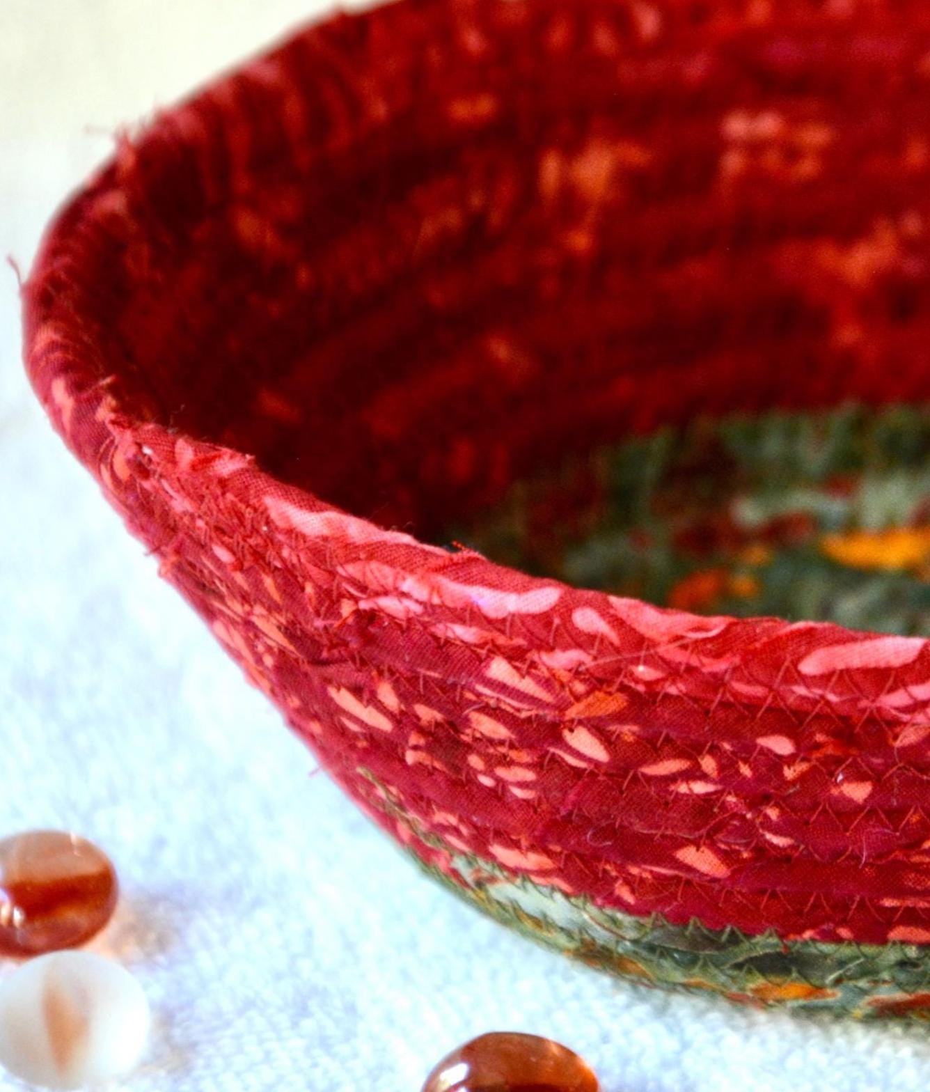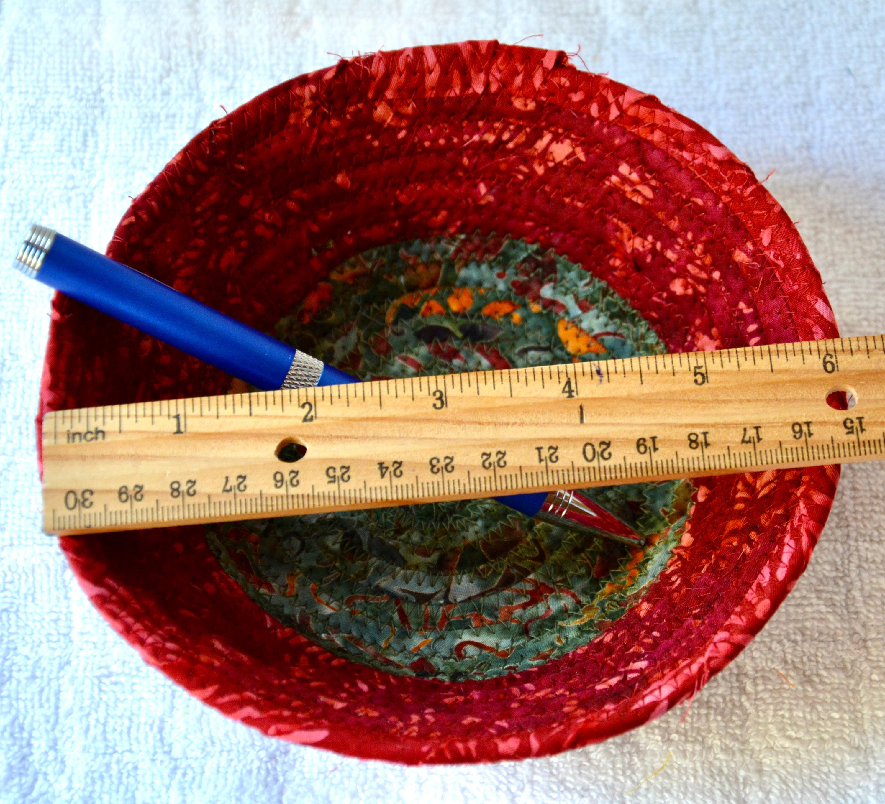 I hand wrapped this wonderful batik fabric around cotton line, which I then hand coiled and machine quilted to make it sturdy. I used the raw edge technique with some fray to add a great shabby chic texture. This is a high quality 100% cotton fabric and it shows on the inside too! I added a beautiful rustic green batik fabric to the base for contrast.