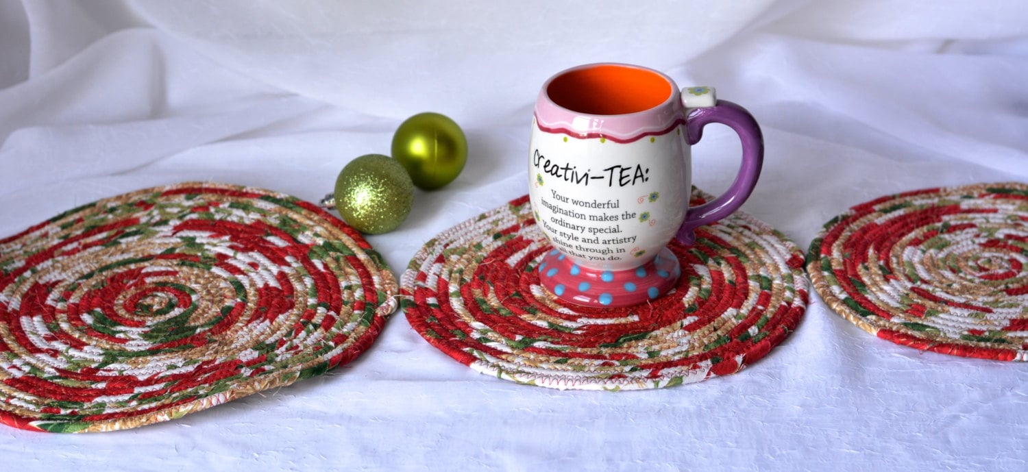I hand wrapped this lovely floral Christmas fabric around cotton line, which I then hand coiled and machine quilted to make it sturdy. I used the raw edge technique with a little fray to add a nice shabby chic texture. This pretty Christmas fabric shows on both sides too! 100% cotton!