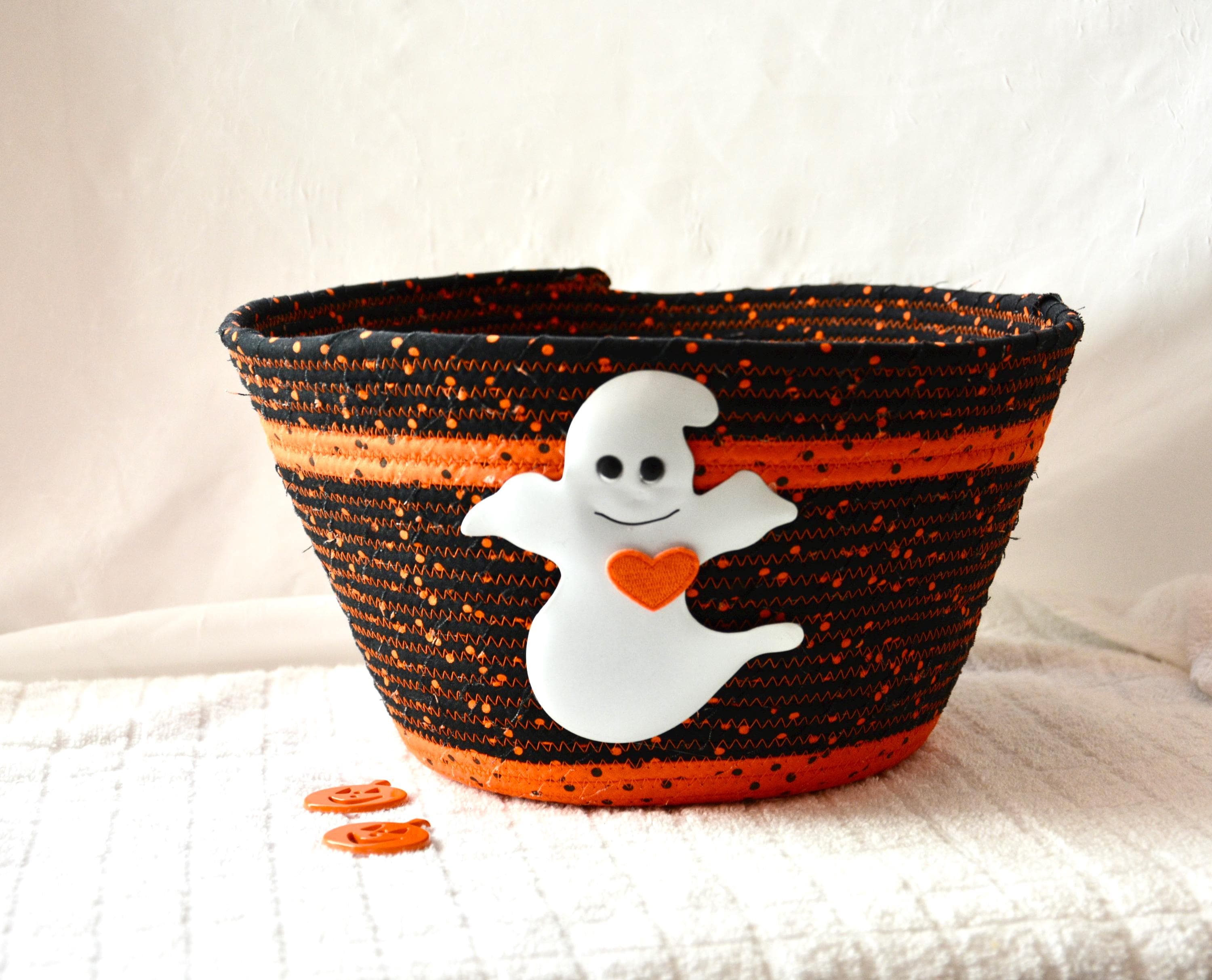 I hand wrapped these wonderful fabrics around cotton line, which I then hand coiled and machine quilted to make it sturdy. I used the raw edge technique with some fray. These fun fabrics show on the inside too!. The cute ghost on the basket is included for a nice accent.