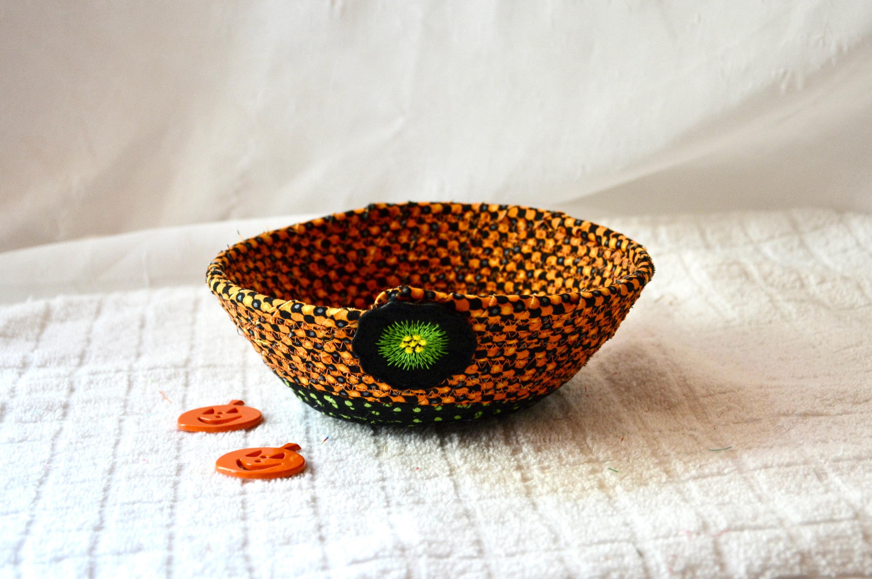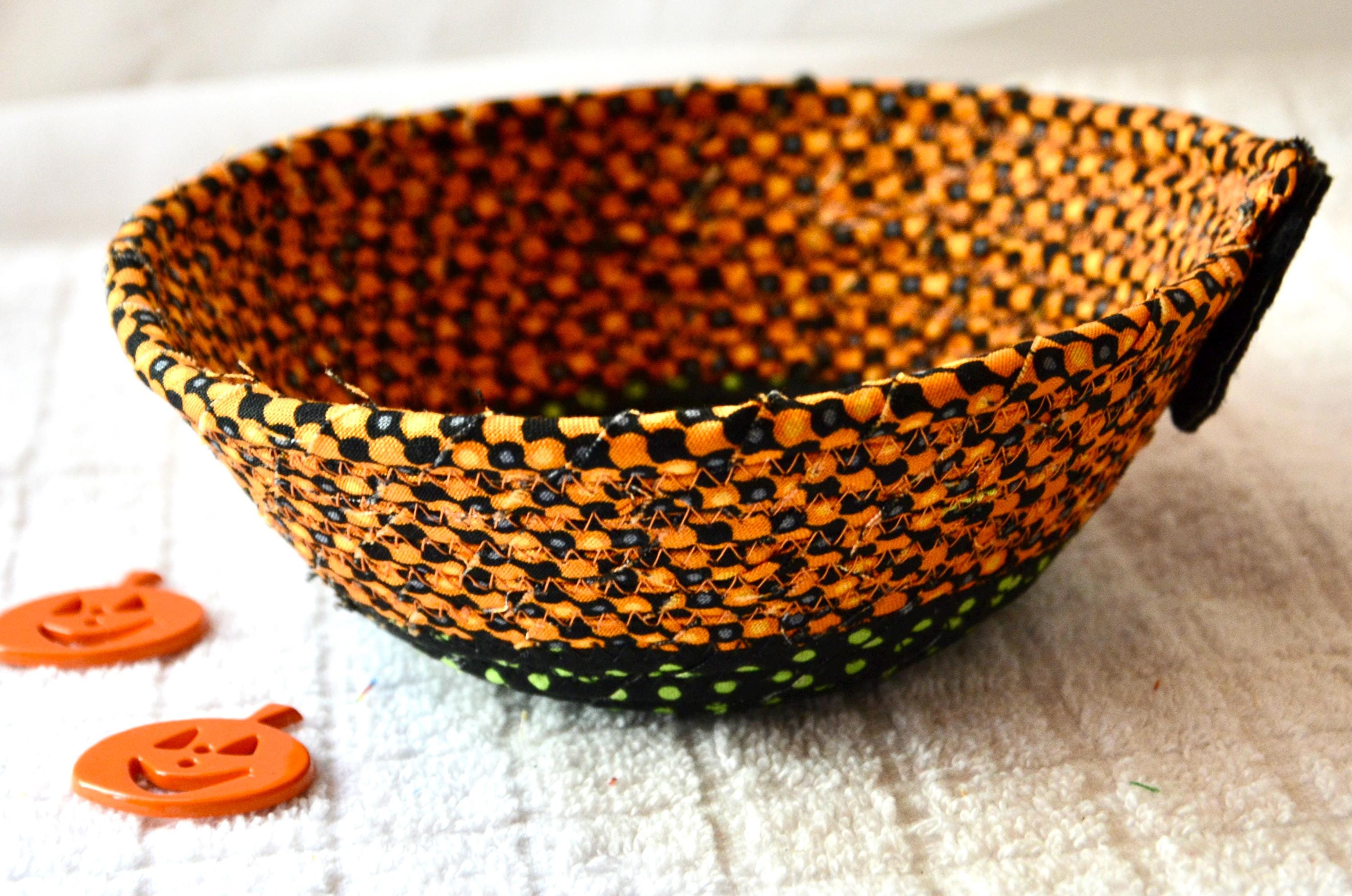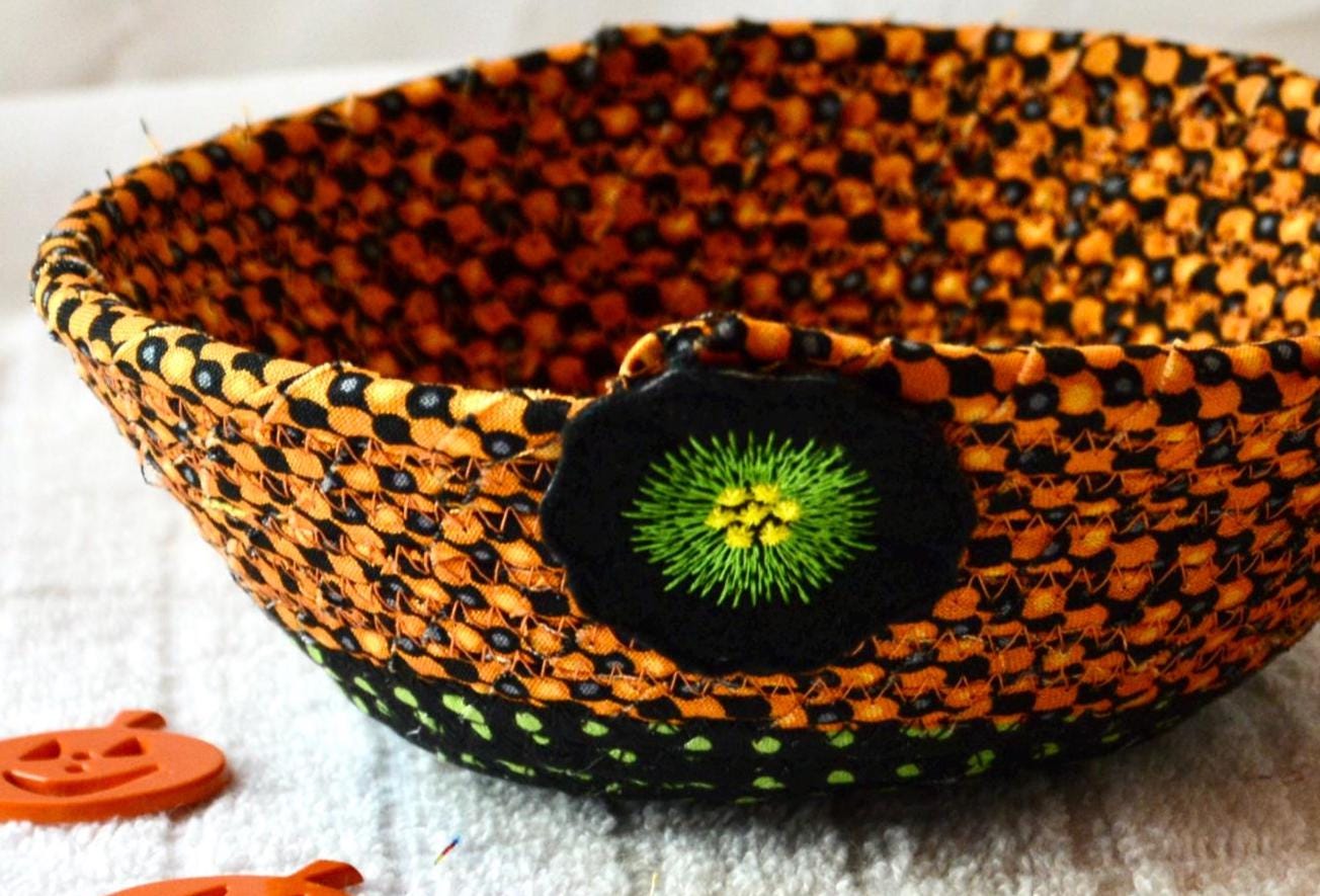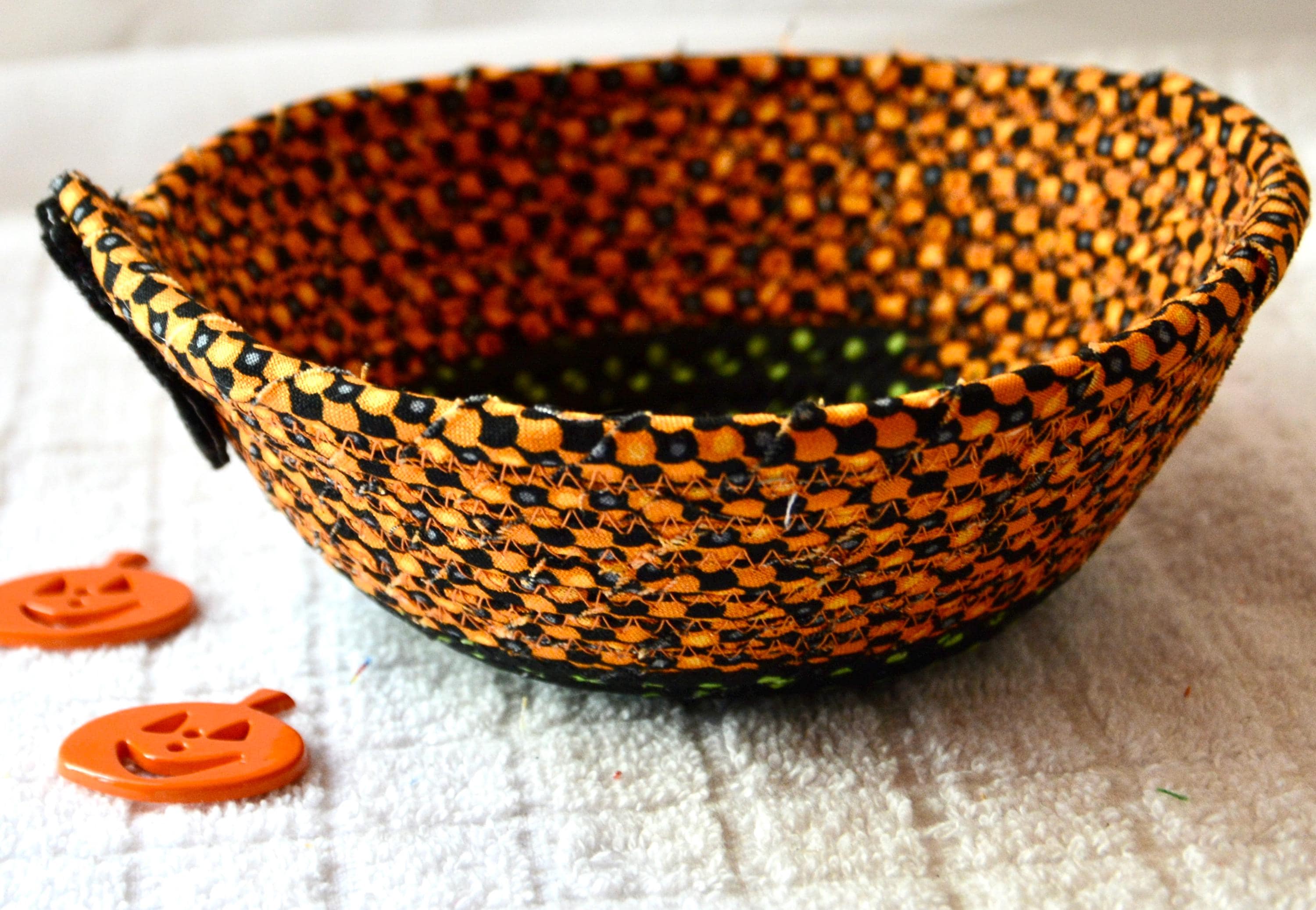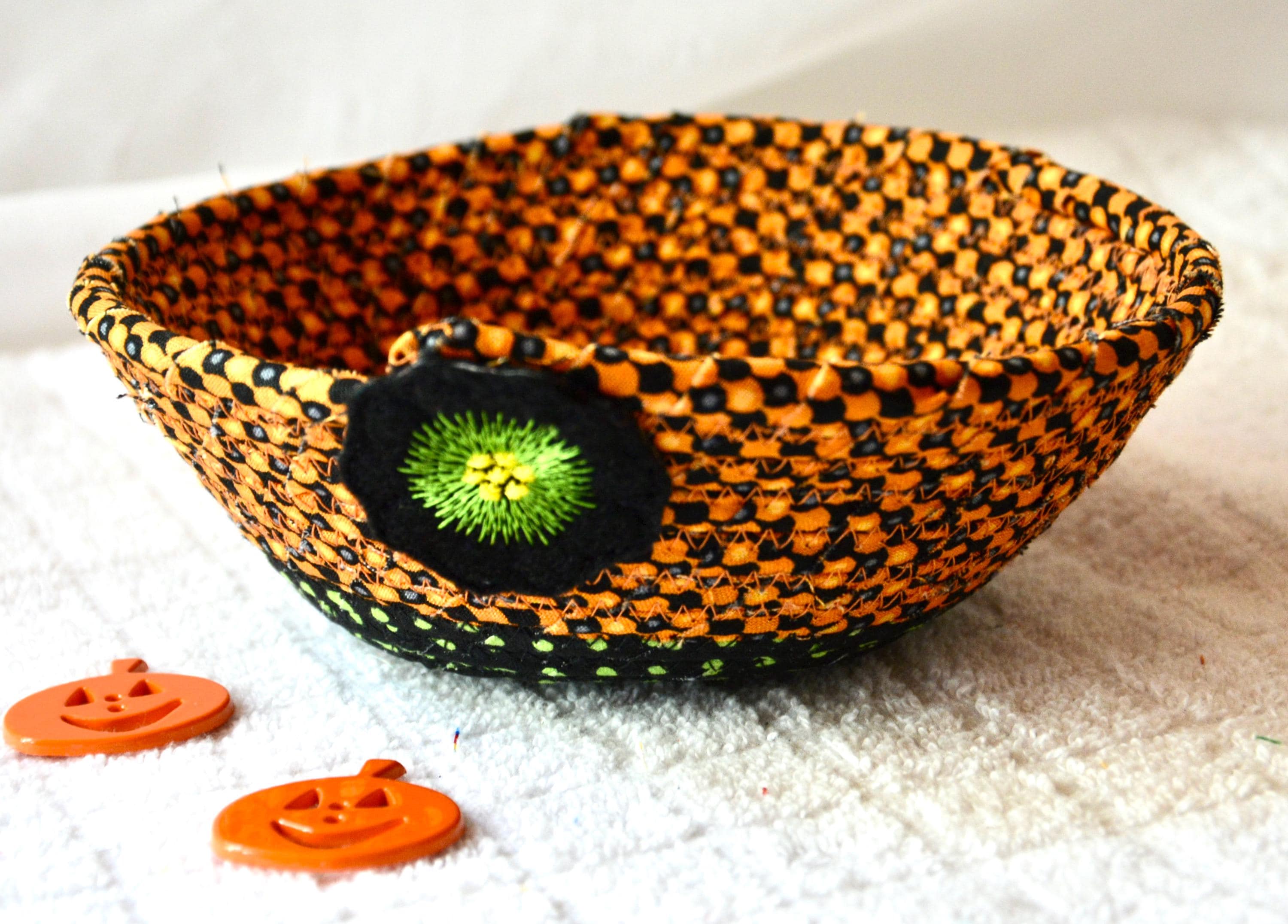 I hand wrapped these colorful black and orange fabrics around cotton line, which I then hand coiled and machine quilted to make it sturdy. I used the raw edge technique with some fray to add texture. Both fabrics are high quality 100% cotton and show on the inside too! The pretty flower on the basket is included for a nice accent.