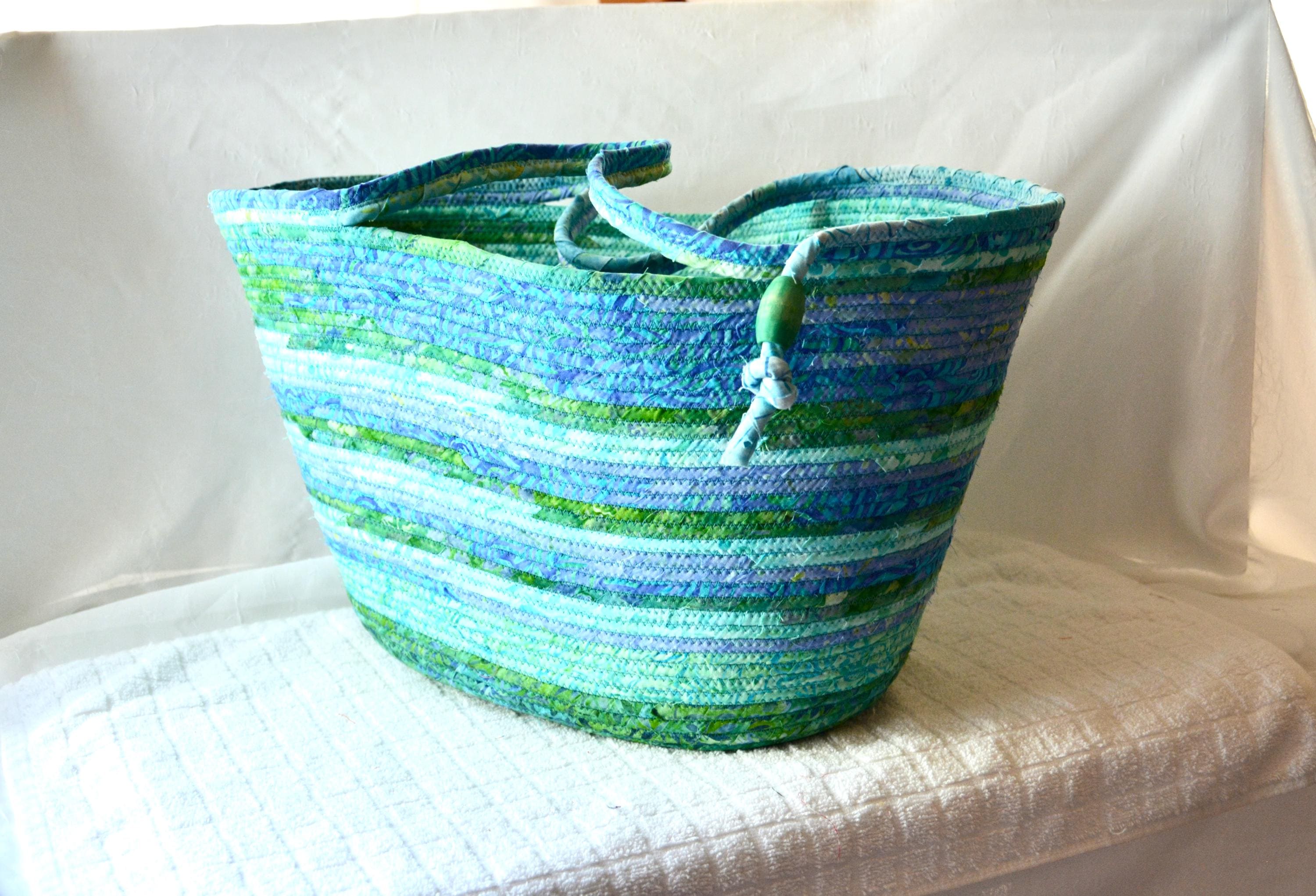 I hand wrapped these wonderful batik fabrics around cotton line, which I then hand coiled and machine quilted to make it sturdy. I used the raw edge technique with some fray to add texture. All of these lovely batik fabrics are high quality and 100% cotton and all show on the inside of this gorgeous basket too! I used over 7 different batik fabrics to create this unique pattern. Please see the picture with the ruler to help gauge the basket size.