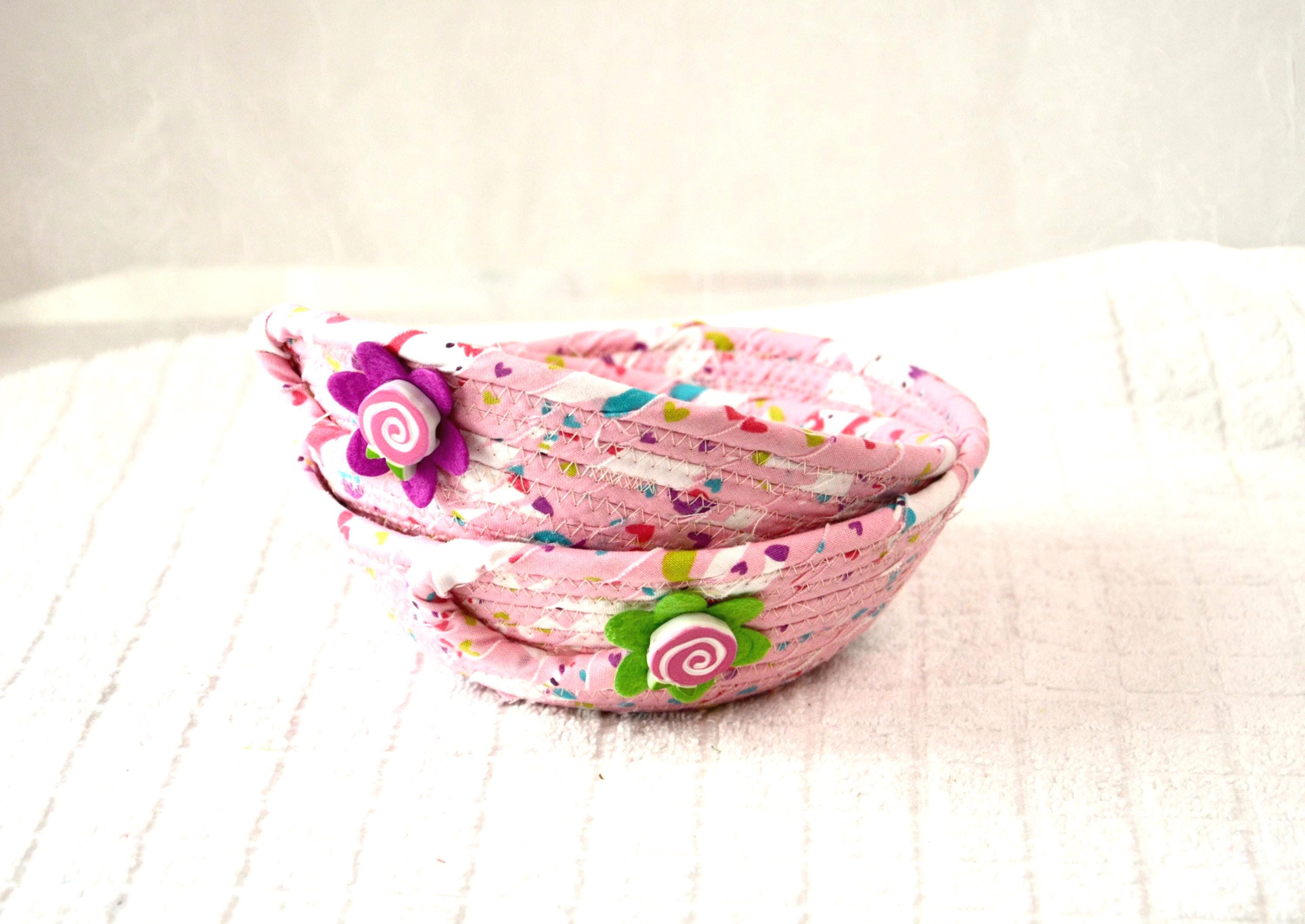 I hand wrapped this lovely pink fabric around cotton line, which I then hand coiled and machine quilted to make it sturdy. I used the raw edge technique with some fray for a great shabby chic texture. The cute flower on the basket is included for a sweet accent.