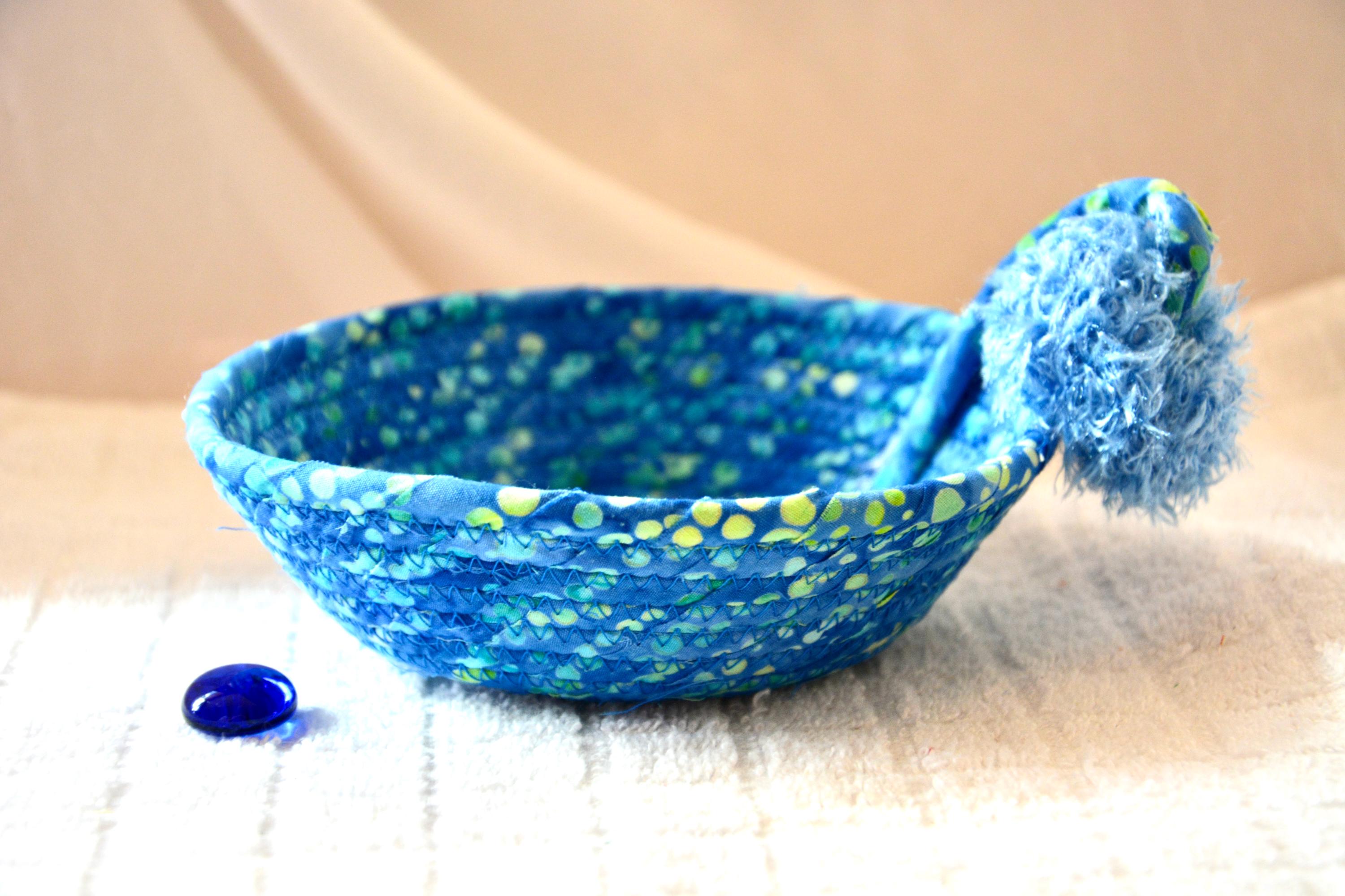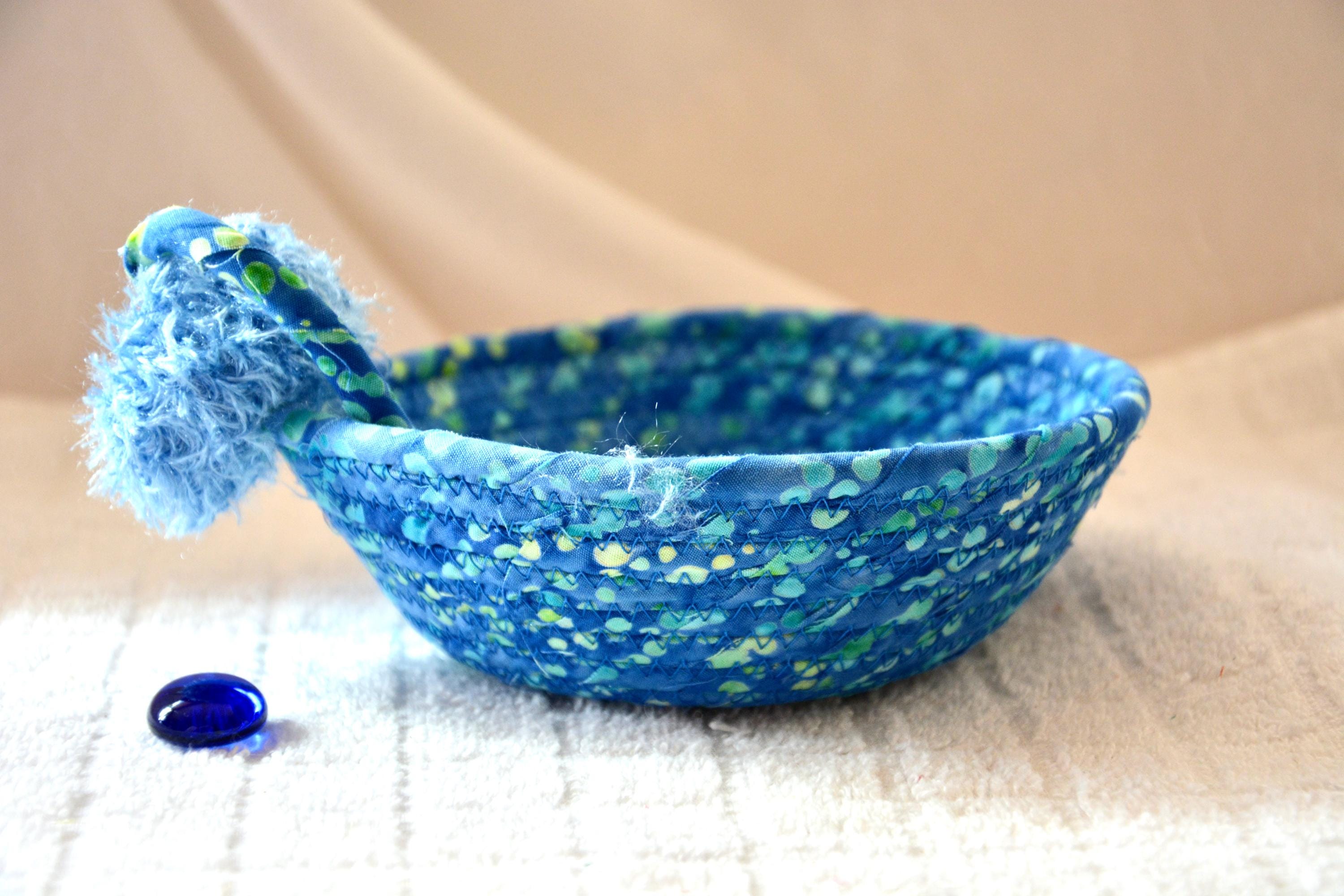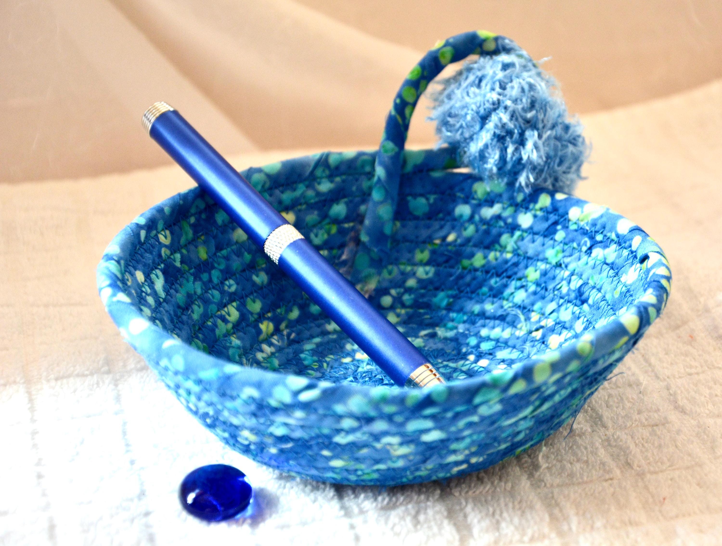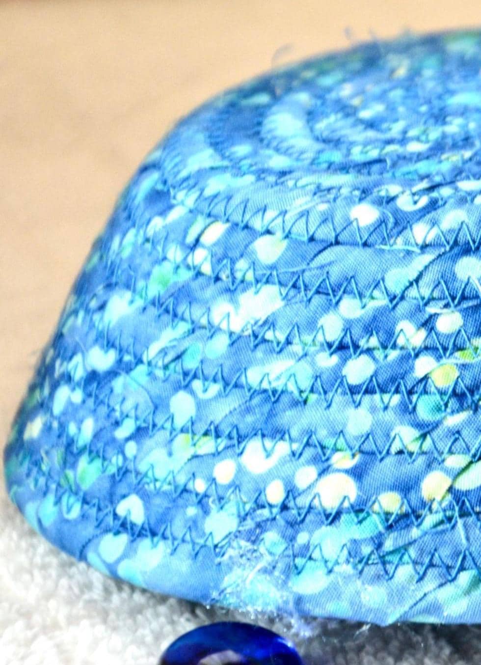 I hand wrapped this wonderful blue batik fabric around cotton line, which I then hand coiled and machine quilted to make it sturdy.  I used the raw edge technique with some fray to add a nice shabby chic texture. This is a  high quality 100% cotton fabric and it shows on the inside too!