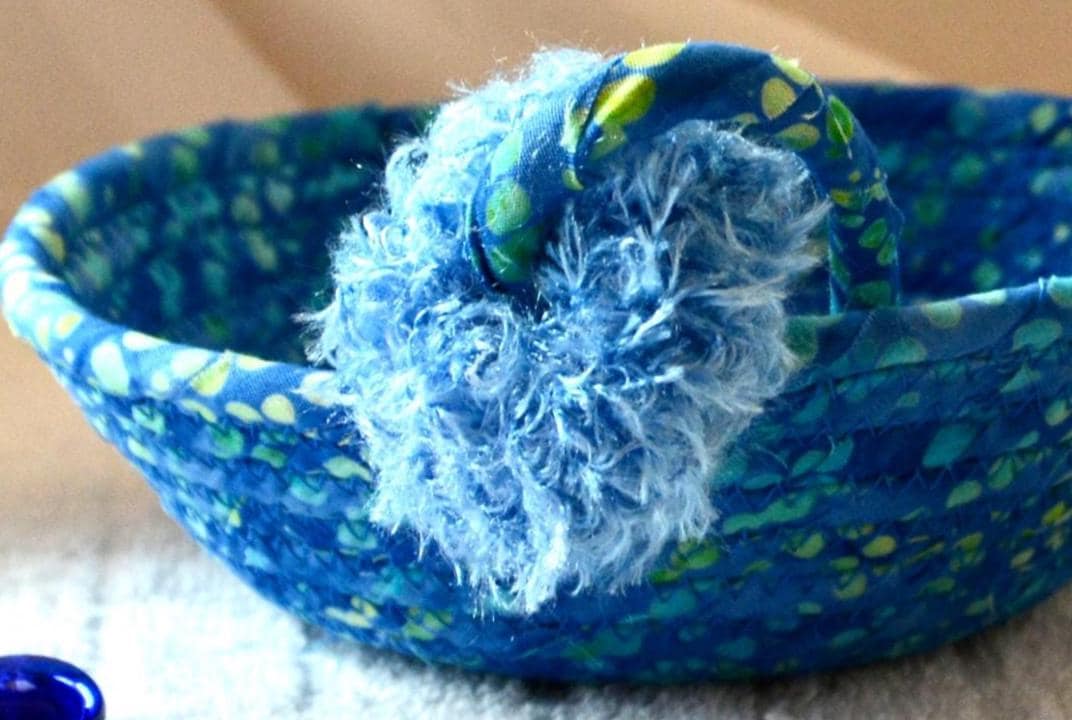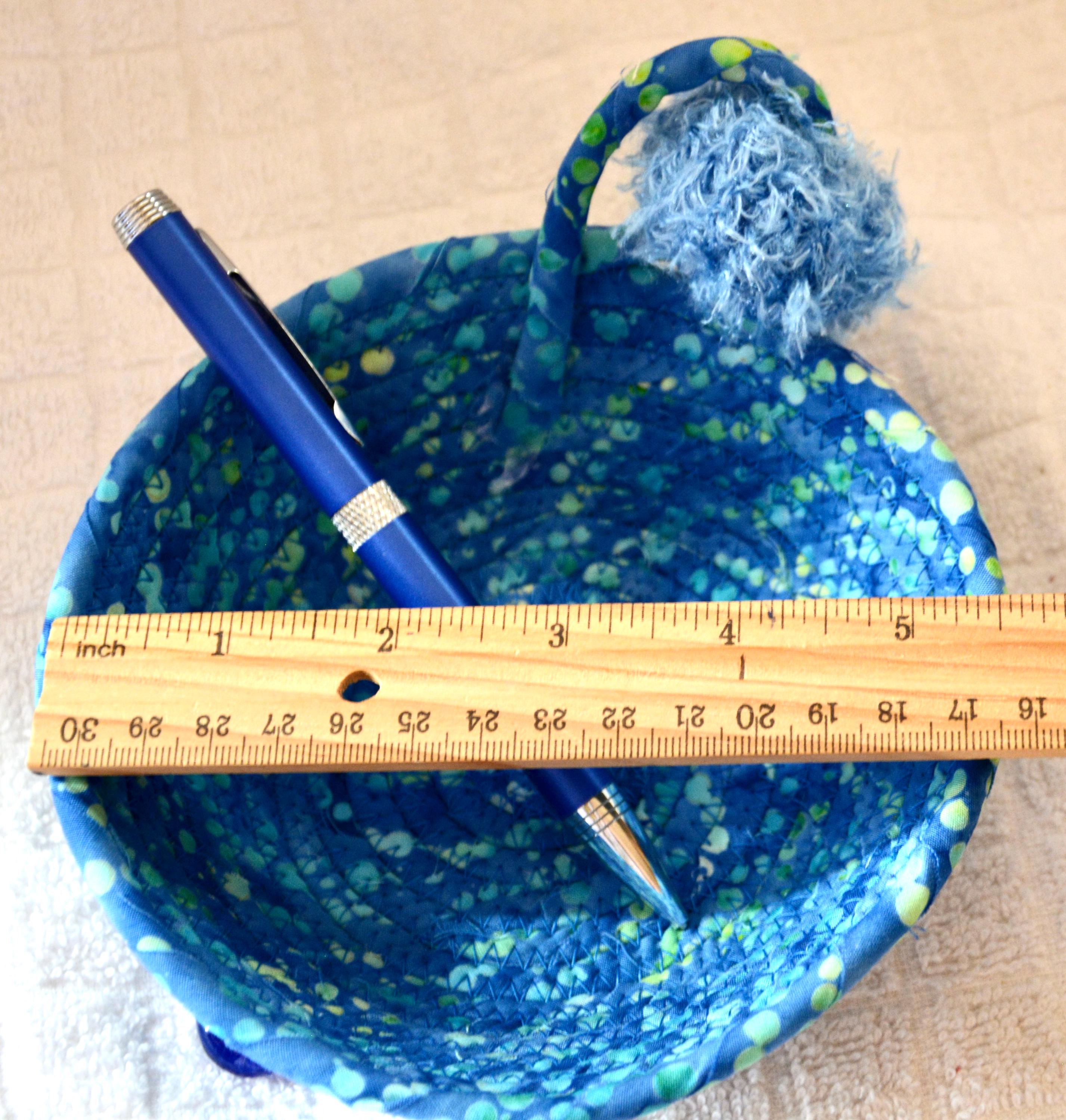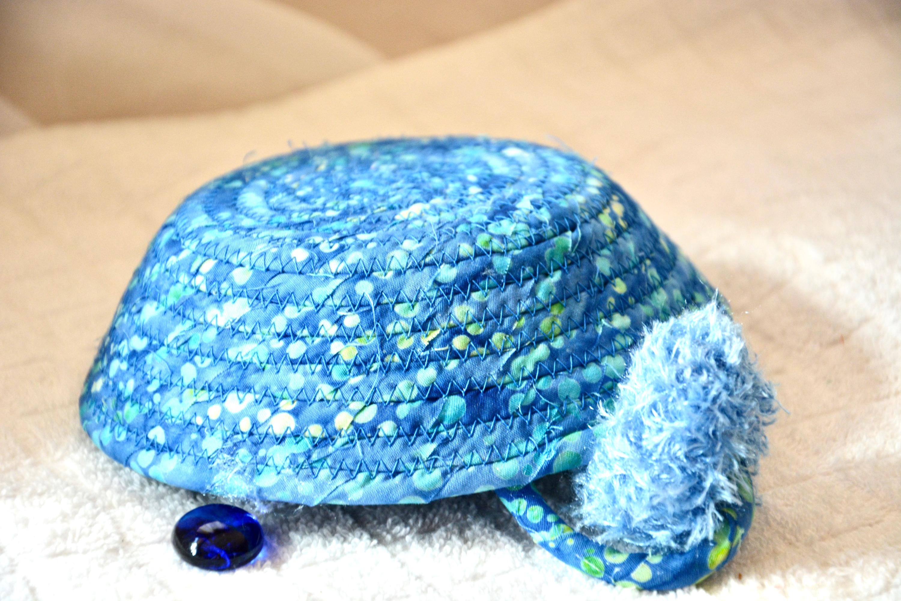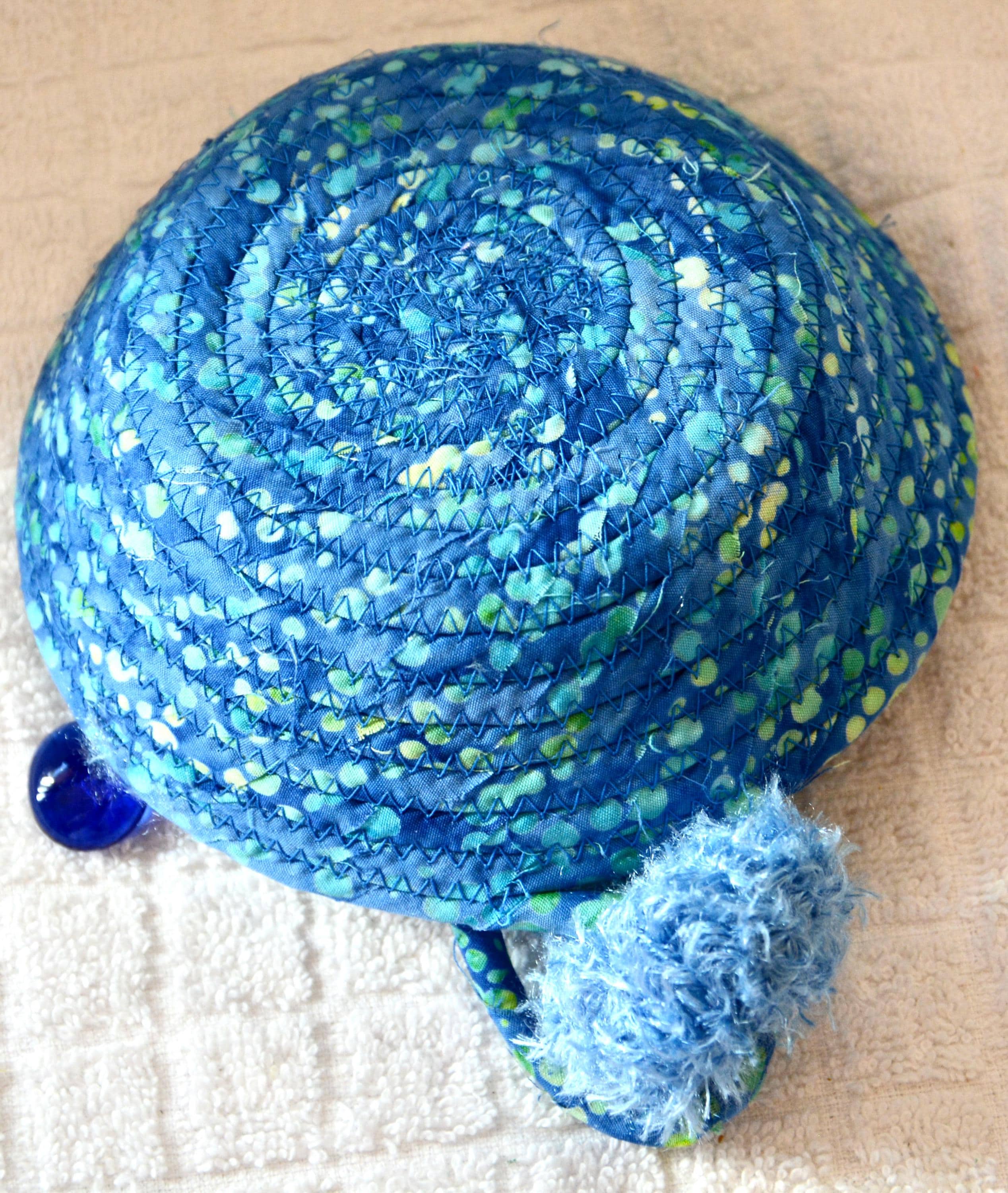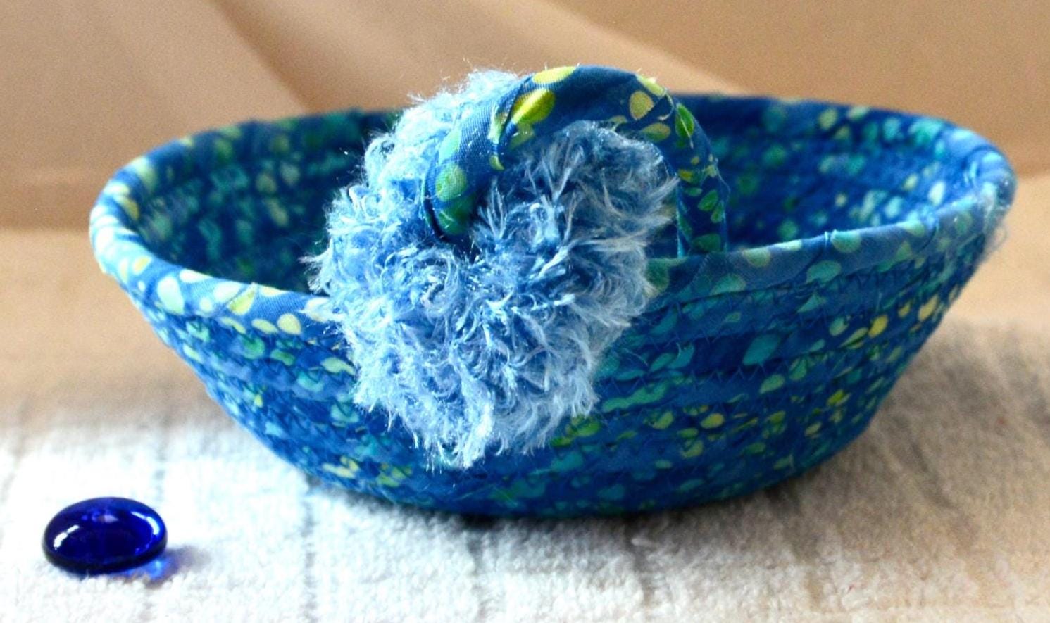 I hand wrapped this wonderful blue batik fabric around cotton line, which I then hand coiled and machine quilted to make it sturdy.  I used the raw edge technique with some fray to add a nice shabby chic texture. This is a  high quality 100% cotton fabric and it shows on the inside too!