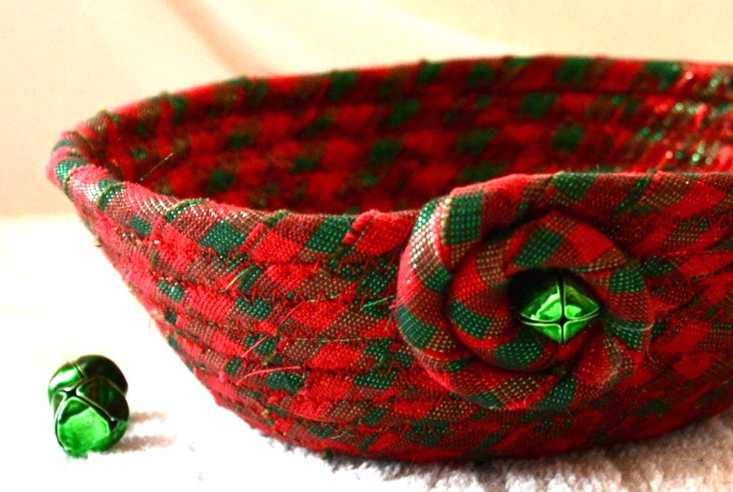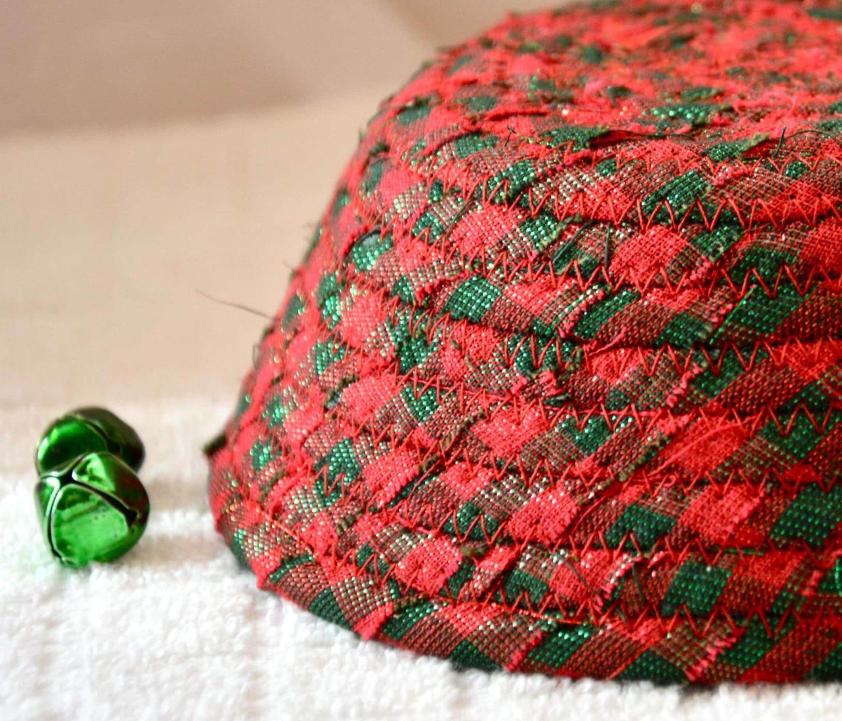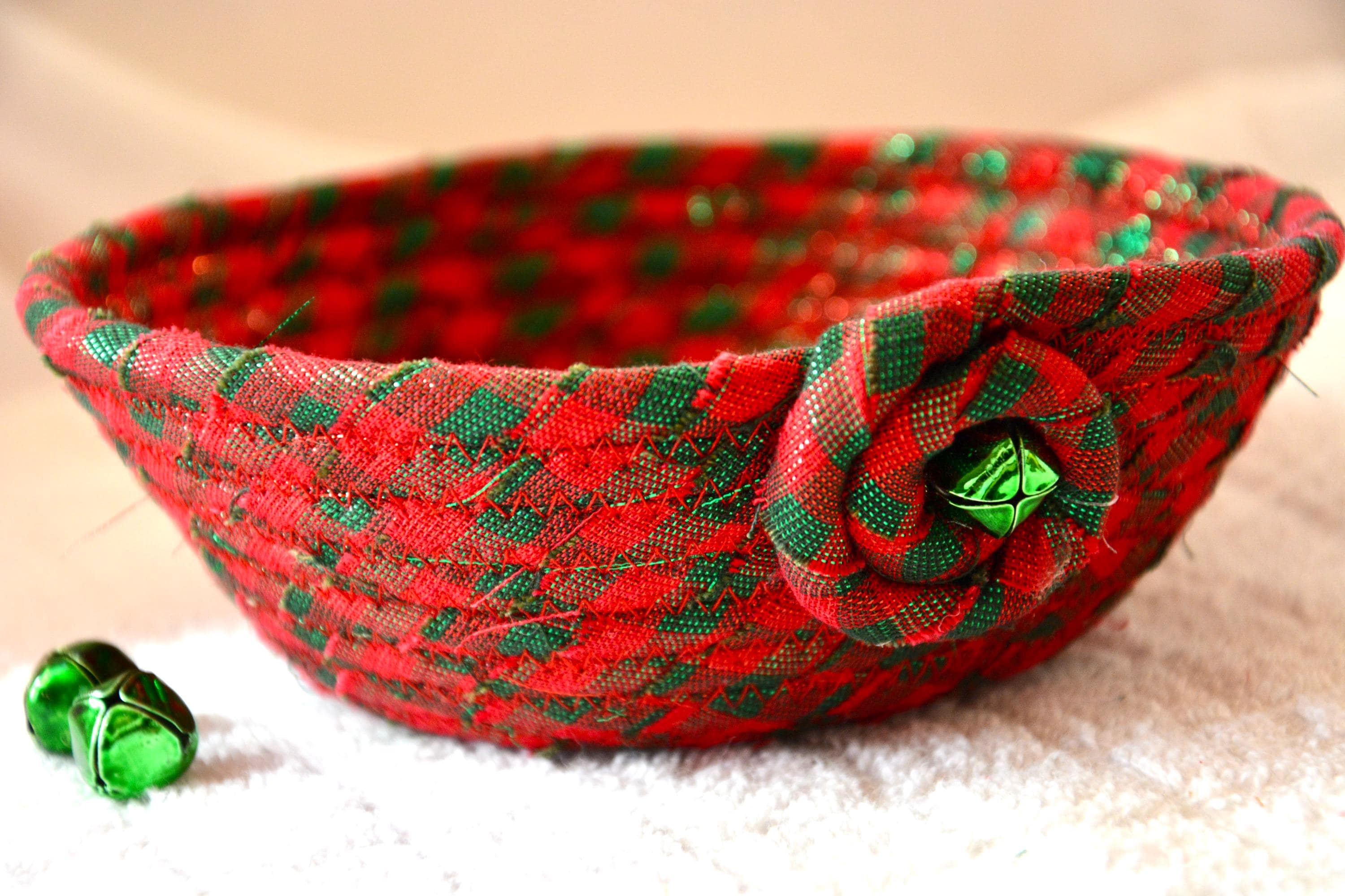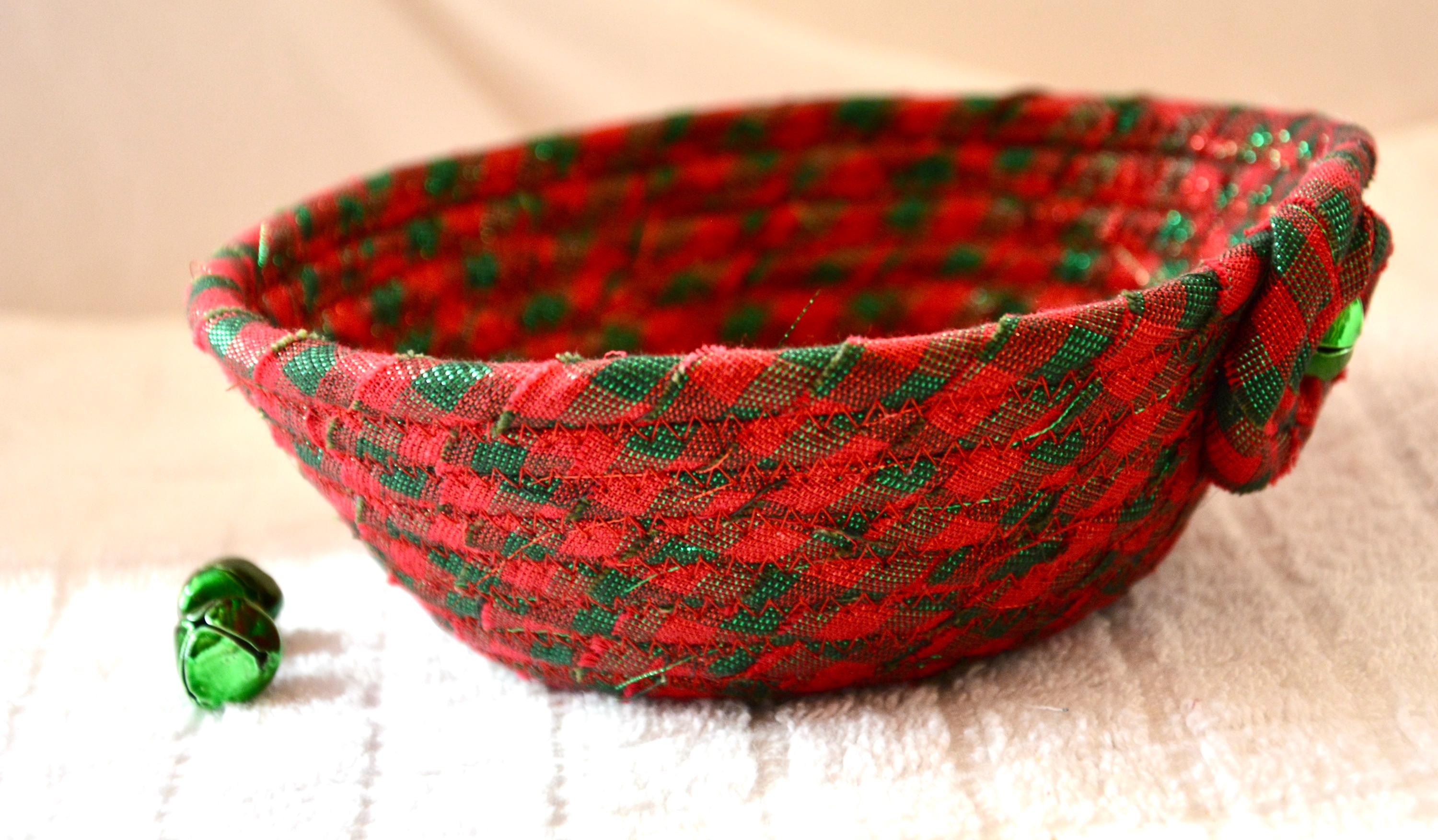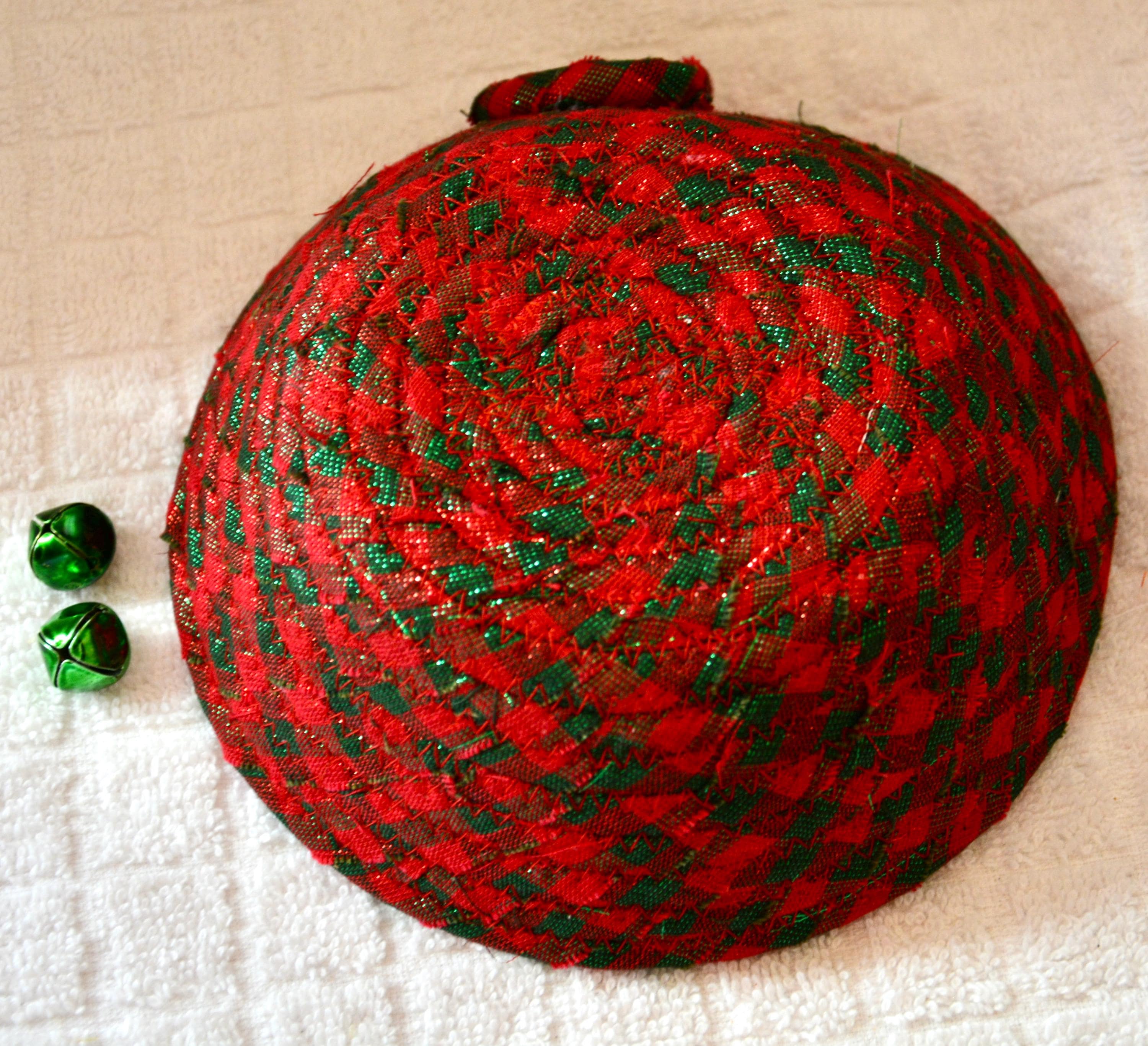 I hand wrapped this high quality cotton and polyester fabric around cotton line, which I then hand coiled and machine quilted to make it sturdy. I used the raw edge technique with some fray to add a wonderful shabby chic texture.